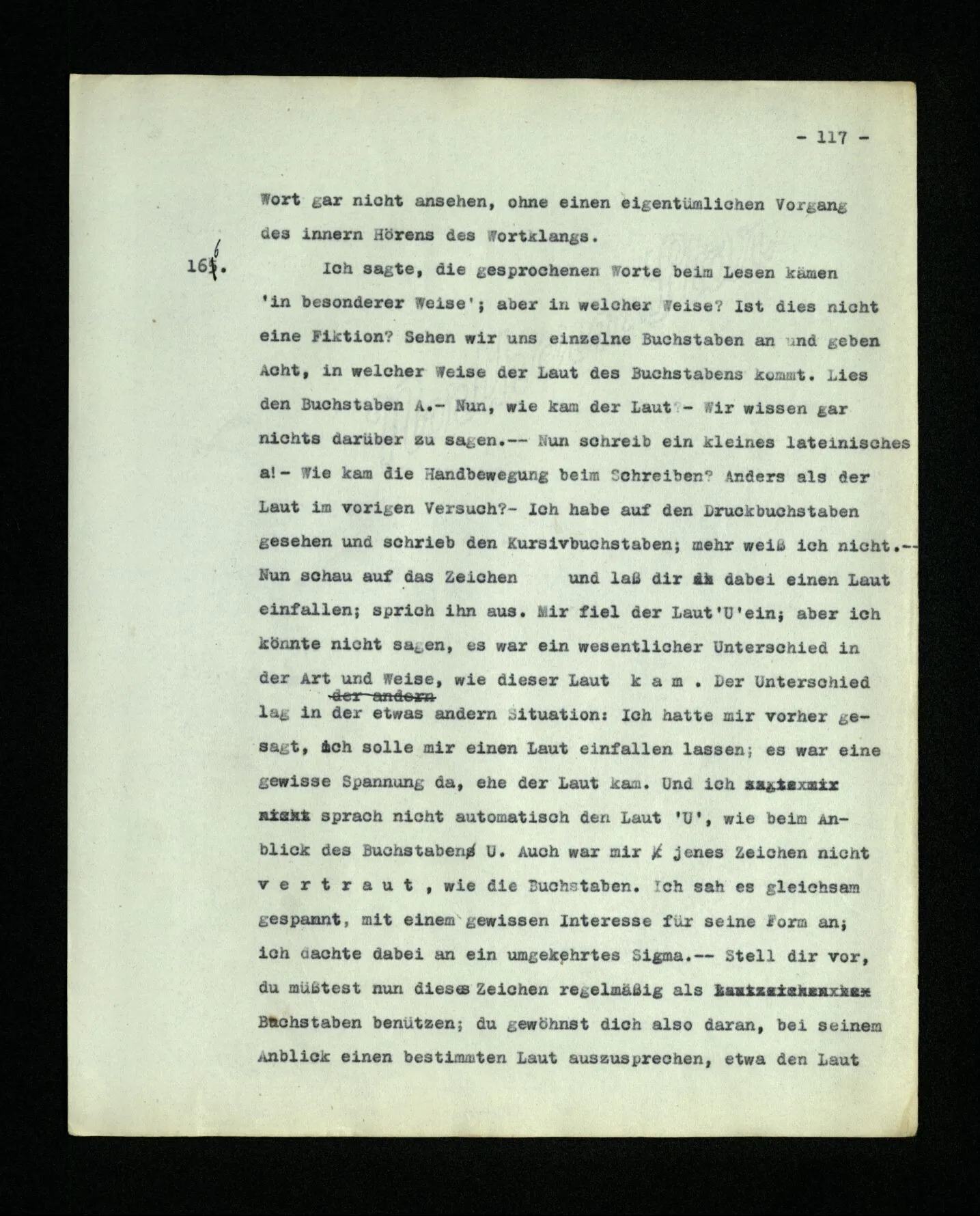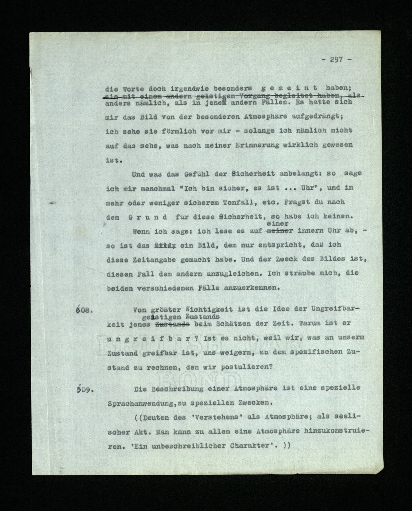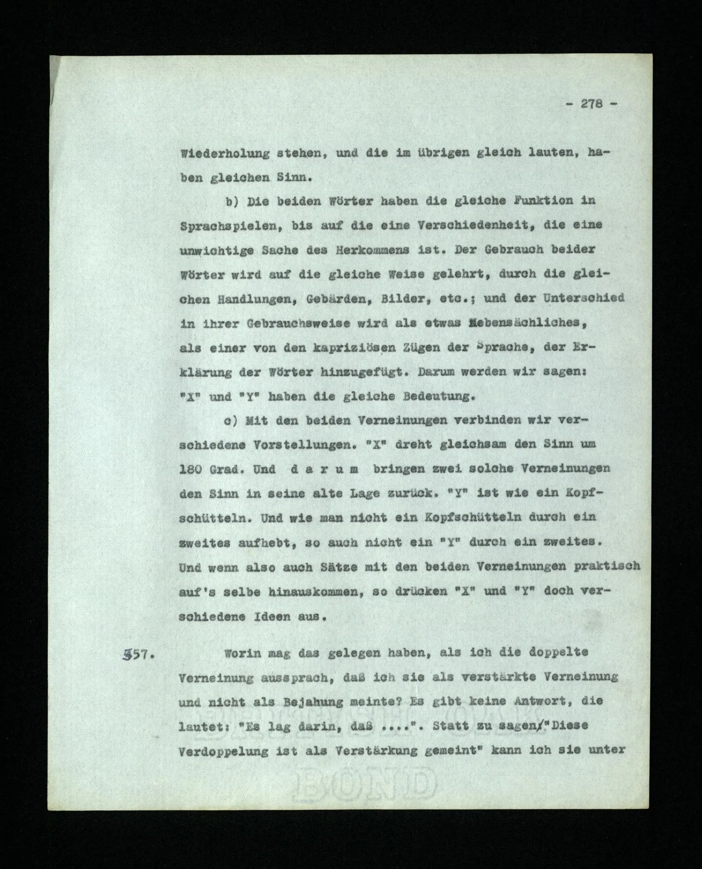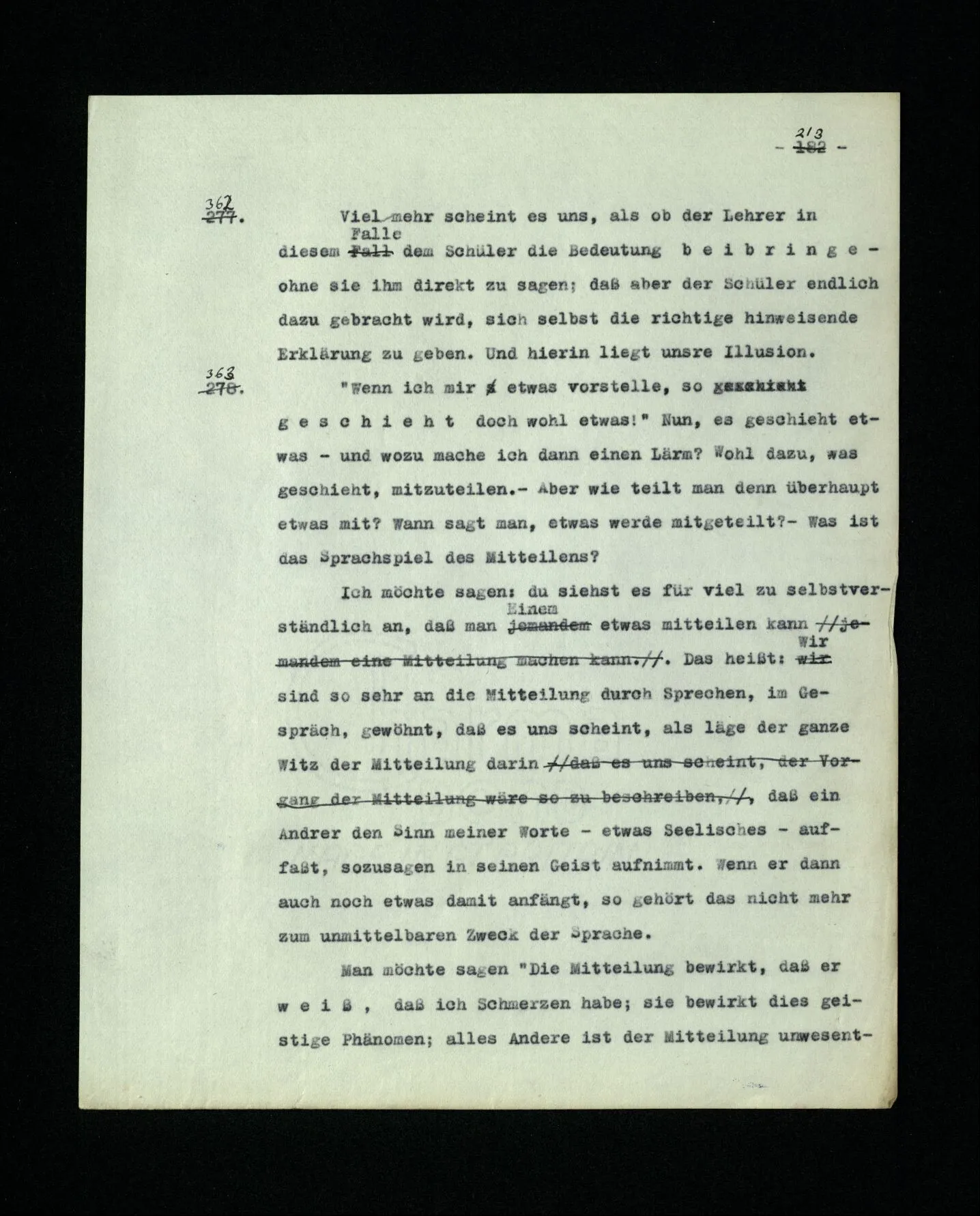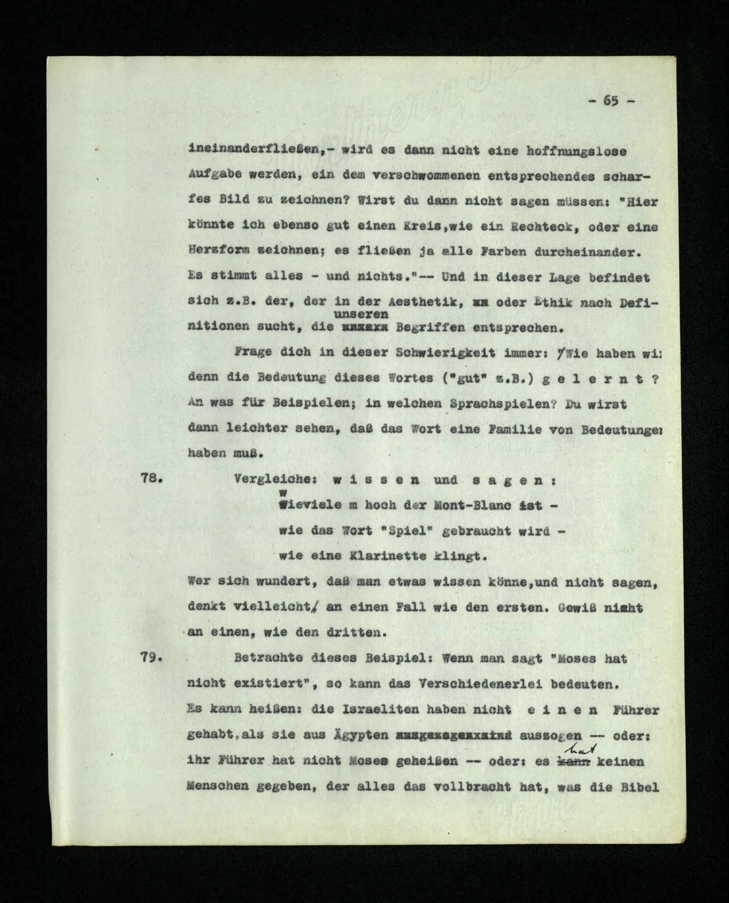 652. “Er maß ihn mit feindseligem Blick und sagte …” Der Leser der Erzählung versteht dies; er hat keinen Zweifel in seiner Seele. Nun sagst du: “Wohl, er denkt sich die Bedeutung hinzu, er errät sie.” – Im allgemeinen: Nein. Im allgemeinen denkt er sich nichts hinzu, errät nichts. – Es ist aber auch möglich, daß der feindselige Blick und die Worte sich später als Verstellung erweisen, oder daß der Leser im Zweifel darüber erhalten wird, ob sie es sind oder nicht, und daß er also wirklich auf eine mögliche Deutung rät. – Aber dann rät er vor allem auf einen Zusammenhang. Er sagt sich etwa: die Beiden, die hier so feindlich tun, sind in Wirklichkeit Freunde, etc. etc. ((“Wenn du den Satz verstehen willst, mußt du dir die seelische Bedeutung, die Seelenzustände, dazu vorstellen.”))