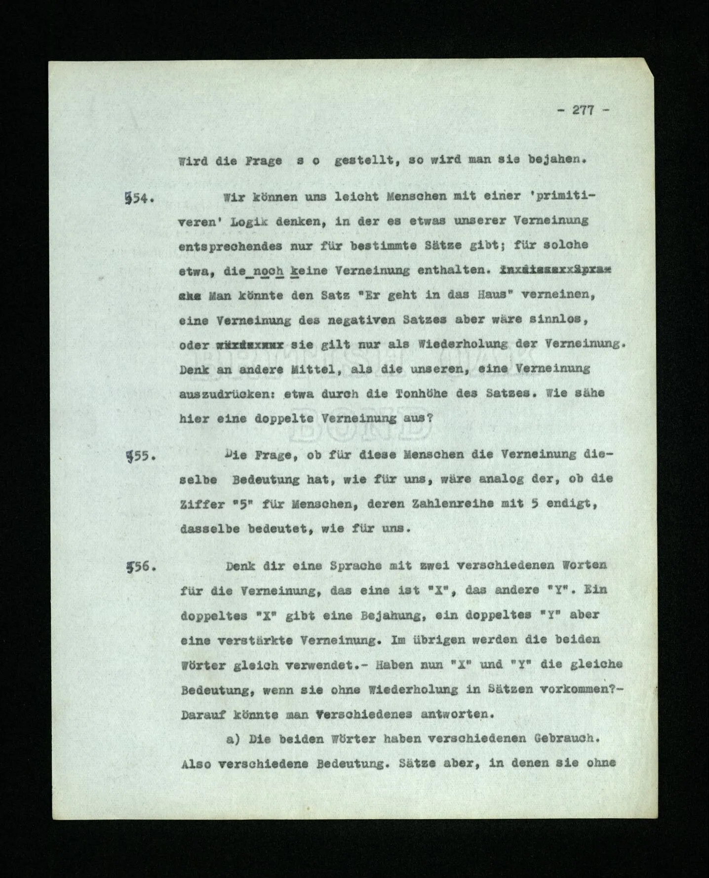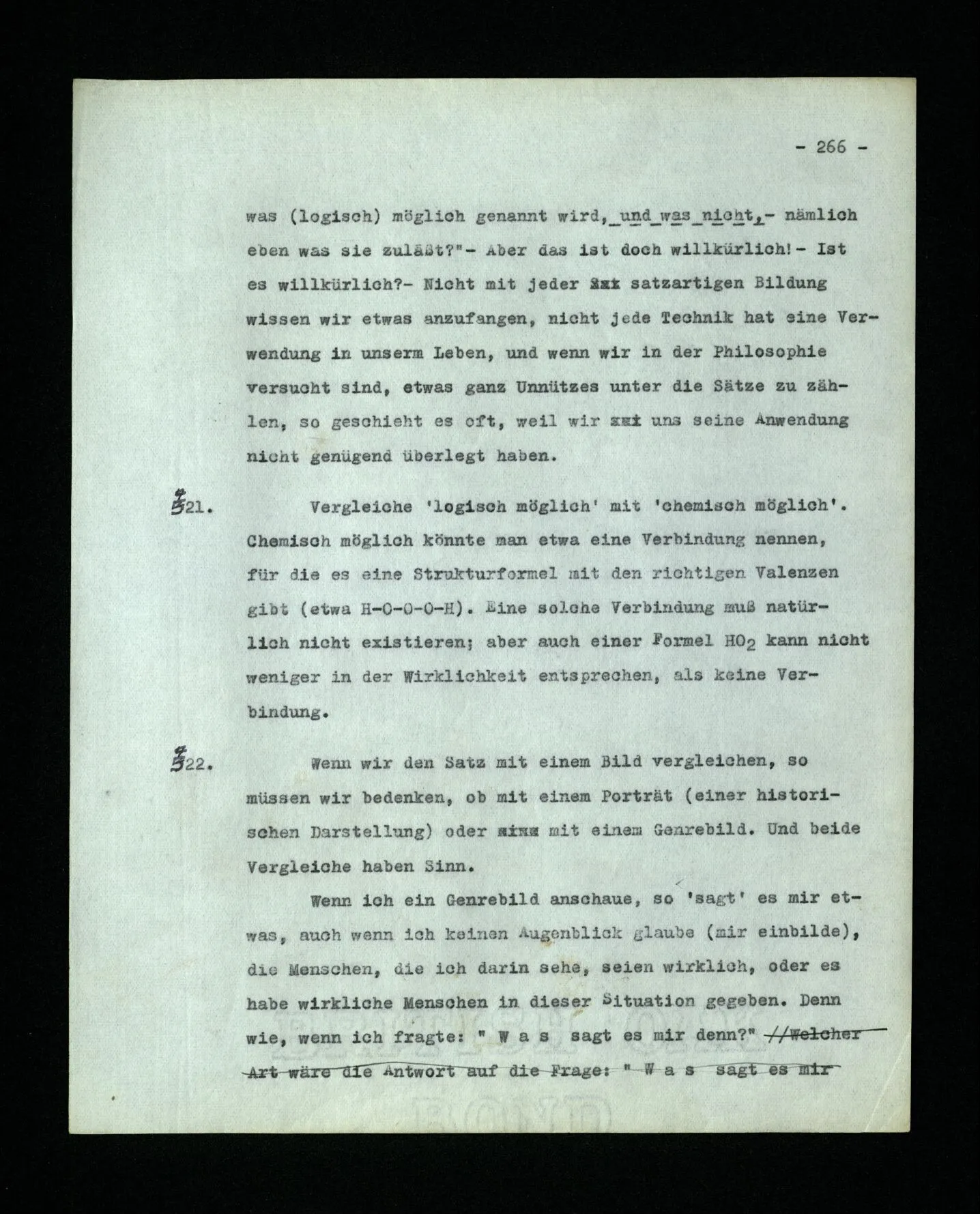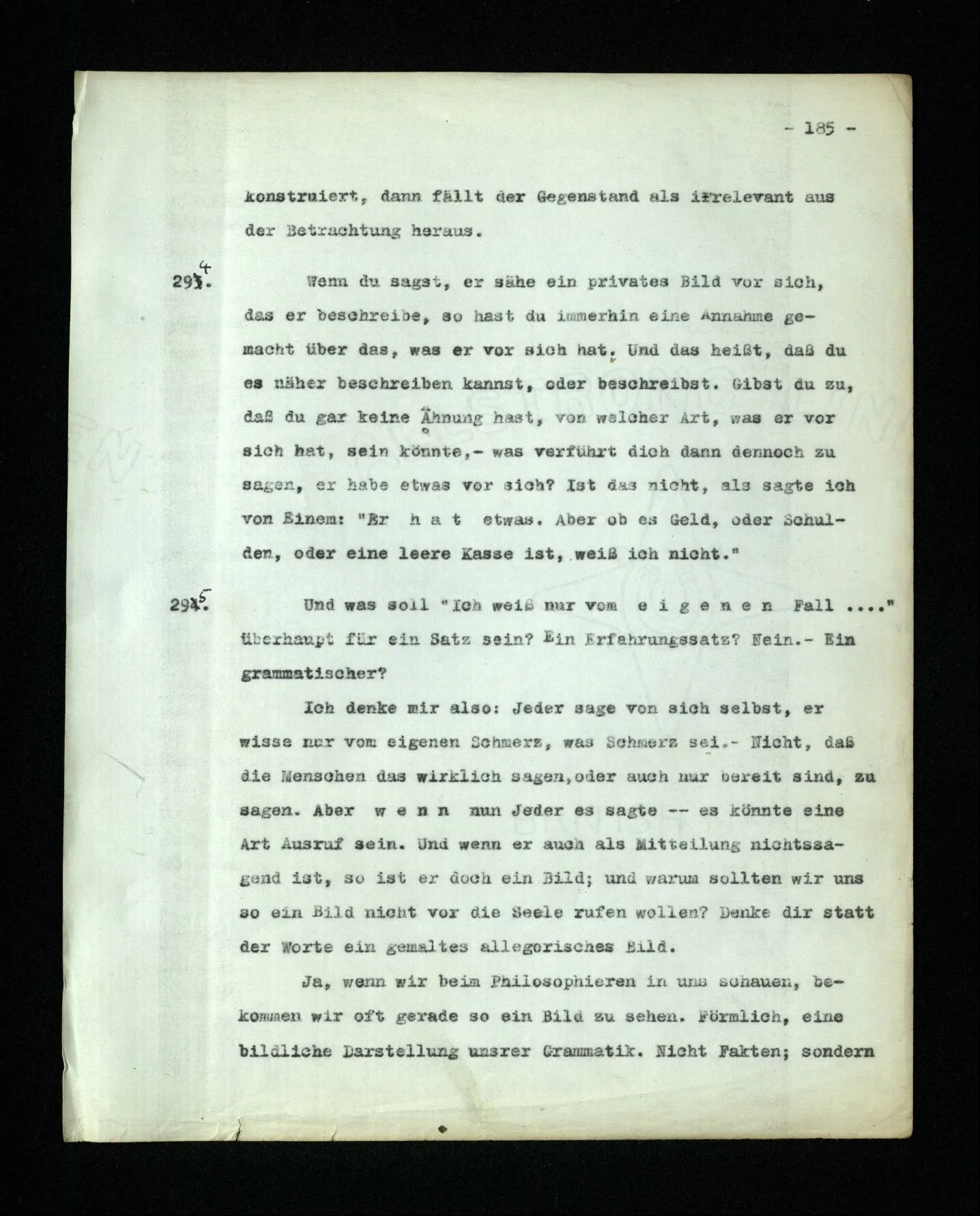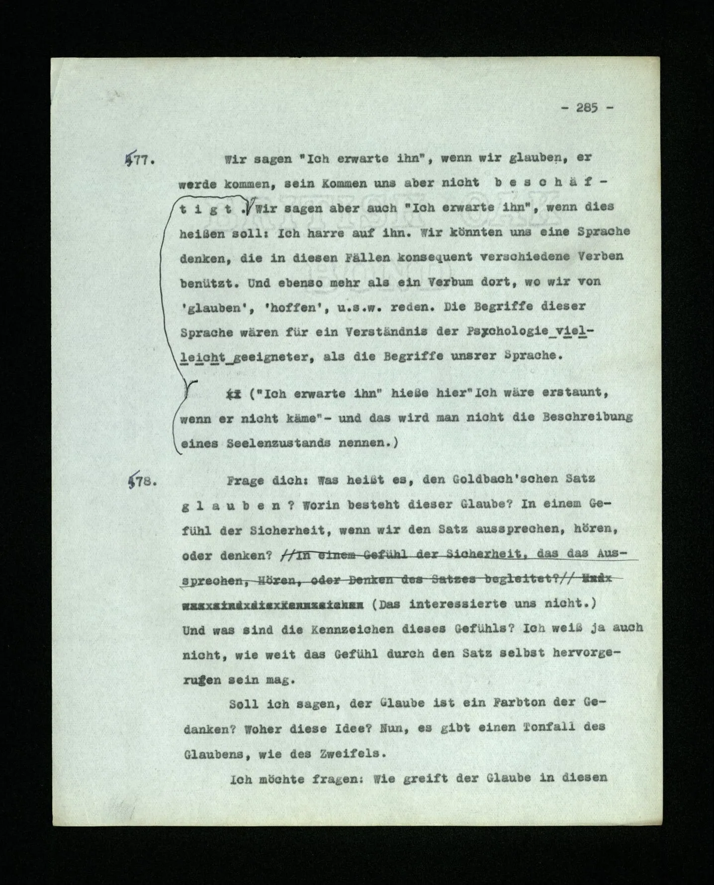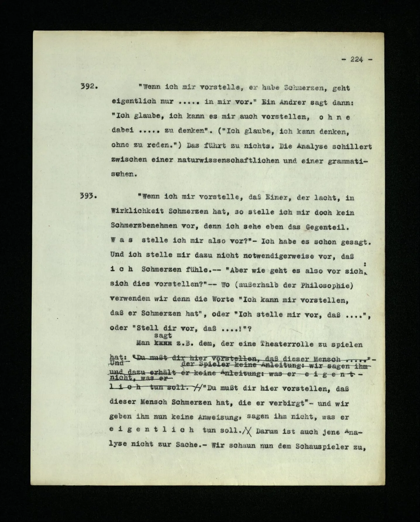652. “Er maß ihn mit feindseligem Blick und sagte …” Der Leser der Erzählung versteht dies; er hat keinen Zweifel in seiner Seele. Nun sagst du: “Wohl, er denkt sich die Bedeutung hinzu, er errät sie.” – Im allgemeinen: Nein. Im allgemeinen denkt er sich nichts hinzu, errät nichts. – Es ist aber auch möglich, daß der feindselige Blick und die Worte sich später als Verstellung erweisen, oder daß der Leser im Zweifel darüber erhalten wird, ob sie es sind oder nicht, und daß er also wirklich auf eine mögliche Deutung rät. – Aber dann rät er vor allem auf einen Zusammenhang. Er sagt sich etwa: die Beiden, die hier so feindlich tun, sind in Wirklichkeit Freunde, etc. etc. ((“Wenn du den Satz verstehen willst, mußt du dir die seelische Bedeutung, die Seelenzustände, dazu vorstellen.”))