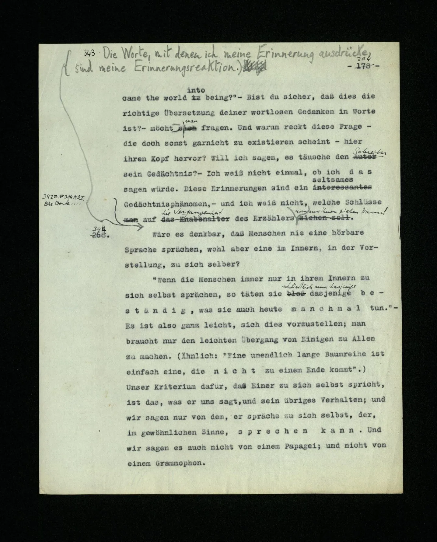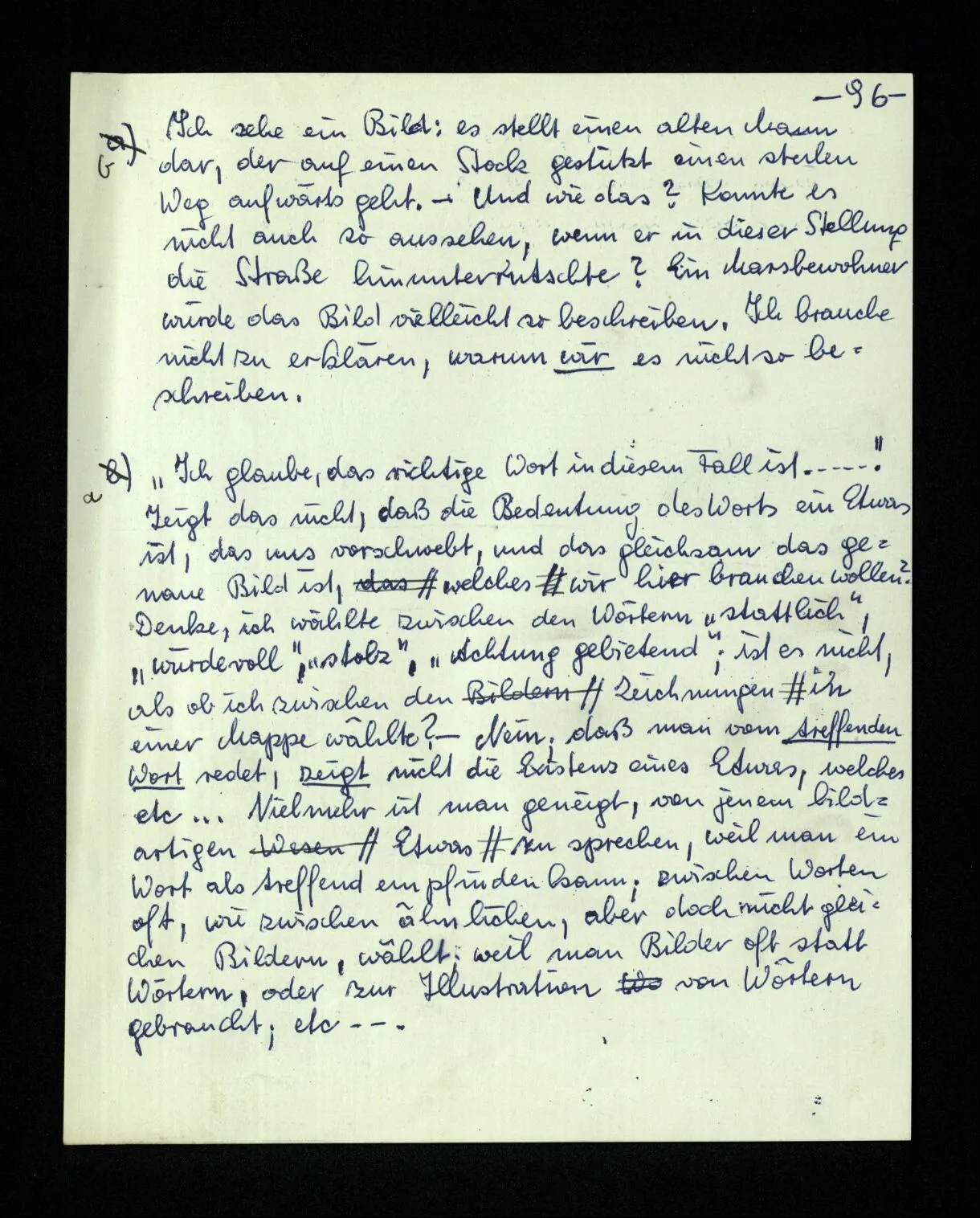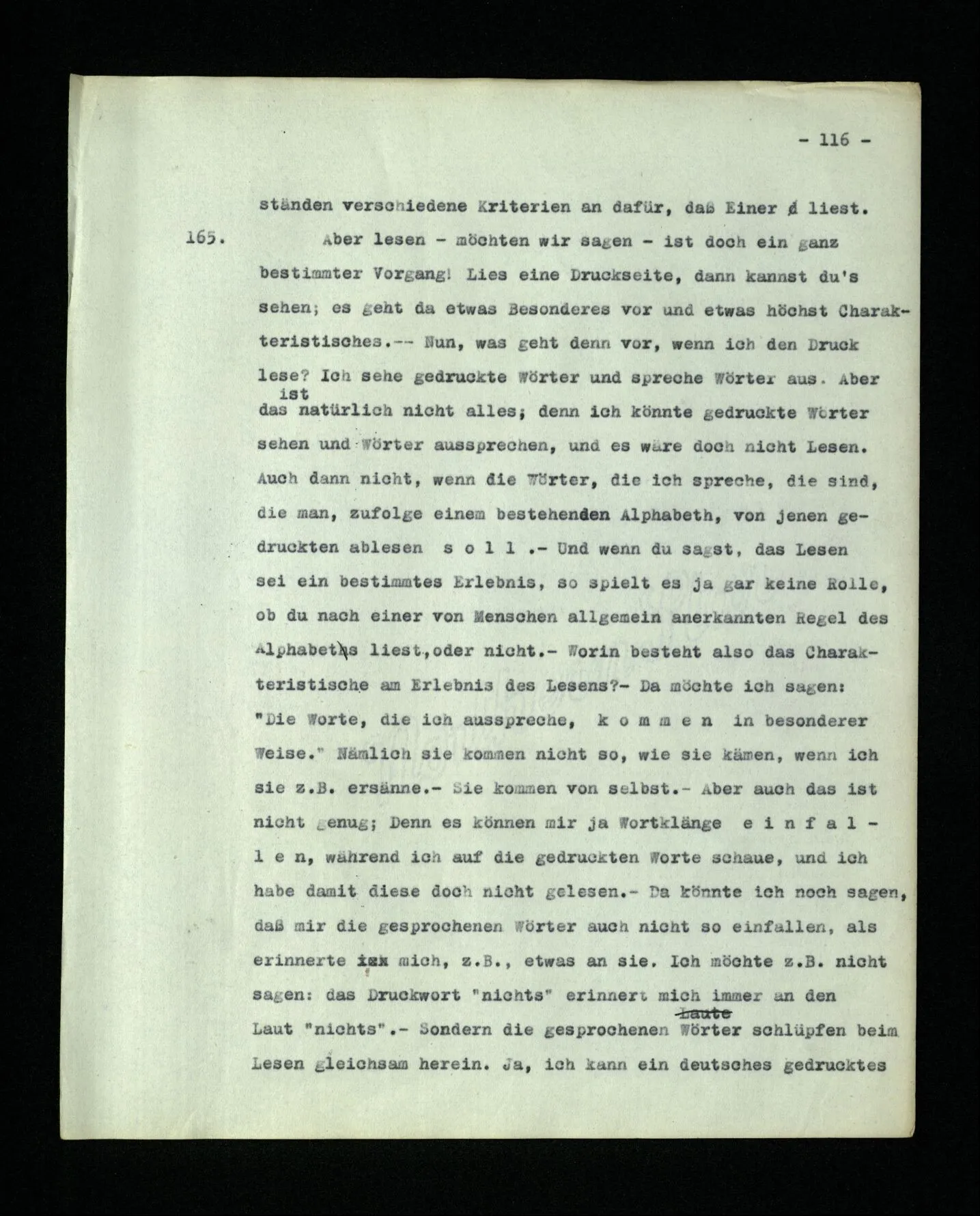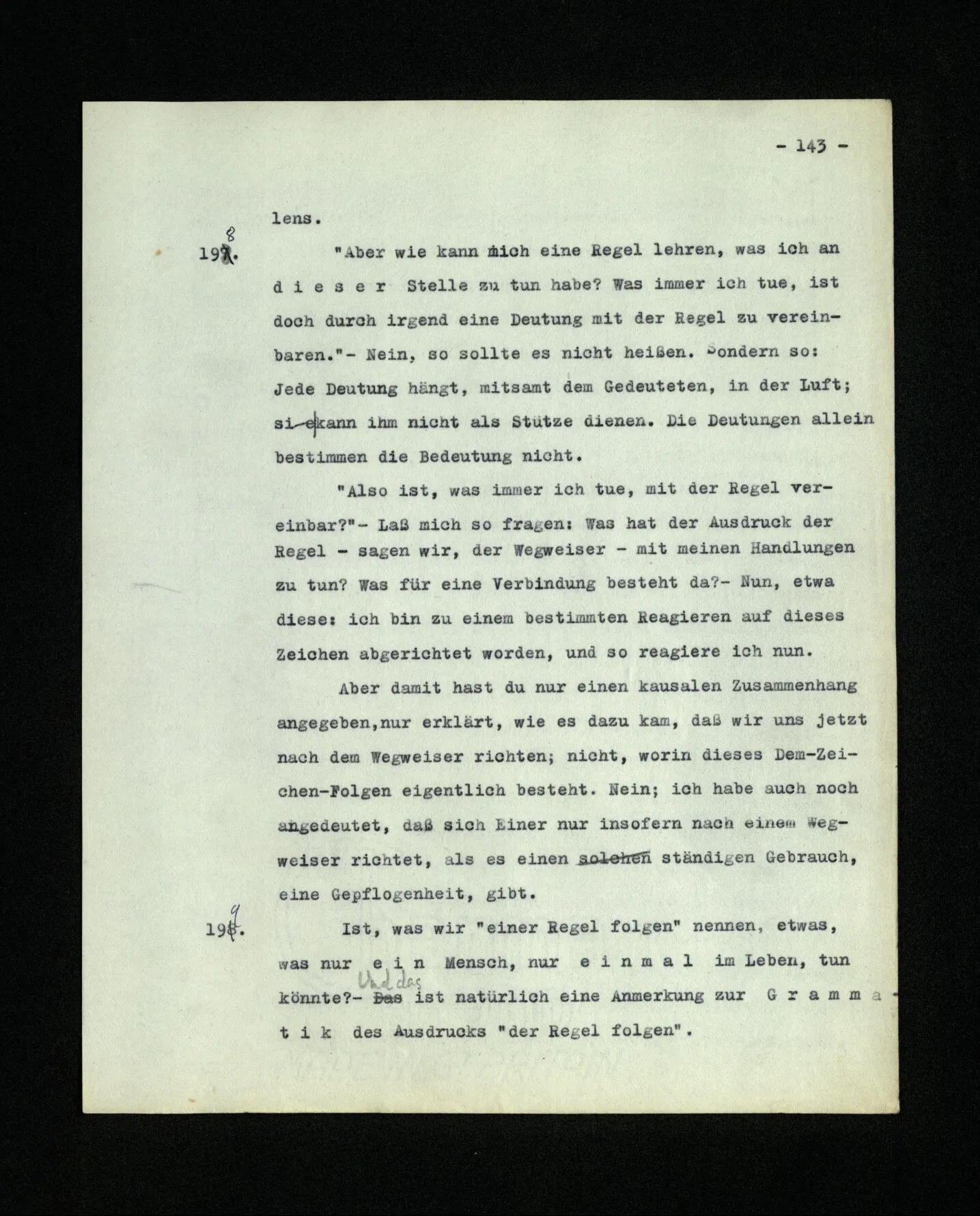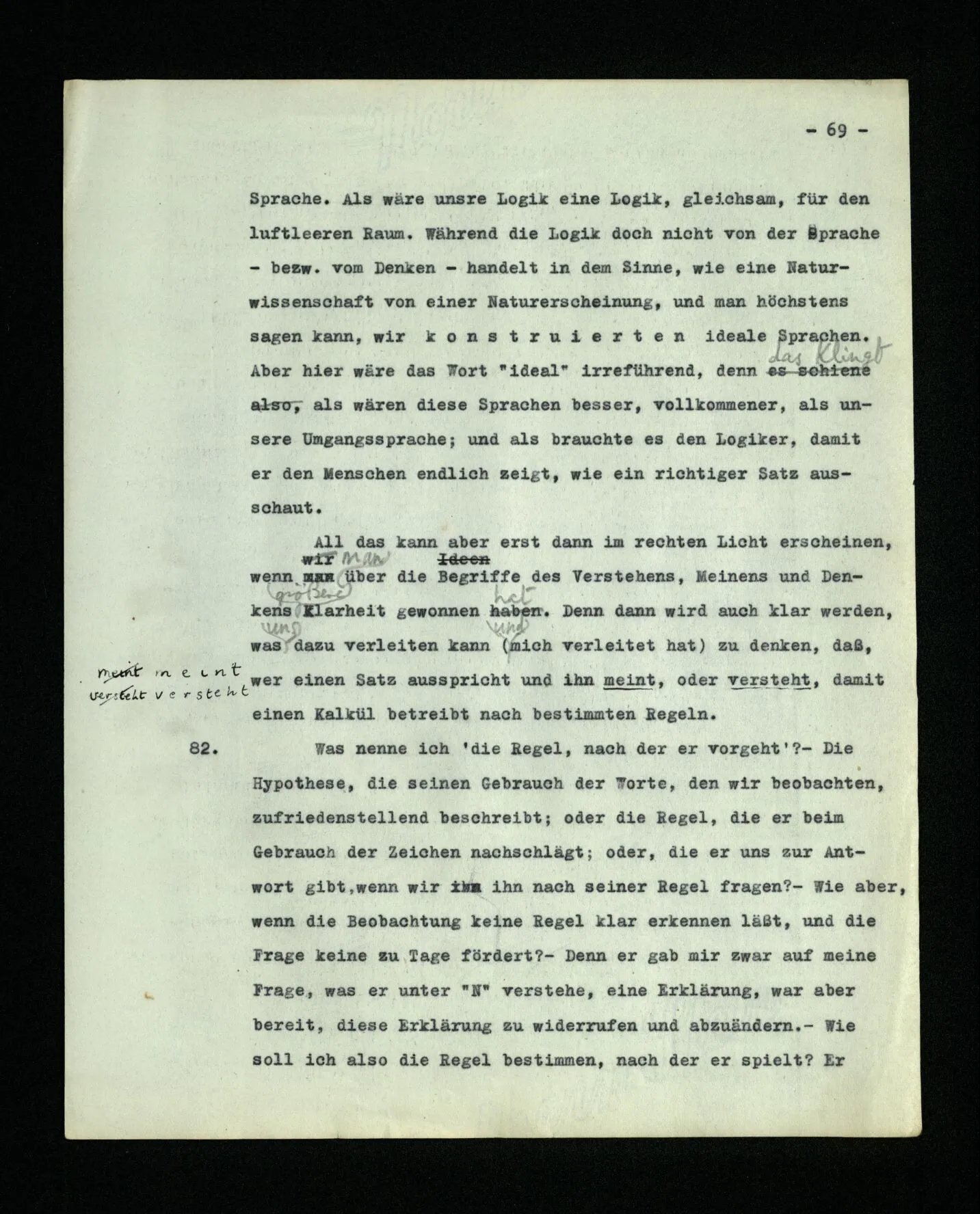 652. “Er maß ihn mit feindseligem Blick und sagte …” Der Leser der Erzählung versteht dies; er hat keinen Zweifel in seiner Seele. Nun sagst du: “Wohl, er denkt sich die Bedeutung hinzu, er errät sie.” – Im allgemeinen: Nein. Im allgemeinen denkt er sich nichts hinzu, errät nichts. – Es ist aber auch möglich, daß der feindselige Blick und die Worte sich später als Verstellung erweisen, oder daß der Leser im Zweifel darüber erhalten wird, ob sie es sind oder nicht, und daß er also wirklich auf eine mögliche Deutung rät. – Aber dann rät er vor allem auf einen Zusammenhang. Er sagt sich etwa: die Beiden, die hier so feindlich tun, sind in Wirklichkeit Freunde, etc. etc. ((“Wenn du den Satz verstehen willst, mußt du dir die seelische Bedeutung, die Seelenzustände, dazu vorstellen.”))