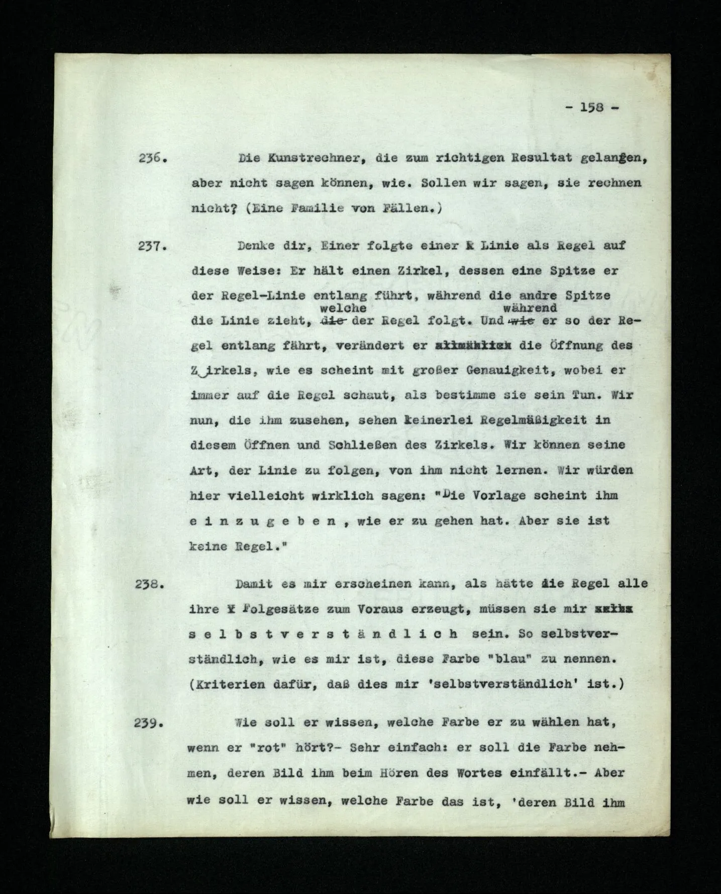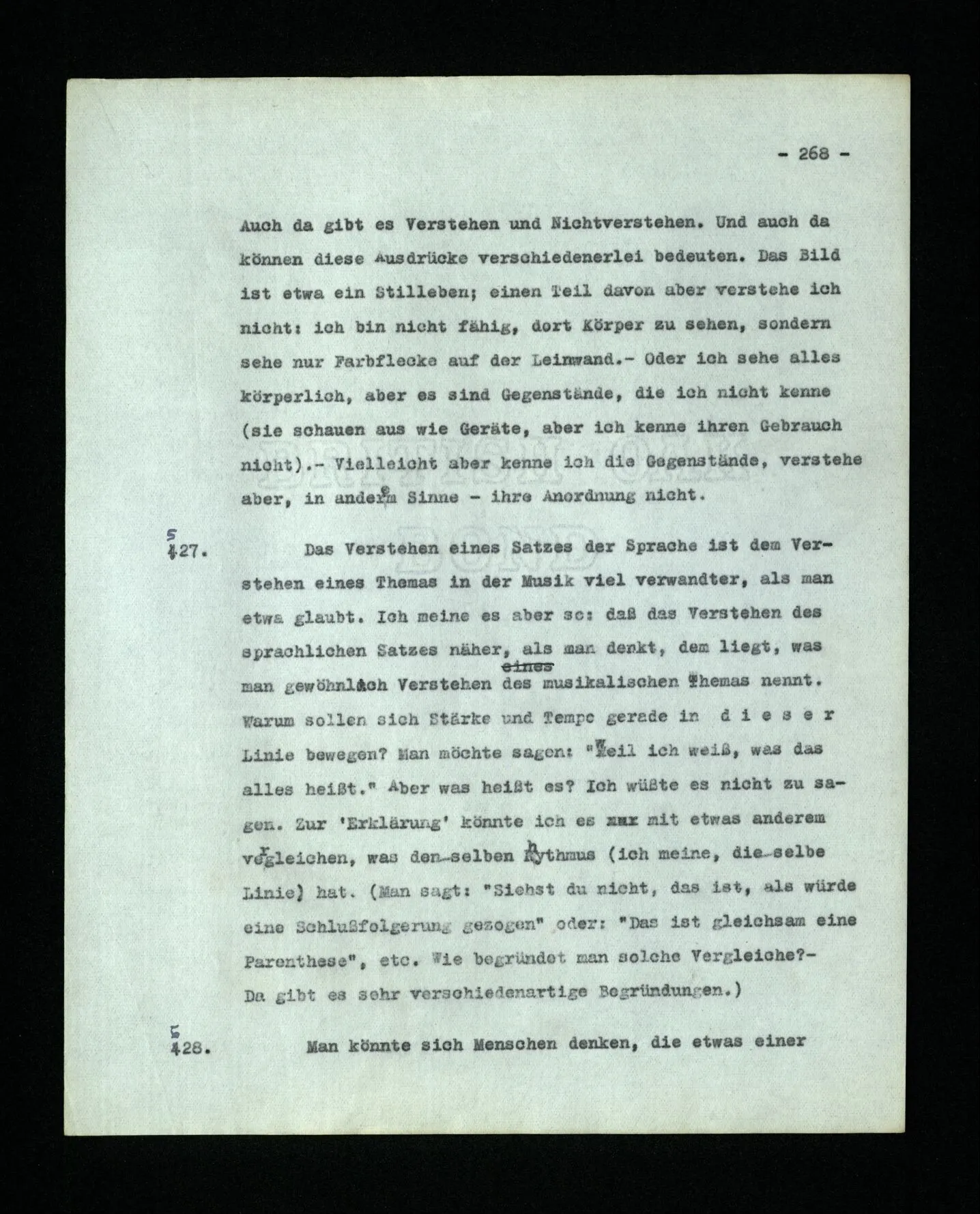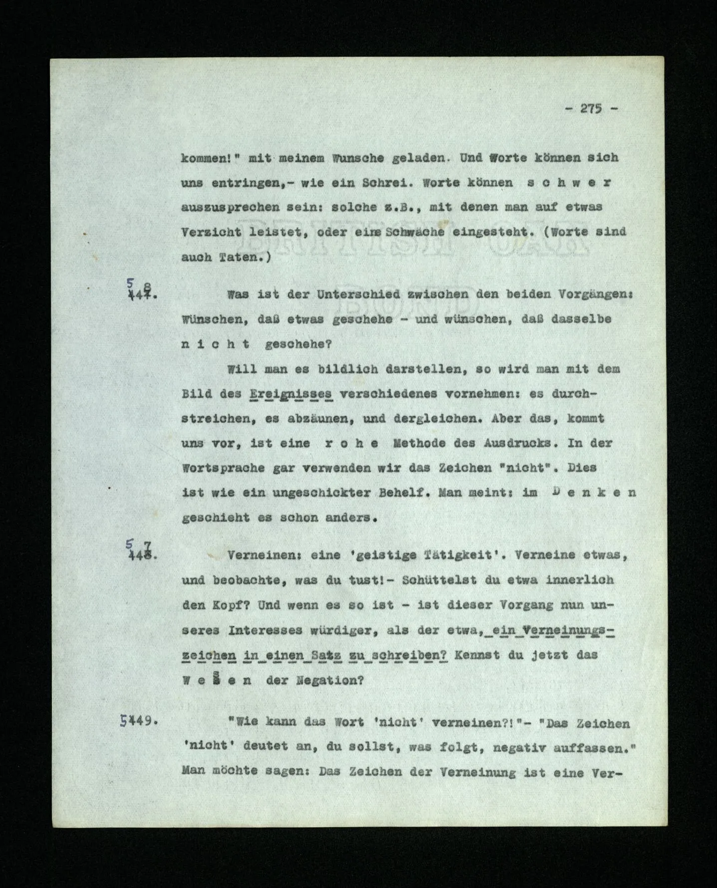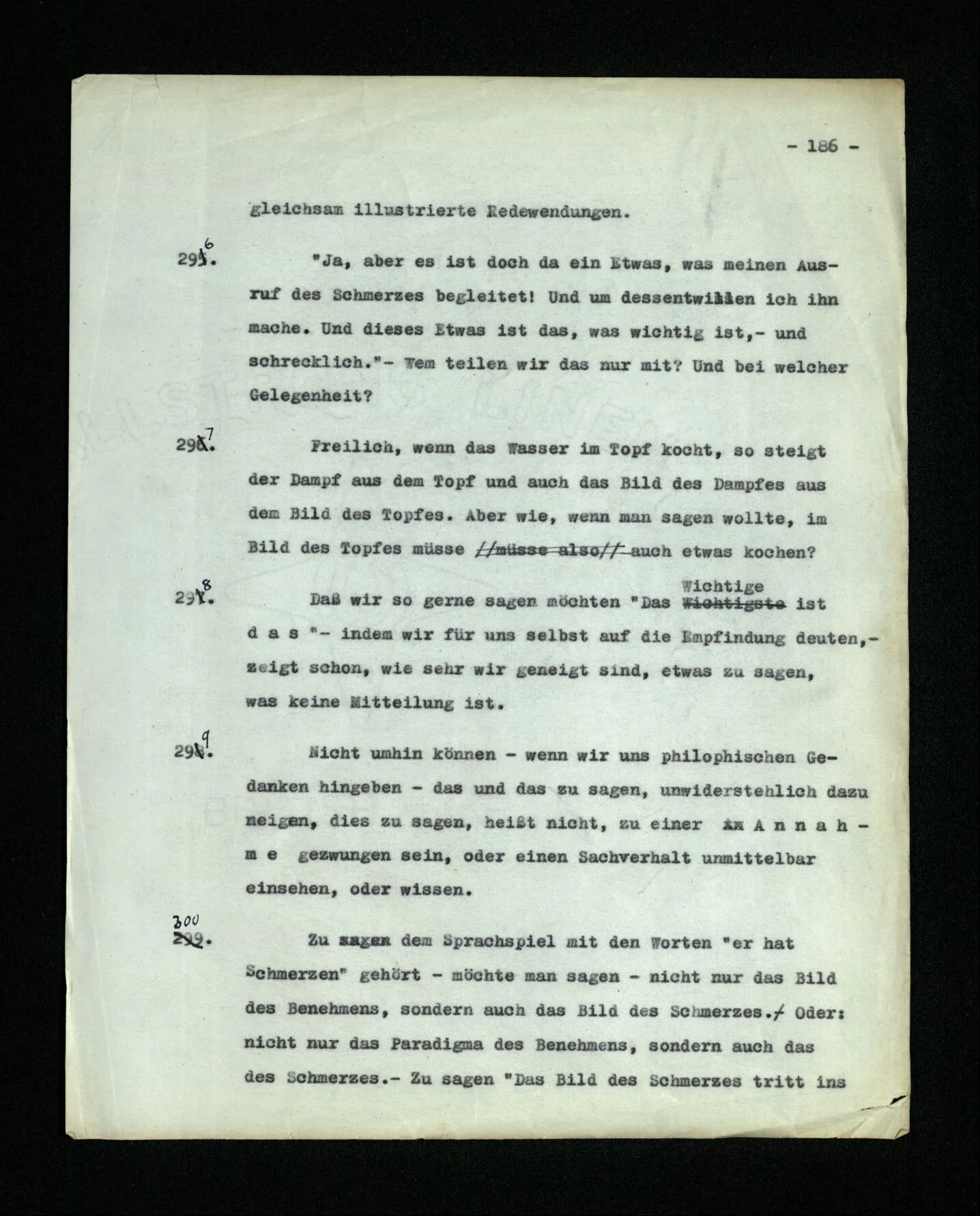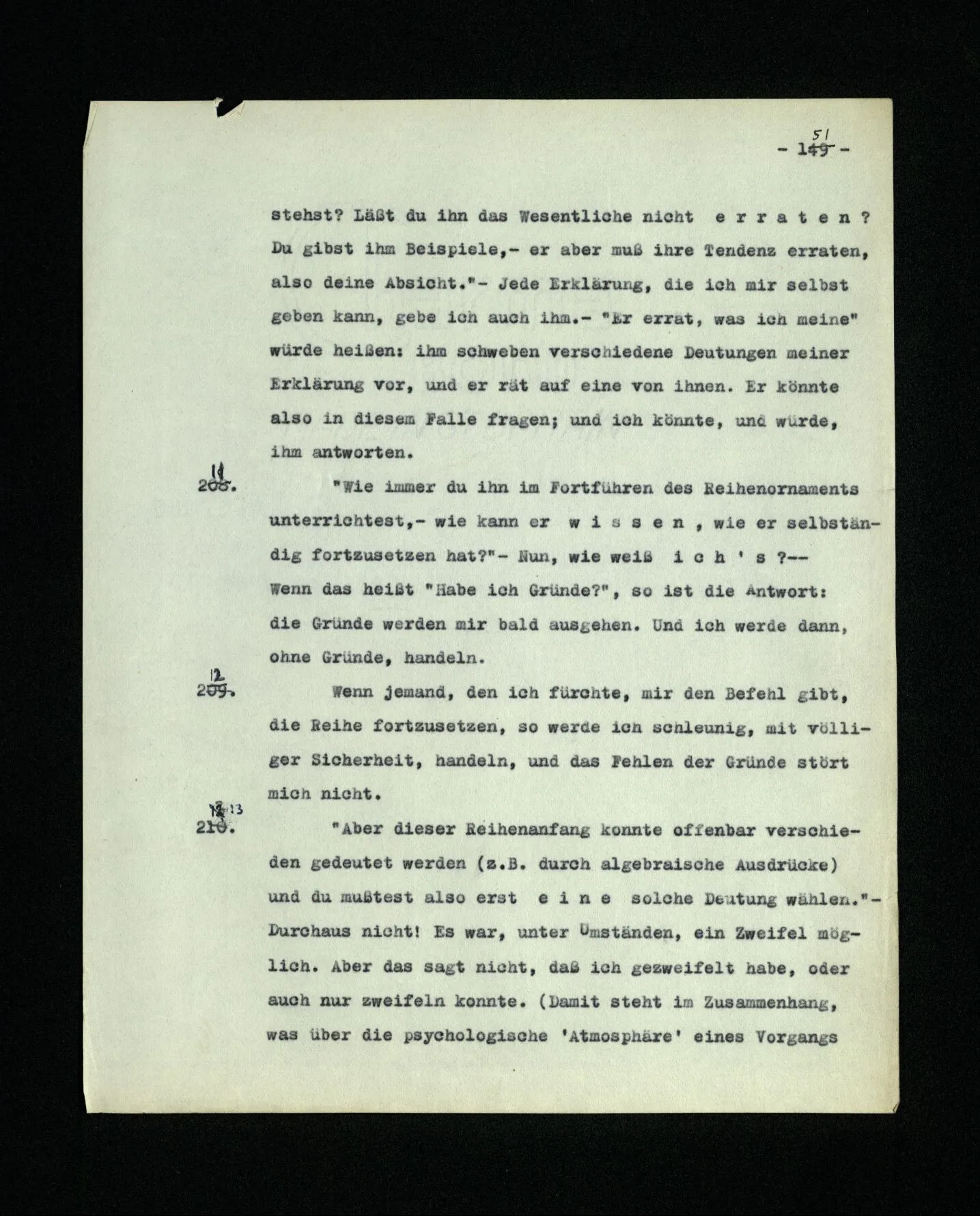 652. “Er maß ihn mit feindseligem Blick und sagte …” Der Leser der Erzählung versteht dies; er hat keinen Zweifel in seiner Seele. Nun sagst du: “Wohl, er denkt sich die Bedeutung hinzu, er errät sie.” – Im allgemeinen: Nein. Im allgemeinen denkt er sich nichts hinzu, errät nichts. – Es ist aber auch möglich, daß der feindselige Blick und die Worte sich später als Verstellung erweisen, oder daß der Leser im Zweifel darüber erhalten wird, ob sie es sind oder nicht, und daß er also wirklich auf eine mögliche Deutung rät. – Aber dann rät er vor allem auf einen Zusammenhang. Er sagt sich etwa: die Beiden, die hier so feindlich tun, sind in Wirklichkeit Freunde, etc. etc. ((“Wenn du den Satz verstehen willst, mußt du dir die seelische Bedeutung, die Seelenzustände, dazu vorstellen.”))