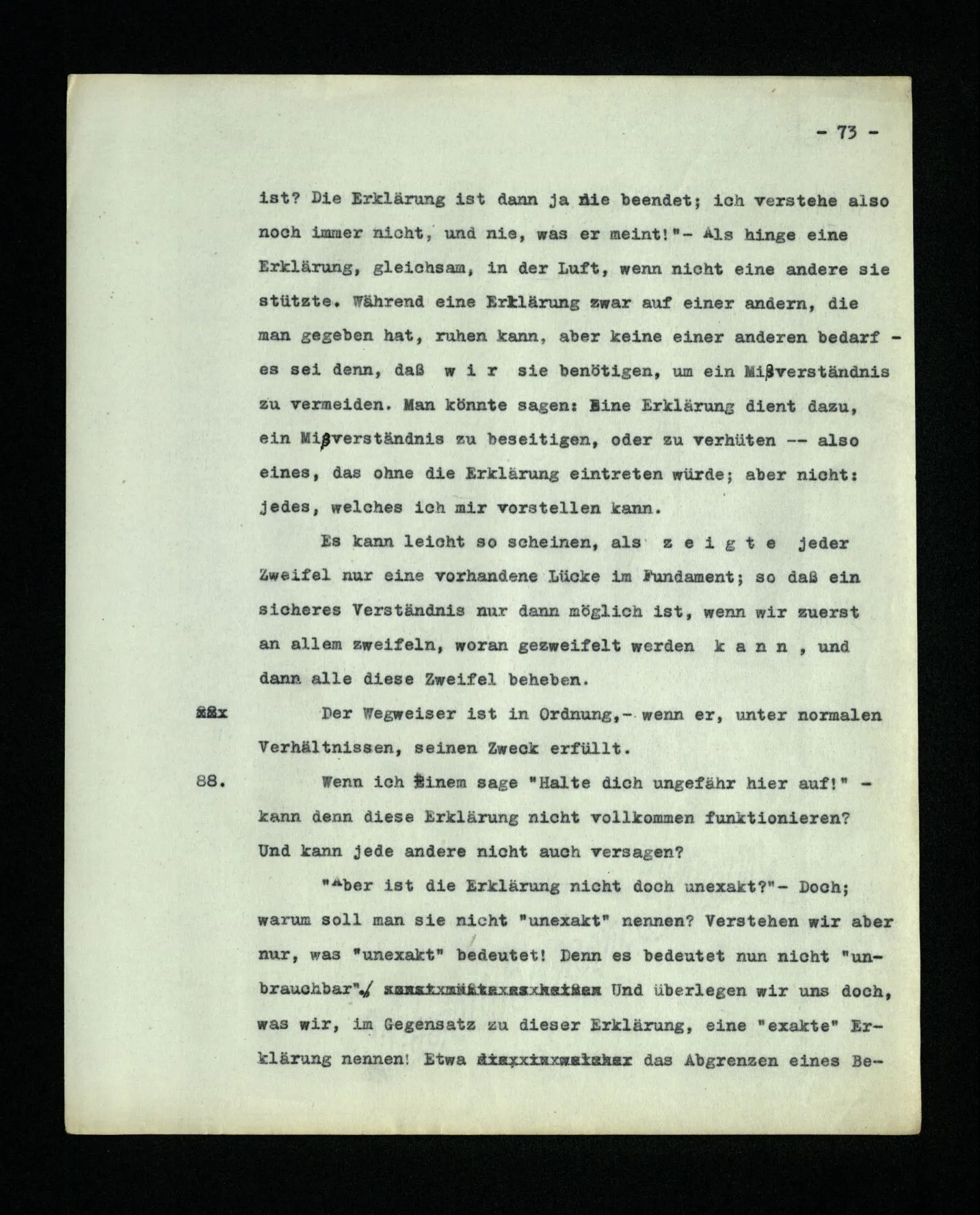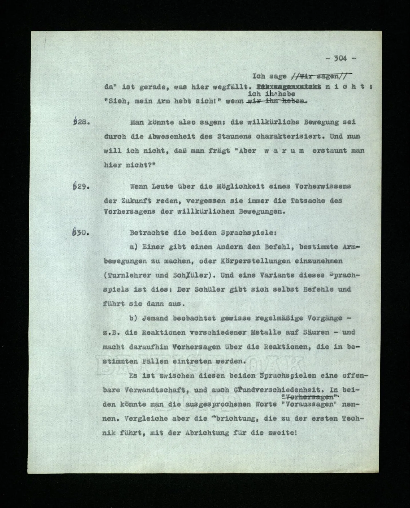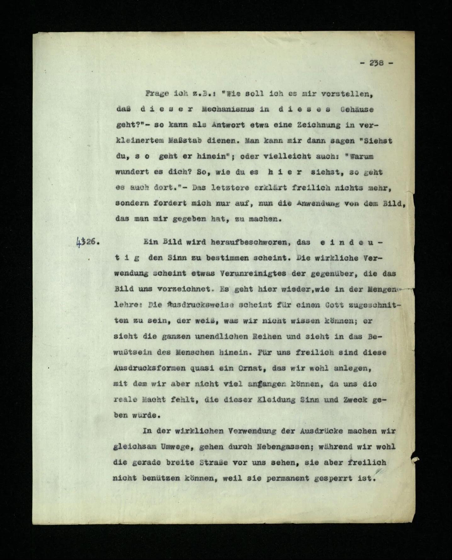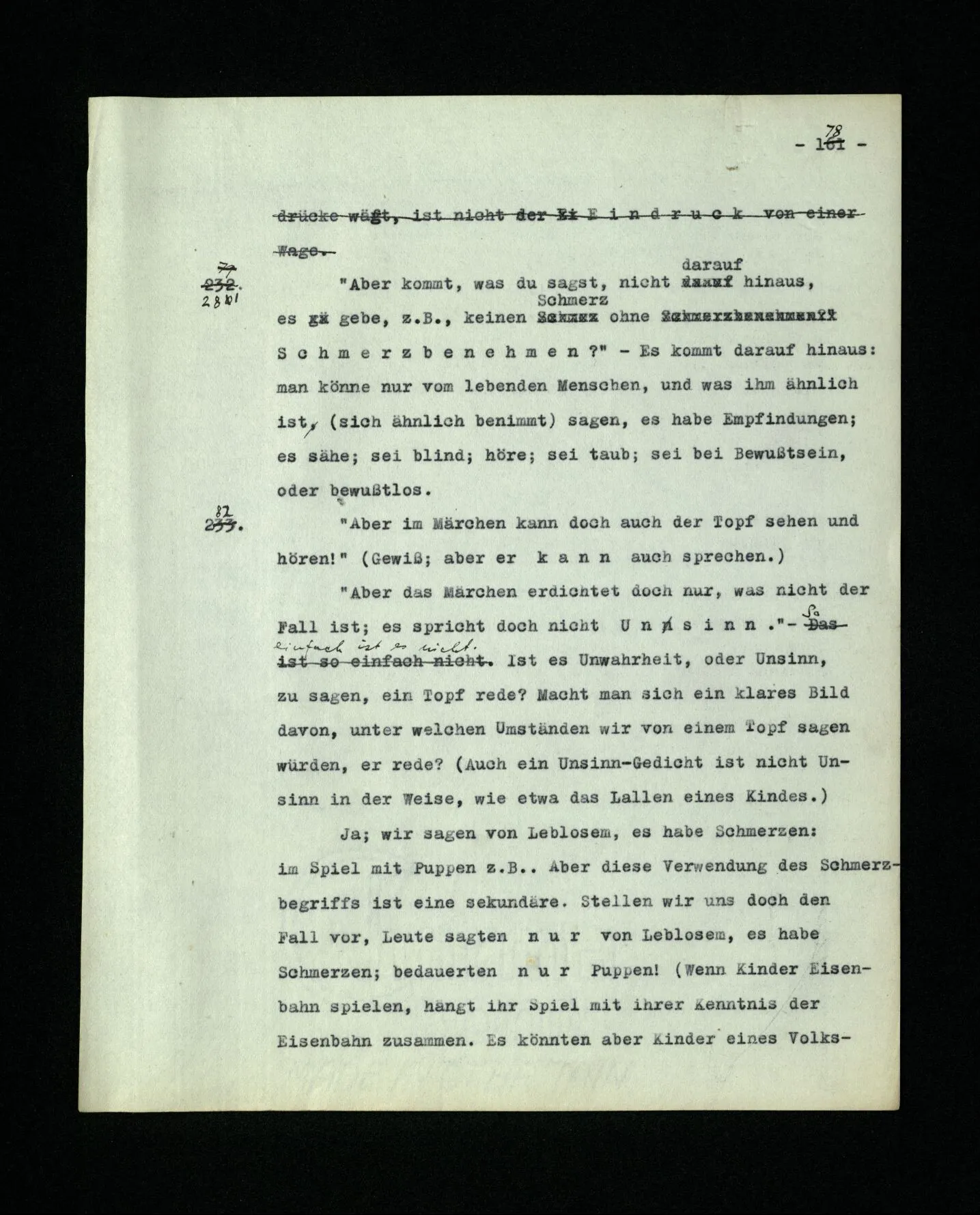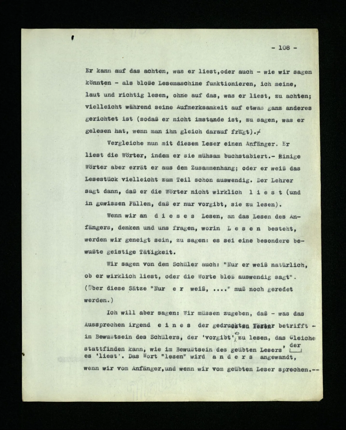 652. “Er maß ihn mit feindseligem Blick und sagte …” Der Leser der Erzählung versteht dies; er hat keinen Zweifel in seiner Seele. Nun sagst du: “Wohl, er denkt sich die Bedeutung hinzu, er errät sie.” – Im allgemeinen: Nein. Im allgemeinen denkt er sich nichts hinzu, errät nichts. – Es ist aber auch möglich, daß der feindselige Blick und die Worte sich später als Verstellung erweisen, oder daß der Leser im Zweifel darüber erhalten wird, ob sie es sind oder nicht, und daß er also wirklich auf eine mögliche Deutung rät. – Aber dann rät er vor allem auf einen Zusammenhang. Er sagt sich etwa: die Beiden, die hier so feindlich tun, sind in Wirklichkeit Freunde, etc. etc. ((“Wenn du den Satz verstehen willst, mußt du dir die seelische Bedeutung, die Seelenzustände, dazu vorstellen.”))