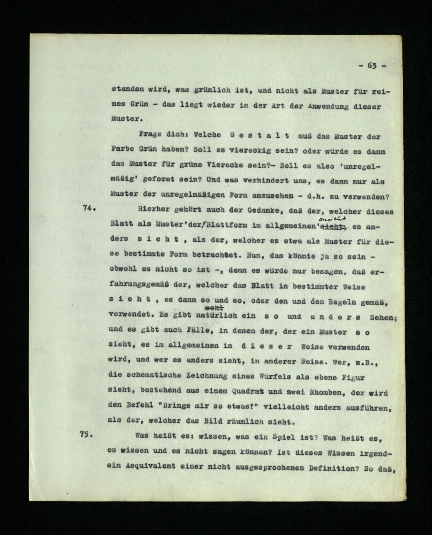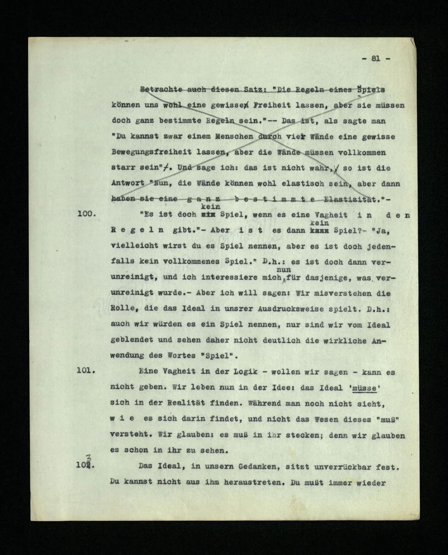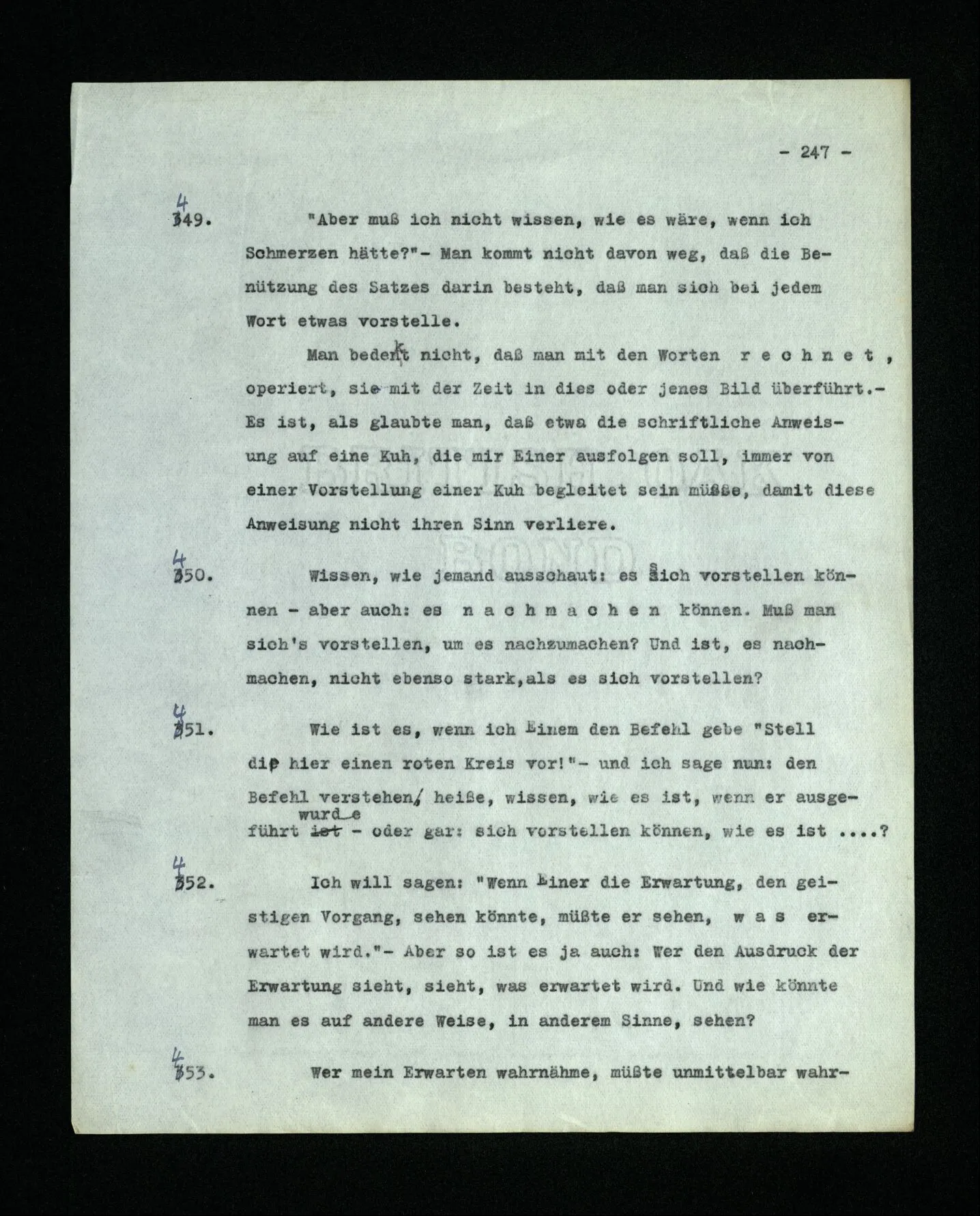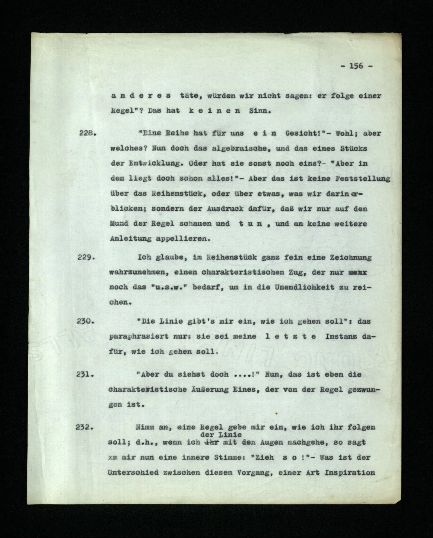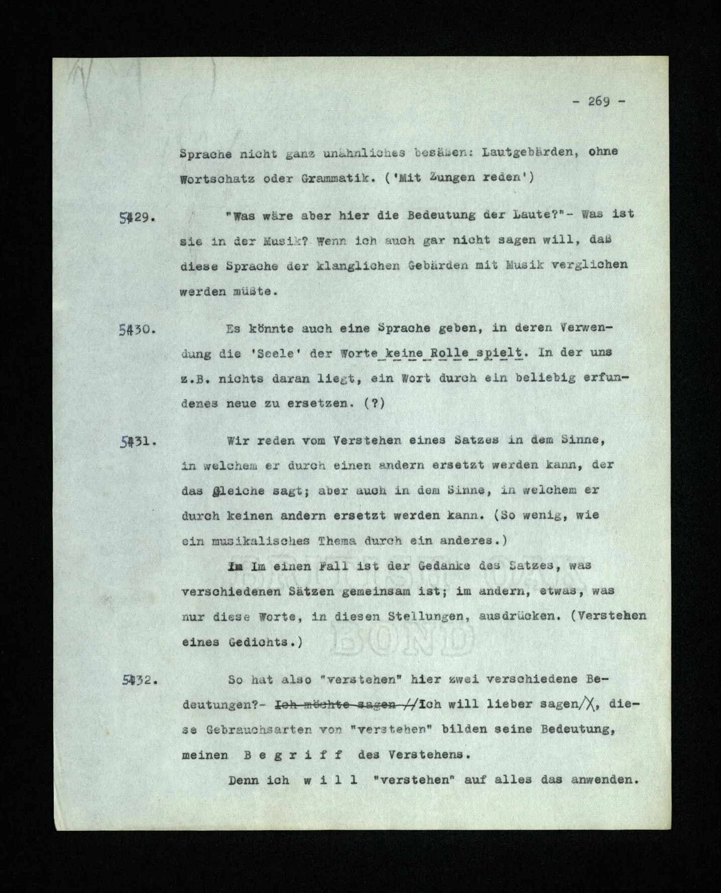 652. “Er maß ihn mit feindseligem Blick und sagte …” Der Leser der Erzählung versteht dies; er hat keinen Zweifel in seiner Seele. Nun sagst du: “Wohl, er denkt sich die Bedeutung hinzu, er errät sie.” – Im allgemeinen: Nein. Im allgemeinen denkt er sich nichts hinzu, errät nichts. – Es ist aber auch möglich, daß der feindselige Blick und die Worte sich später als Verstellung erweisen, oder daß der Leser im Zweifel darüber erhalten wird, ob sie es sind oder nicht, und daß er also wirklich auf eine mögliche Deutung rät. – Aber dann rät er vor allem auf einen Zusammenhang. Er sagt sich etwa: die Beiden, die hier so feindlich tun, sind in Wirklichkeit Freunde, etc. etc. ((“Wenn du den Satz verstehen willst, mußt du dir die seelische Bedeutung, die Seelenzustände, dazu vorstellen.”))