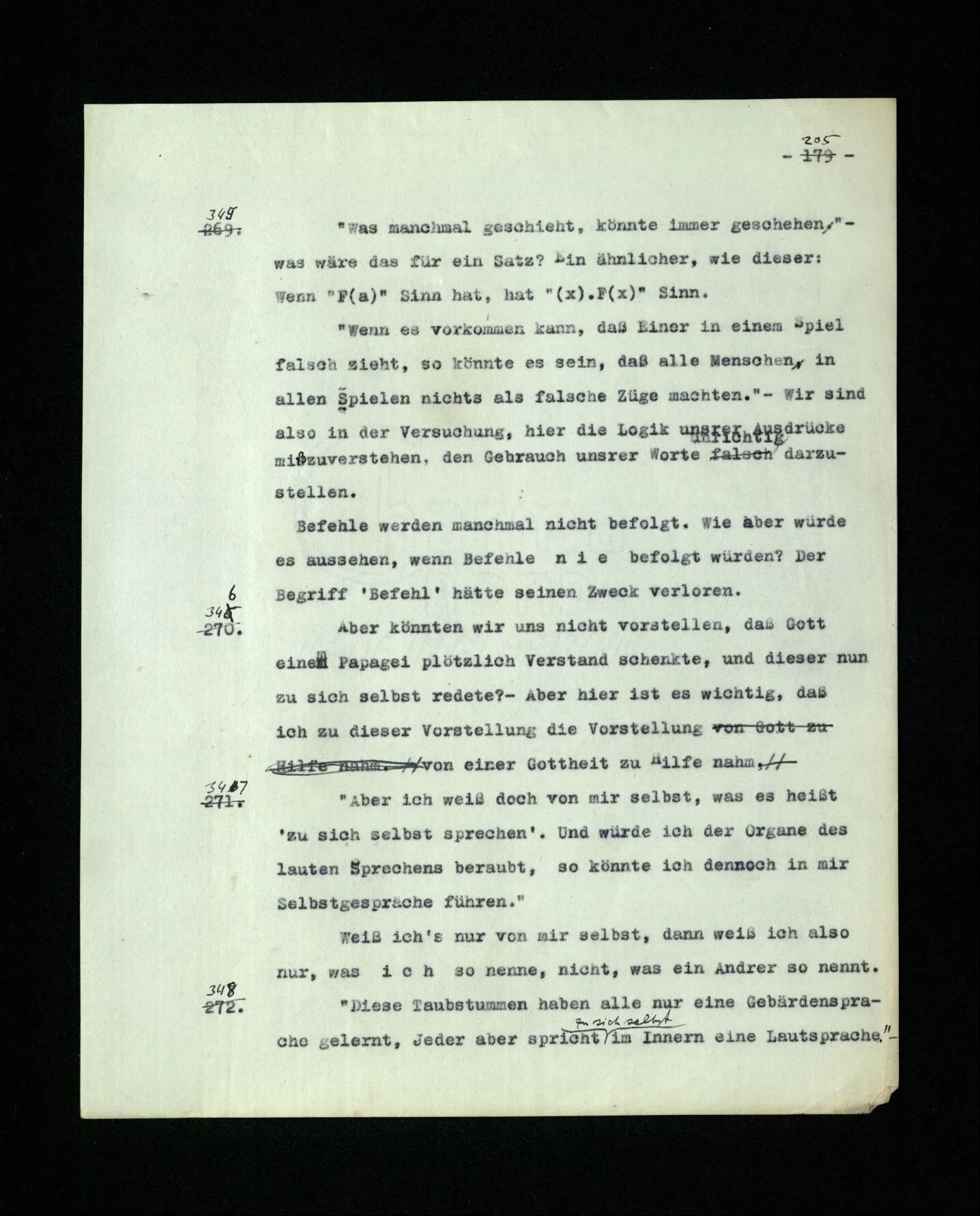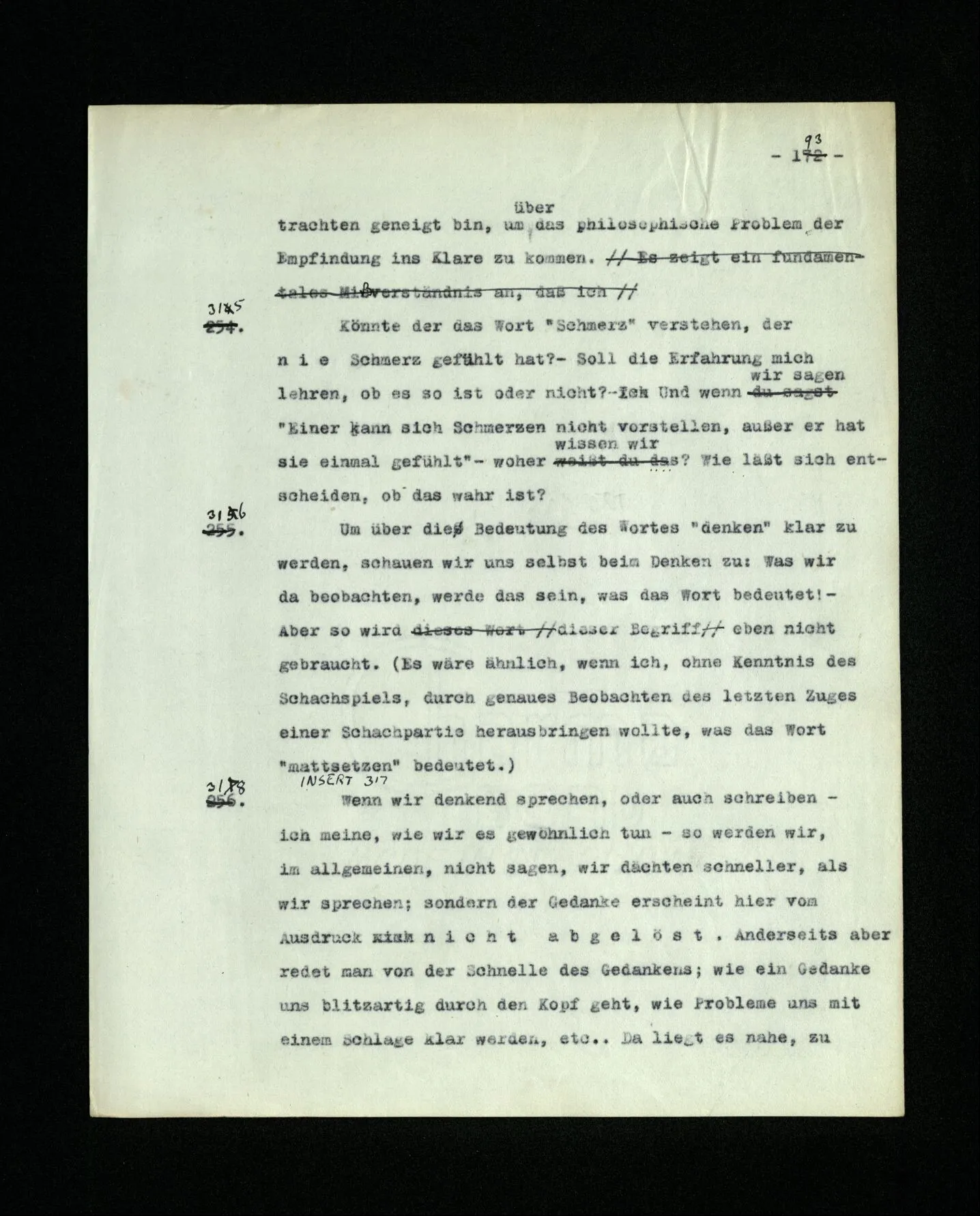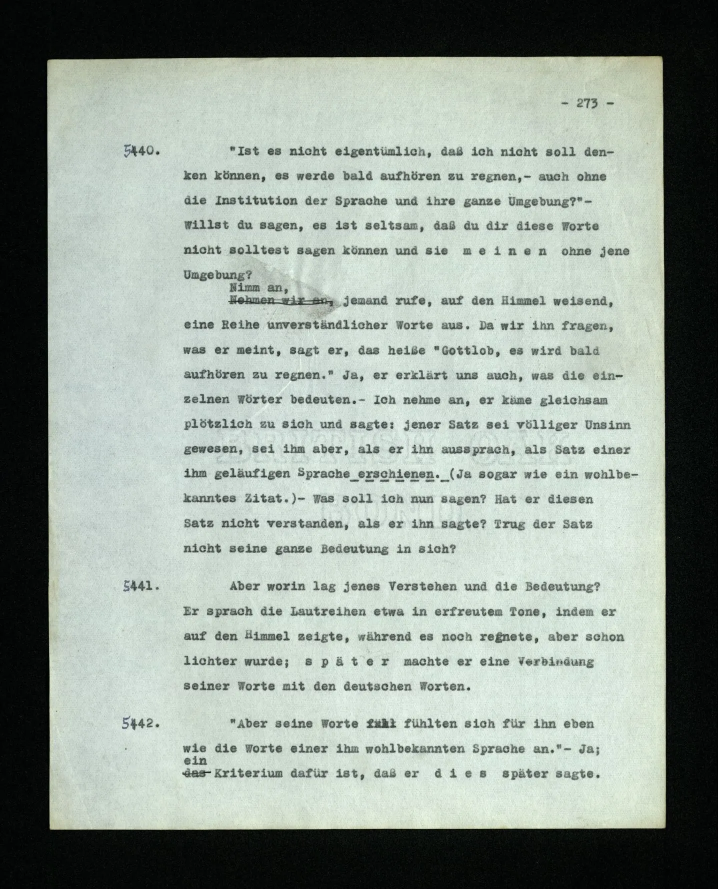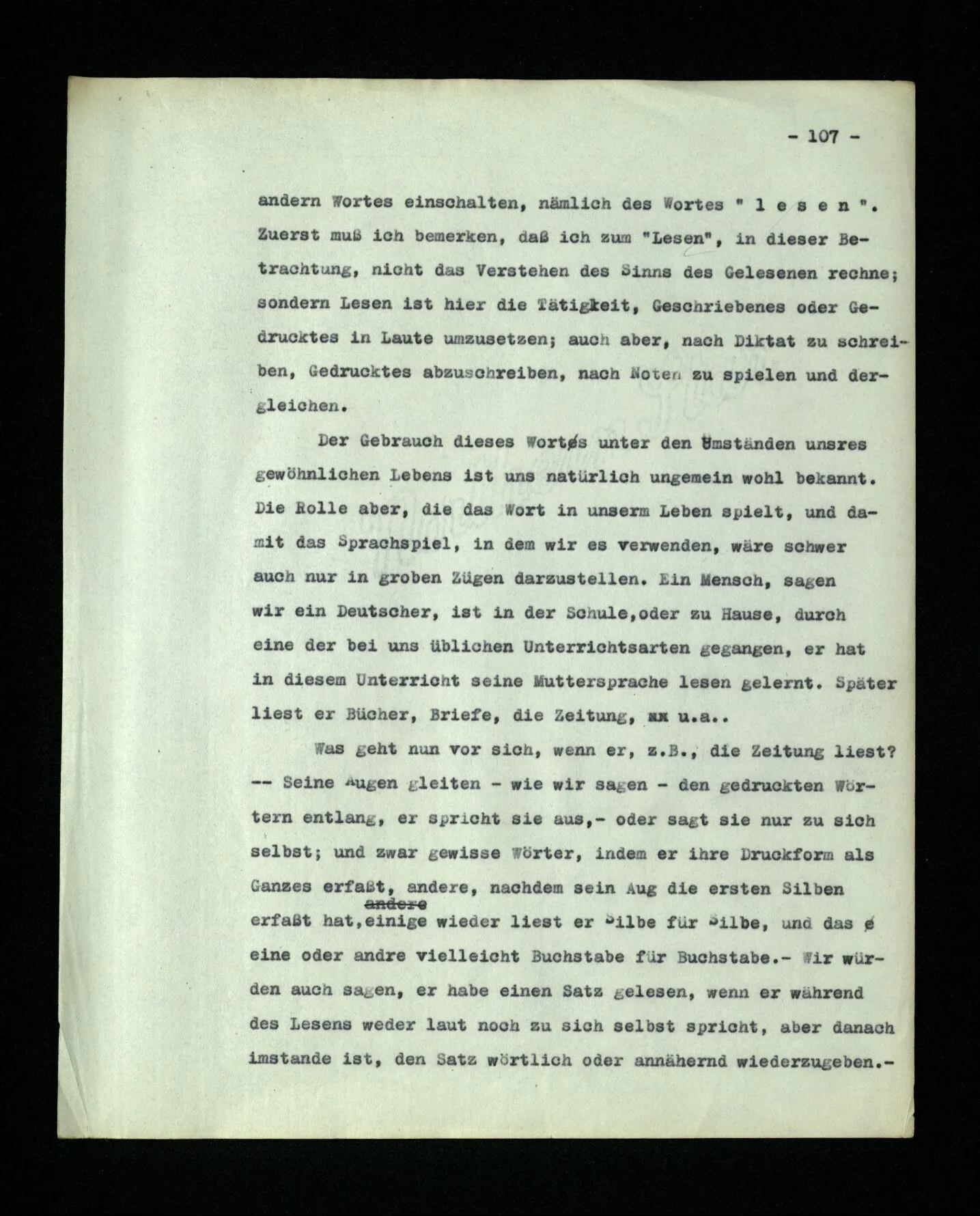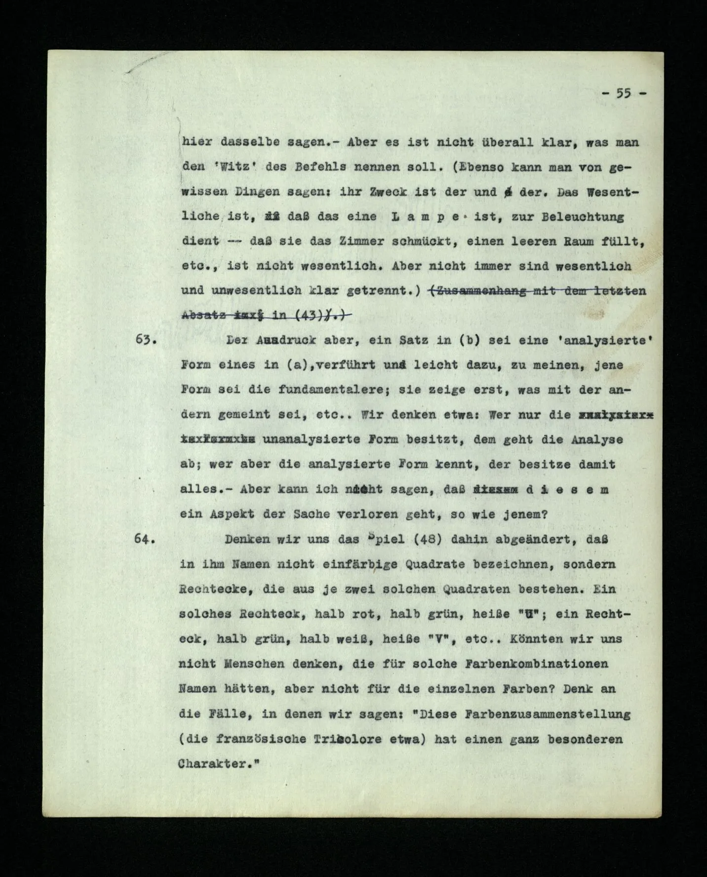 652. “Er maß ihn mit feindseligem Blick und sagte …” Der Leser der Erzählung versteht dies; er hat keinen Zweifel in seiner Seele. Nun sagst du: “Wohl, er denkt sich die Bedeutung hinzu, er errät sie.” – Im allgemeinen: Nein. Im allgemeinen denkt er sich nichts hinzu, errät nichts. – Es ist aber auch möglich, daß der feindselige Blick und die Worte sich später als Verstellung erweisen, oder daß der Leser im Zweifel darüber erhalten wird, ob sie es sind oder nicht, und daß er also wirklich auf eine mögliche Deutung rät. – Aber dann rät er vor allem auf einen Zusammenhang. Er sagt sich etwa: die Beiden, die hier so feindlich tun, sind in Wirklichkeit Freunde, etc. etc. ((“Wenn du den Satz verstehen willst, mußt du dir die seelische Bedeutung, die Seelenzustände, dazu vorstellen.”))