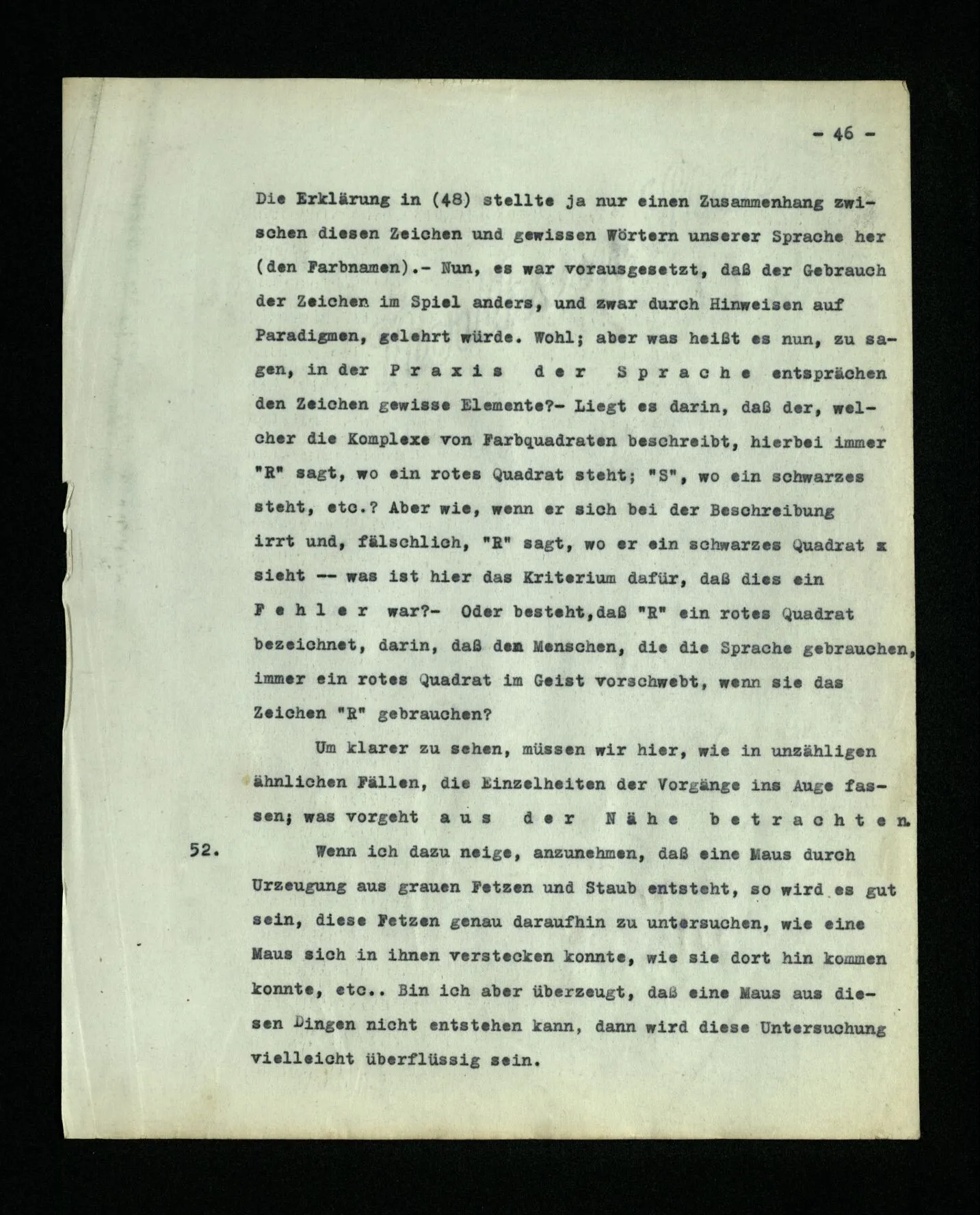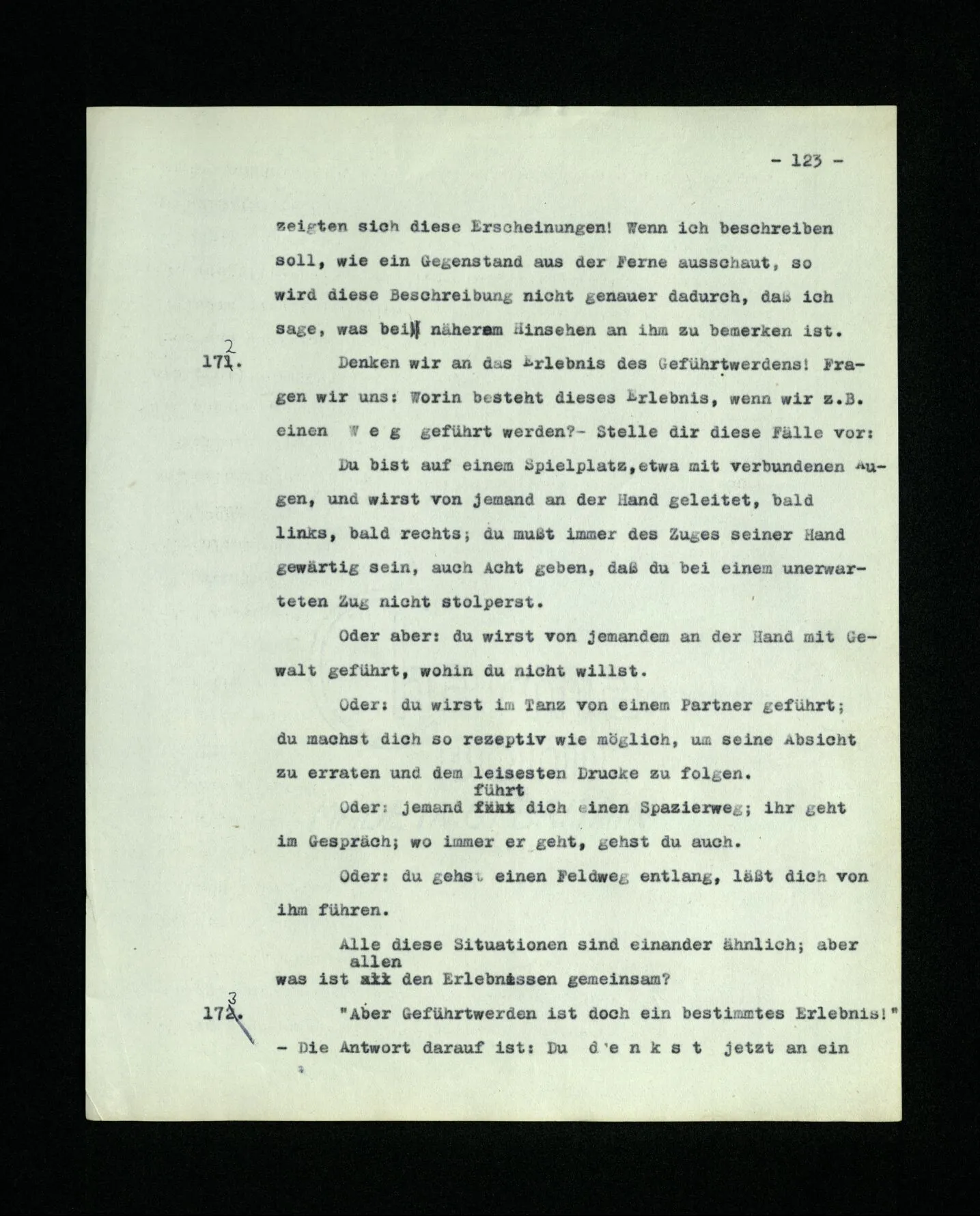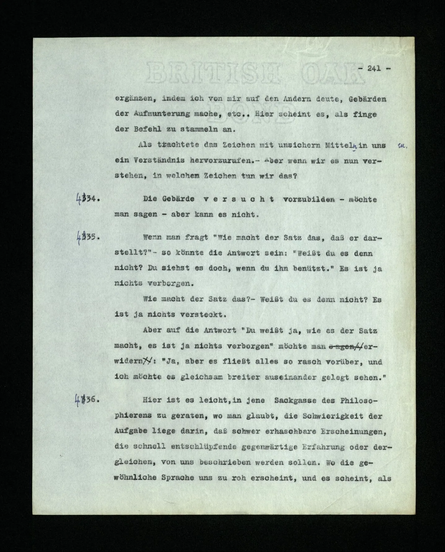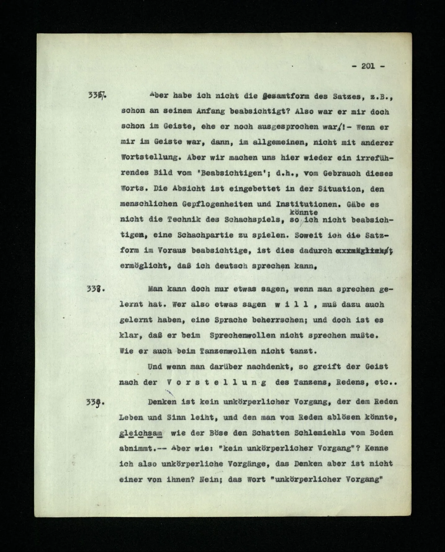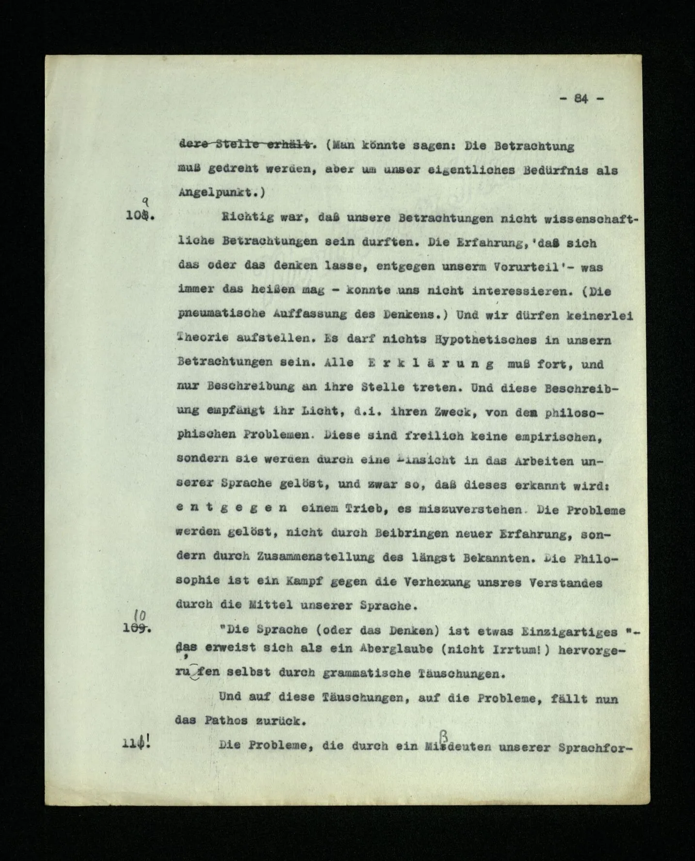 652. “Er maß ihn mit feindseligem Blick und sagte …” Der Leser der Erzählung versteht dies; er hat keinen Zweifel in seiner Seele. Nun sagst du: “Wohl, er denkt sich die Bedeutung hinzu, er errät sie.” – Im allgemeinen: Nein. Im allgemeinen denkt er sich nichts hinzu, errät nichts. – Es ist aber auch möglich, daß der feindselige Blick und die Worte sich später als Verstellung erweisen, oder daß der Leser im Zweifel darüber erhalten wird, ob sie es sind oder nicht, und daß er also wirklich auf eine mögliche Deutung rät. – Aber dann rät er vor allem auf einen Zusammenhang. Er sagt sich etwa: die Beiden, die hier so feindlich tun, sind in Wirklichkeit Freunde, etc. etc. ((“Wenn du den Satz verstehen willst, mußt du dir die seelische Bedeutung, die Seelenzustände, dazu vorstellen.”))