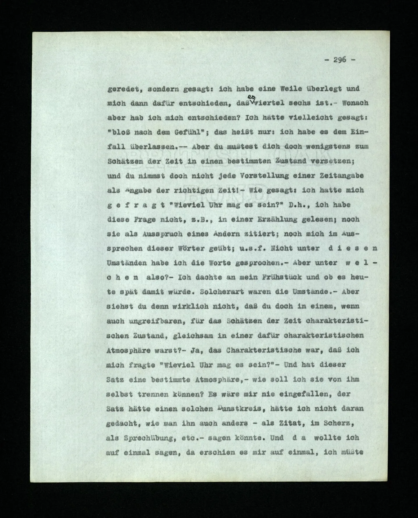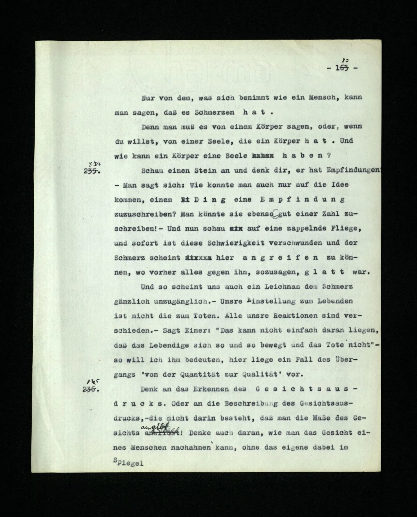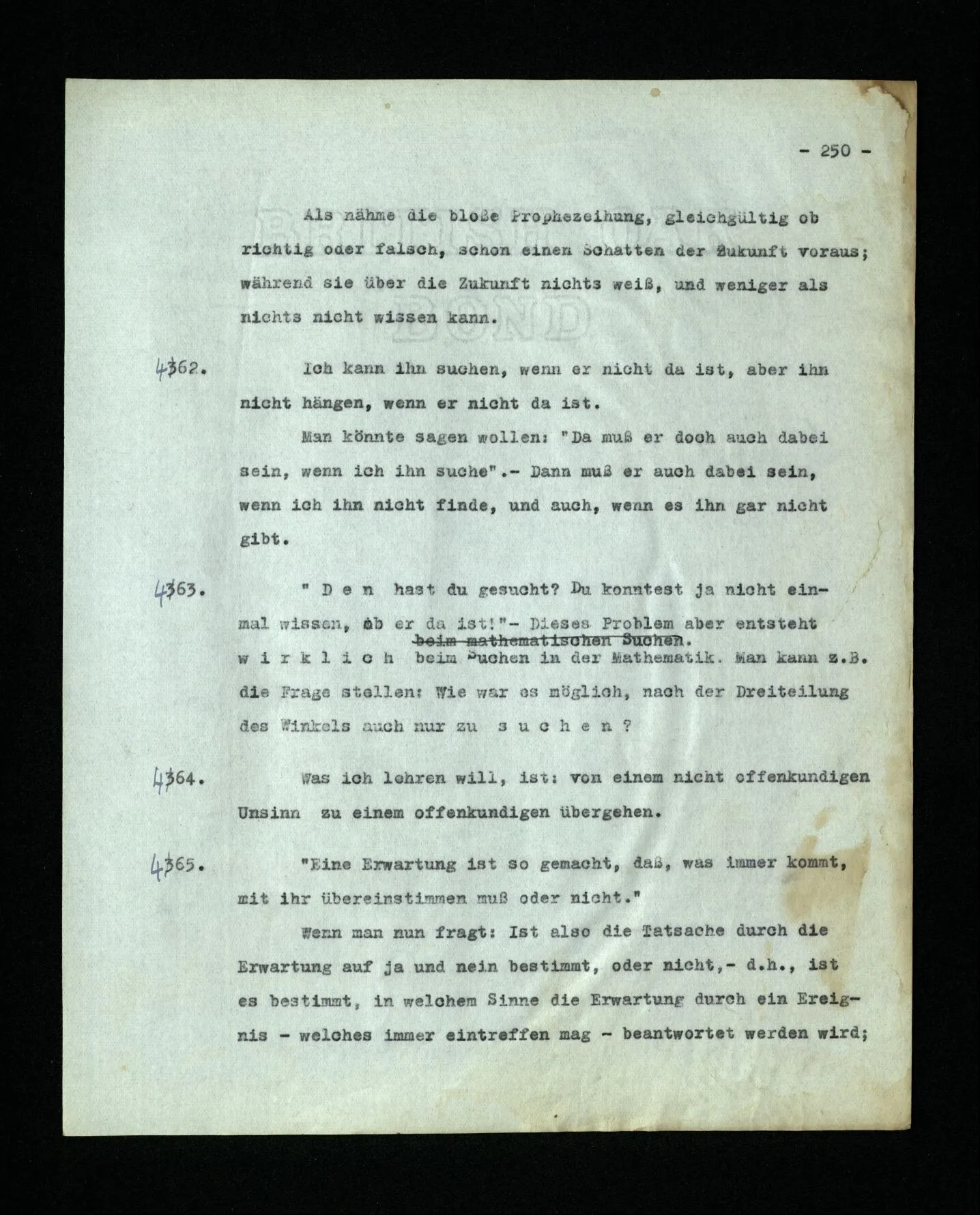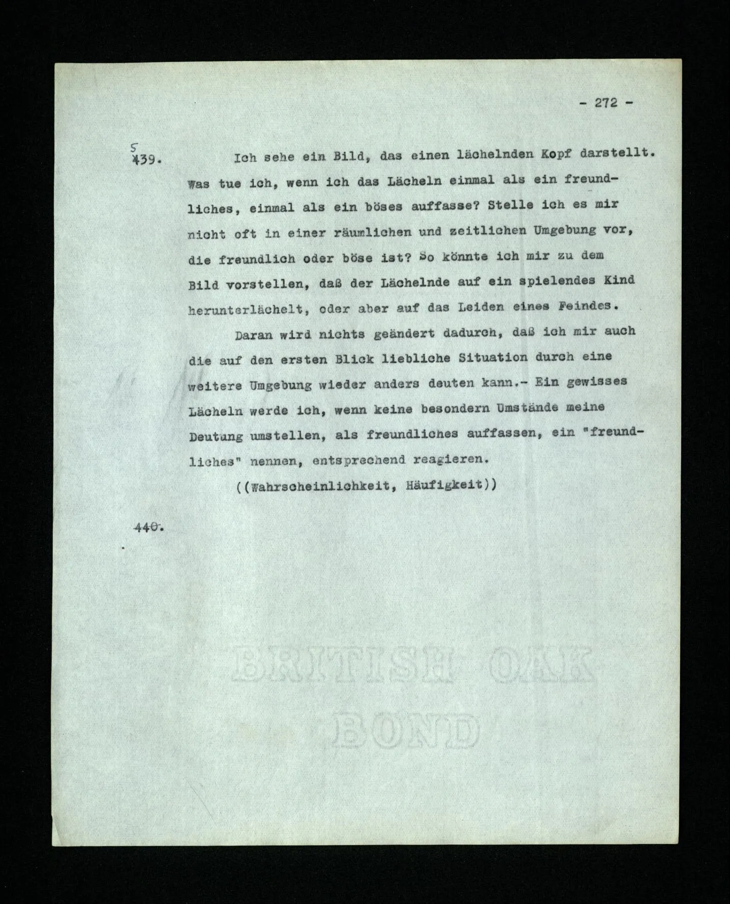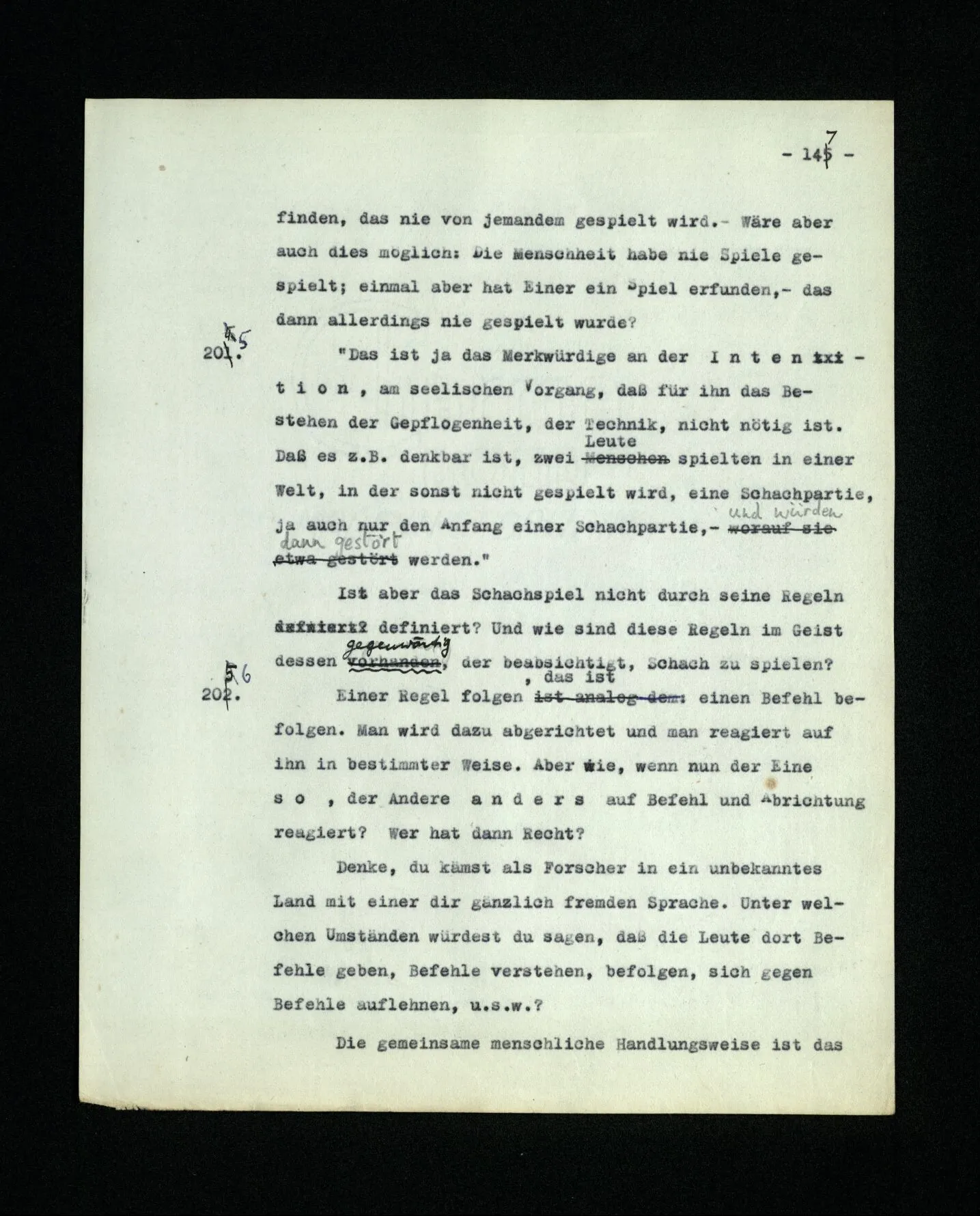 652. “Er maß ihn mit feindseligem Blick und sagte …” Der Leser der Erzählung versteht dies; er hat keinen Zweifel in seiner Seele. Nun sagst du: “Wohl, er denkt sich die Bedeutung hinzu, er errät sie.” – Im allgemeinen: Nein. Im allgemeinen denkt er sich nichts hinzu, errät nichts. – Es ist aber auch möglich, daß der feindselige Blick und die Worte sich später als Verstellung erweisen, oder daß der Leser im Zweifel darüber erhalten wird, ob sie es sind oder nicht, und daß er also wirklich auf eine mögliche Deutung rät. – Aber dann rät er vor allem auf einen Zusammenhang. Er sagt sich etwa: die Beiden, die hier so feindlich tun, sind in Wirklichkeit Freunde, etc. etc. ((“Wenn du den Satz verstehen willst, mußt du dir die seelische Bedeutung, die Seelenzustände, dazu vorstellen.”))