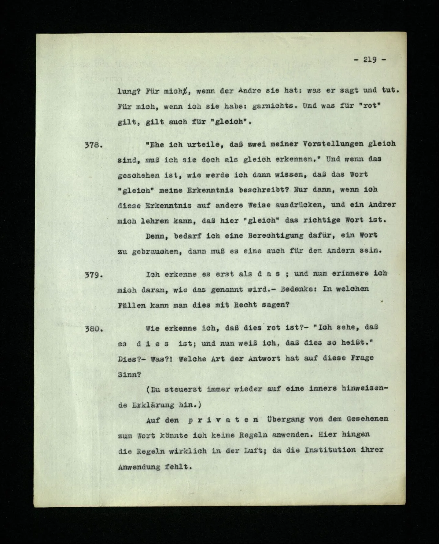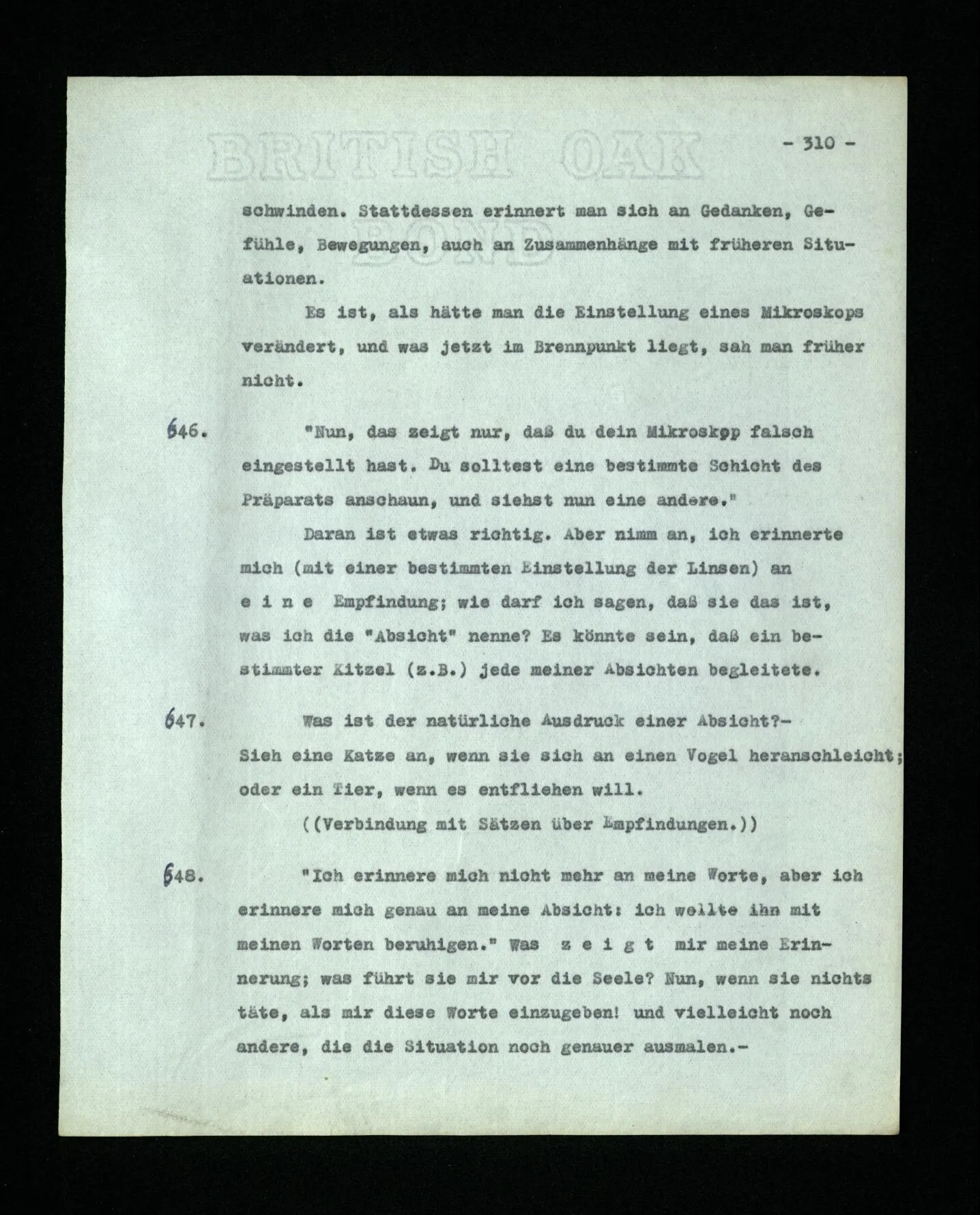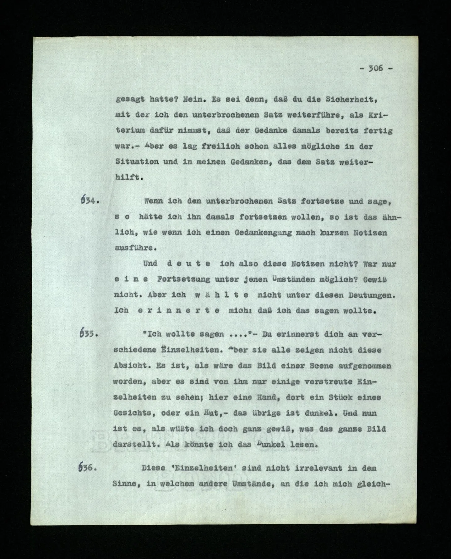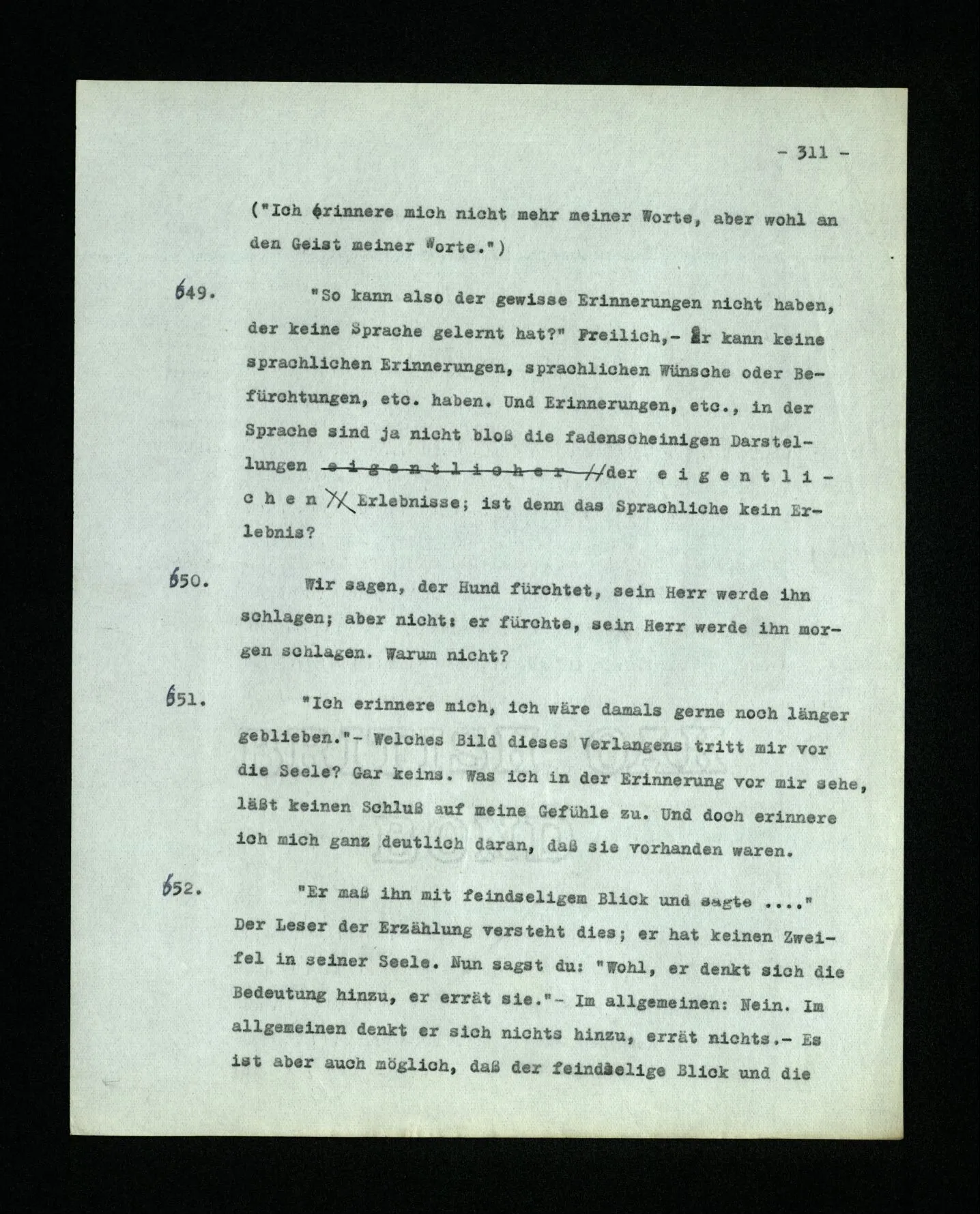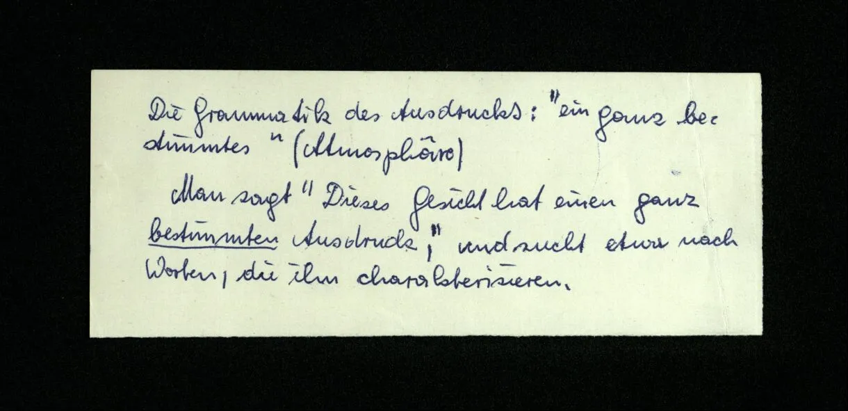 651. “Ich erinnere mich, ich wäre damals gerne noch länger geblieben.” – Welches Bild dieses Verlangens tritt mir vor die Seele? Gar keins. Was ich in der Erinnerung vor mir sehe, läßt keinen Schluß auf meine Gefühle zu. Und doch erinnere ich mich ganz deutlich daran, daß sie vorhanden waren.
