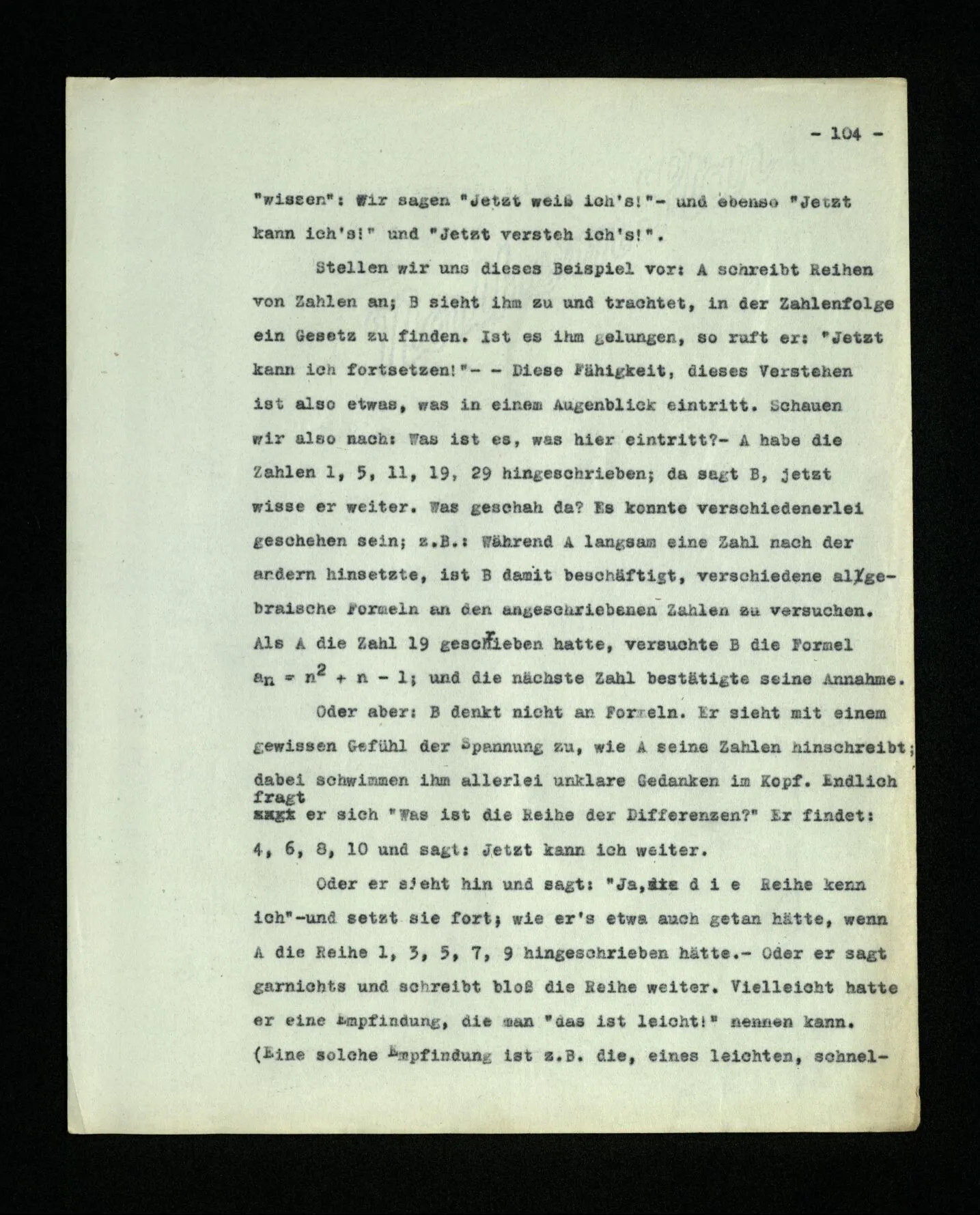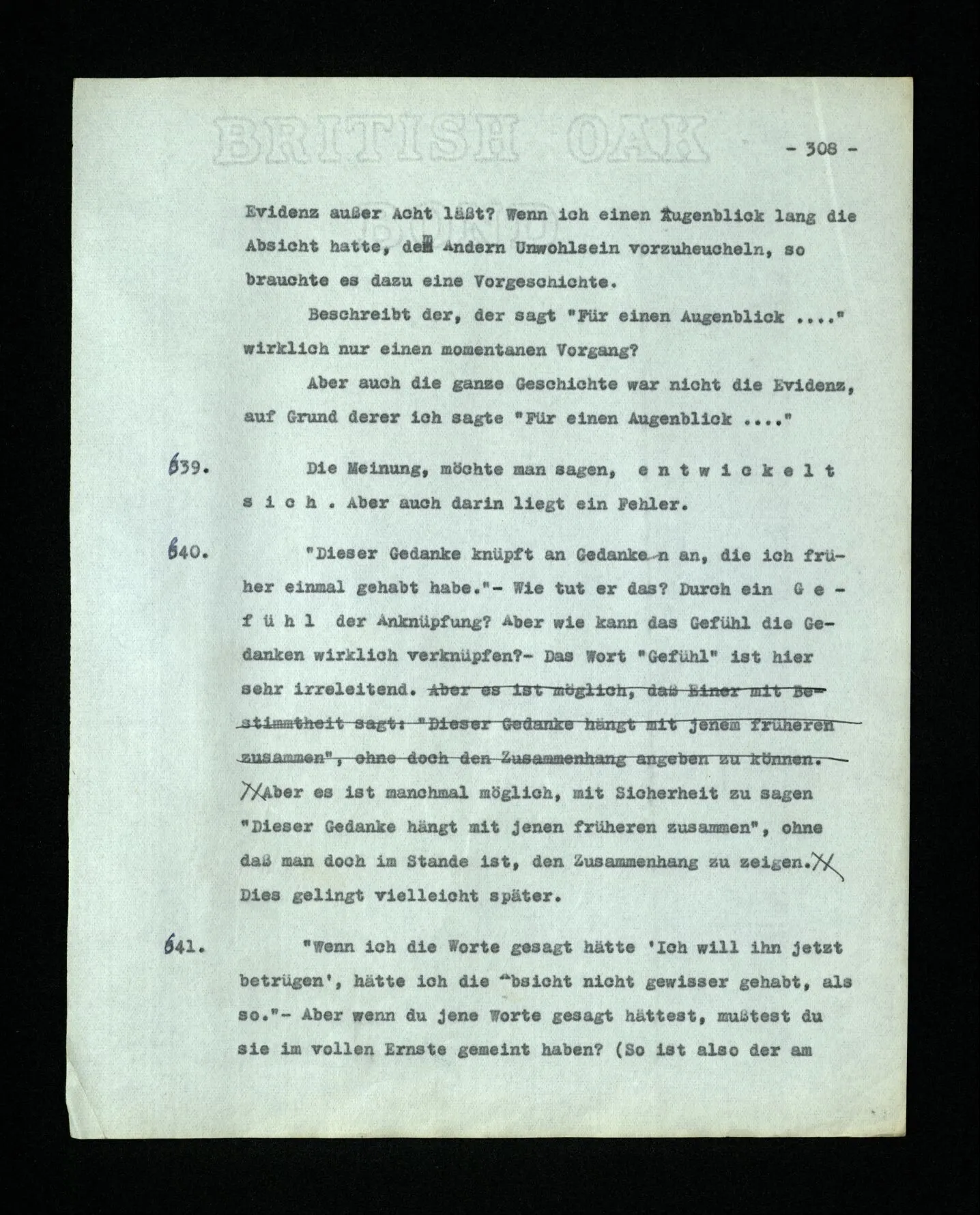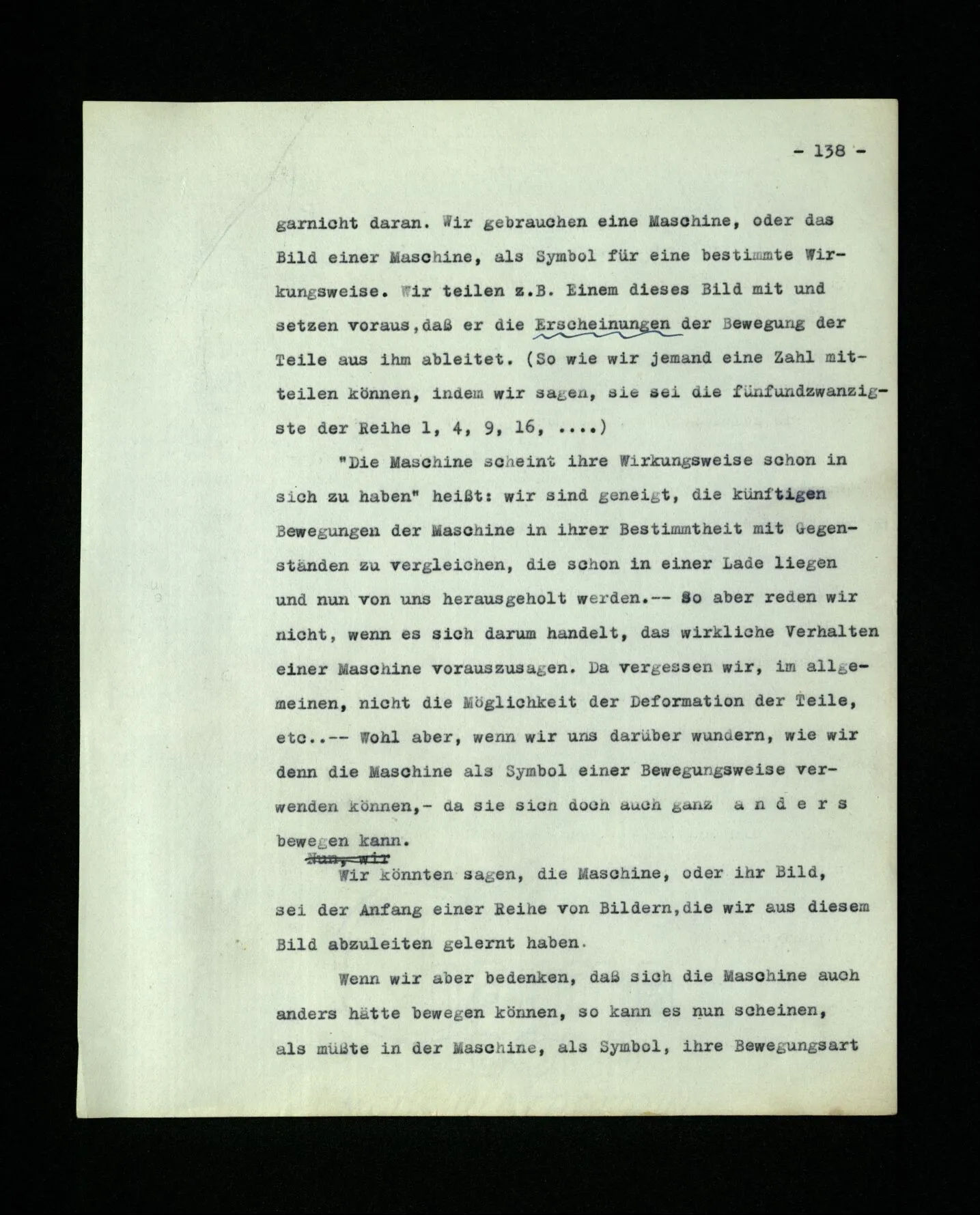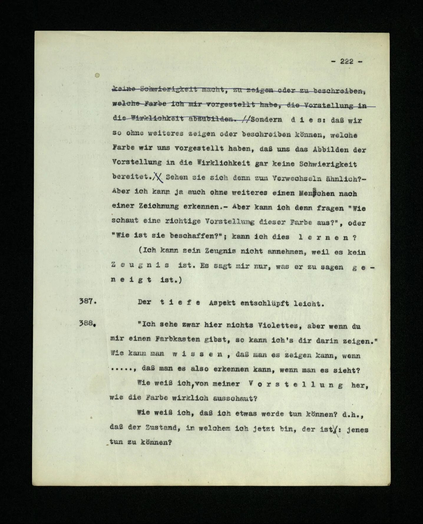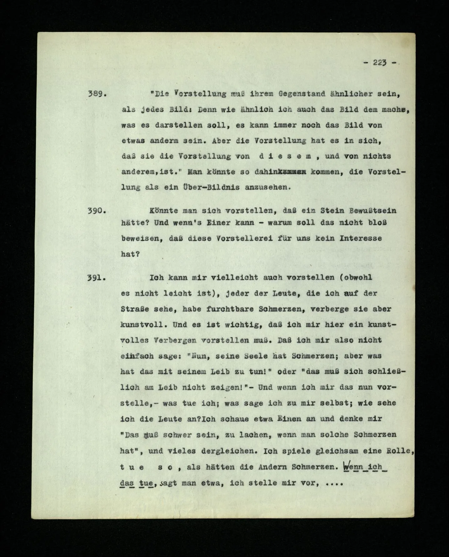 651. “Ich erinnere mich, ich wäre damals gerne noch länger geblieben.” – Welches Bild dieses Verlangens tritt mir vor die Seele? Gar keins. Was ich in der Erinnerung vor mir sehe, läßt keinen Schluß auf meine Gefühle zu. Und doch erinnere ich mich ganz deutlich daran, daß sie vorhanden waren.
