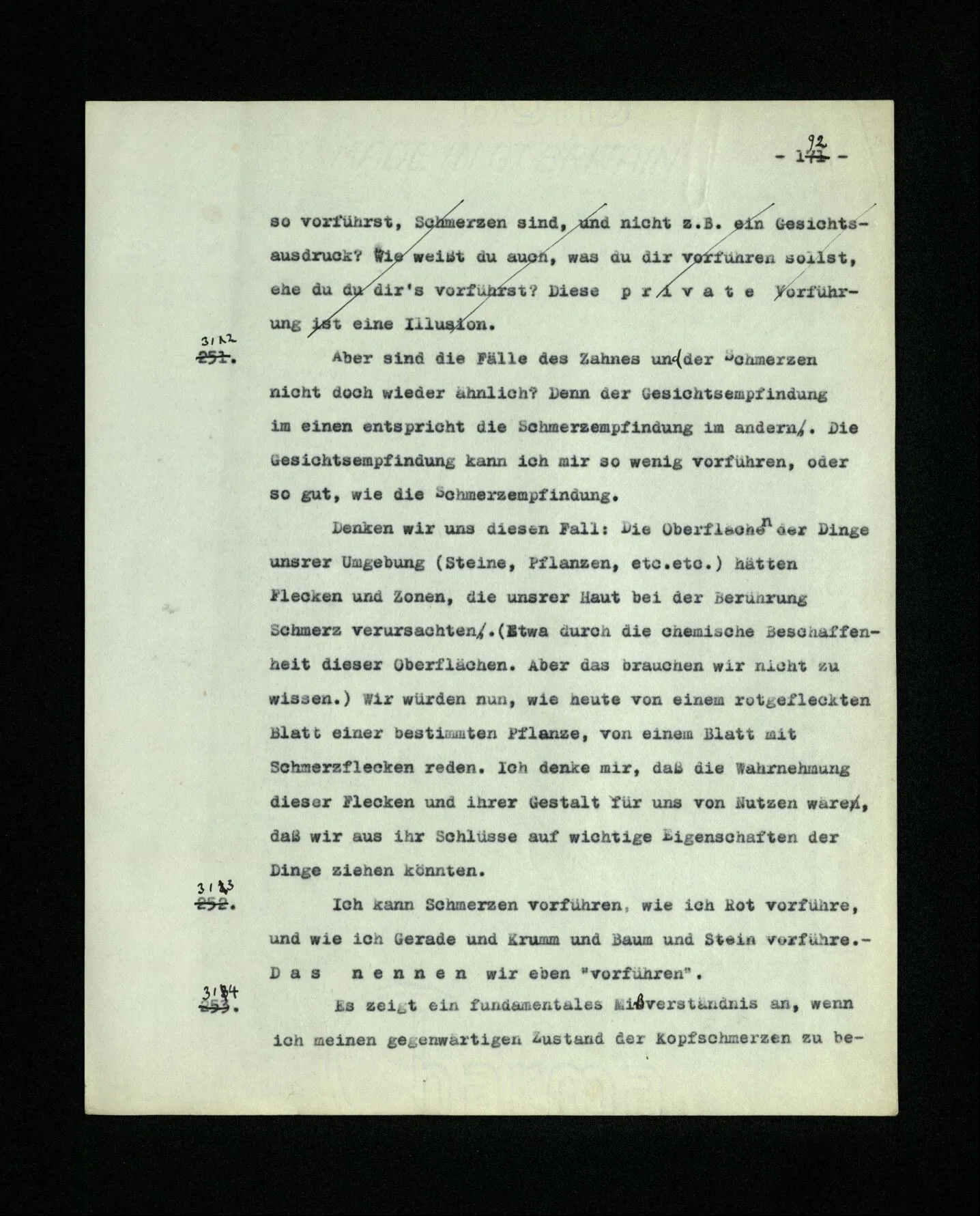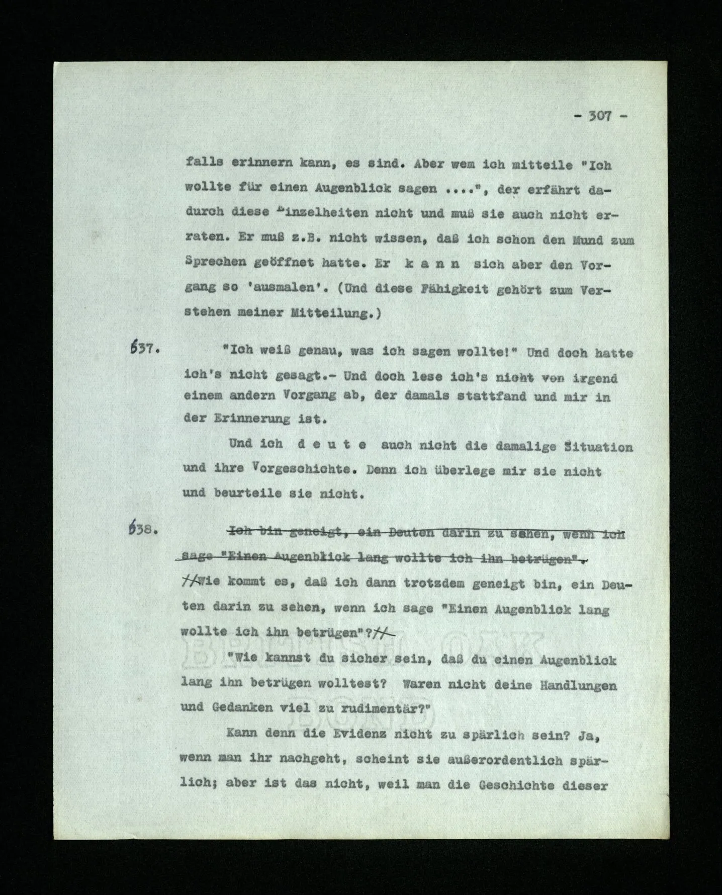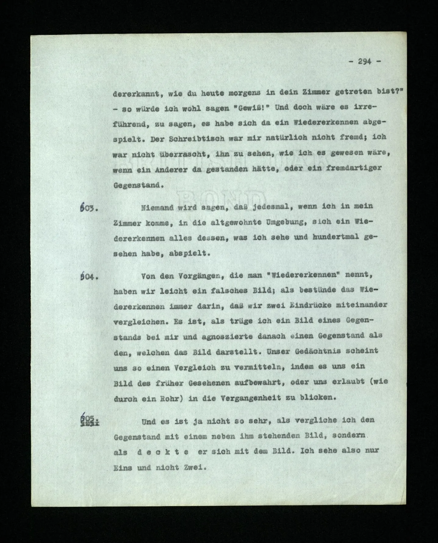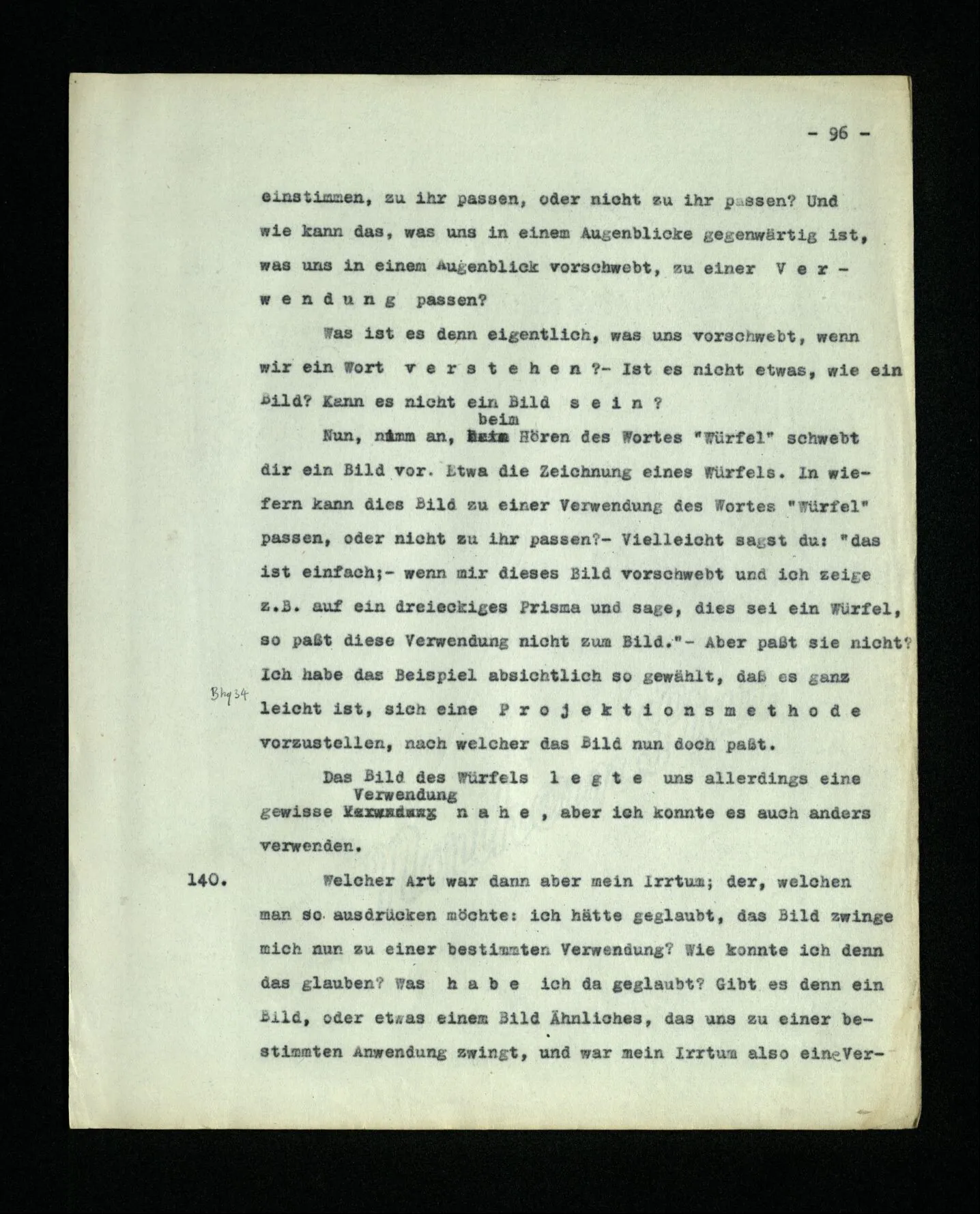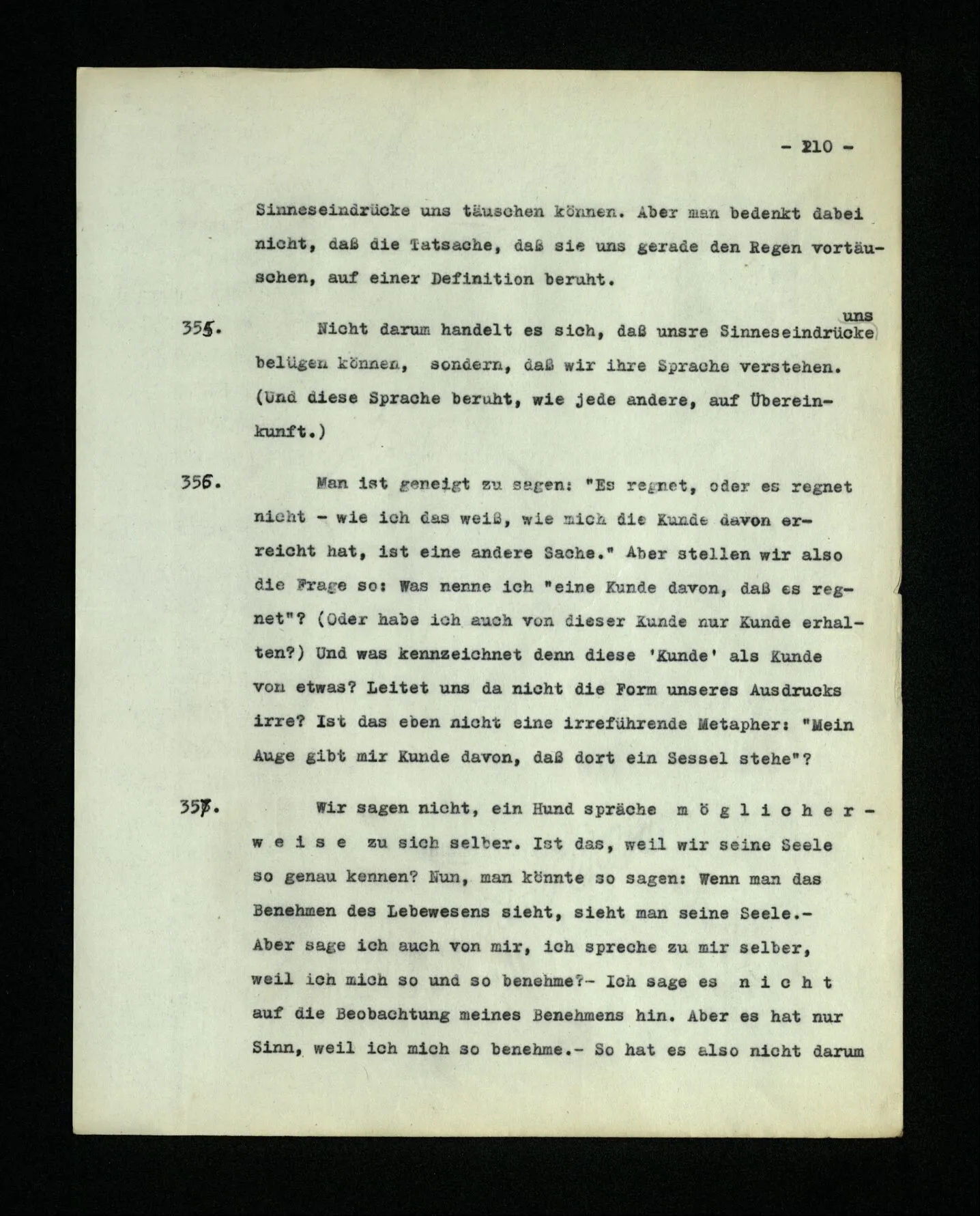 651. “Ich erinnere mich, ich wäre damals gerne noch länger geblieben.” – Welches Bild dieses Verlangens tritt mir vor die Seele? Gar keins. Was ich in der Erinnerung vor mir sehe, läßt keinen Schluß auf meine Gefühle zu. Und doch erinnere ich mich ganz deutlich daran, daß sie vorhanden waren.