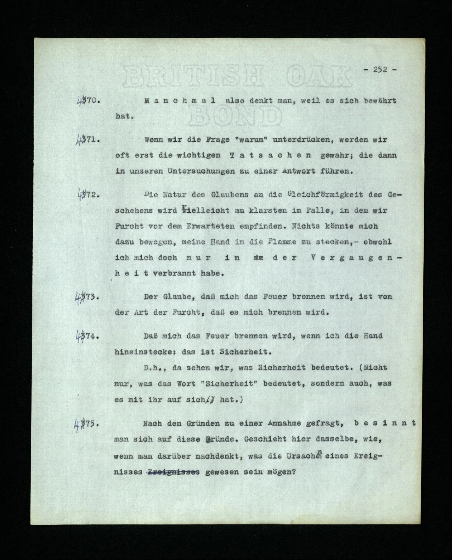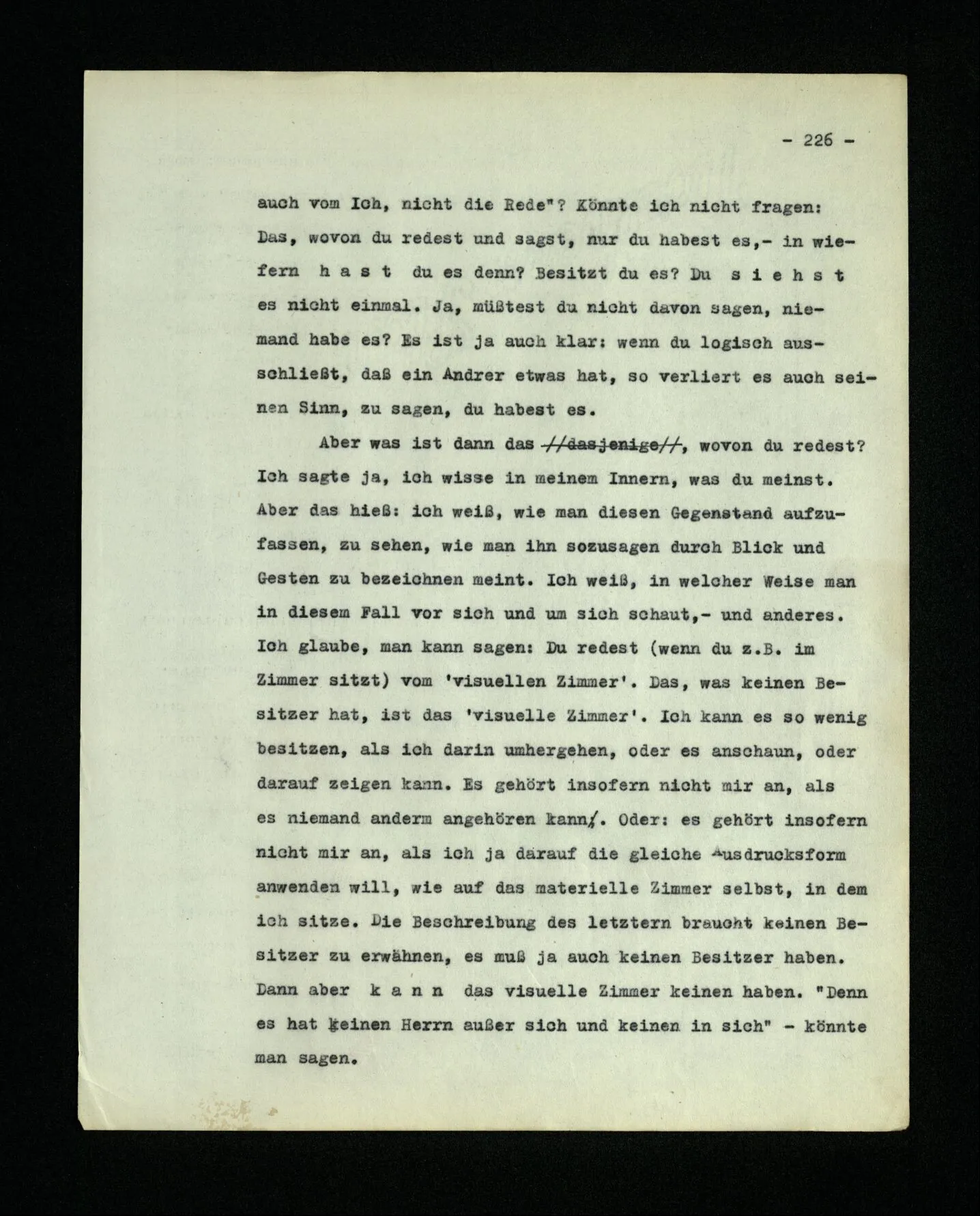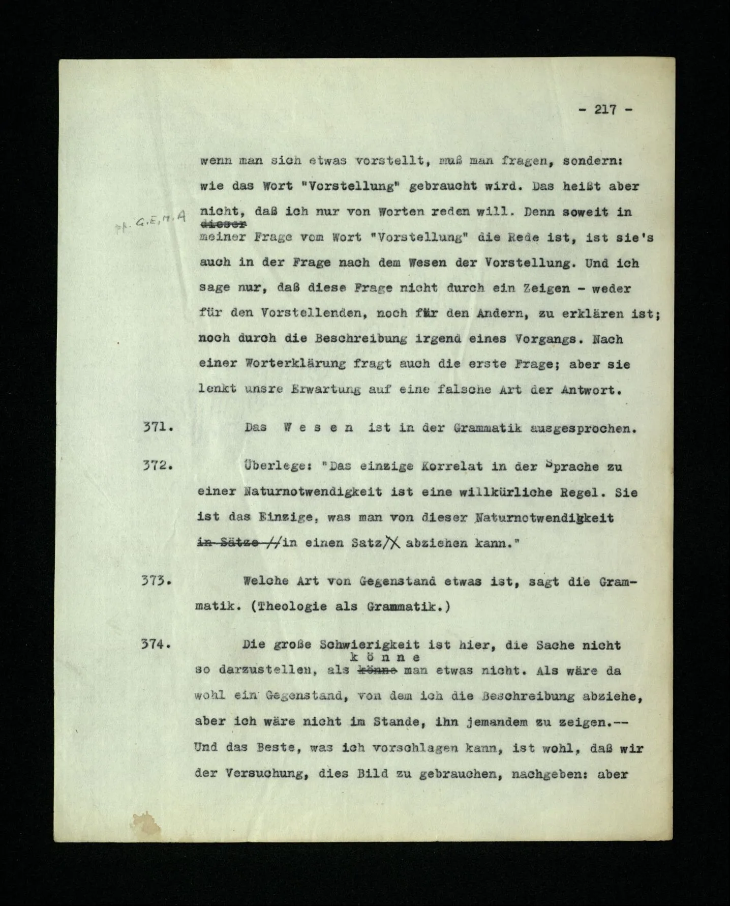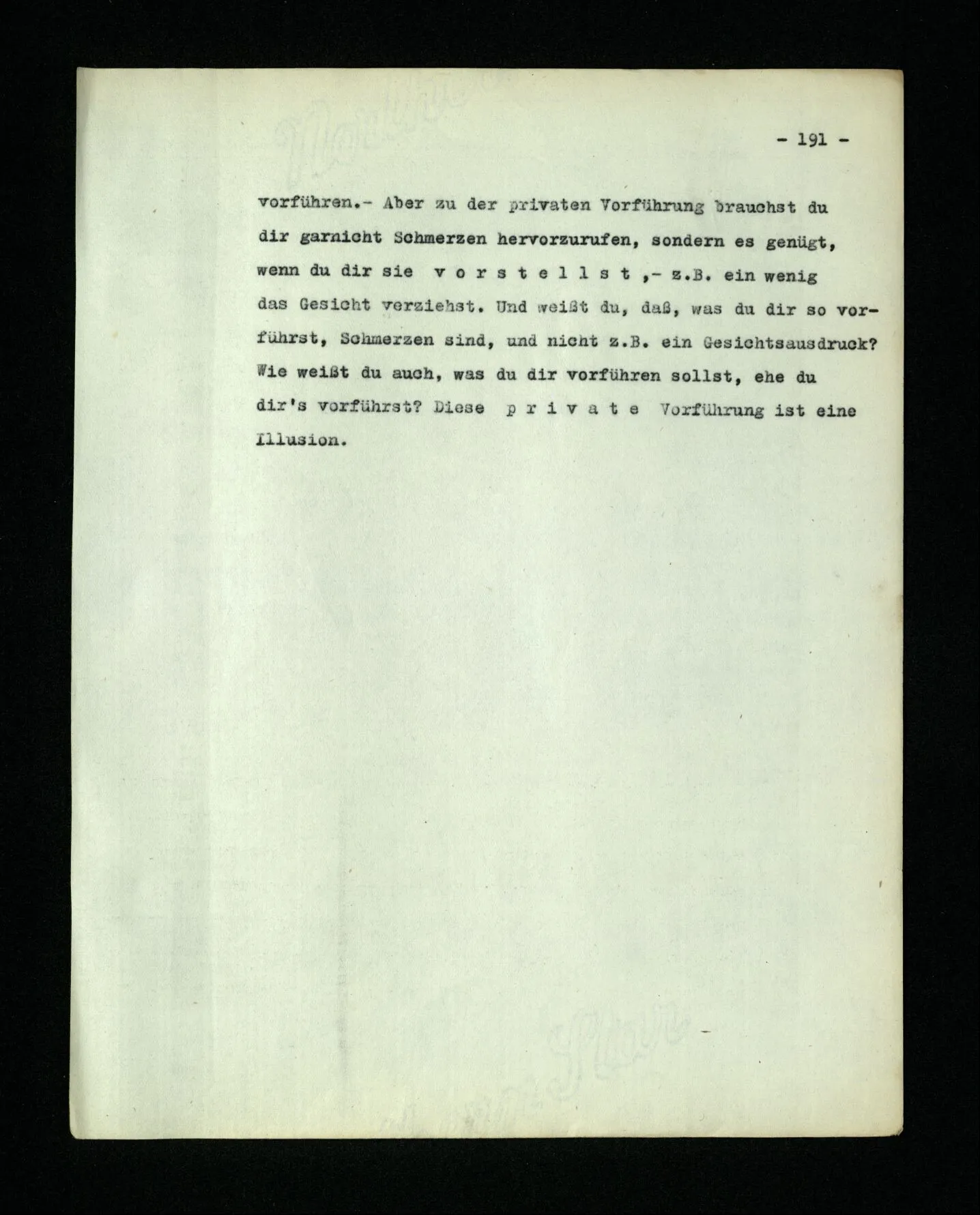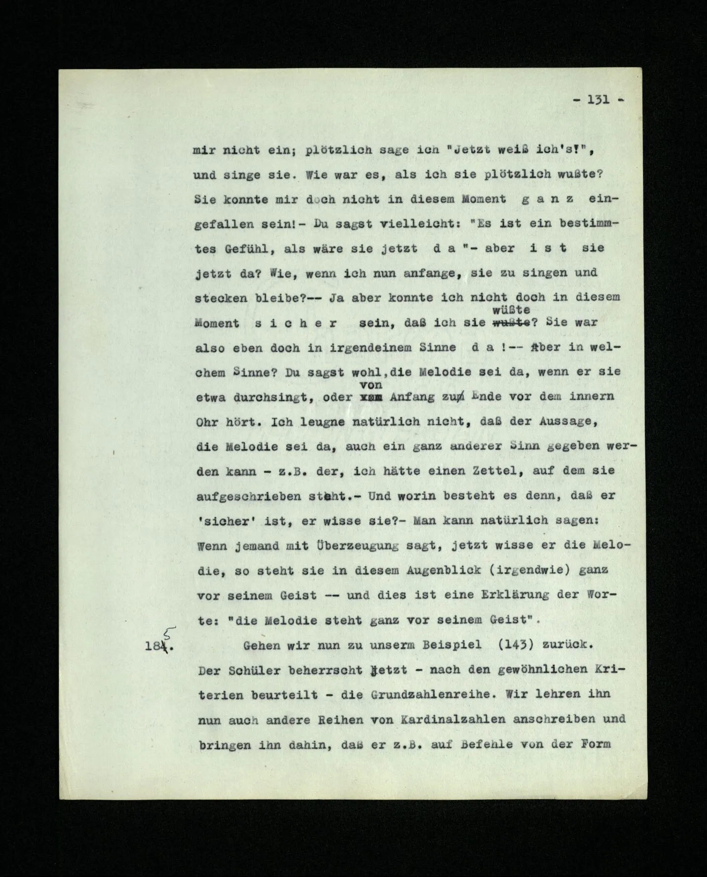 651. “Ich erinnere mich, ich wäre damals gerne noch länger geblieben.” – Welches Bild dieses Verlangens tritt mir vor die Seele? Gar keins. Was ich in der Erinnerung vor mir sehe, läßt keinen Schluß auf meine Gefühle zu. Und doch erinnere ich mich ganz deutlich daran, daß sie vorhanden waren.