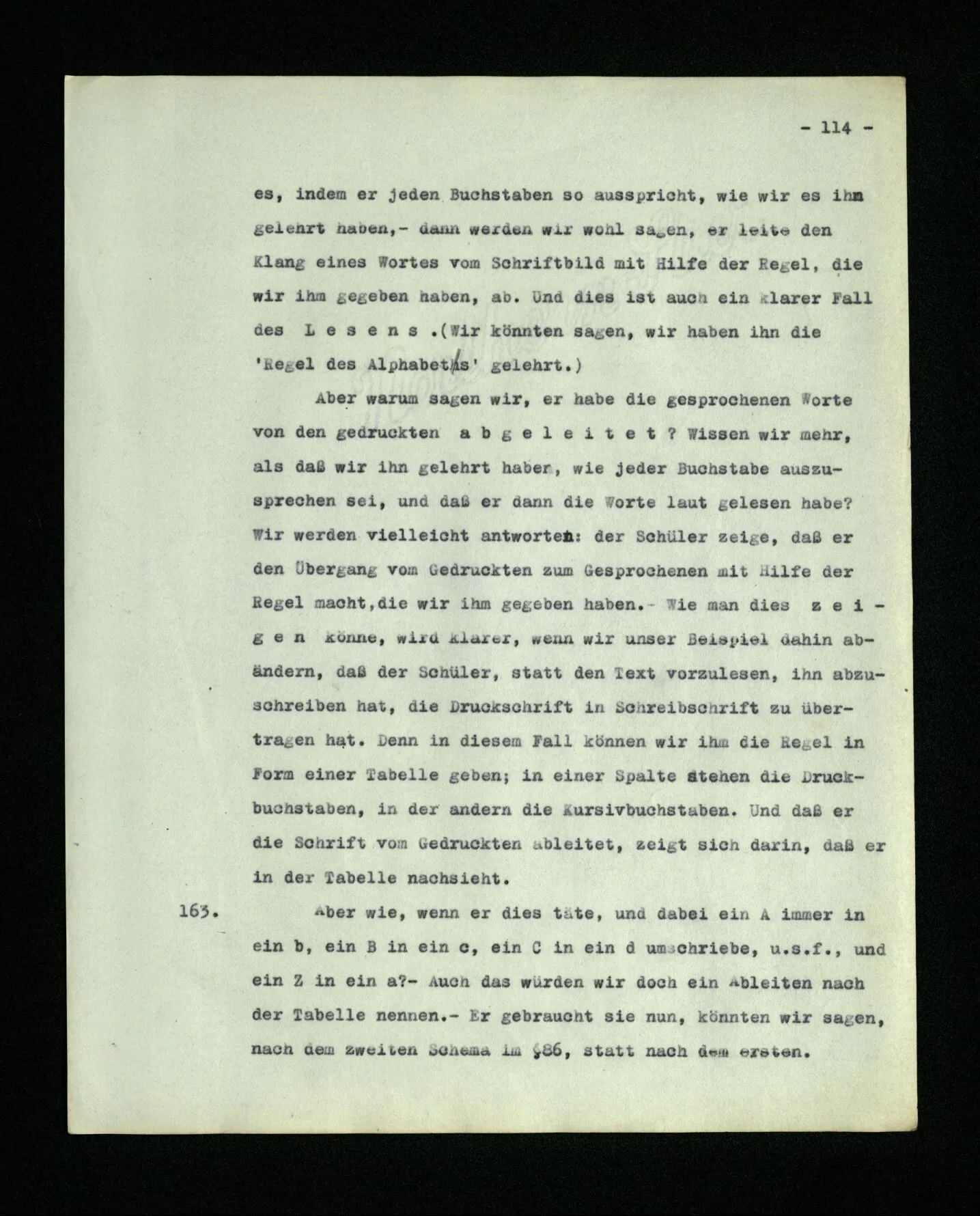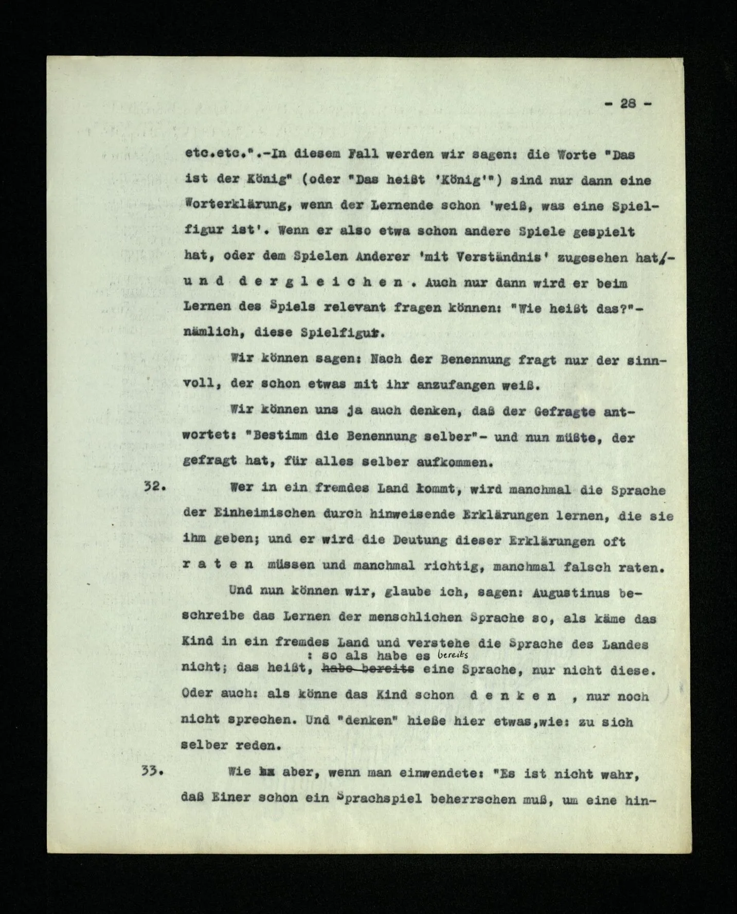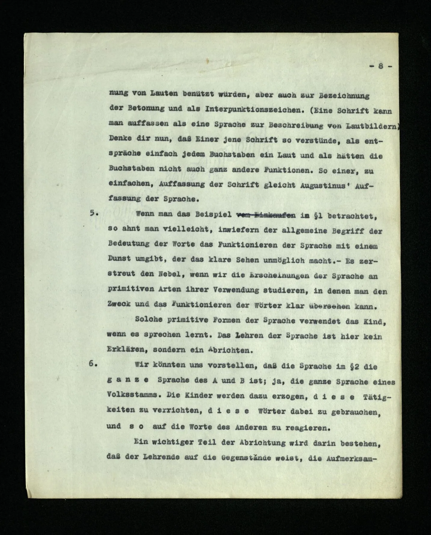 4. Denke Dir eine Schrift, in welcher Buchstaben zur Bezeichnung von Lauten benützt würden, aber auch zur Bezeichnung der Betonung und als Interpunktionszeichen. (Eine Schrift kann man auffassen als eine Sprache zur Beschreibung von Lautbildern.) Denke dir nun, daß Einer jene Schrift so verstünde, als entspräche einfach jedem Buchstaben ein Laut und als hätten die Buchstaben nicht auch ganz andere Funktionen. So einer, zu einfachen, Auffassung der Schrift gleicht Augustinus’ Auffassung der Sprache.