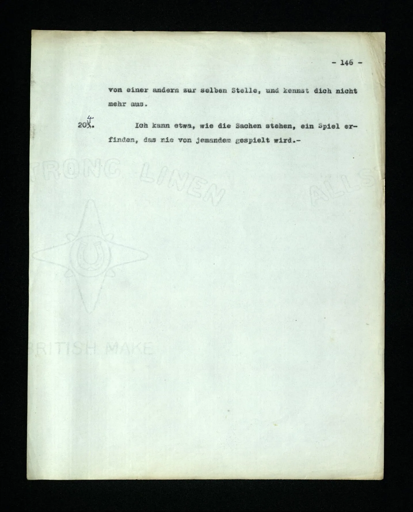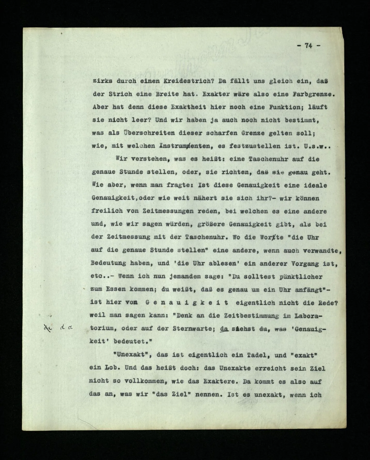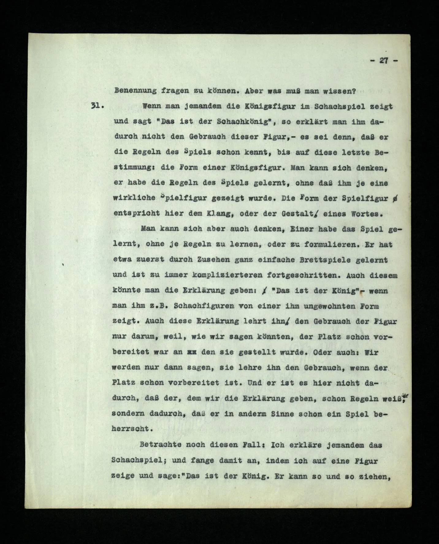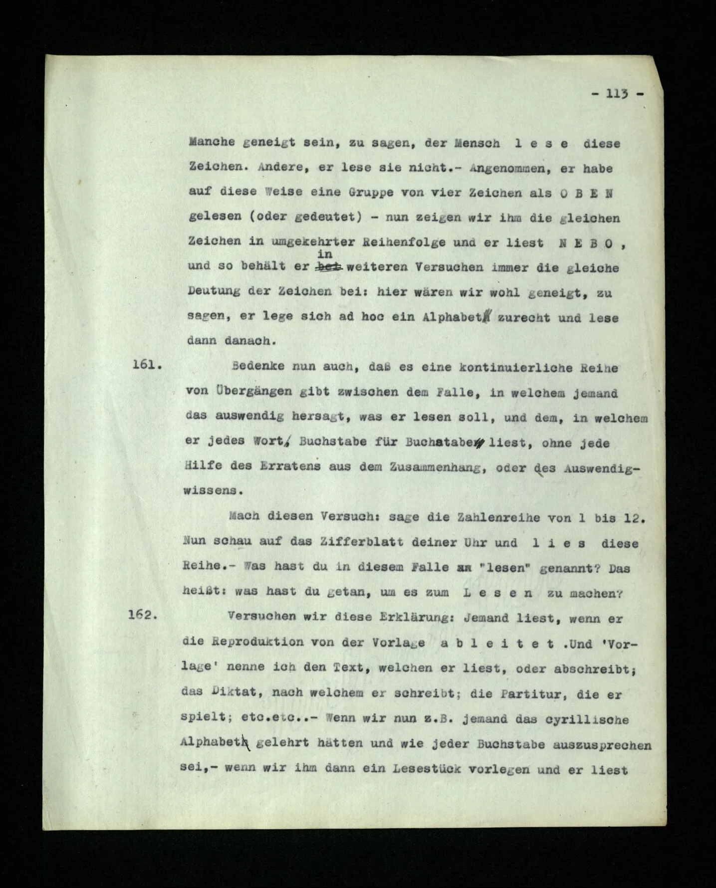 4. Denke Dir eine Schrift, in welcher Buchstaben zur Bezeichnung von Lauten benützt würden, aber auch zur Bezeichnung der Betonung und als Interpunktionszeichen. (Eine Schrift kann man auffassen als eine Sprache zur Beschreibung von Lautbildern.) Denke dir nun, daß Einer jene Schrift so verstünde, als entspräche einfach jedem Buchstaben ein Laut und als hätten die Buchstaben nicht auch ganz andere Funktionen. So einer, zu einfachen, Auffassung der Schrift gleicht Augustinus’ Auffassung der Sprache.