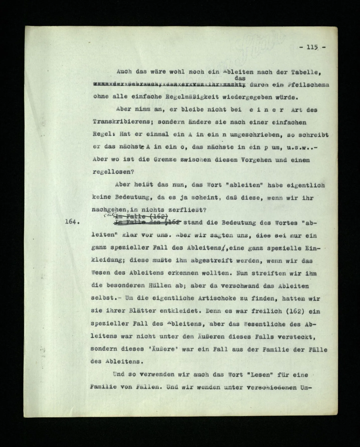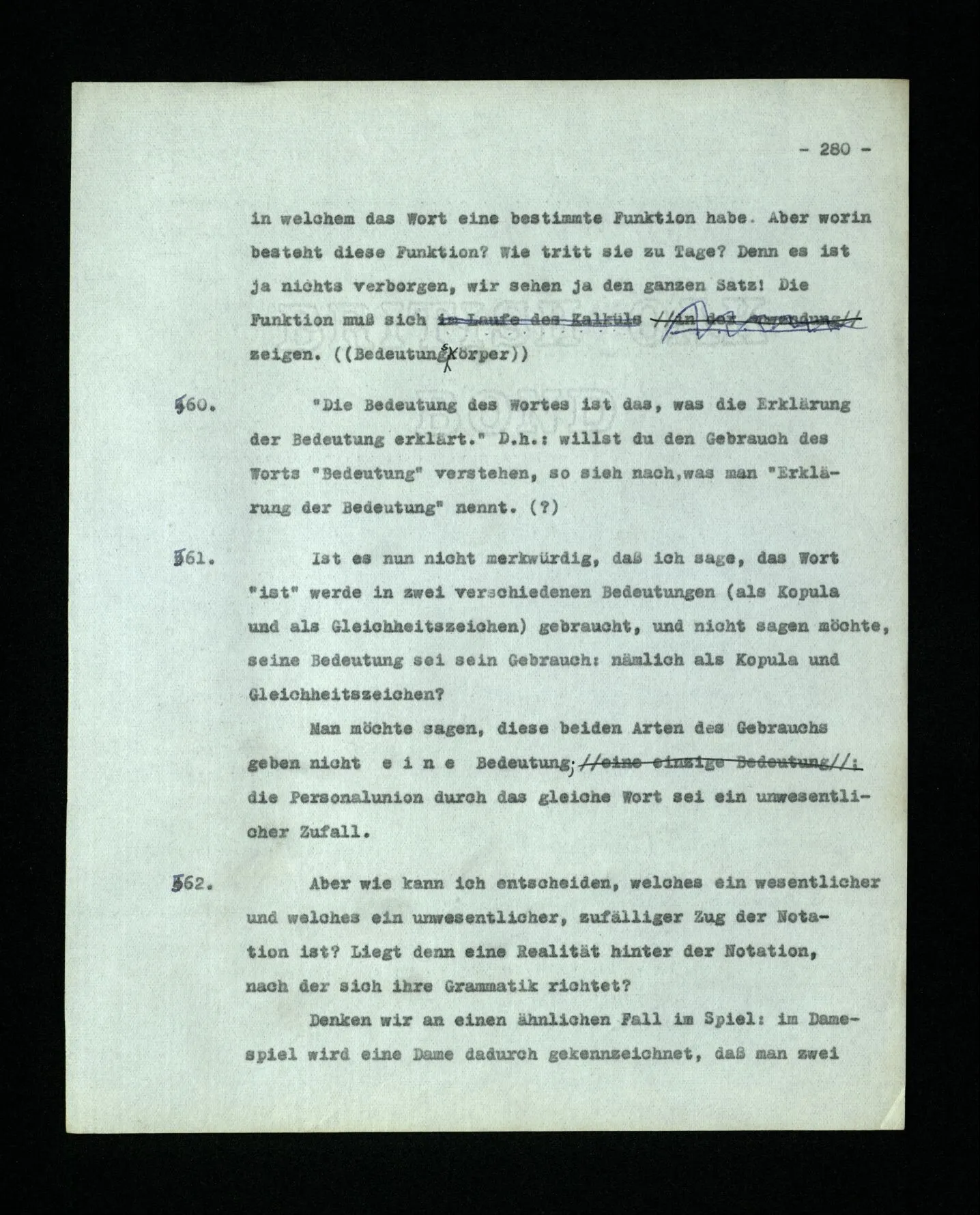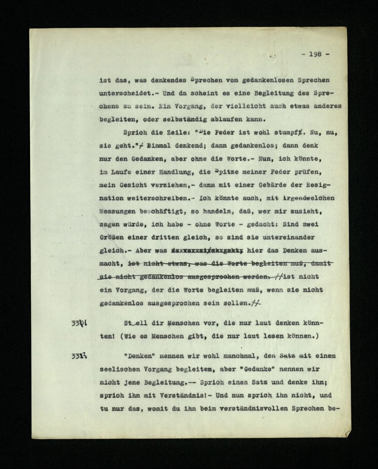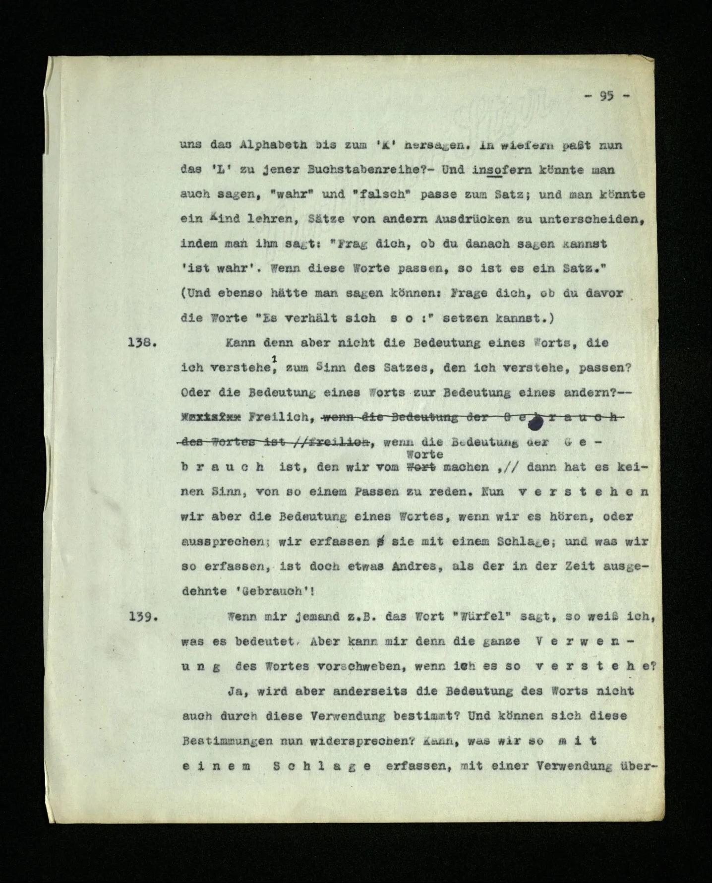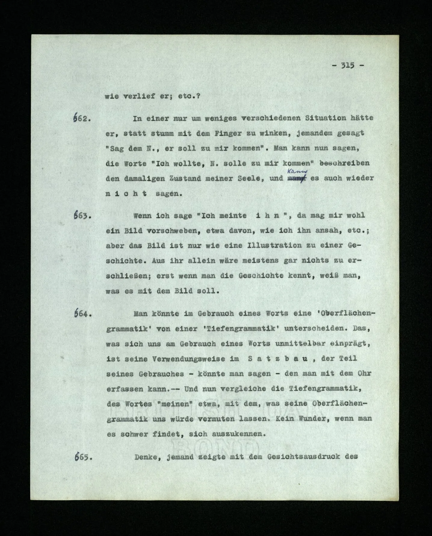 664. Man könnte im Gebrauch eines Worts eine ‘Oberflächengrammatik’ von einer ‘Tiefengrammatik’ unterscheiden. Das, was sich uns am Gebrauch eines Worts unmittelbar einprägt, ist seine Verwendungsweise im Satzbau, der Teil seines Gebrauches – könnte man sagen – den man mit dem Ohr erfassen kann. ‒ ‒ Und nun vergleiche die Tiefengrammatik, des Wortes “meinen” etwa, mit dem, was seine Oberflächengrammatik uns würde vermuten lassen. Kein Wunder, wenn man es schwer findet, sich auszukennen.
