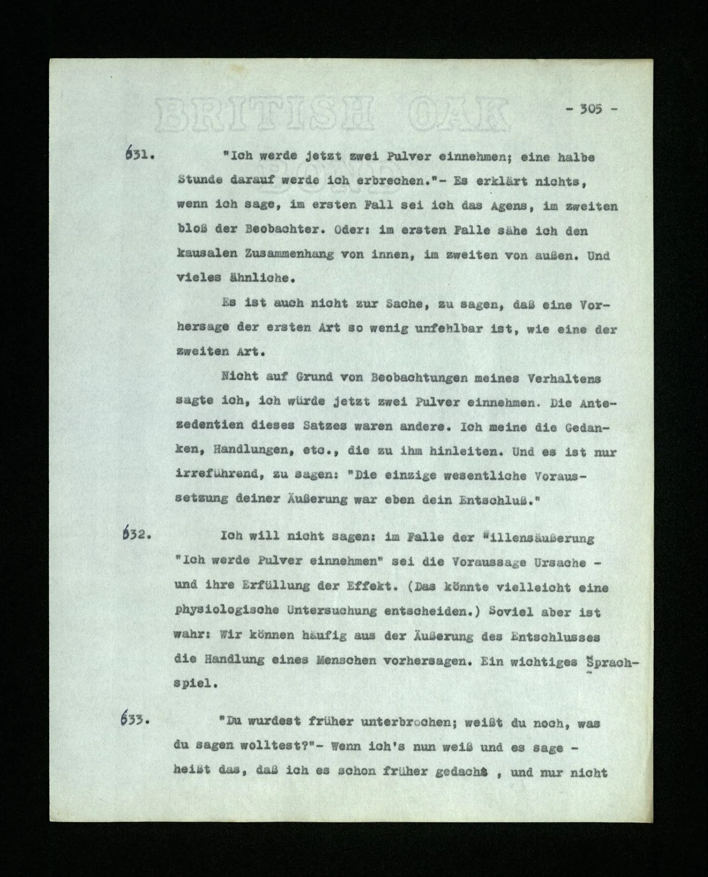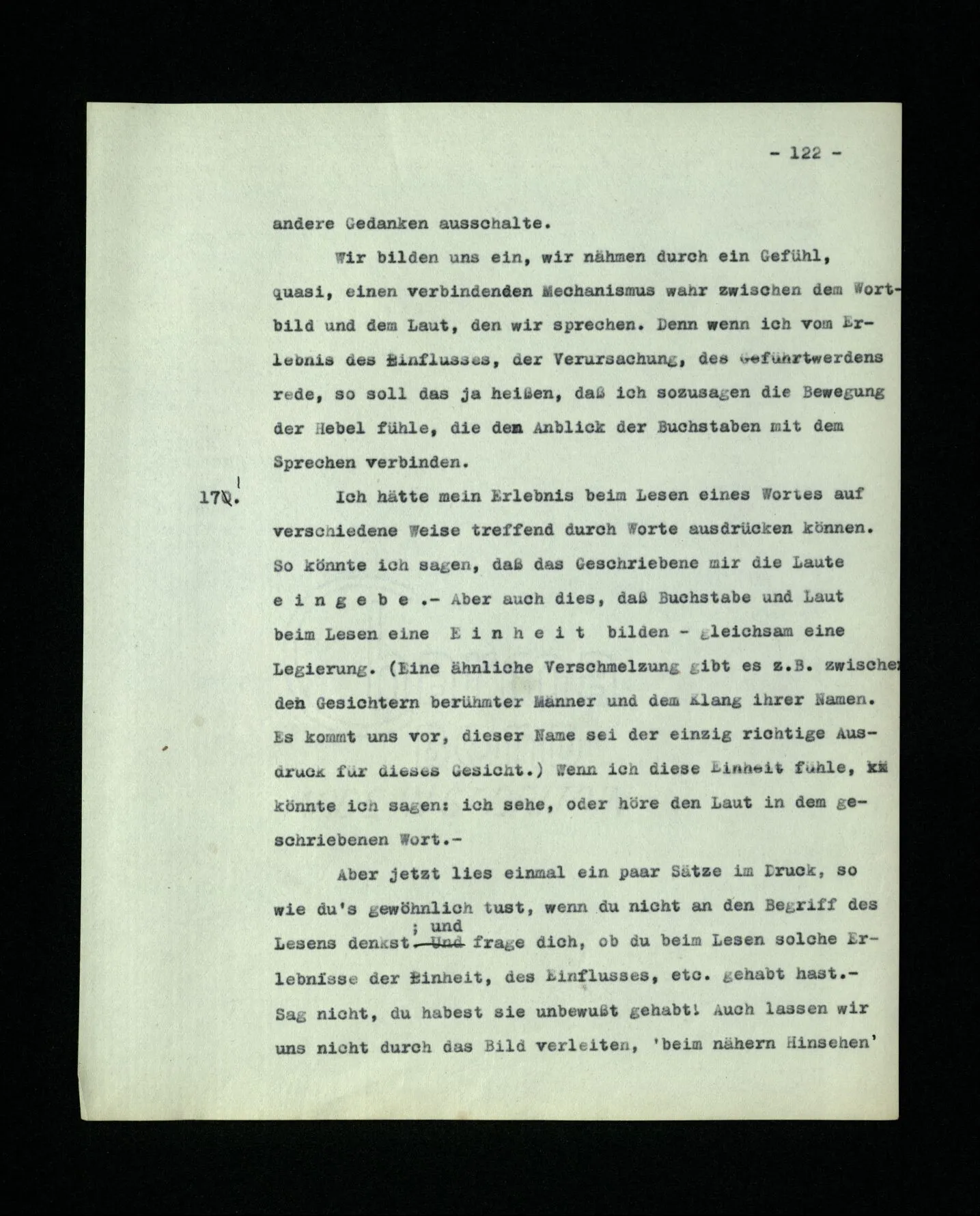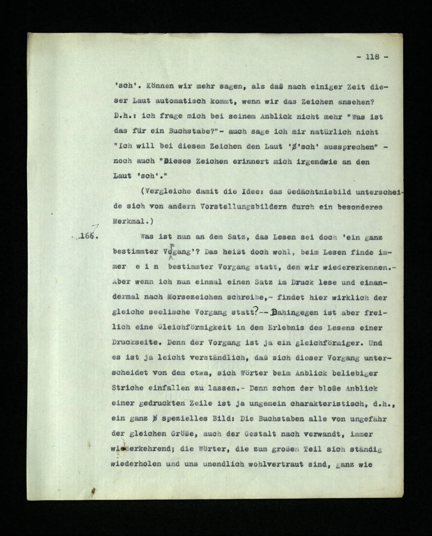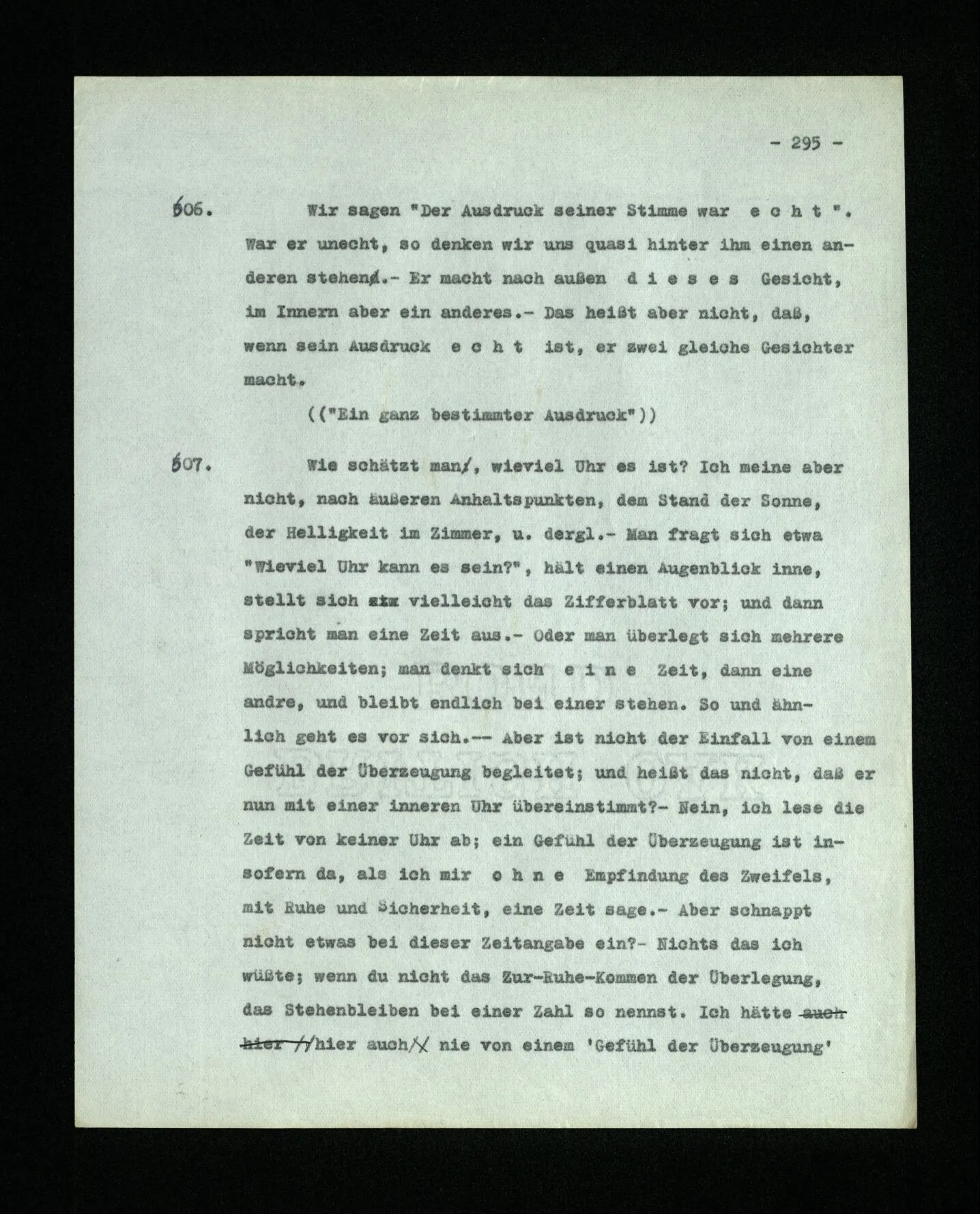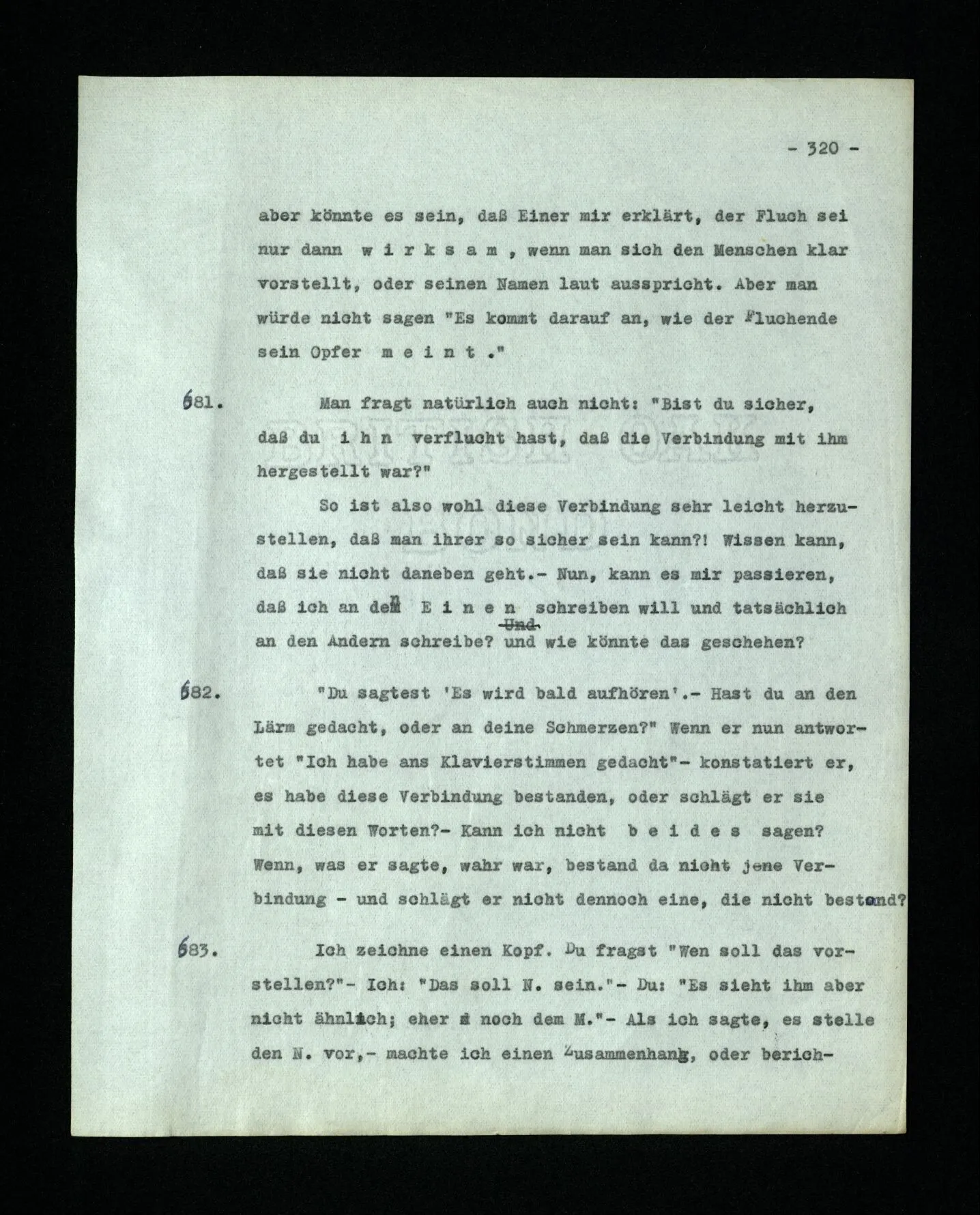 681. Man fragt natürlich auch nicht: “Bist du sicher, daß du ihn verflucht hast, daß die Verbindung mit ihm hergestellt war?” So ist also wohl diese Verbindung sehr leicht herzustellen, daß man ihrer so sicher sein kann?! Wissen kann, daß sie nicht daneben geht. – Nun, kann es mir passieren, daß ich an den Einen schreiben will und tatsächlich an den Andern schreibe? und wie könnte das geschehen?