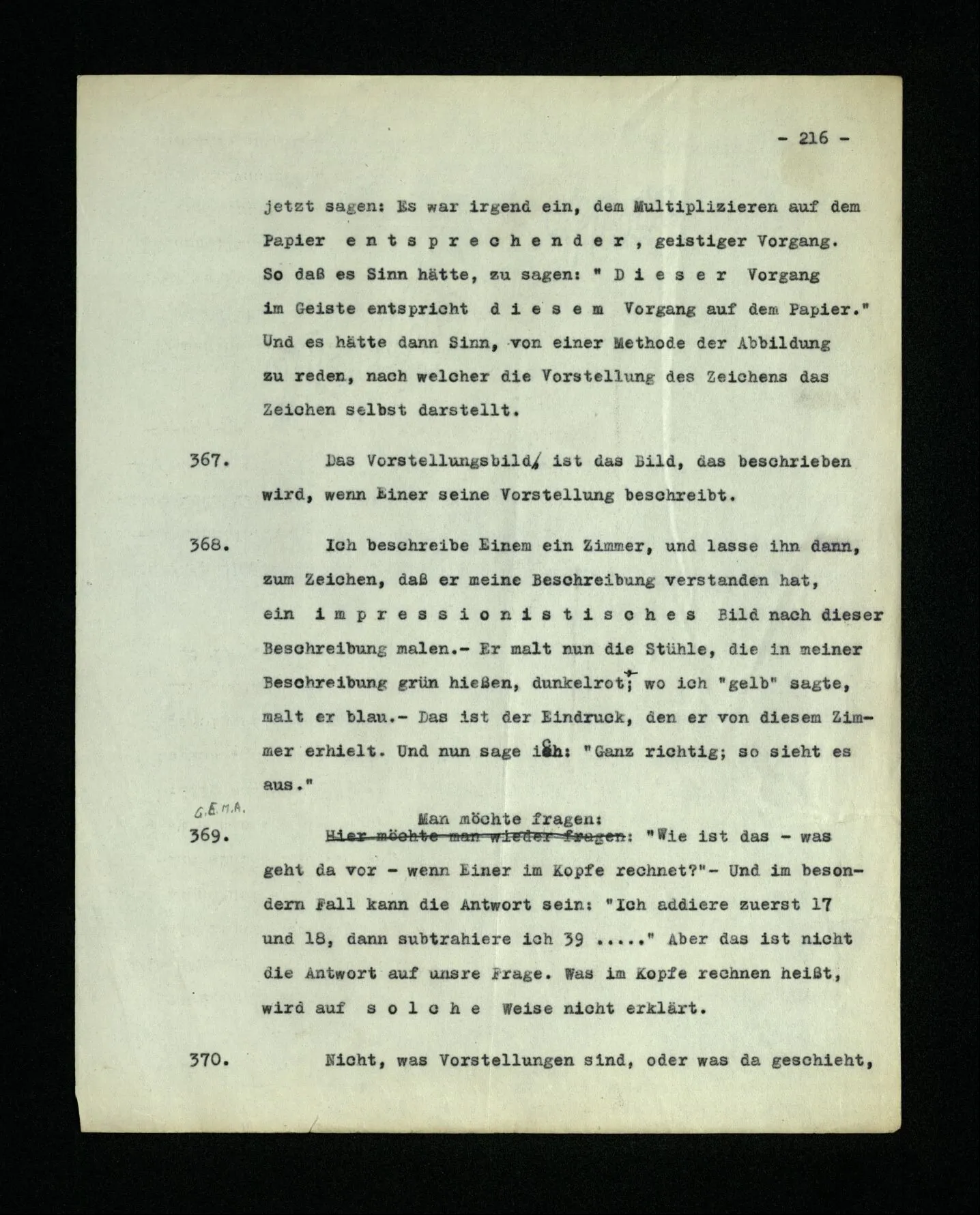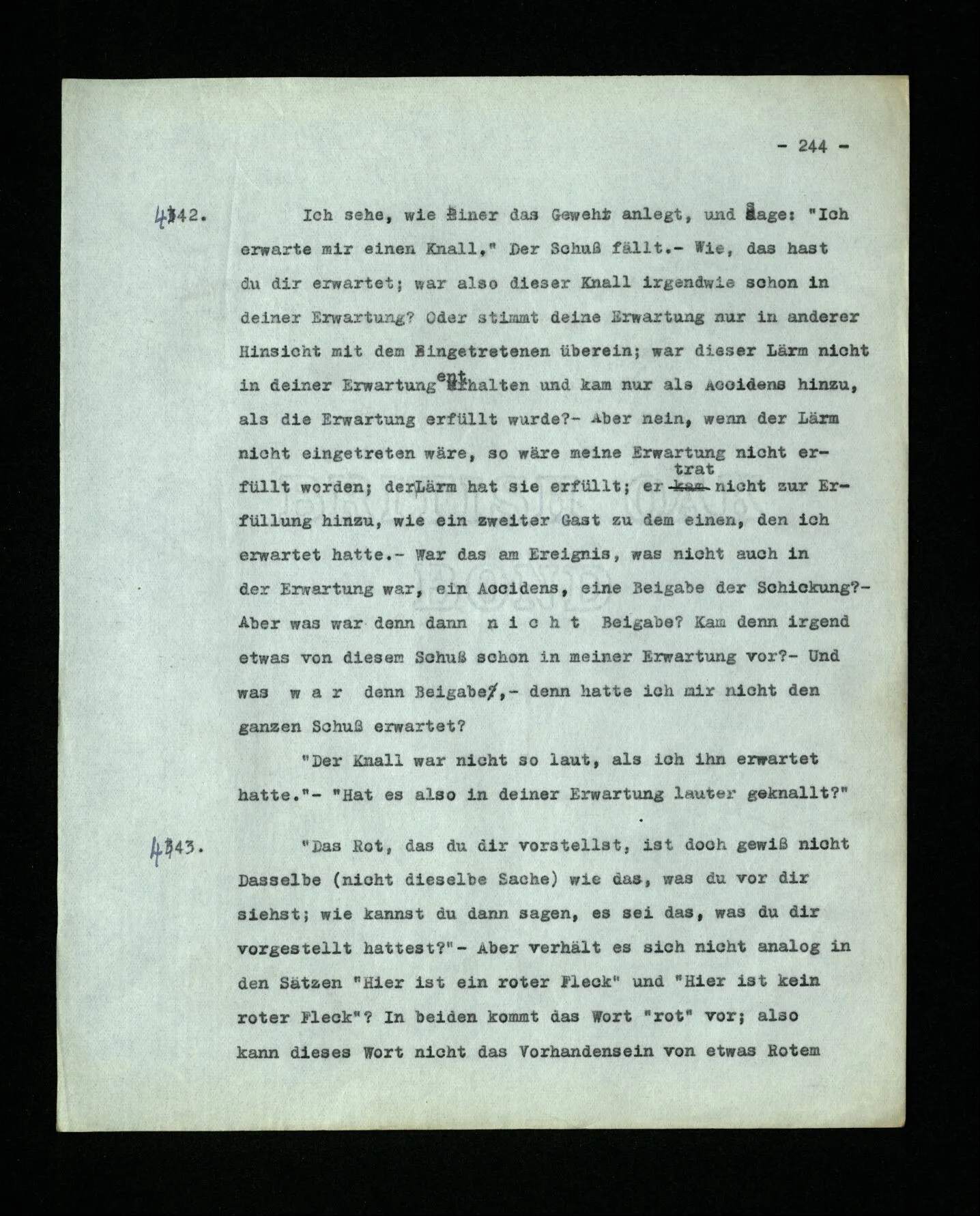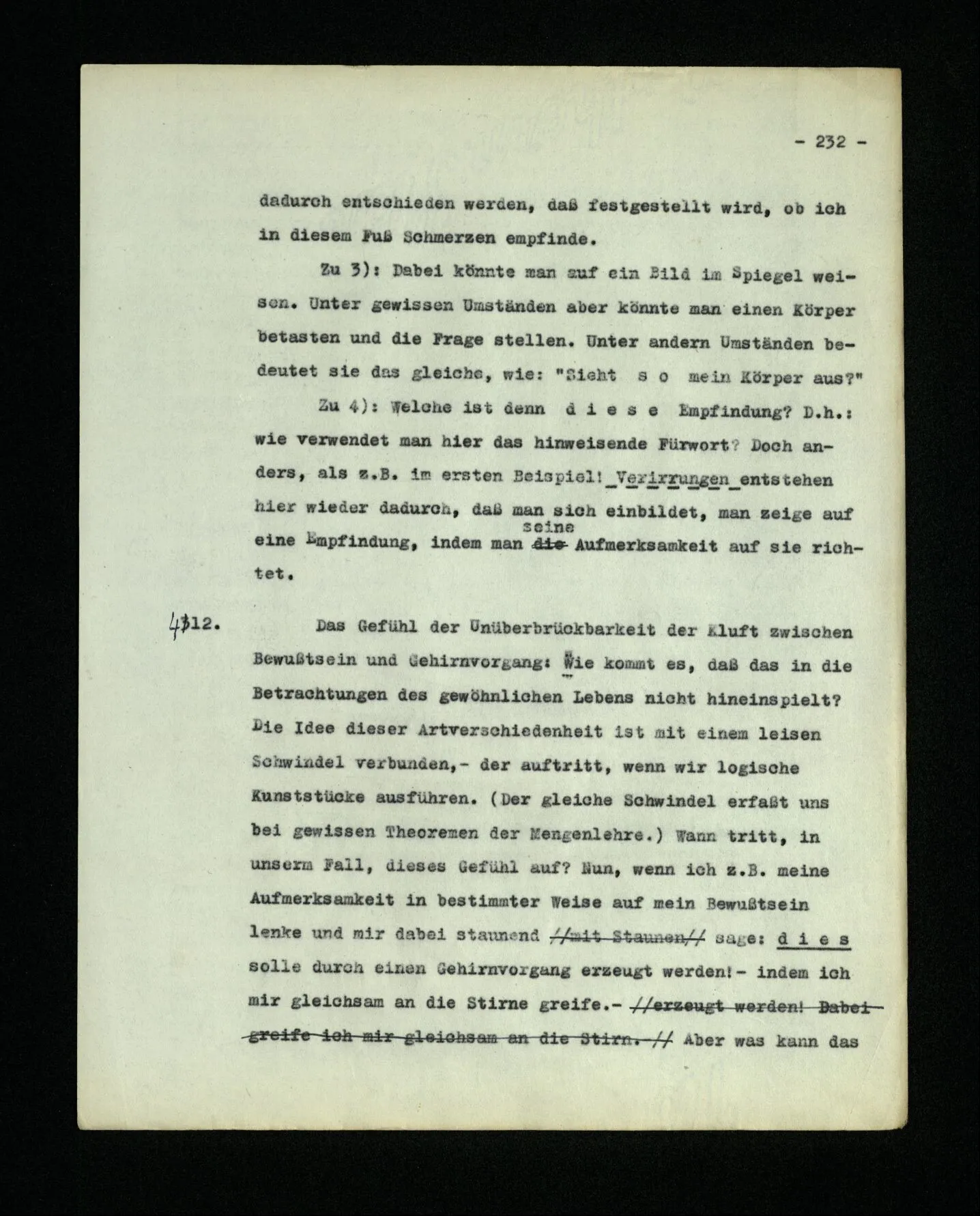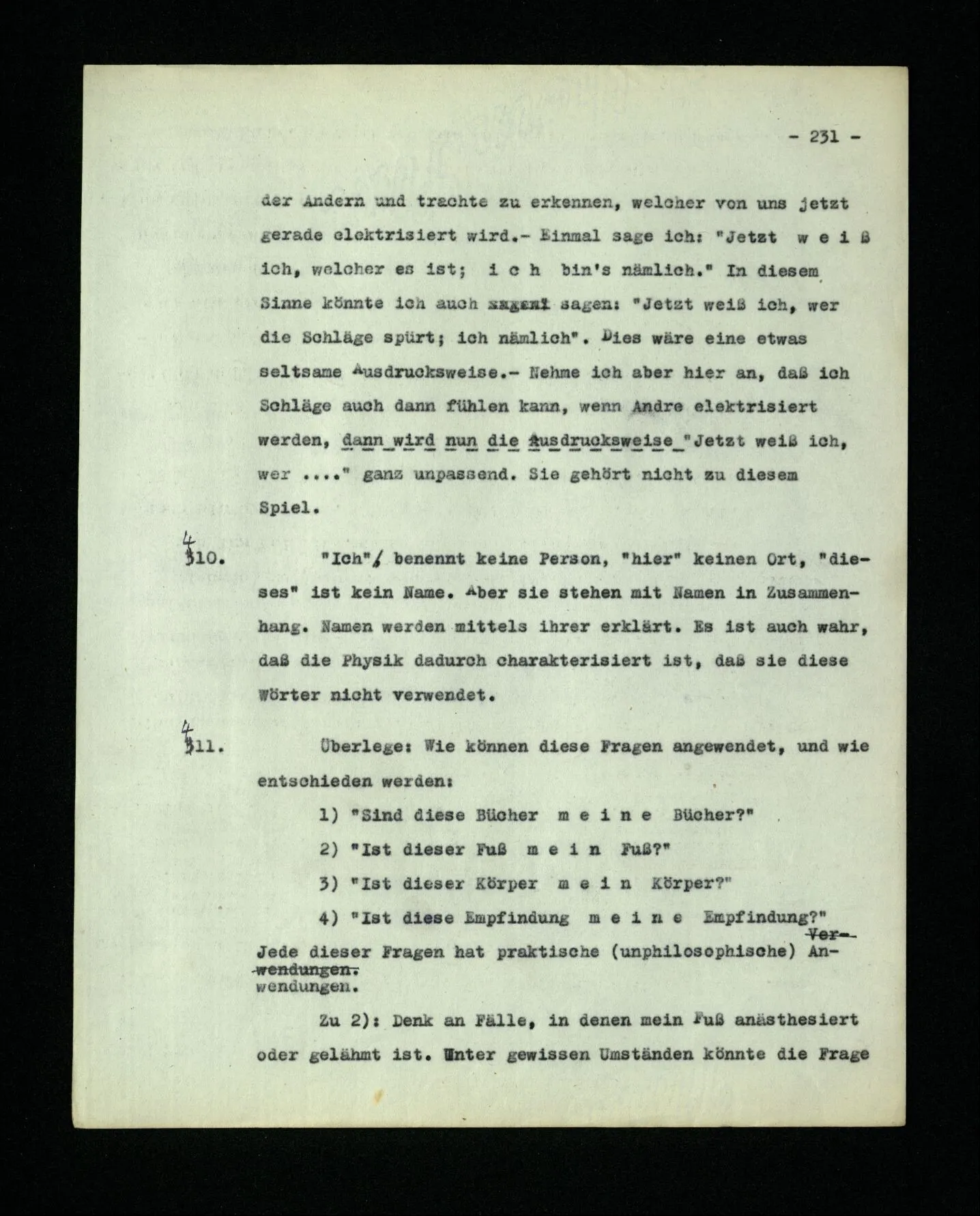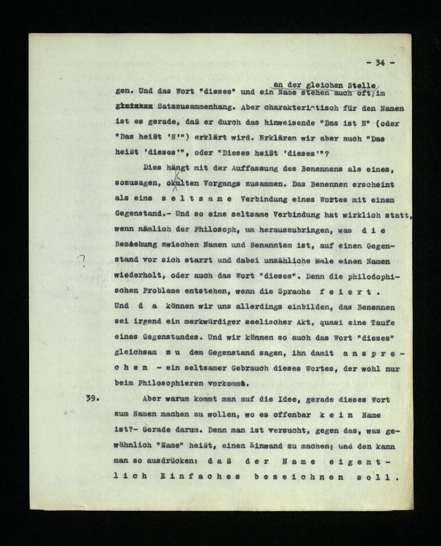 681. Man fragt natürlich auch nicht: “Bist du sicher, daß du ihn verflucht hast, daß die Verbindung mit ihm hergestellt war?” So ist also wohl diese Verbindung sehr leicht herzustellen, daß man ihrer so sicher sein kann?! Wissen kann, daß sie nicht daneben geht. – Nun, kann es mir passieren, daß ich an den Einen schreiben will und tatsächlich an den Andern schreibe? und wie könnte das geschehen?