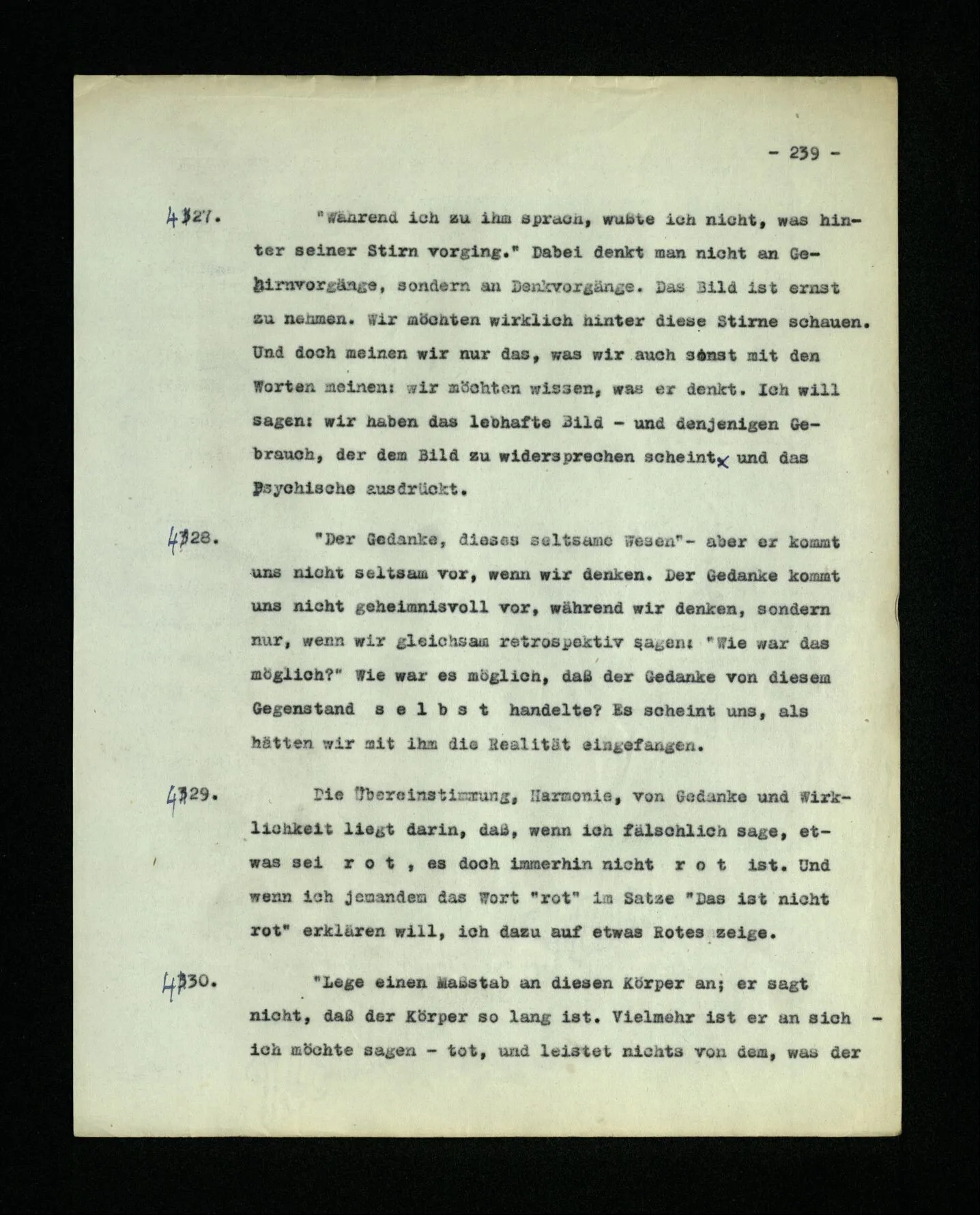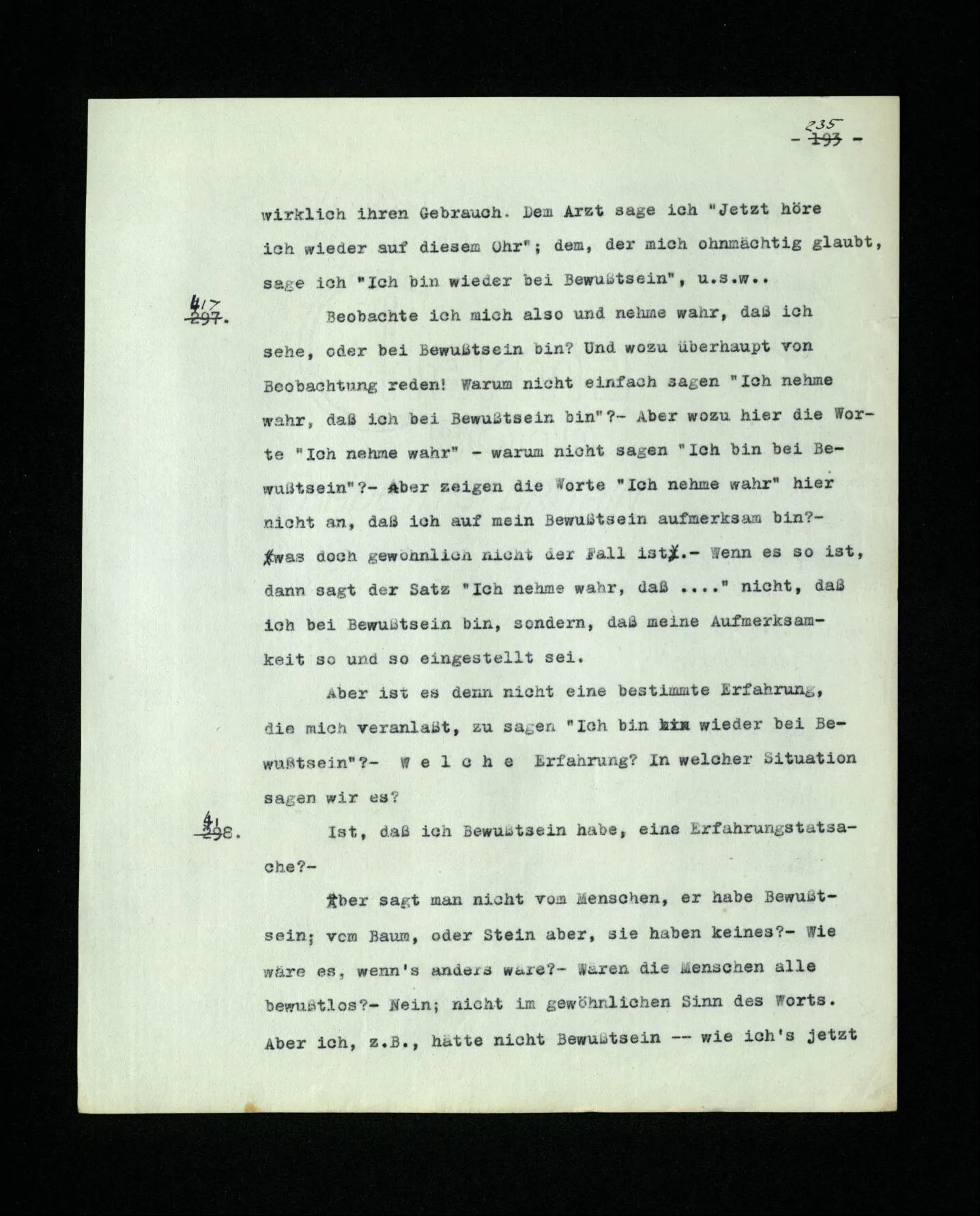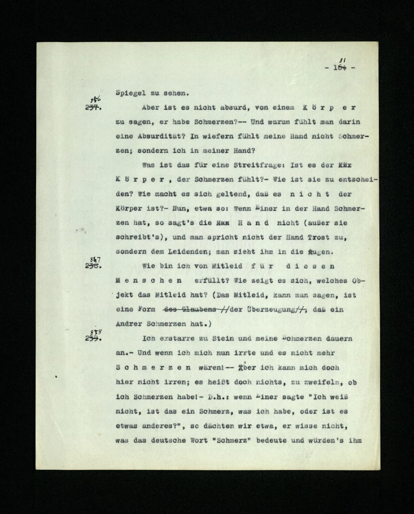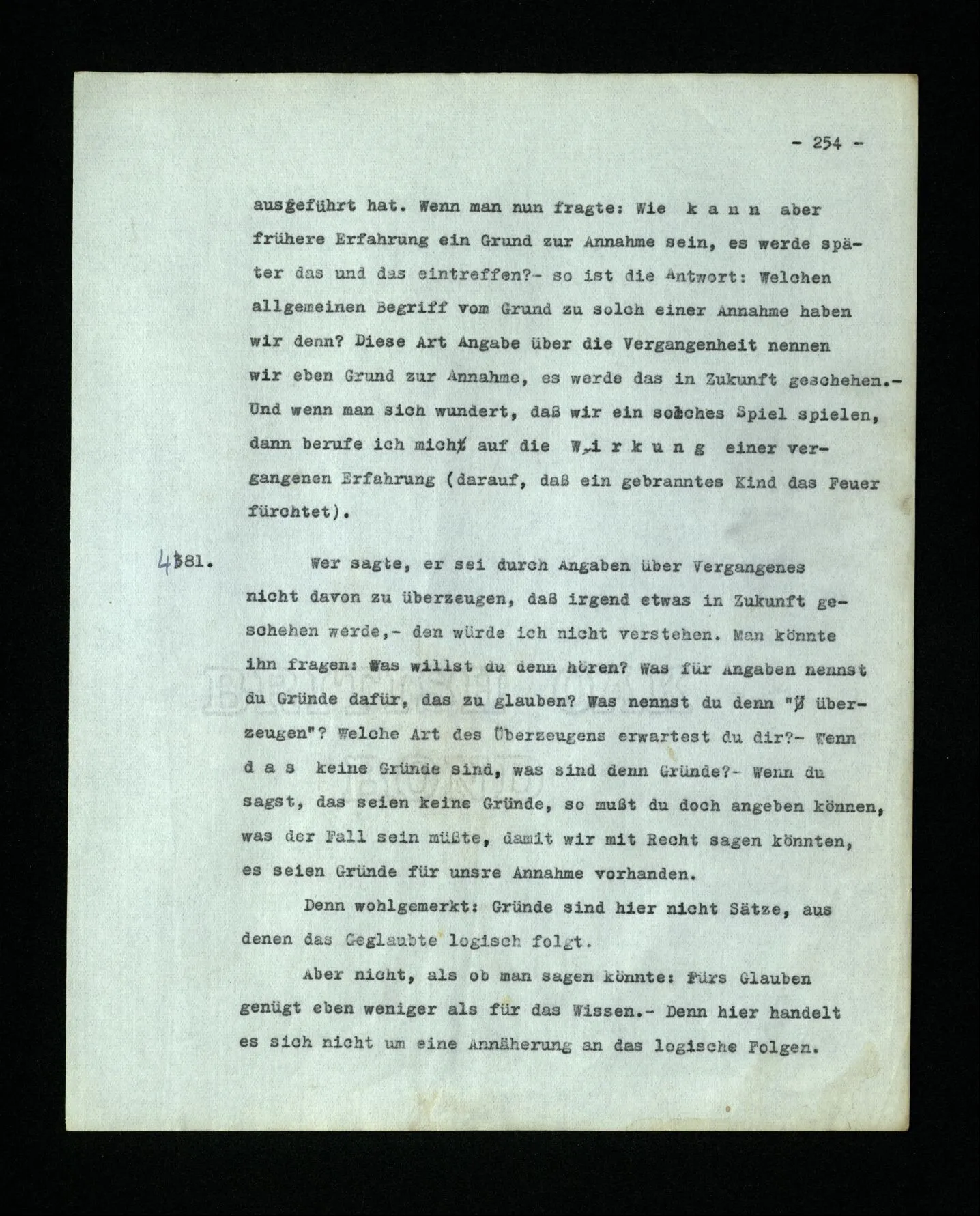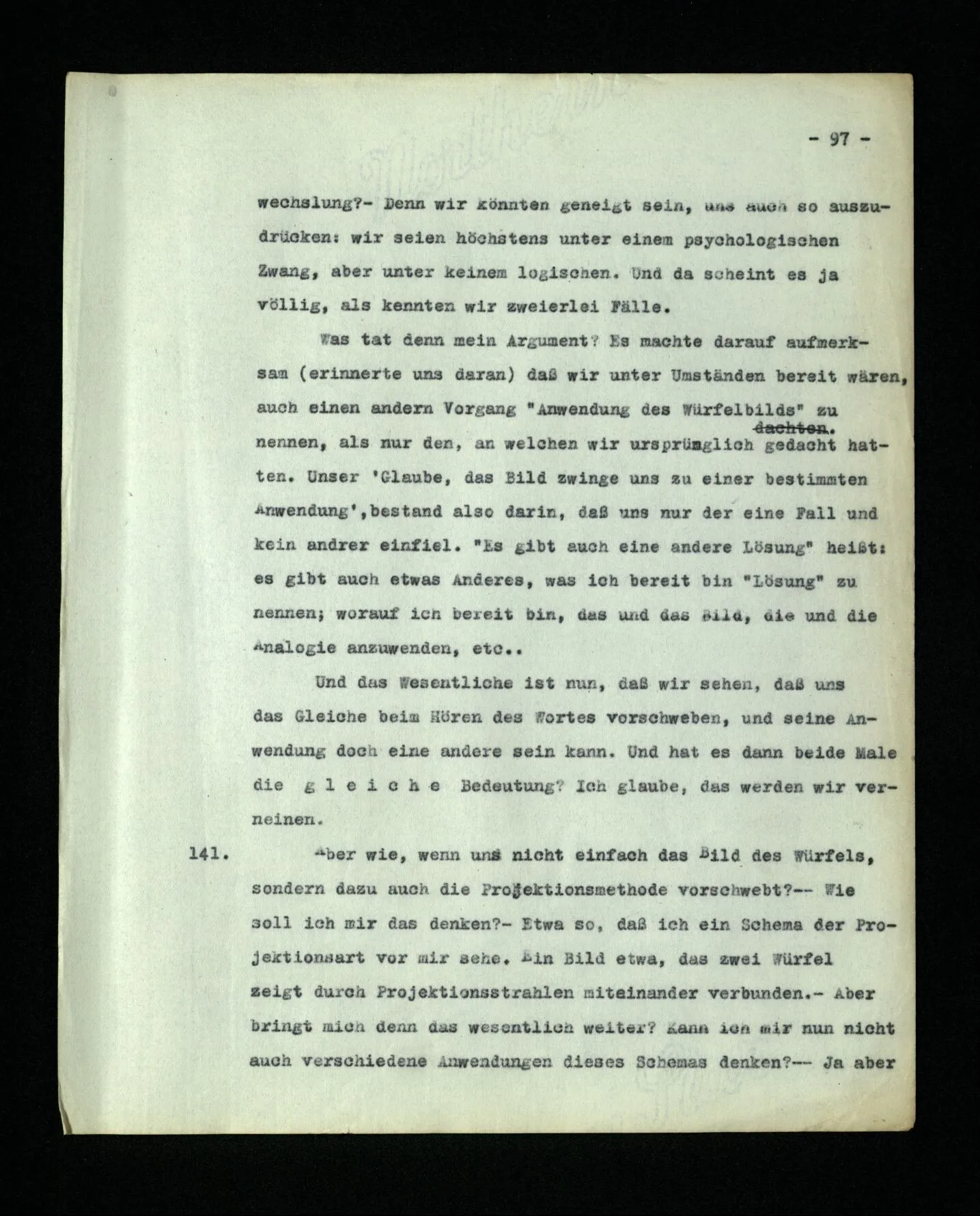 681. Man fragt natürlich auch nicht: “Bist du sicher, daß du ihn verflucht hast, daß die Verbindung mit ihm hergestellt war?” So ist also wohl diese Verbindung sehr leicht herzustellen, daß man ihrer so sicher sein kann?! Wissen kann, daß sie nicht daneben geht. – Nun, kann es mir passieren, daß ich an den Einen schreiben will und tatsächlich an den Andern schreibe? und wie könnte das geschehen?