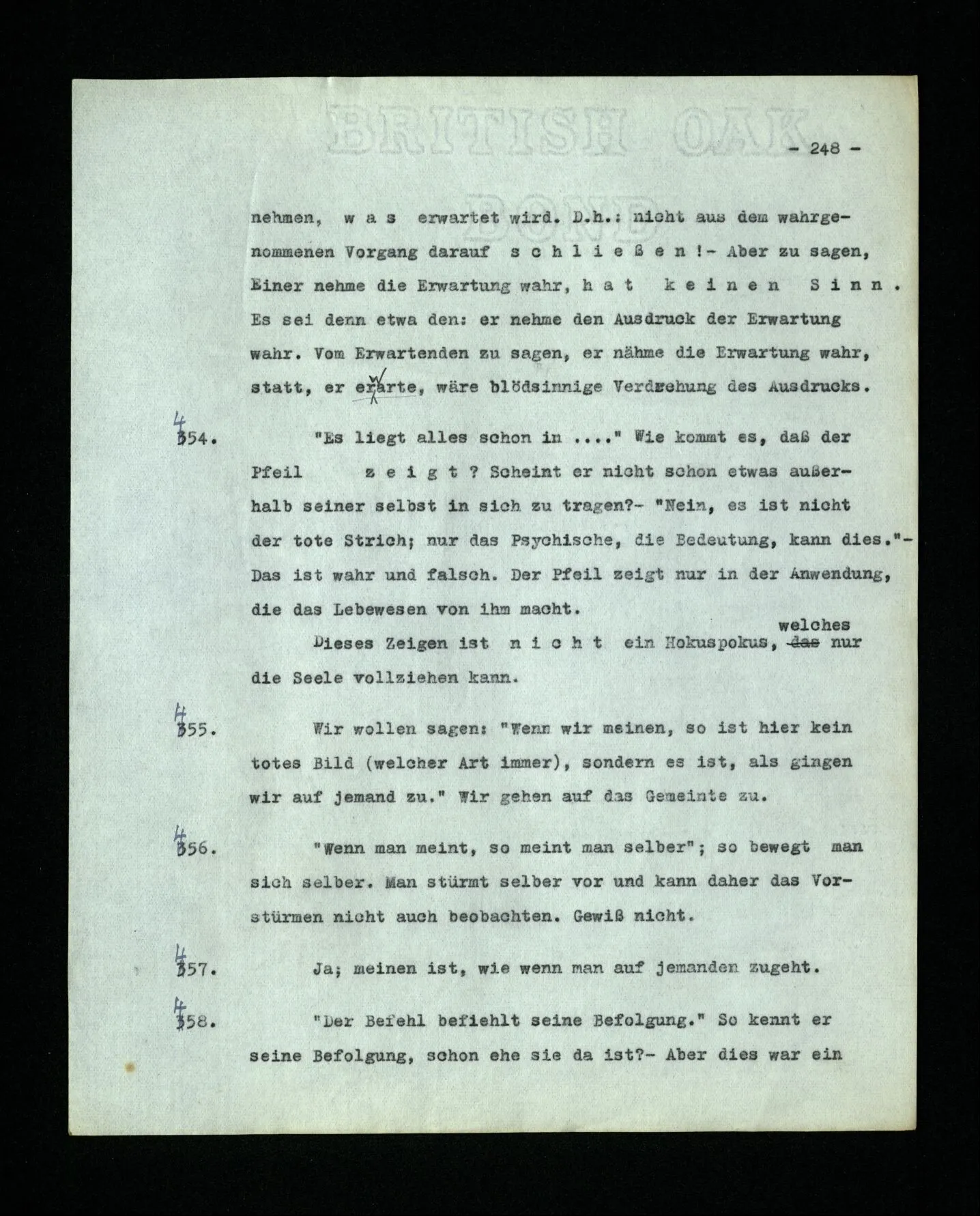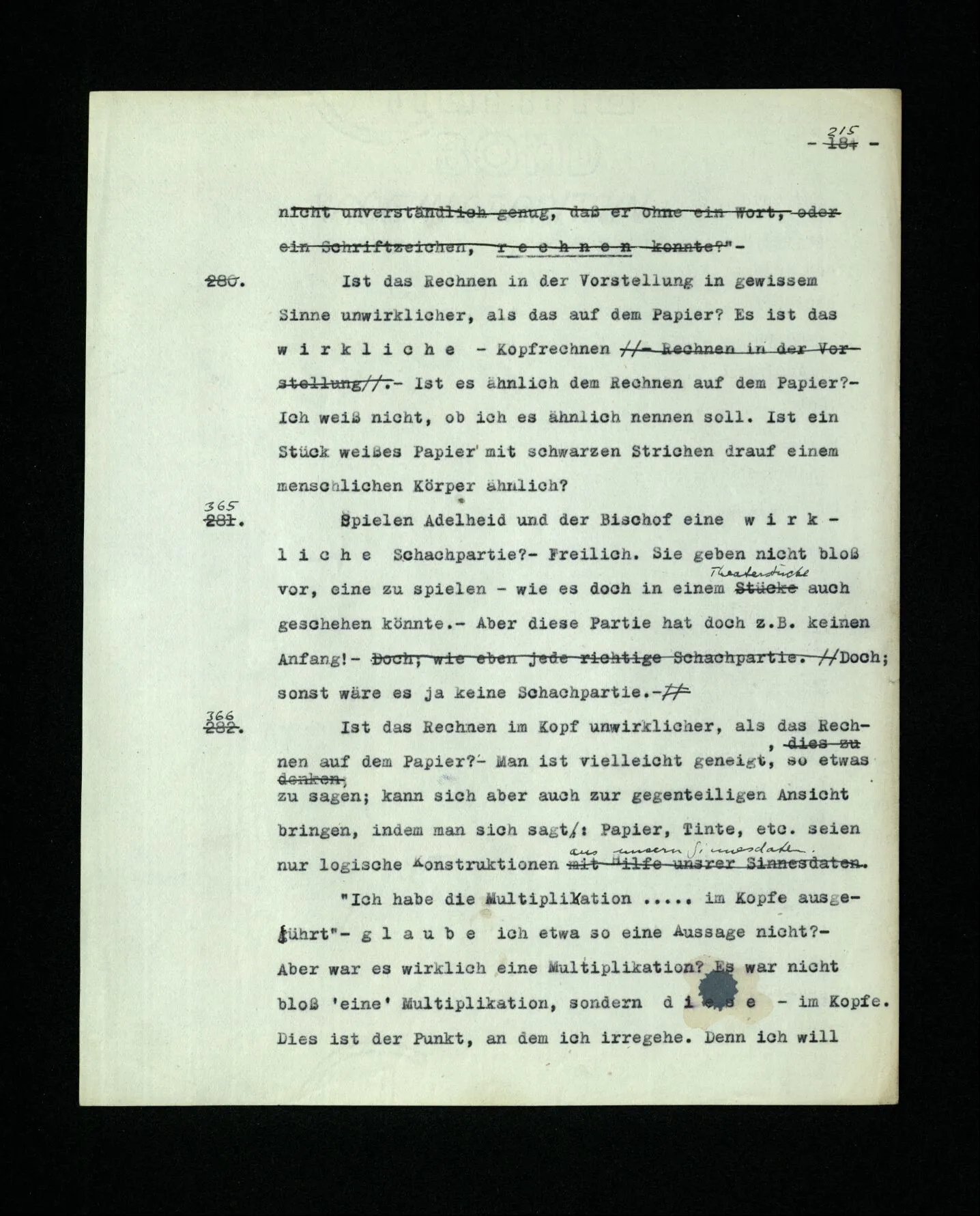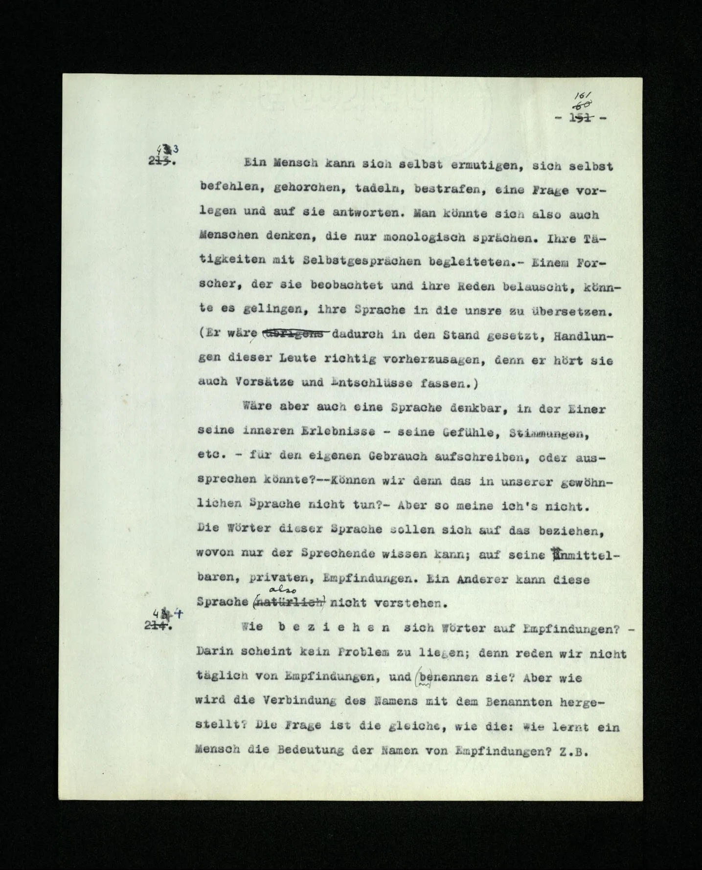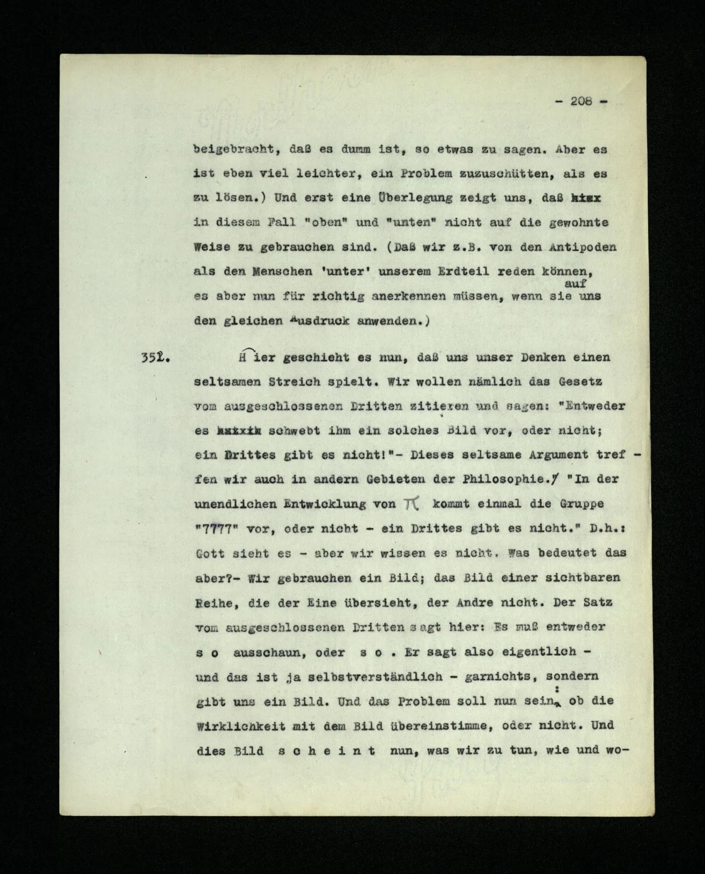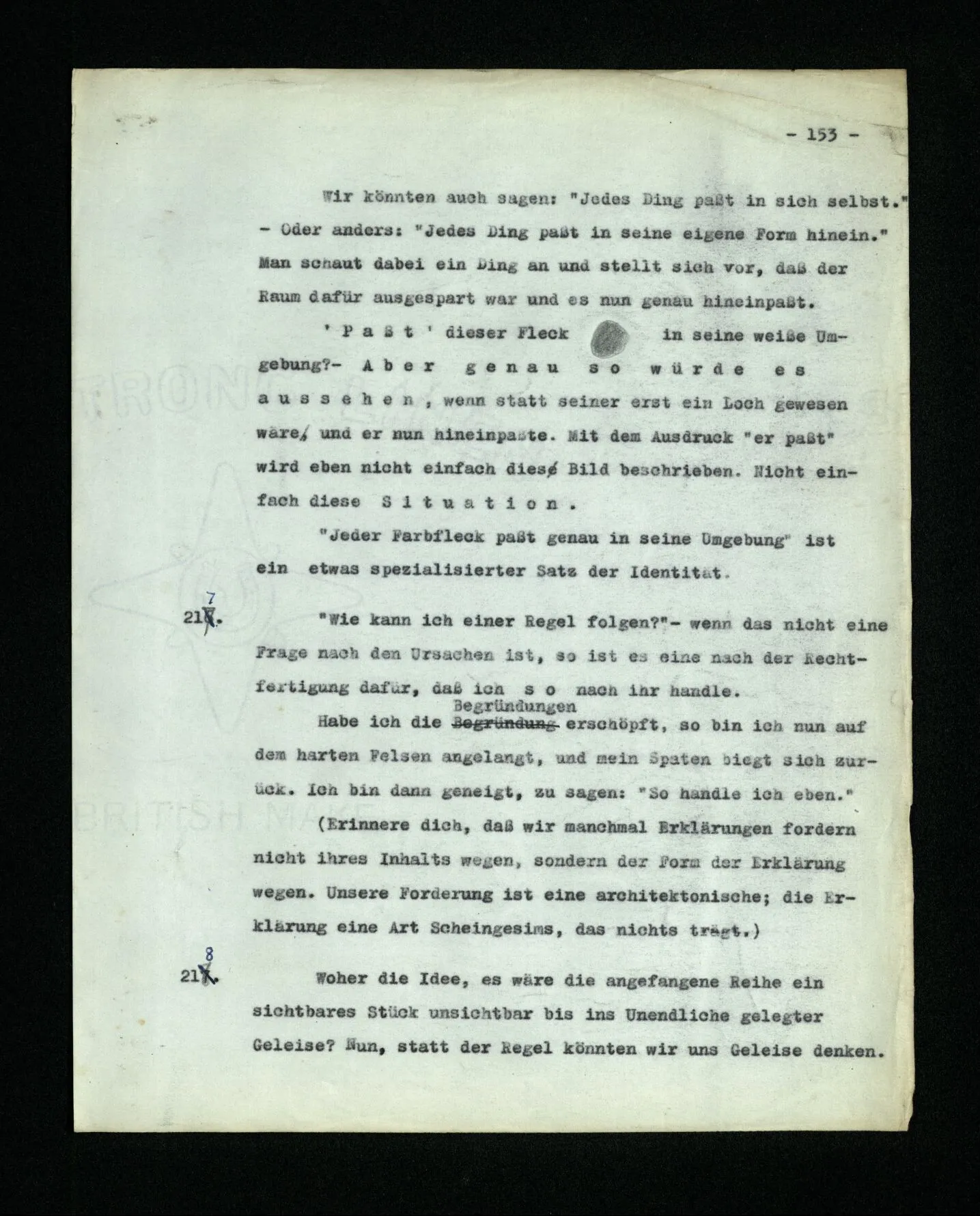 681. Man fragt natürlich auch nicht: “Bist du sicher, daß du ihn verflucht hast, daß die Verbindung mit ihm hergestellt war?” So ist also wohl diese Verbindung sehr leicht herzustellen, daß man ihrer so sicher sein kann?! Wissen kann, daß sie nicht daneben geht. – Nun, kann es mir passieren, daß ich an den Einen schreiben will und tatsächlich an den Andern schreibe? und wie könnte das geschehen?