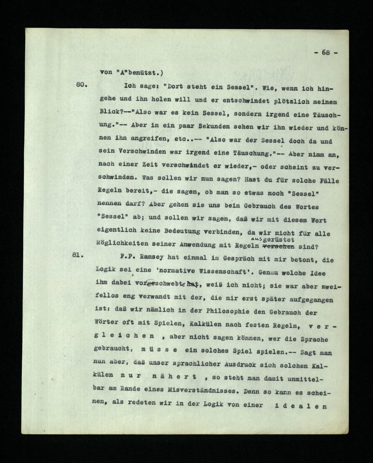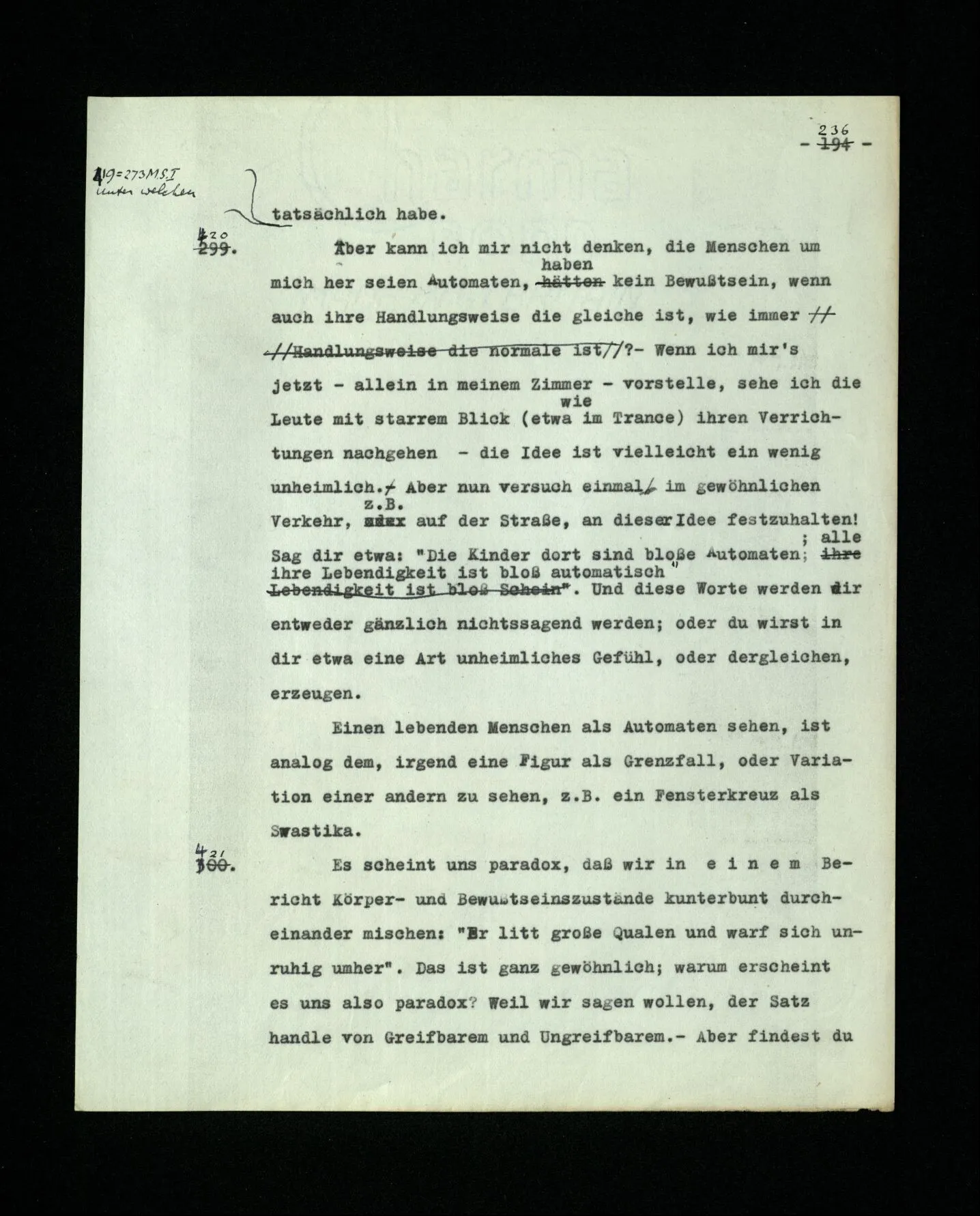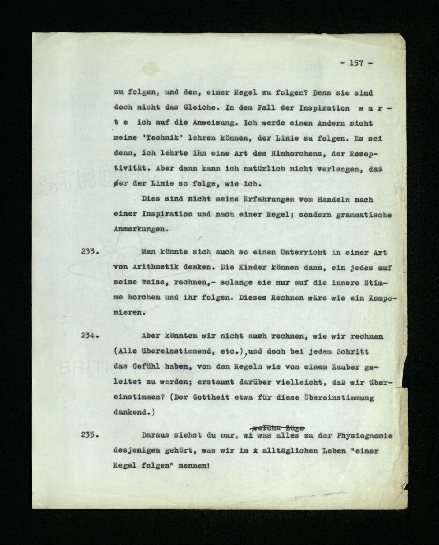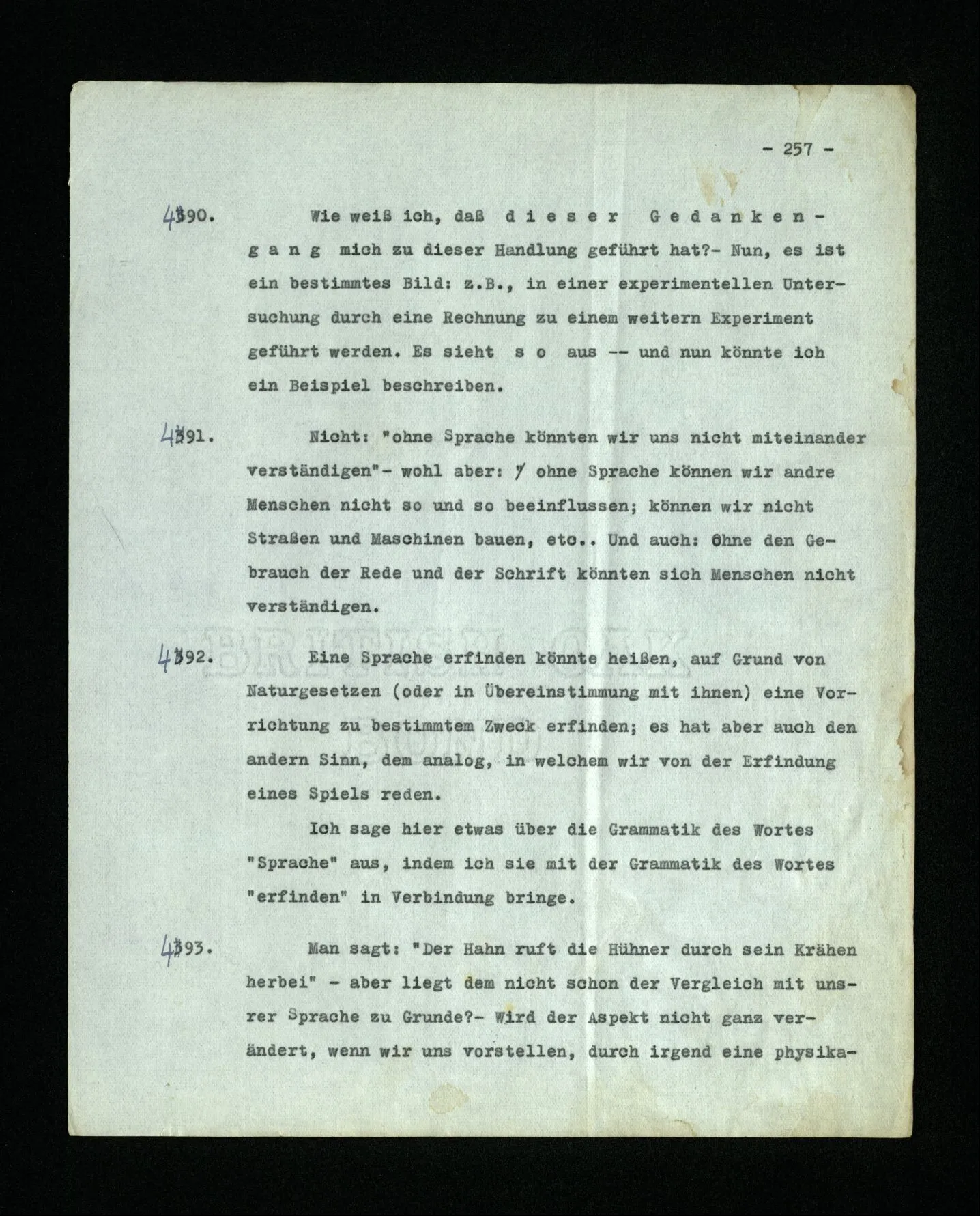 681. Man fragt natürlich auch nicht: “Bist du sicher, daß du ihn verflucht hast, daß die Verbindung mit ihm hergestellt war?” So ist also wohl diese Verbindung sehr leicht herzustellen, daß man ihrer so sicher sein kann?! Wissen kann, daß sie nicht daneben geht. – Nun, kann es mir passieren, daß ich an den Einen schreiben will und tatsächlich an den Andern schreibe? und wie könnte das geschehen?