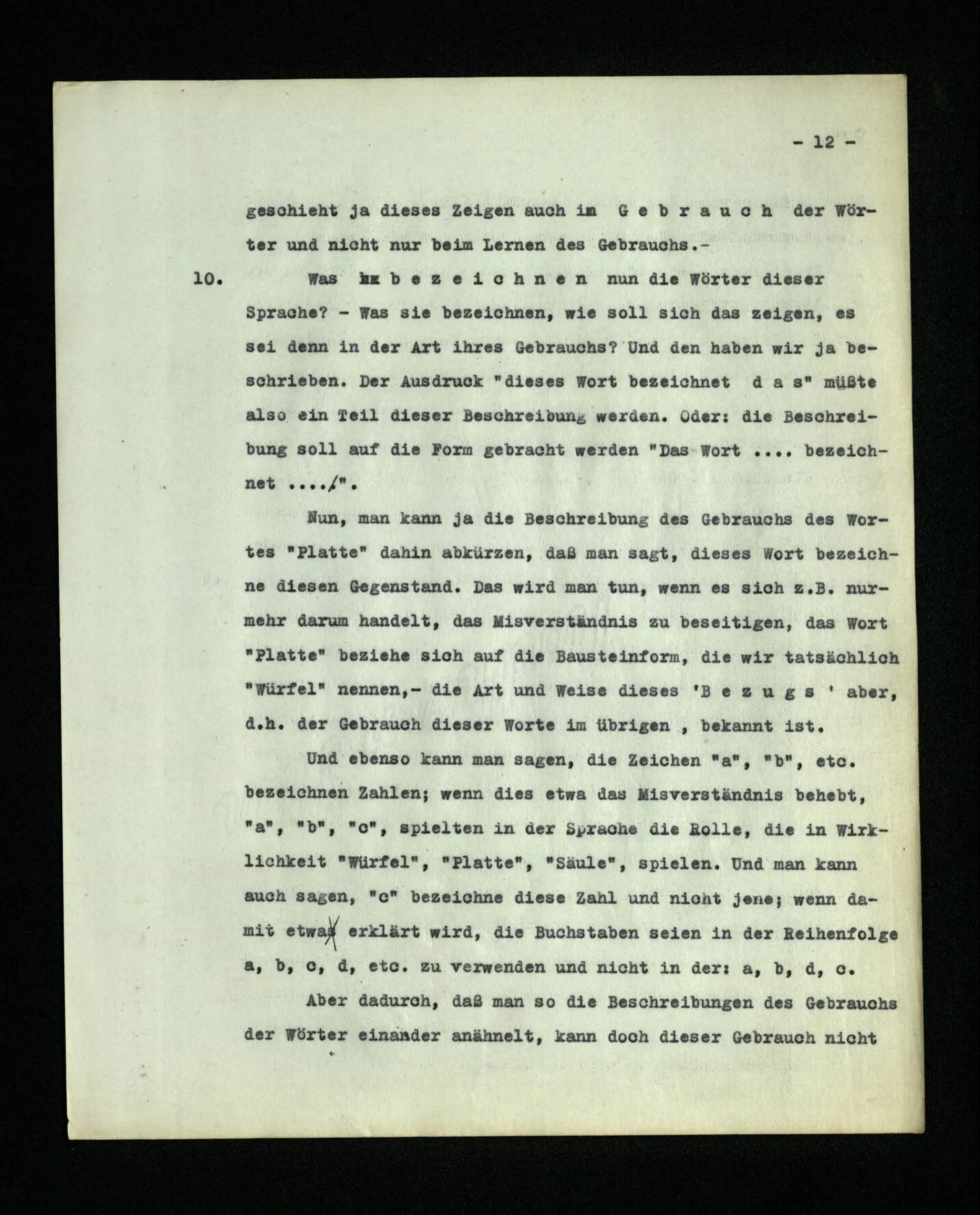10. Was bezeichnen nun die Wörter dieser Sprache? – Was sie bezeichnen, wie soll sich das zeigen, es sei denn in der Art ihres Gebrauchs? Und den haben wir ja beschrieben. Der Ausdruck “dieses Wort bezeichnet das” müßte also ein Teil dieser Beschreibung werden. Oder: die Beschreibung soll auf die Form gebracht werden: “Das Wort … bezeichnet …”. Nun, man kann ja die Beschreibung des Gebrauchs des Wortes “Platte” dahin abkürzen, daß man sagt, dieses Wort bezeichne diesen Gegenstand. Das wird man tun, wenn es sich z.B. nurmehr darum handelt, das Mißverständnis zu beseitigen, das Wort “Platte” beziehe sich auf die Bausteinform, die wir tatsächlich “Würfel” nennen,– die Art und Weise dieses ‘Bezugs’ aber, d.h. der Gebrauch dieser Worte im übrigen, bekannt ist. Und ebenso kann man sagen, die Zeichen “a”, “b”, etc. bezeichnen Zahlen, wenn dies etwa das Mißverständnis behebt “a”, “b”, “c”, spielten in der Sprache die Rolle, die in Wirklichkeit “Würfel”, “Platte”, “Säule”, spielen. Und man kann auch sagen “c” bezeichne diese Zahl und nicht jene; wenn damit etwa erklärt wird, die Buchstaben seien in der Reihenfolge “a”, “b”, “c”, “d”, etc. zu verwenden und nicht in der: “a”, “b”, “d”, “c”. Aber dadurch, daß man so die Beschreibungen des Gebrauchs der Wörter einander anähnelt, kann doch dieser Gebrauch nicht ähnlicher werden! Denn, wie wir sehen, ist er ganz und gar ungleichartig.