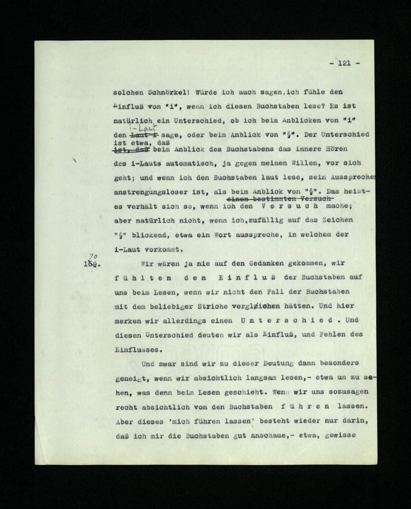 671. Und worauf zeige ich denn durch die innere Tätigkeit des Horchens? Auf den Laut, der mir zu Ohren kommt, und auf die Stille, wenn ich nichts höre? Das Horchen sucht gleichsam einen Gehörseindruck und kann daher auf ihn nicht zeigen, sondern nur auf den Ort, wo es ihn sucht.