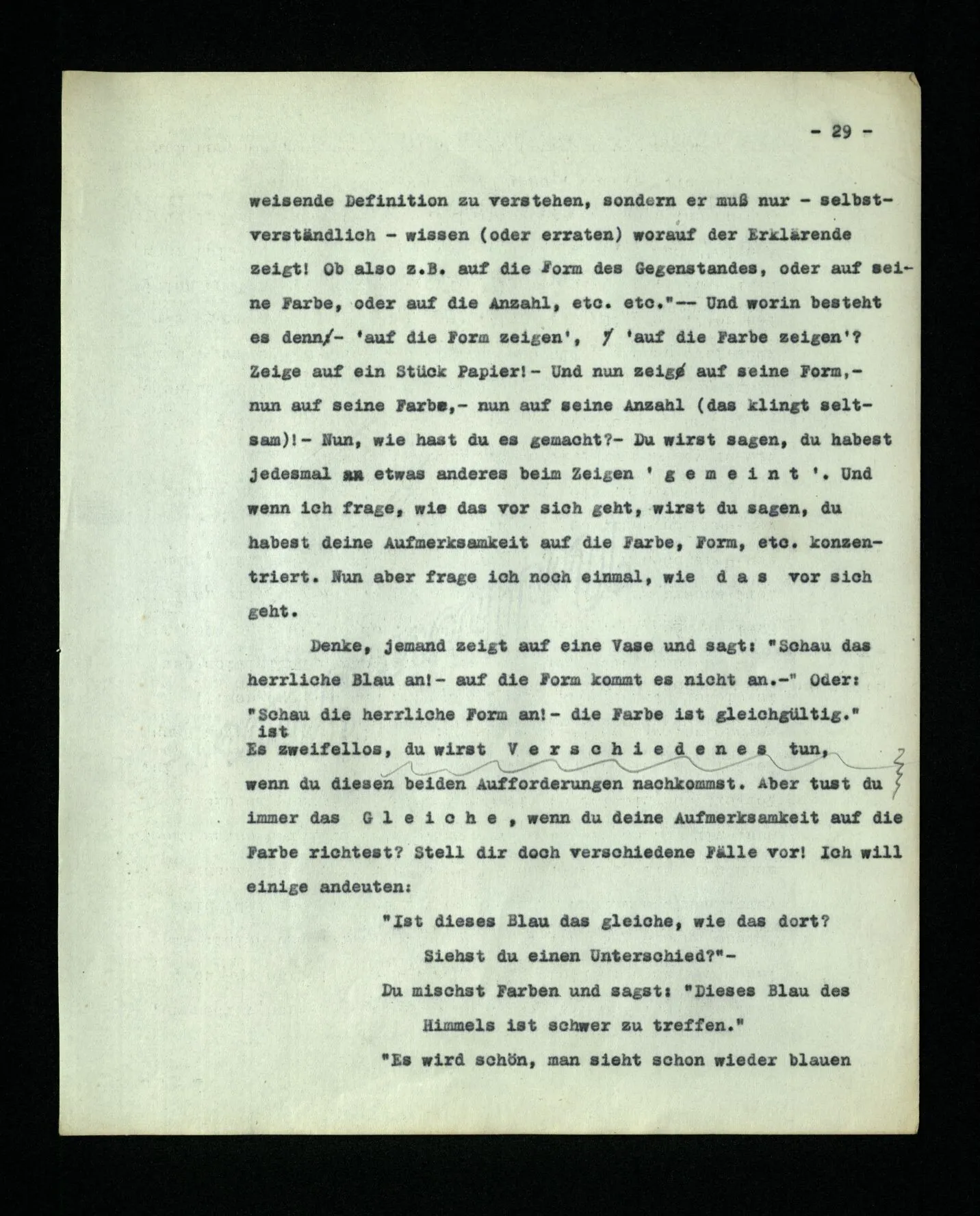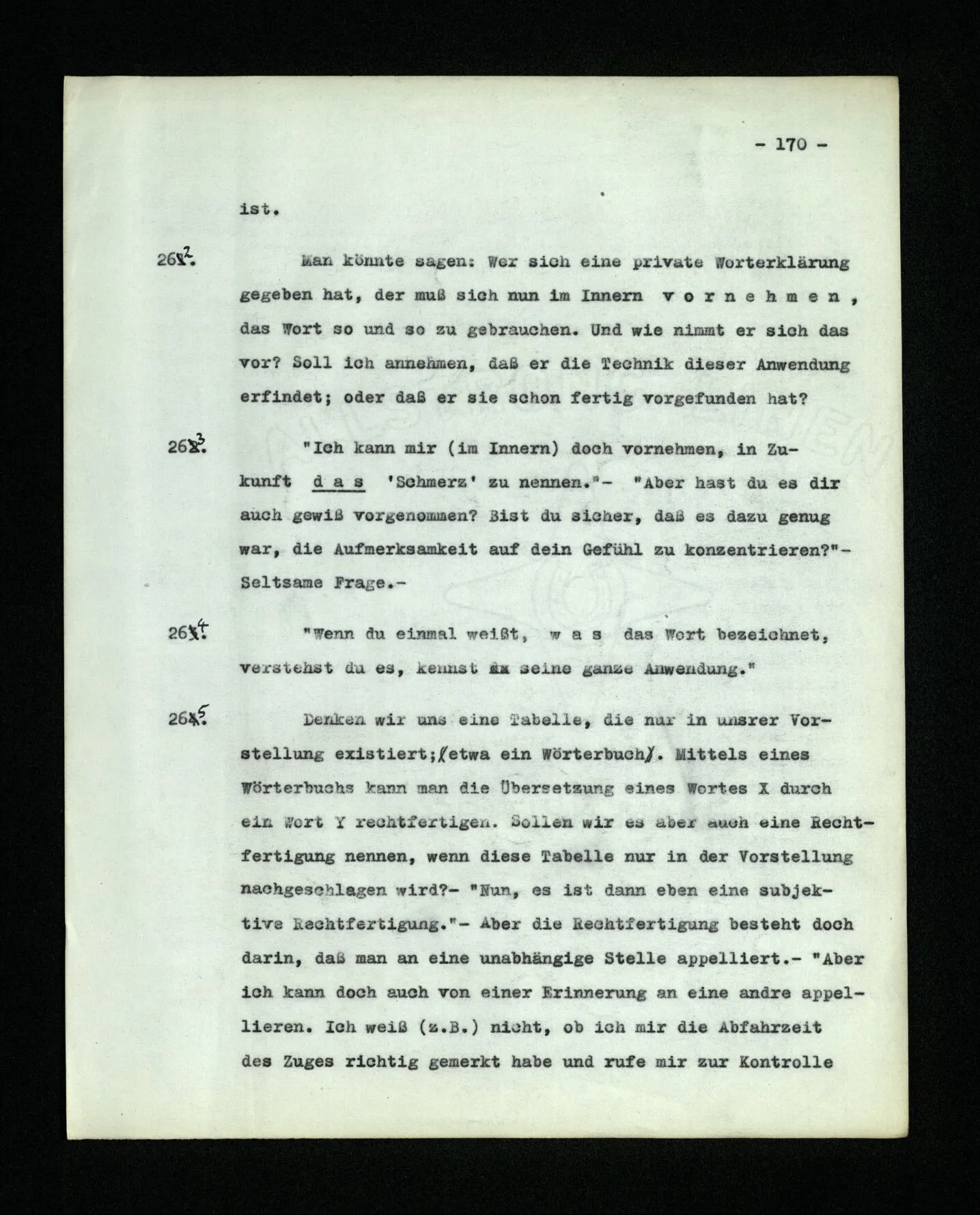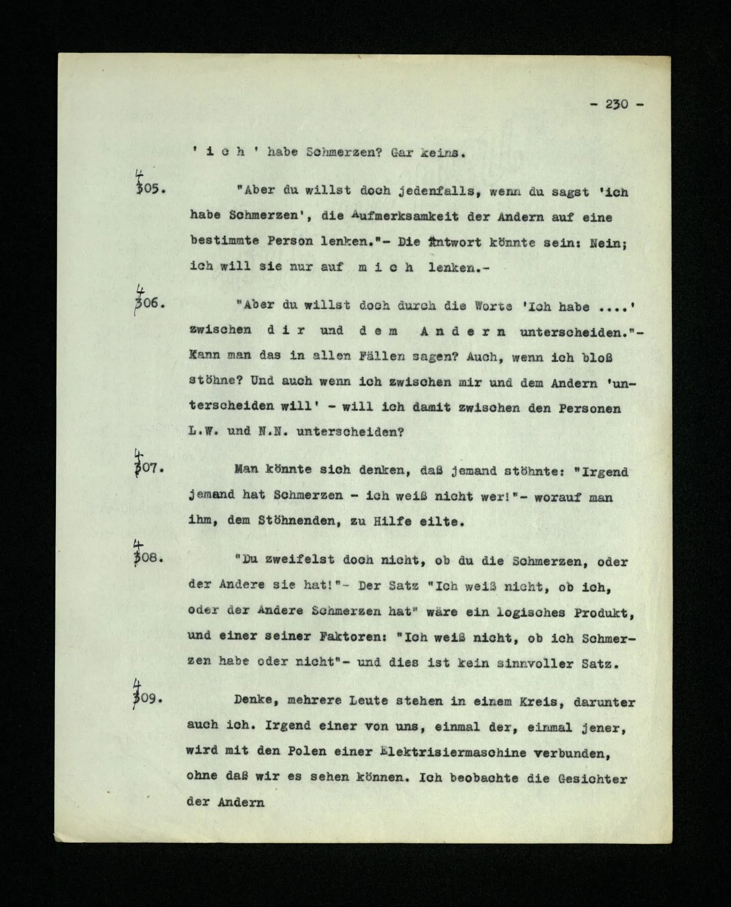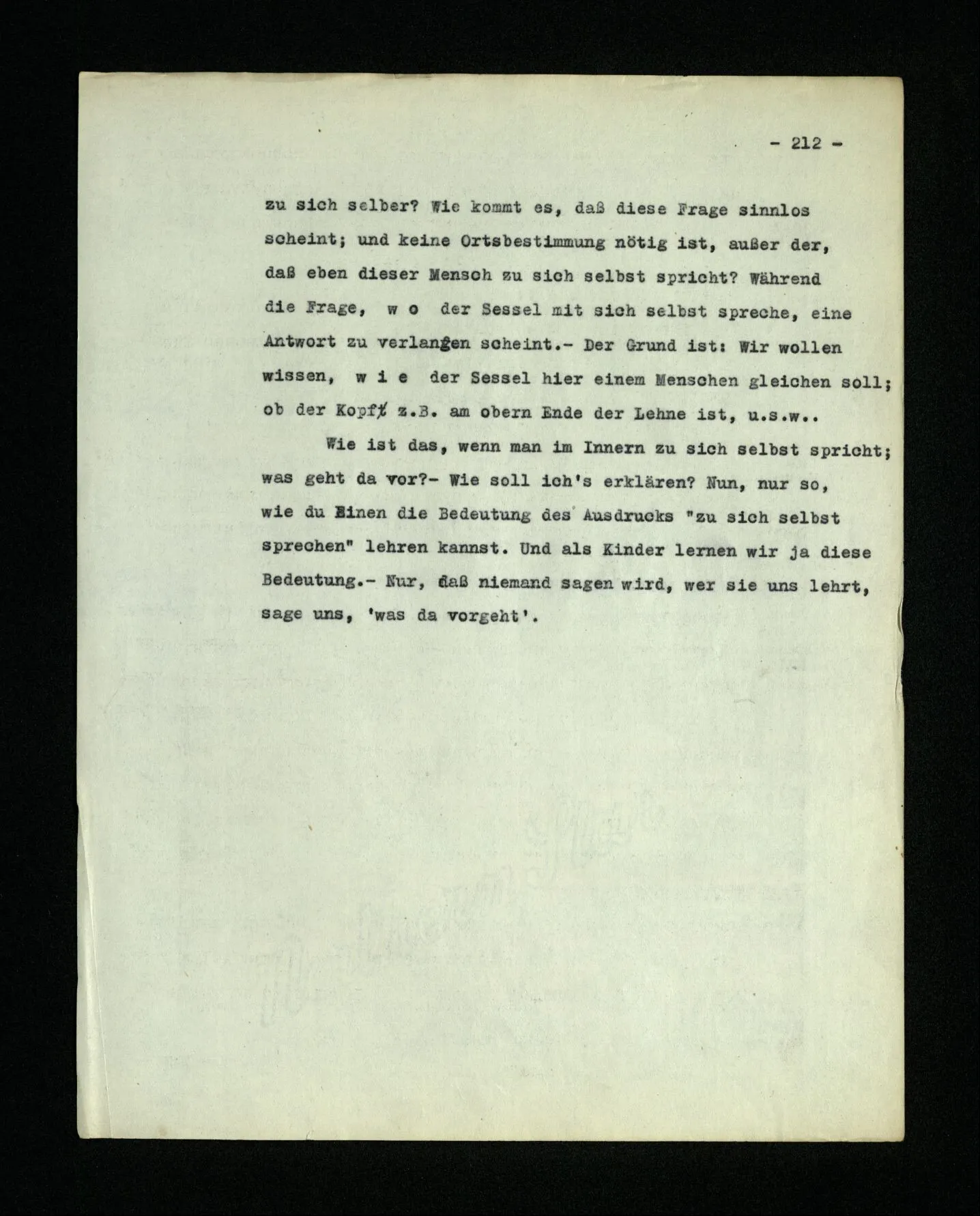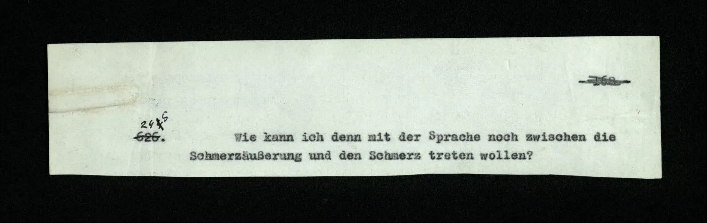 666. Denke, du habest Schmerzen und zugleich hörst du, wie nebenan Klavier gestimmt wird. Du sagst “Es wird bald aufhören.” Es ist doch wohl ein Unterschied, ob du den Schmerz meinst, oder das Klavierstimmen! – Freilich; aber worin besteht dieser Unterschied? Ich gebe zu: es wird in vielen Fällen der Meinung eine Richtung der Aufmerksamkeit entsprechen, sowie auch oft ein Blick, eine Geste, oder ein Schließen der Augen, das man ein “Nach-Innen-Blicken” nennen könnte.