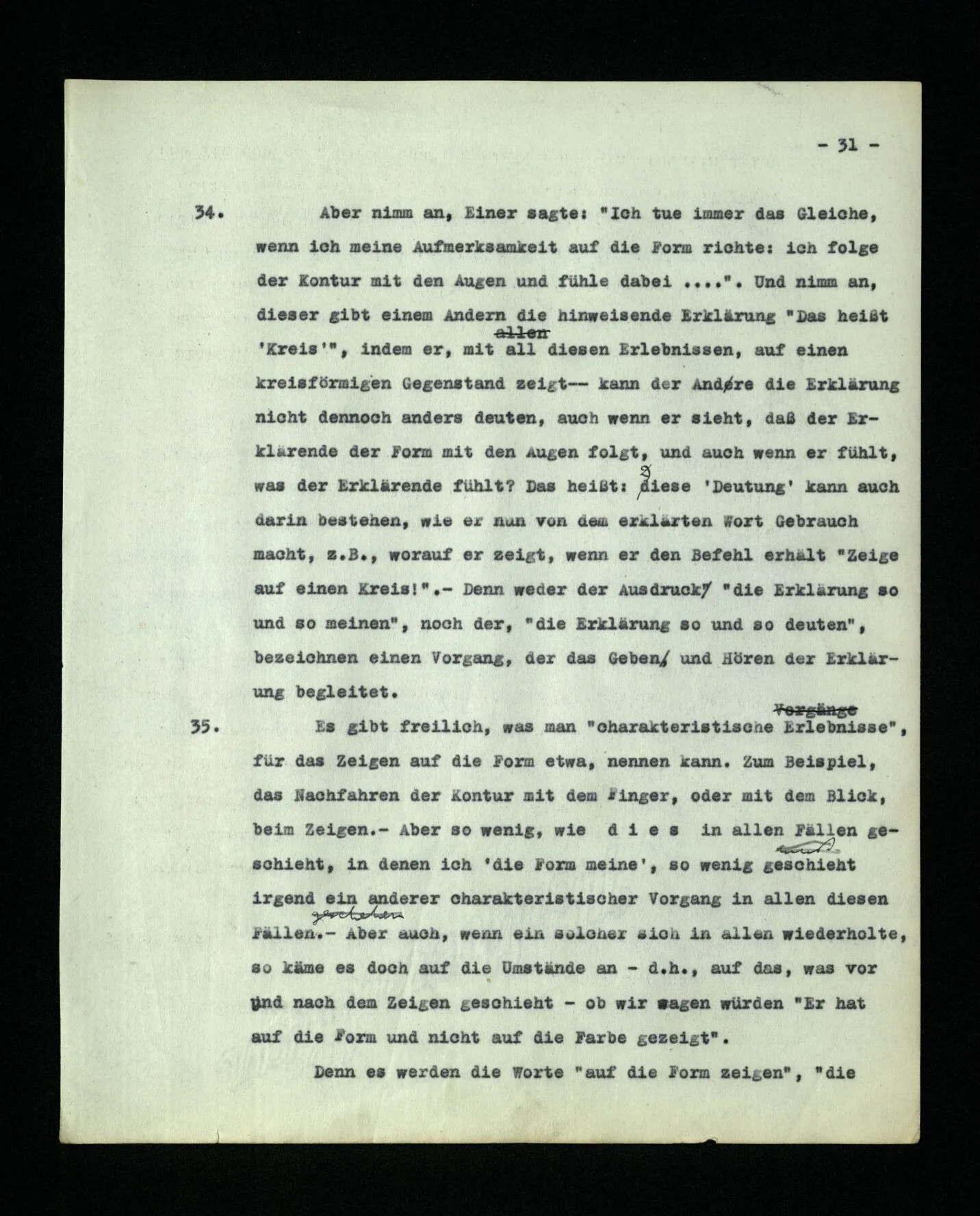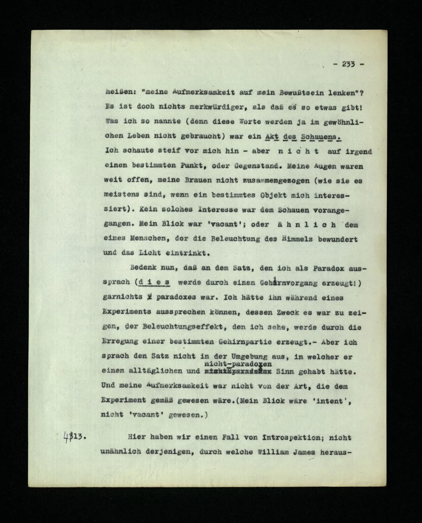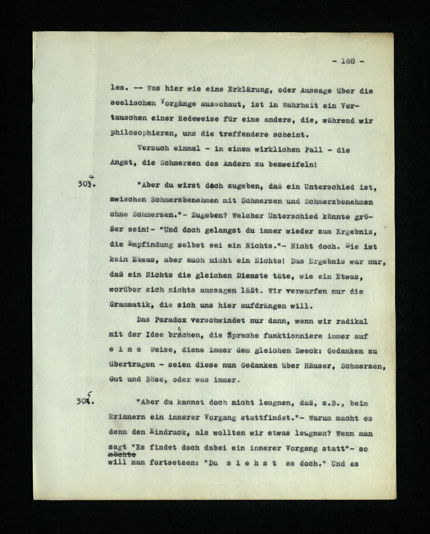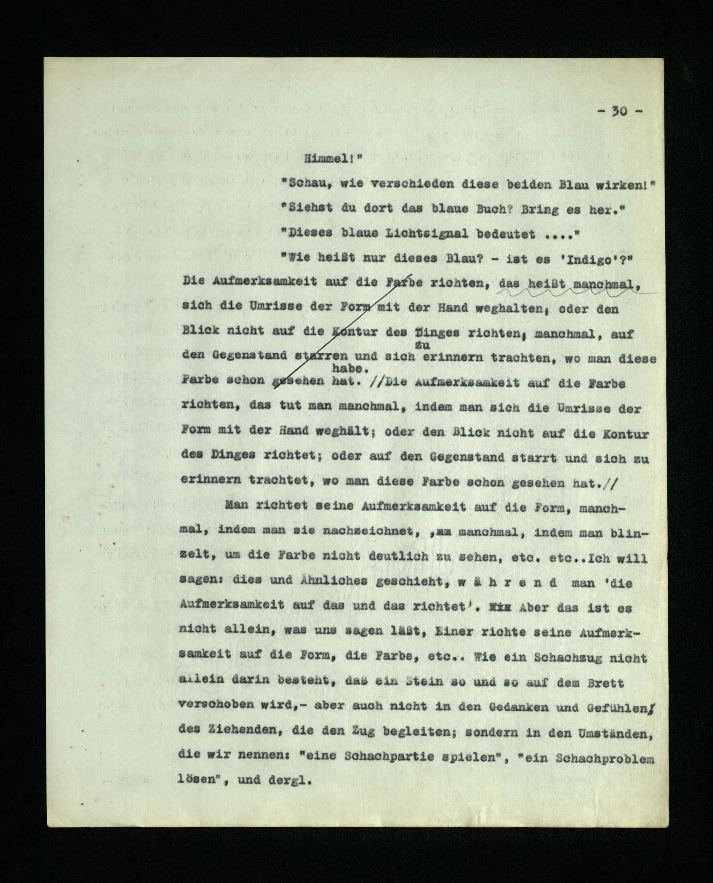 666. Denke, du habest Schmerzen und zugleich hörst du, wie nebenan Klavier gestimmt wird. Du sagst “Es wird bald aufhören.” Es ist doch wohl ein Unterschied, ob du den Schmerz meinst, oder das Klavierstimmen! – Freilich; aber worin besteht dieser Unterschied? Ich gebe zu: es wird in vielen Fällen der Meinung eine Richtung der Aufmerksamkeit entsprechen, sowie auch oft ein Blick, eine Geste, oder ein Schließen der Augen, das man ein “Nach-Innen-Blicken” nennen könnte.
