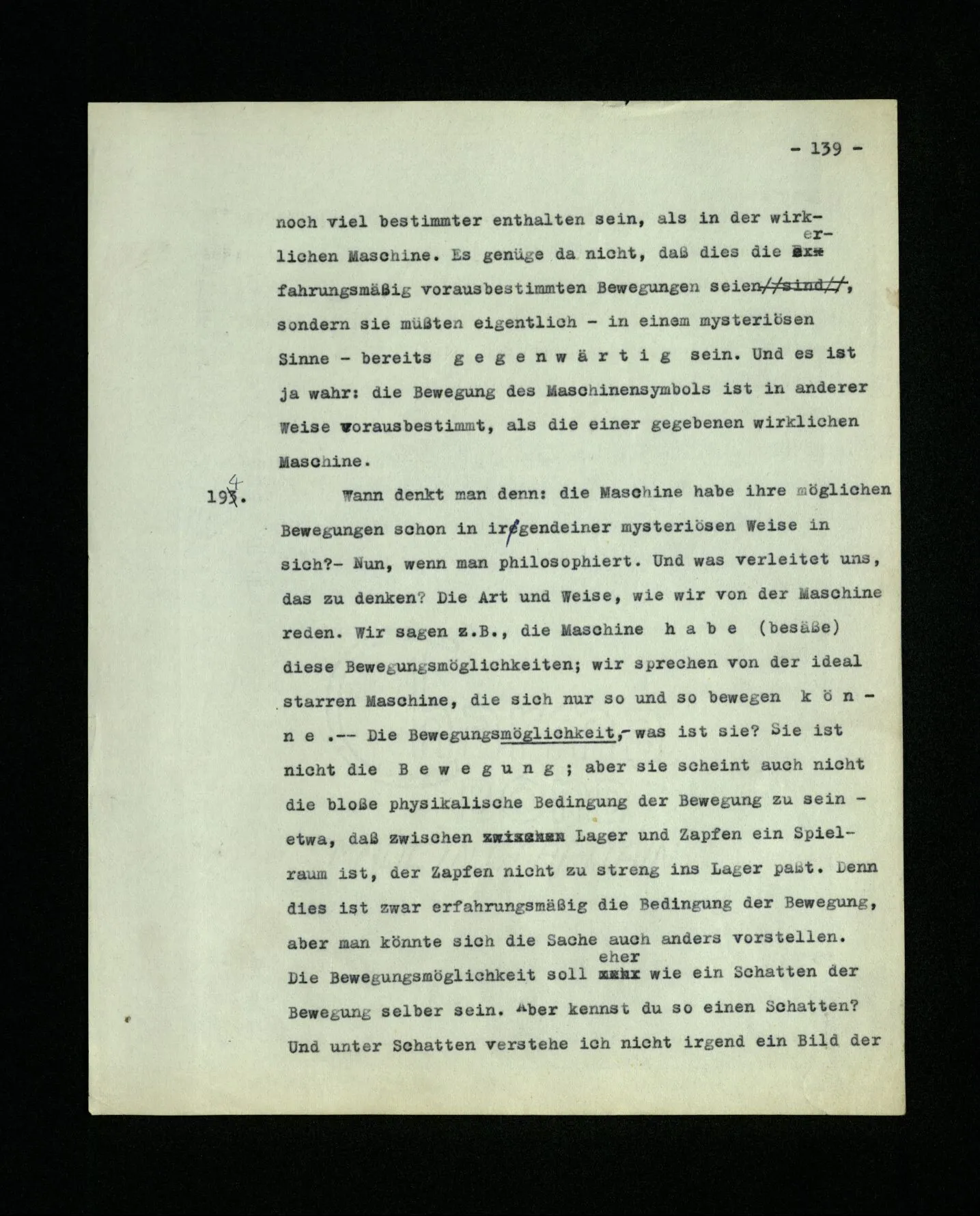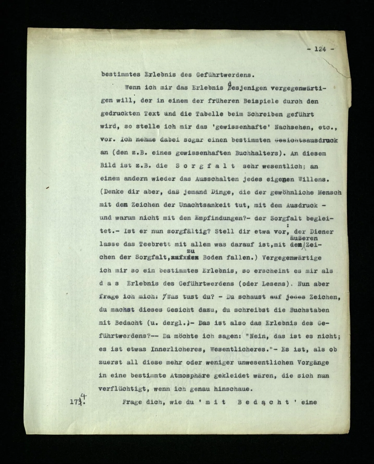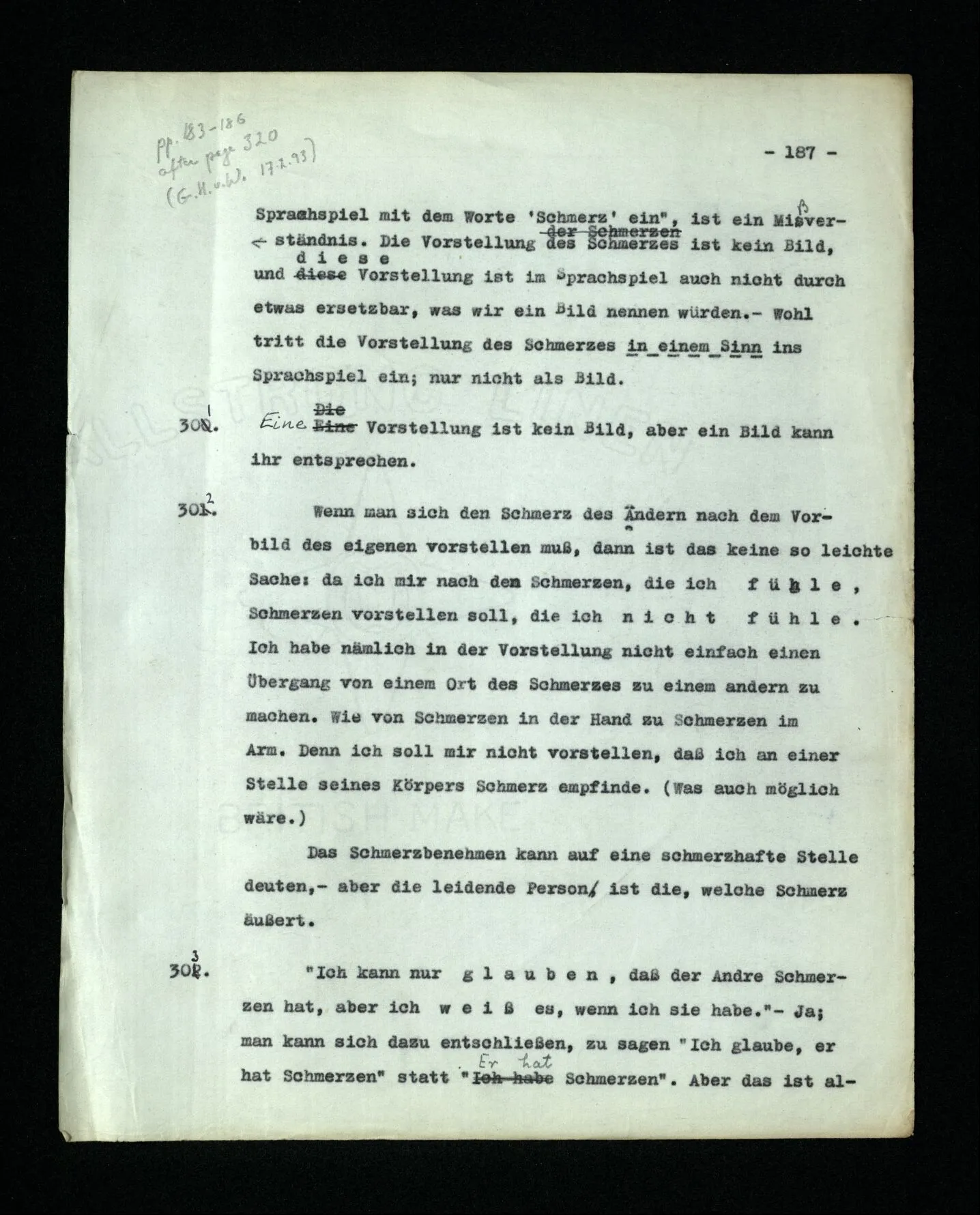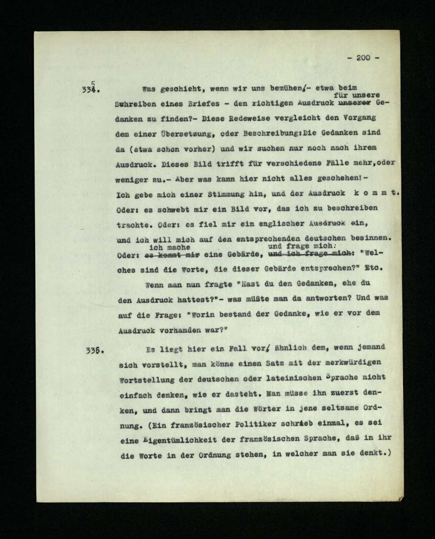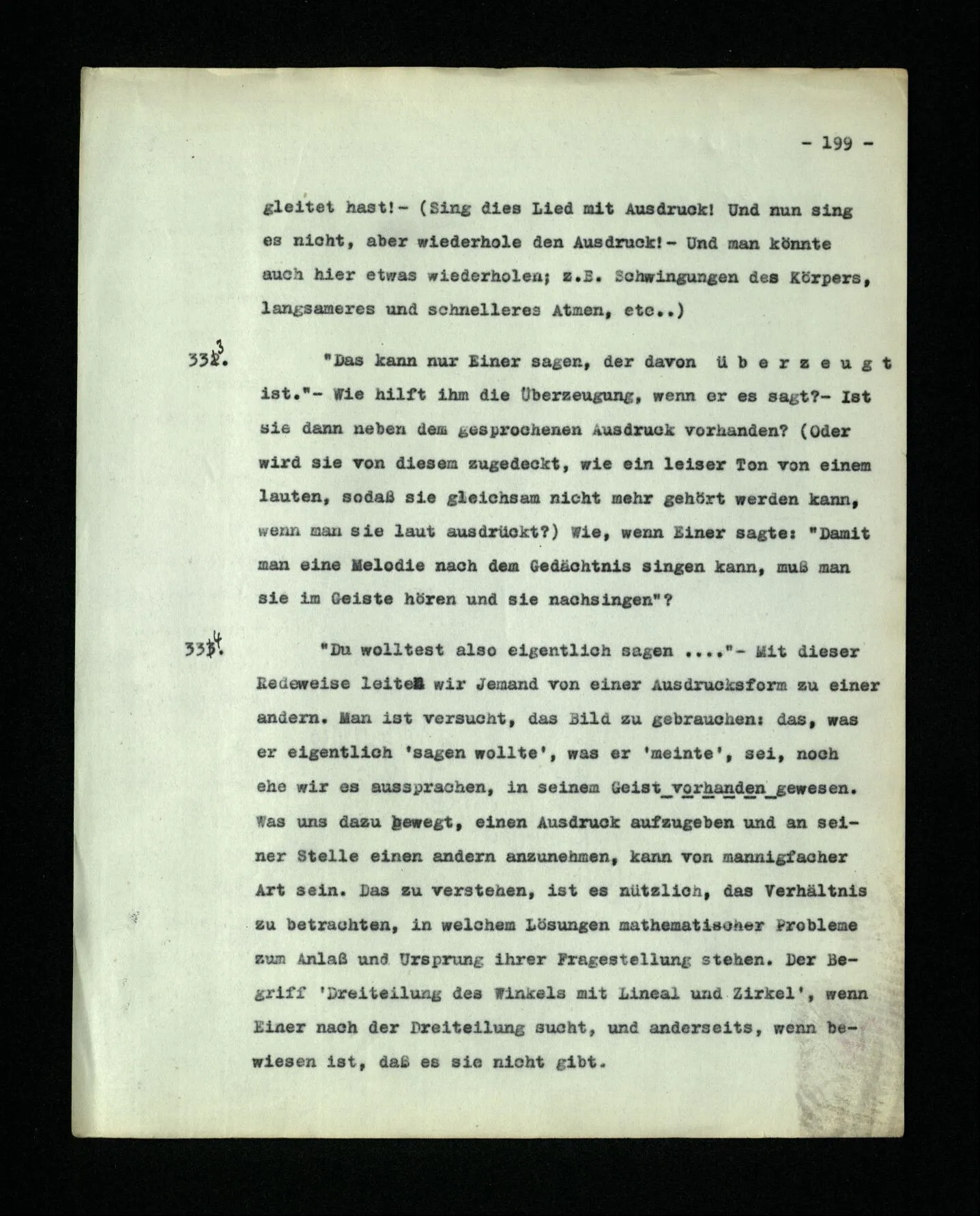 666. Denke, du habest Schmerzen und zugleich hörst du, wie nebenan Klavier gestimmt wird. Du sagst “Es wird bald aufhören.” Es ist doch wohl ein Unterschied, ob du den Schmerz meinst, oder das Klavierstimmen! – Freilich; aber worin besteht dieser Unterschied? Ich gebe zu: es wird in vielen Fällen der Meinung eine Richtung der Aufmerksamkeit entsprechen, sowie auch oft ein Blick, eine Geste, oder ein Schließen der Augen, das man ein “Nach-Innen-Blicken” nennen könnte.