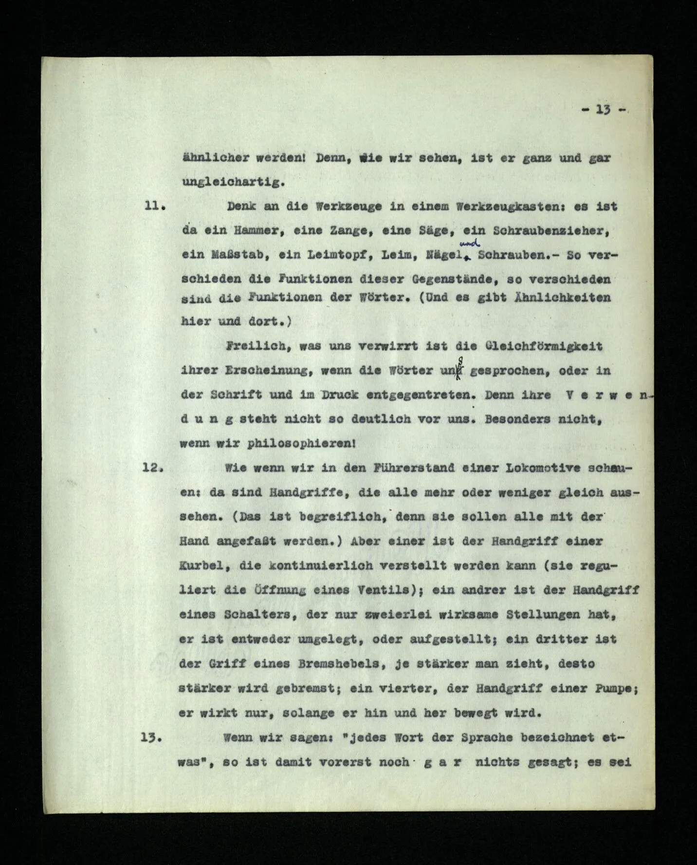 11. Denk an die Werkzeuge in einem Werkzeugkasten: Es ist da ein Hammer, eine Zange, eine Säge, ein Schraubenzieher, ein Maßstab, ein Leimtopf, Leim, Nägel und Schrauben. – So verschieden die Funktionen dieser Gegenstände, so verschieden sind die Funktionen der Wörter. (Und es gibt Ähnlichkeiten hier und dort.) Freilich, was uns verwirrt ist die Gleichförmigkeit ihrer Erscheinung, wenn die Wörter uns gesprochen, oder in der Schrift und im Druck entgegentreten. Denn ihre Verwendung steht nicht so deutlich vor uns. Besonders nicht, wenn wir philosophieren!