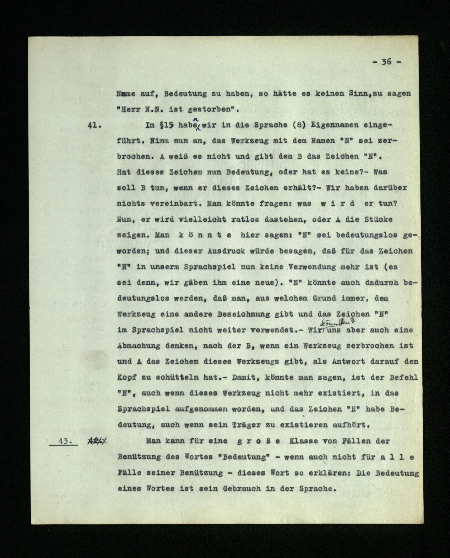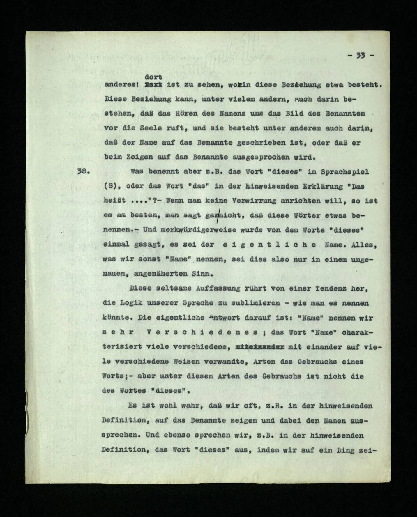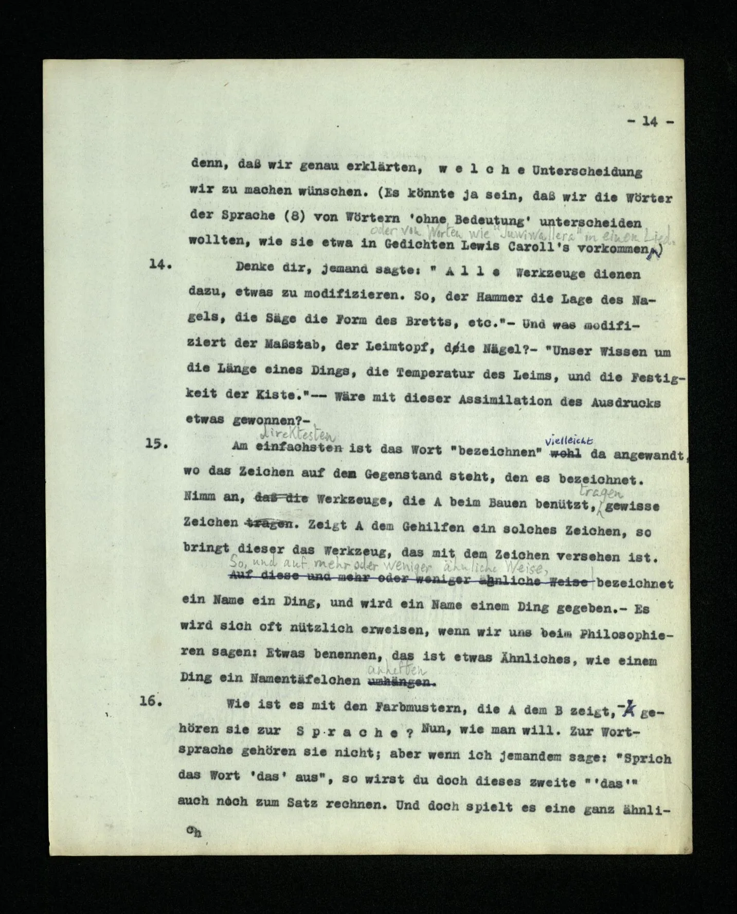 13 Wenn wir sagen: “jedes Wort der Sprache bezeichnet etwas”, so ist damit vorerst noch gar nichts gesagt; es sei denn, daß wir genau erklärten, welche Unterscheidung wir zu machen wünschen. (Es könnte ja sein, daß wir die Wörter der Sprache (8) von Wörtern ‘ohne Bedeutung’ unterscheiden wollten, wie sie etwa in Gedichten Lewis Carroll’s vorkommen, oder von Worten wie “juwiwallera” in einem Lied.)