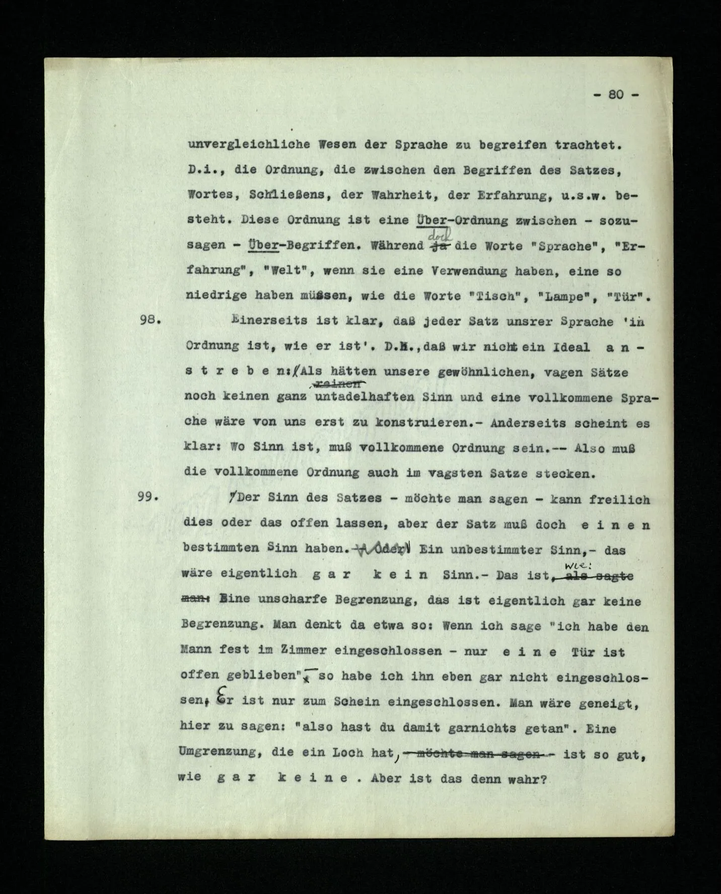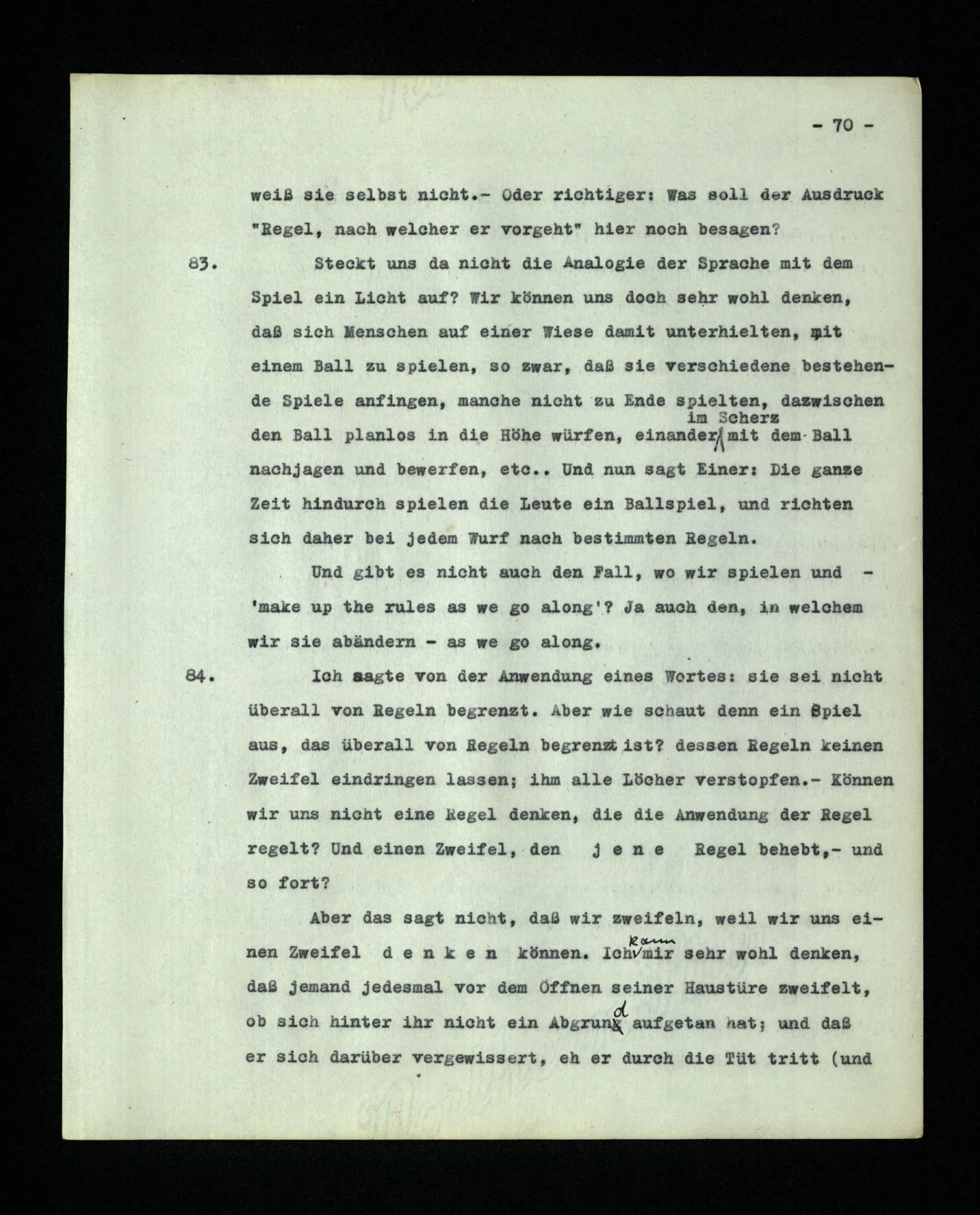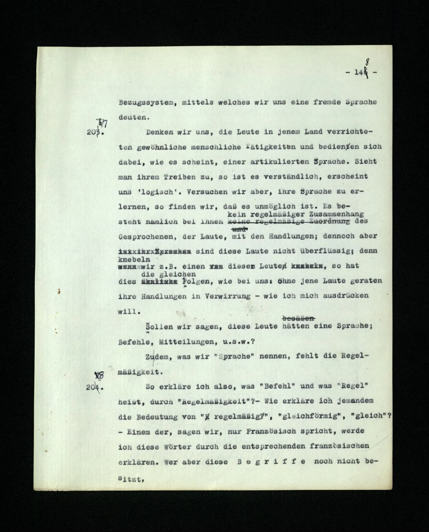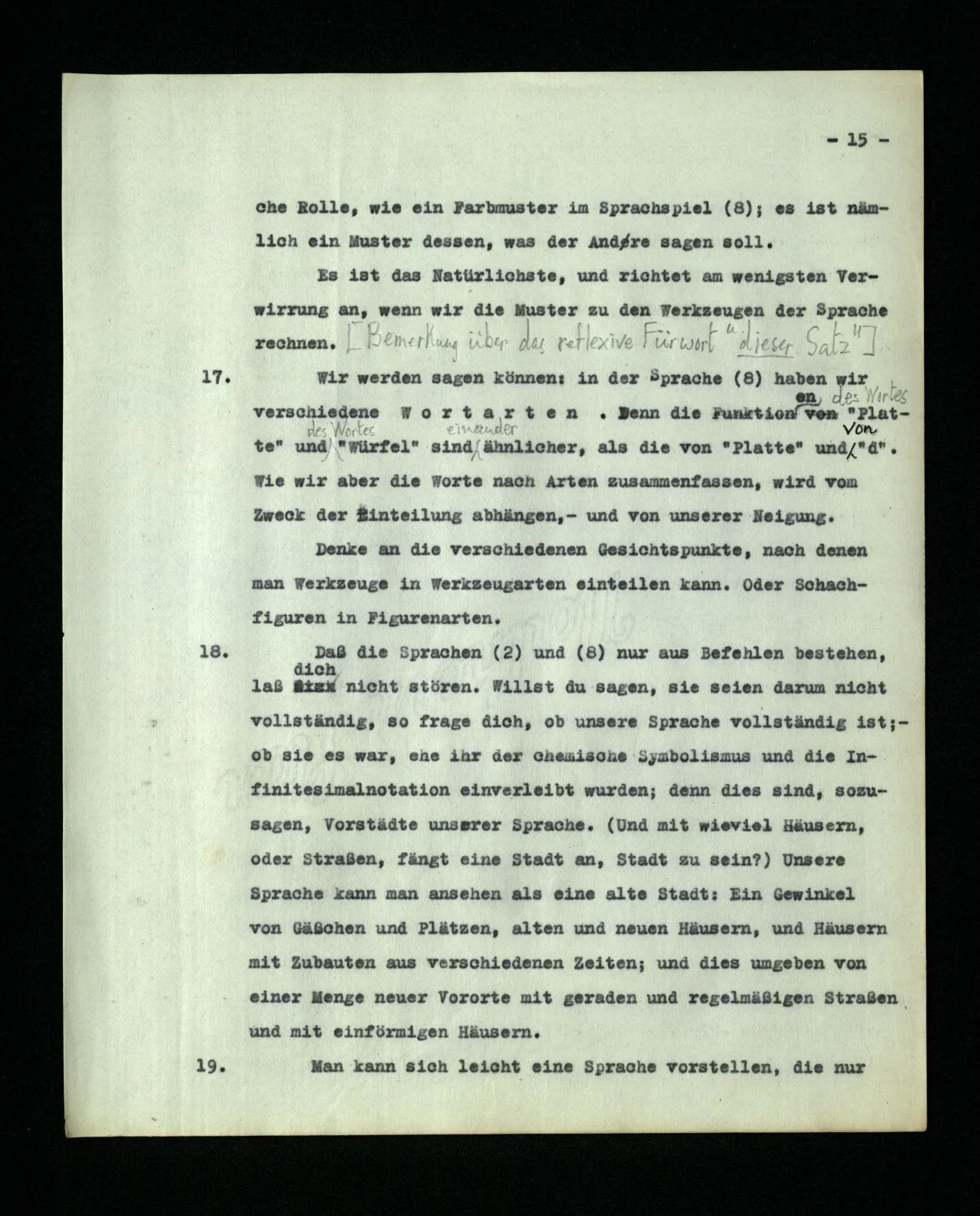 18. Daß die Sprachen (2) und (8) nur aus Befehlen bestehen, laß dich nicht stören. Willst du sagen sie seien darum nicht vollständig, so frage dich, ob unsere Sprache vollständig ist; – ob sie es war, ehe ihr der chemische Symbolismus und die Infinitesimalnotation einverleibt wurden; denn dies sind, sozusagen, Vorstädte unserer Sprache. (Und mit wieviel Häusern, oder Straßen, fängt eine Stadt an, Stadt zu sein?) Unsere Sprache kann man ansehen als eine alte Stadt: Ein Gewinkel von Gäßchen und Plätzen, alten und neuen Häusern, und Häusern mit Zubauten aus verschiedenen Zeiten; und dies umgeben von einer Menge neuer Vororte mit geraden und regelmäßigen Straßen und mit einförmigen Häusern.