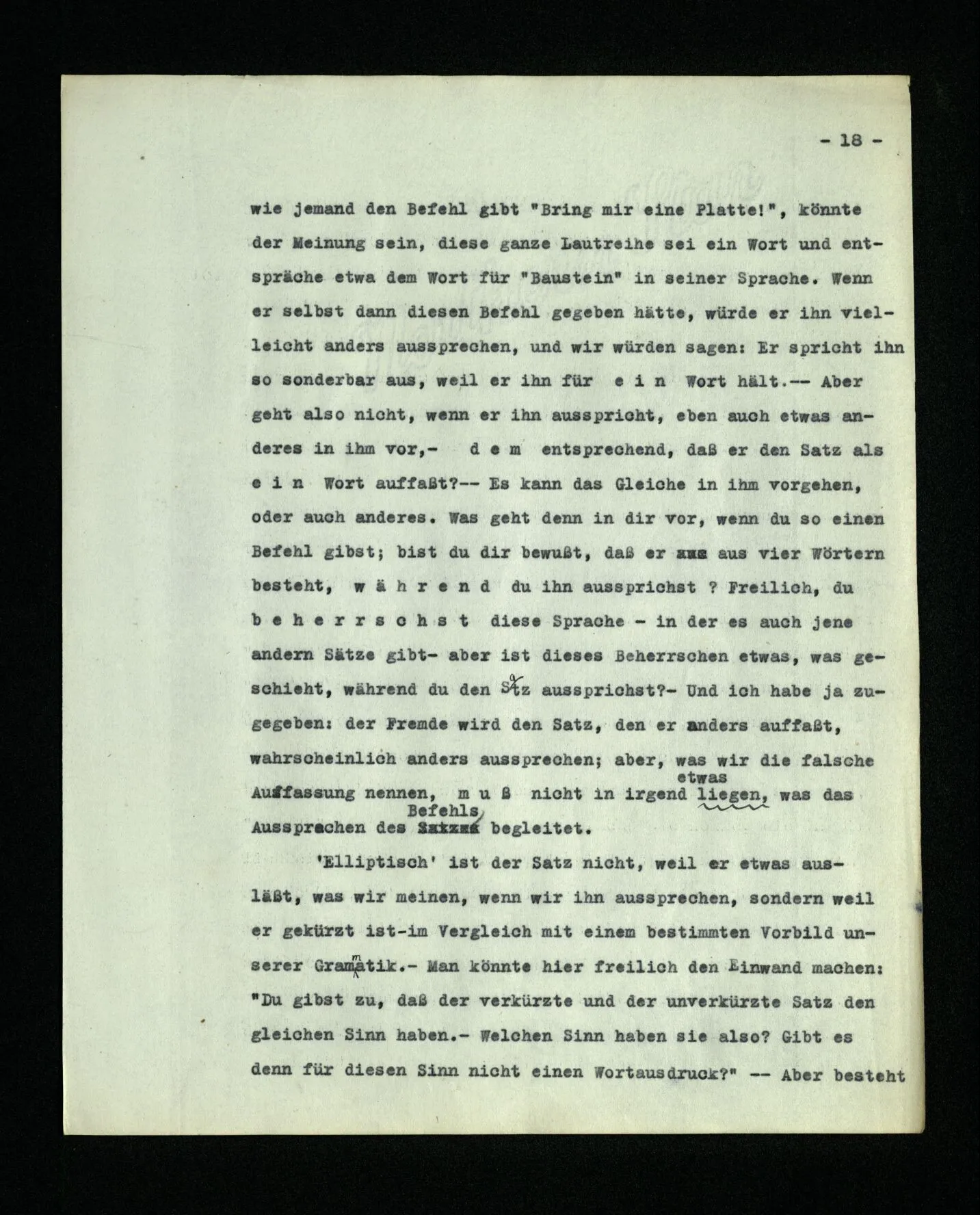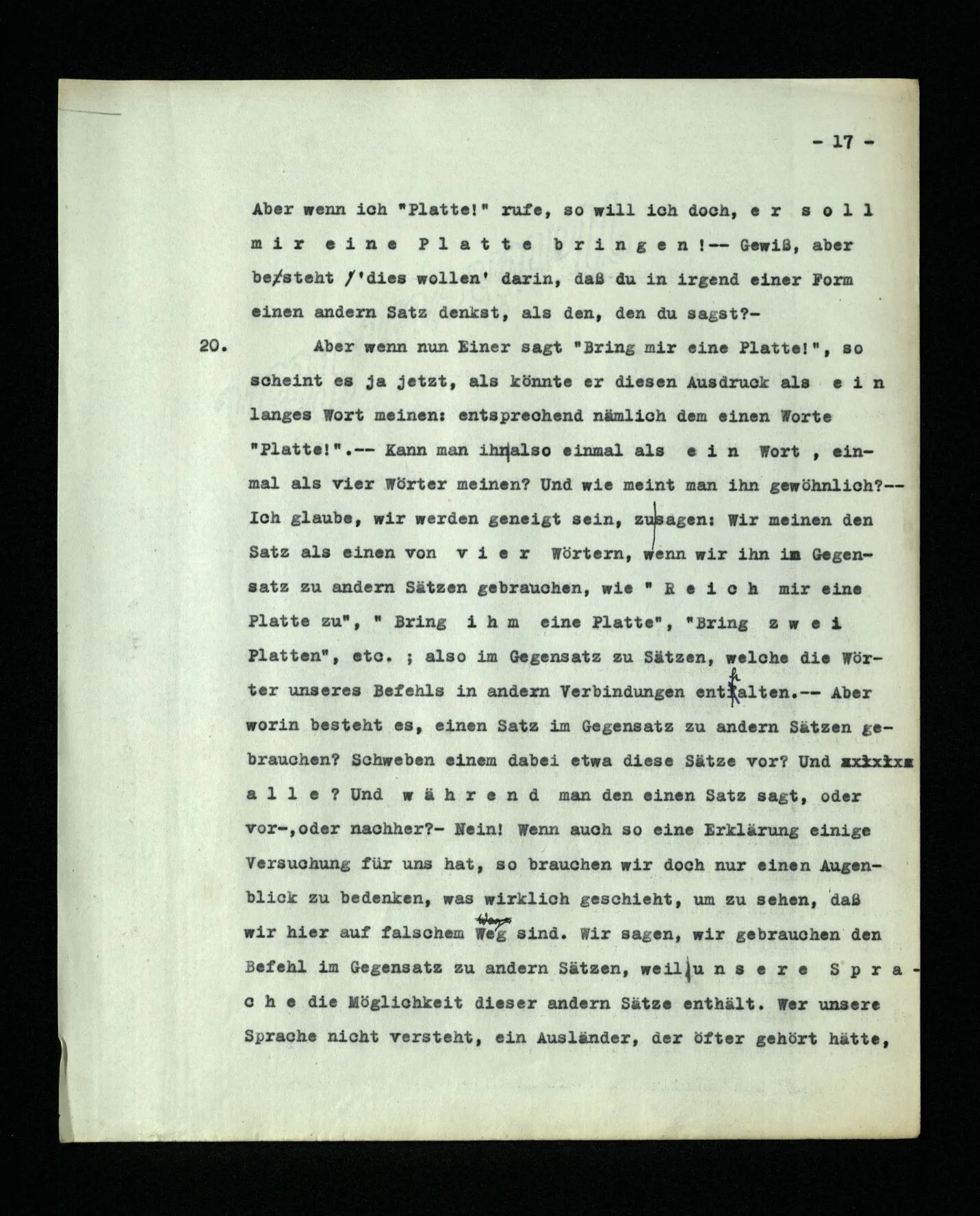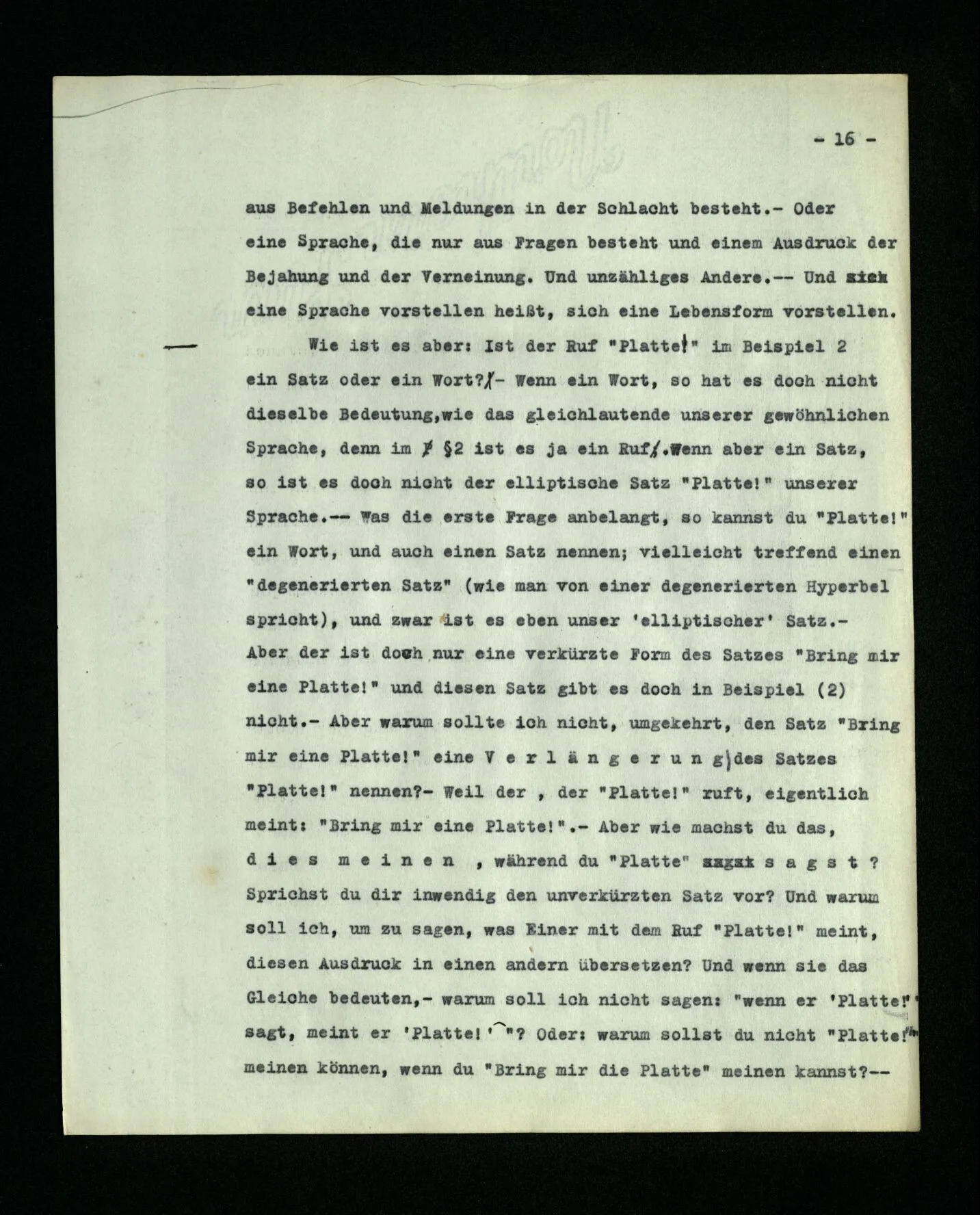 19. Man kann sich leicht eine Sprache vorstellen, die nur aus Befehlen und Meldungen in der Schlacht besteht. – Oder eine Sprache, die nur aus Fragen besteht und einem Ausdruck der Bejahung und der Verneinung. Und unzähliges Andre. – Und eine Sprache vorstellen heißt, sich eine Lebensform vorstellen. Wie ist es aber: Ist der Ruf “Platte!” im Beispiel (2) ein Satz oder ein Wort? – Wenn ein Wort, so hat es doch nicht dieselbe Bedeutung, wie das gleichlautende unserer gewöhnlichen Sprache, denn im § 2 ist es ja ein Ruf. Wenn aber ein Satz, so ist es doch nicht der elliptische Satz “Platte!” unserer Sprache. ‒ ‒ Was die erste Frage anbelangt, so kannst du “Platte!” ein Wort, und auch einen Satz nennen; vielleicht treffend einen “degenerierten Satz” (wie man von einer degenerierten Hyperbel spricht), und zwar ist es eben unser ‘elliptischer’ Satz. – Aber der ist doch nur eine verkürzte Form des Satzes “Bring mir eine Platte!” und diesen Satz gibt es doch im Beispiel (2) nicht. – Aber warum sollte ich nicht, umgekehrt, den Satz “Bring mir eine Platte!” eine Verlängerung des Satzes “Platte!” nennen? – Aber warum sollte ich nicht, umgekehrt, den Satz “Bring mir eine Platte!” eine Verlängerung des Satzes “Platte!” nennen? – Weil der, der “Platte!” ruft, eigentlich meint: “Bring mir eine Platte!”. – Aber wie machst du das, dies meinen, während du “Platte” sagst? Sprichst du dir inwendig den unverkürzten Satz vor? Und warum soll ich, um zu sagen, was Einer mit dem Ruf “Platte!” meint, diesen Ausdruck in einen andern übersetzen? Und wenn sie das Gleiche bedeuten,– warum soll ich nicht sagen: “wenn er ‘Platte!’ sagt, meint er ‘Platte!’”? Oder: warum sollst du nicht “Platte!” meinen können, wenn du “Bring mir die Platte!” meinen kannst? ‒ ‒ Aber wenn ich “Platte!” rufe, so will ich doch, er soll mir eine Platte bringen! ‒ ‒ Gewiß,– aber besteht ‘dies wollen’ darin, daß du in irgend einer Form einen andern Satz denkst, als den, den du sagst? –