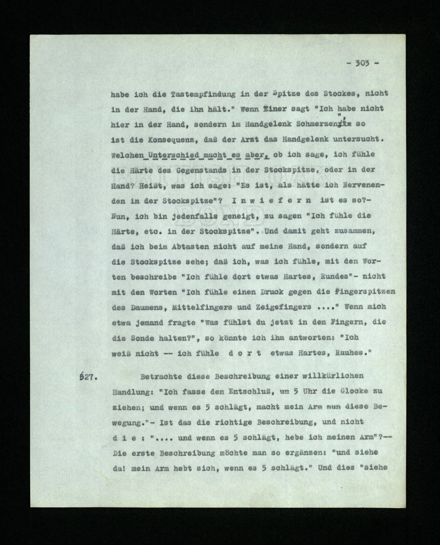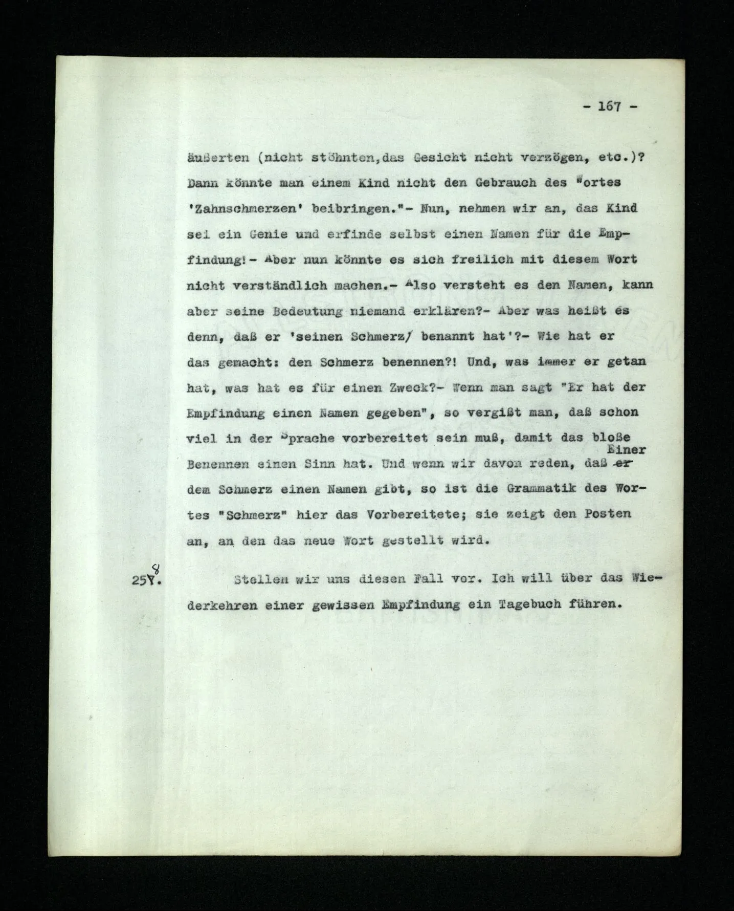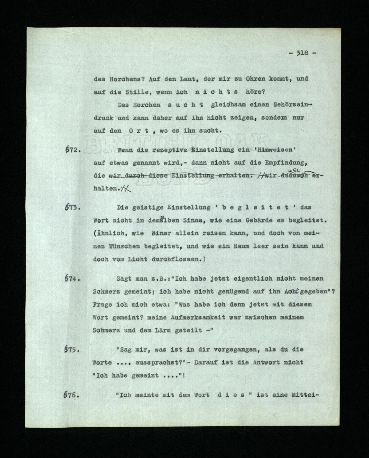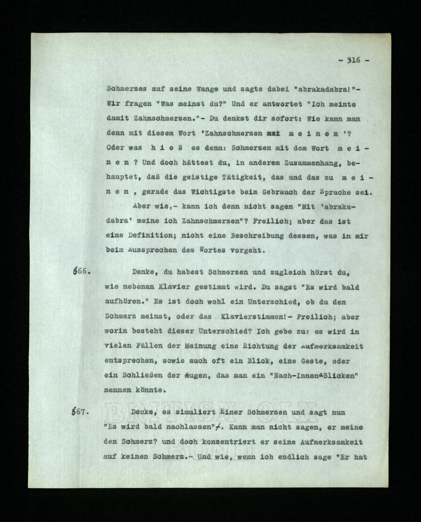 674. Sagt man z.B.: “Ich habe jetzt eigentlich nicht meinen Schmerz gemeint; ich habe nicht genügend auf ihn Acht gegeben” Frage ich mich etwa: “Was habe ich denn jetzt mit diesem Wort gemeint? meine Aufmerksamkeit war zwischen meinem Schmerz und dem Lärm geteilt–”.