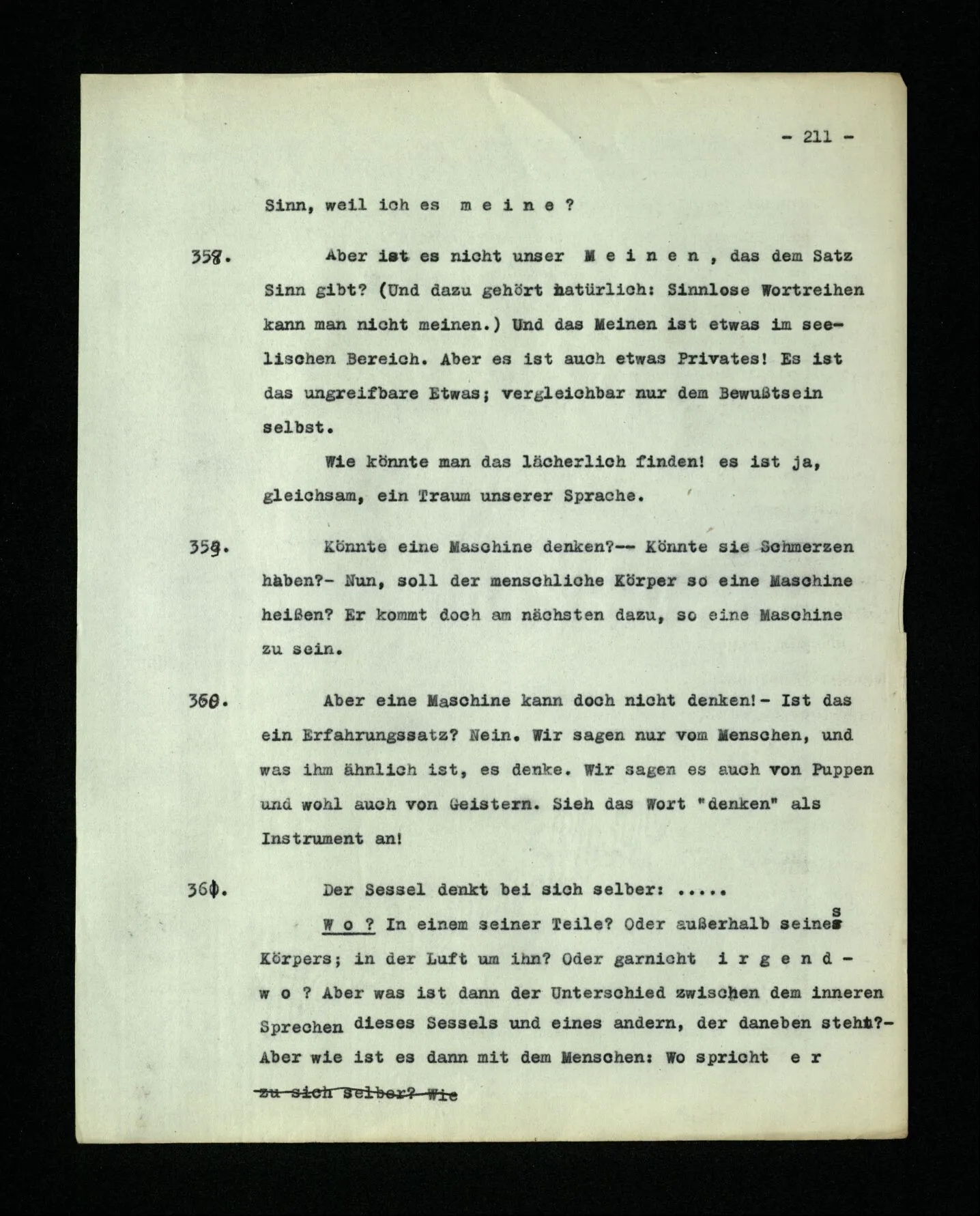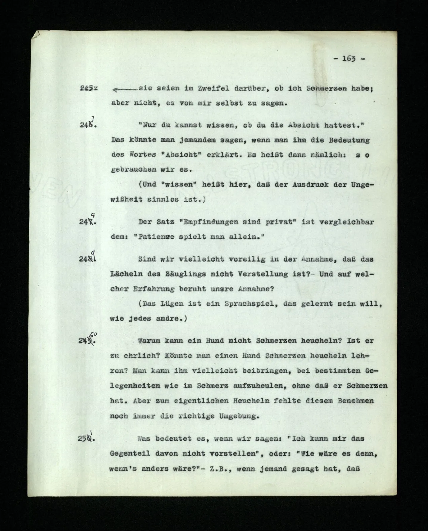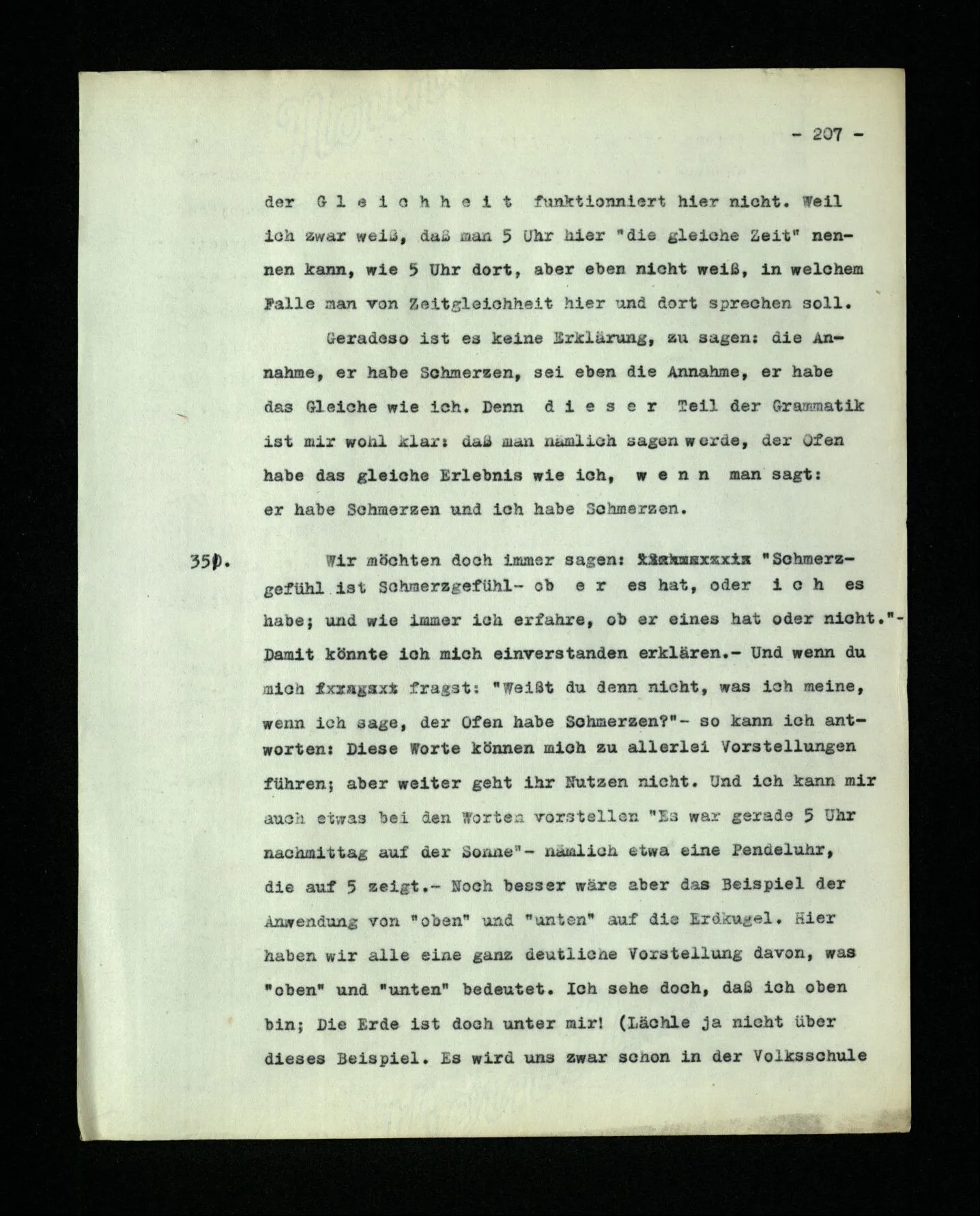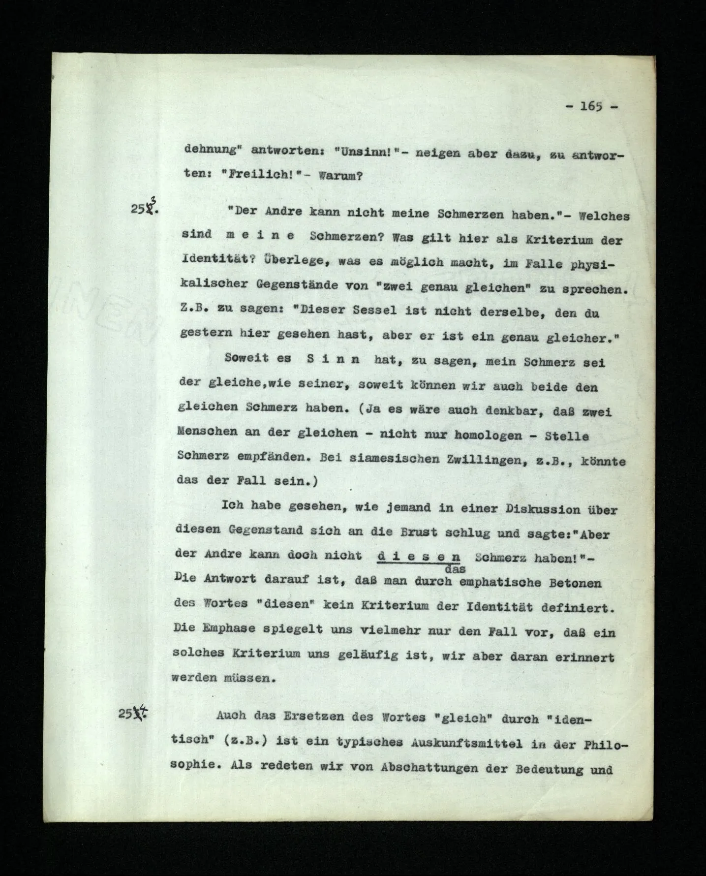 674. Sagt man z.B.: “Ich habe jetzt eigentlich nicht meinen Schmerz gemeint; ich habe nicht genügend auf ihn Acht gegeben” Frage ich mich etwa: “Was habe ich denn jetzt mit diesem Wort gemeint? meine Aufmerksamkeit war zwischen meinem Schmerz und dem Lärm geteilt–”.
