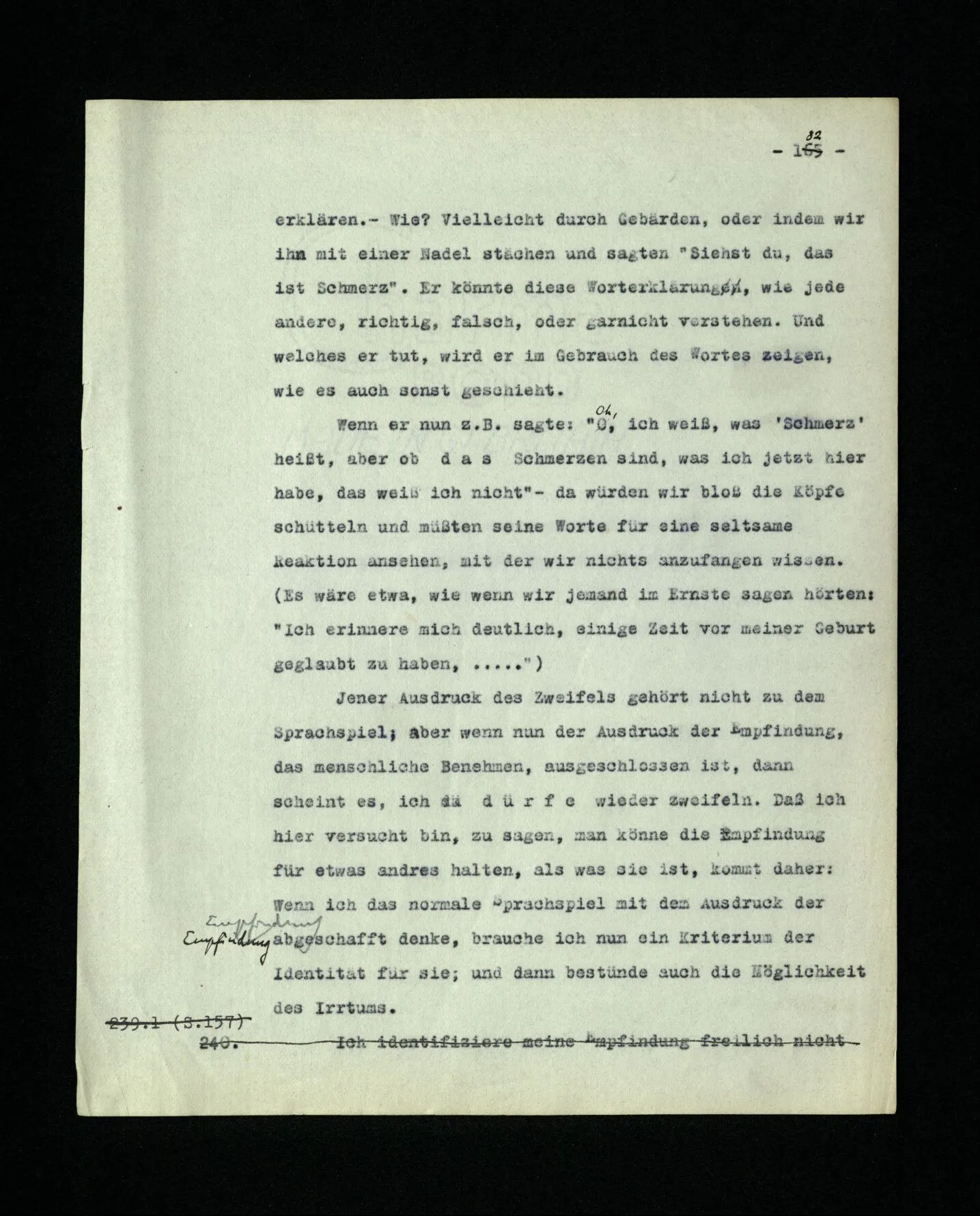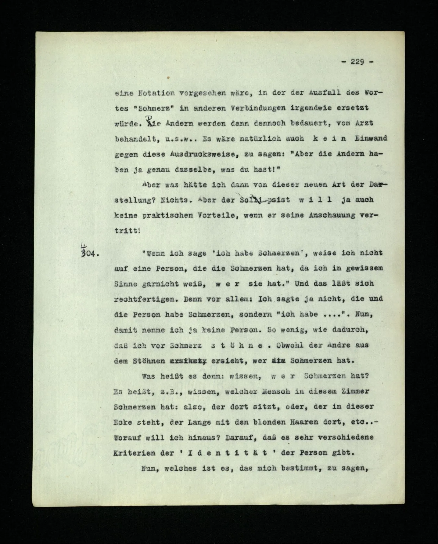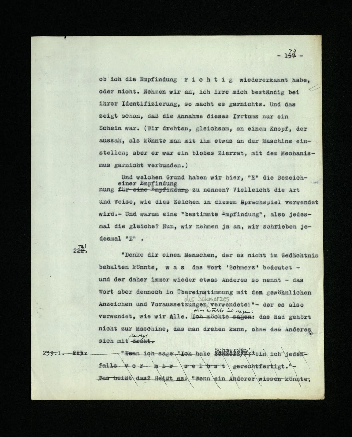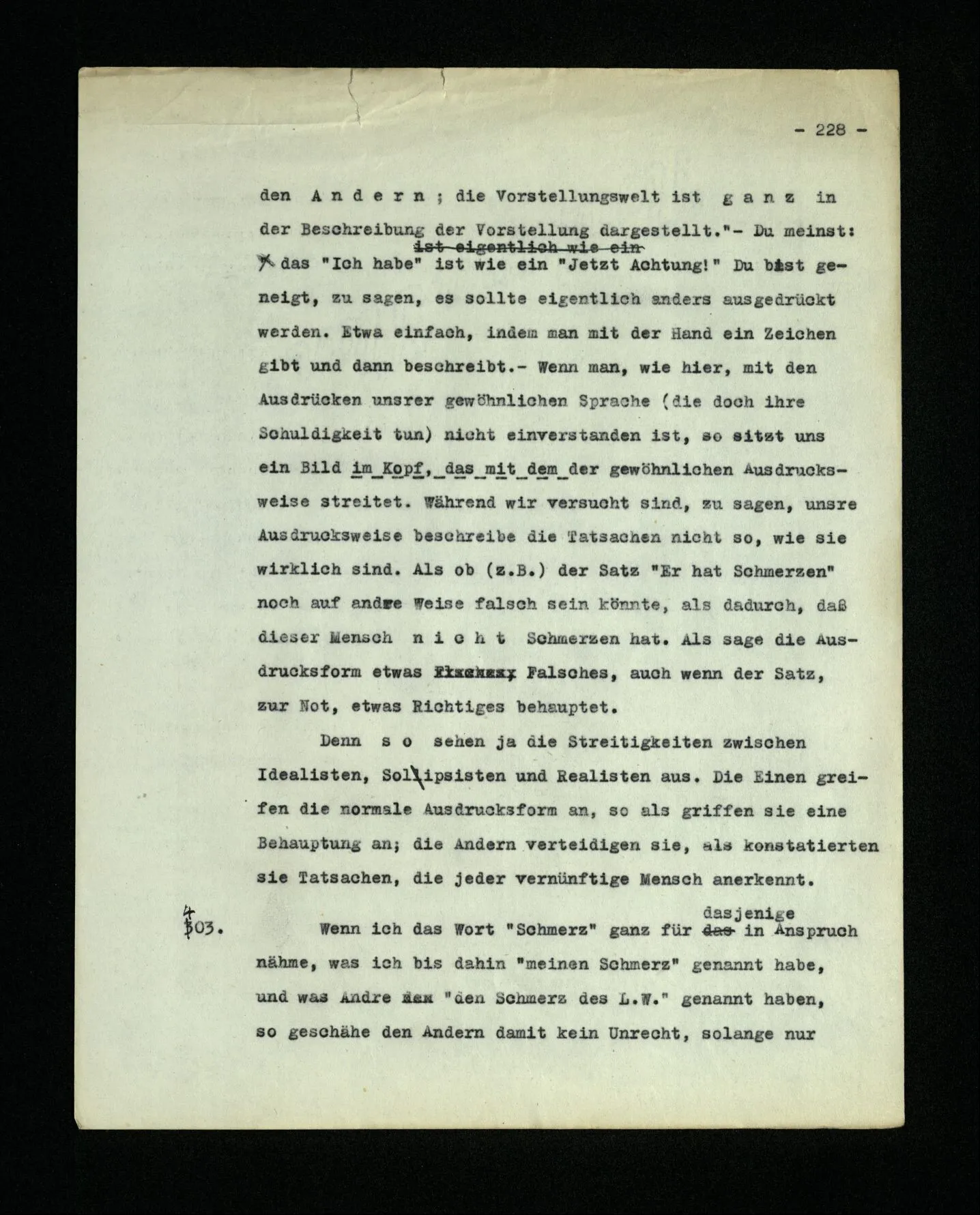 674. Sagt man z.B.: “Ich habe jetzt eigentlich nicht meinen Schmerz gemeint; ich habe nicht genügend auf ihn Acht gegeben” Frage ich mich etwa: “Was habe ich denn jetzt mit diesem Wort gemeint? meine Aufmerksamkeit war zwischen meinem Schmerz und dem Lärm geteilt–”.