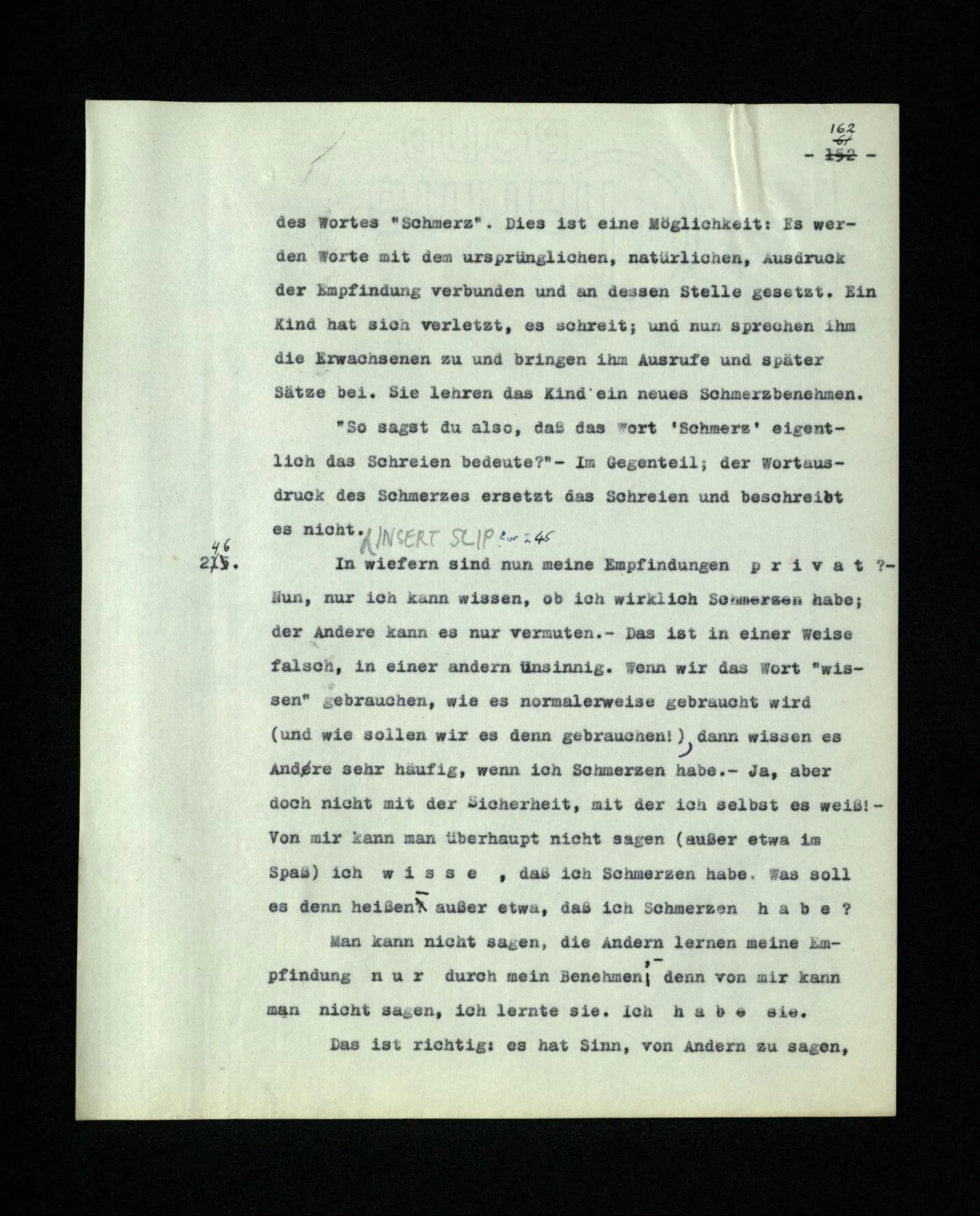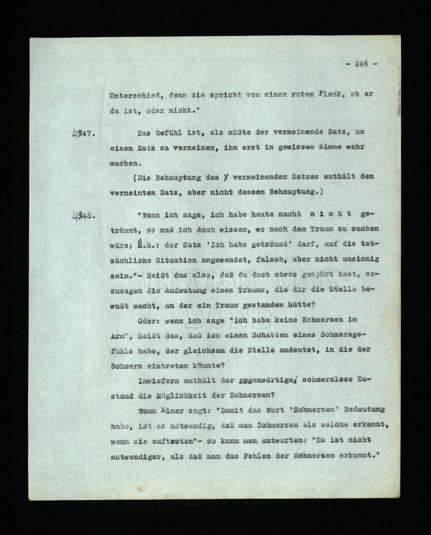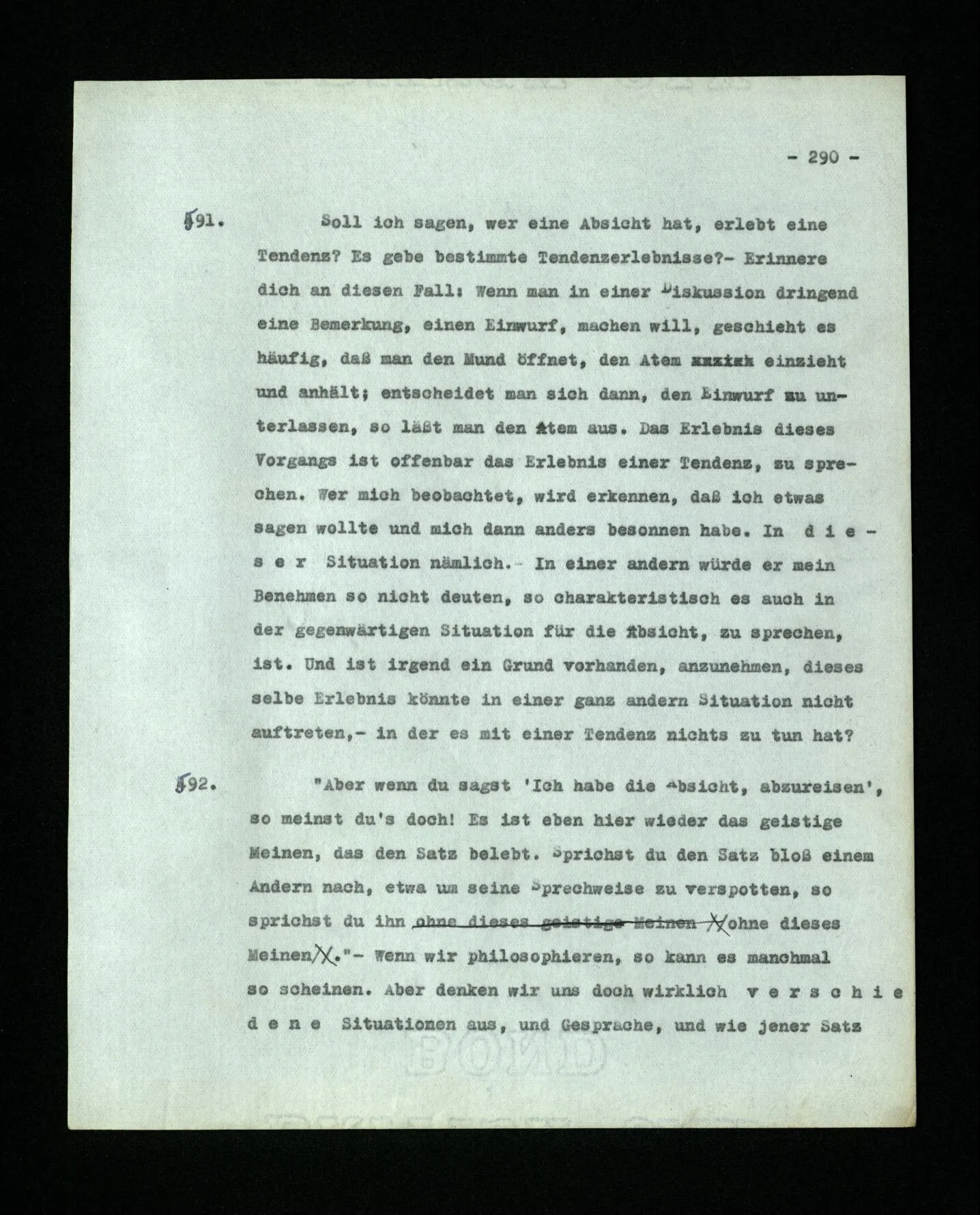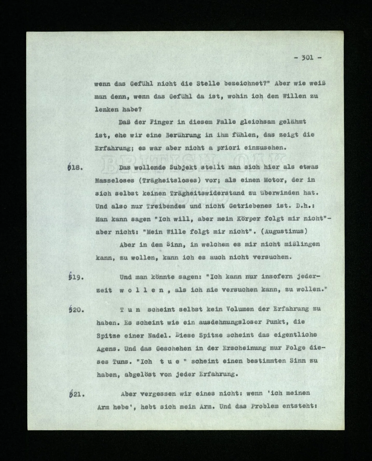 674. Sagt man z.B.: “Ich habe jetzt eigentlich nicht meinen Schmerz gemeint; ich habe nicht genügend auf ihn Acht gegeben” Frage ich mich etwa: “Was habe ich denn jetzt mit diesem Wort gemeint? meine Aufmerksamkeit war zwischen meinem Schmerz und dem Lärm geteilt–”.