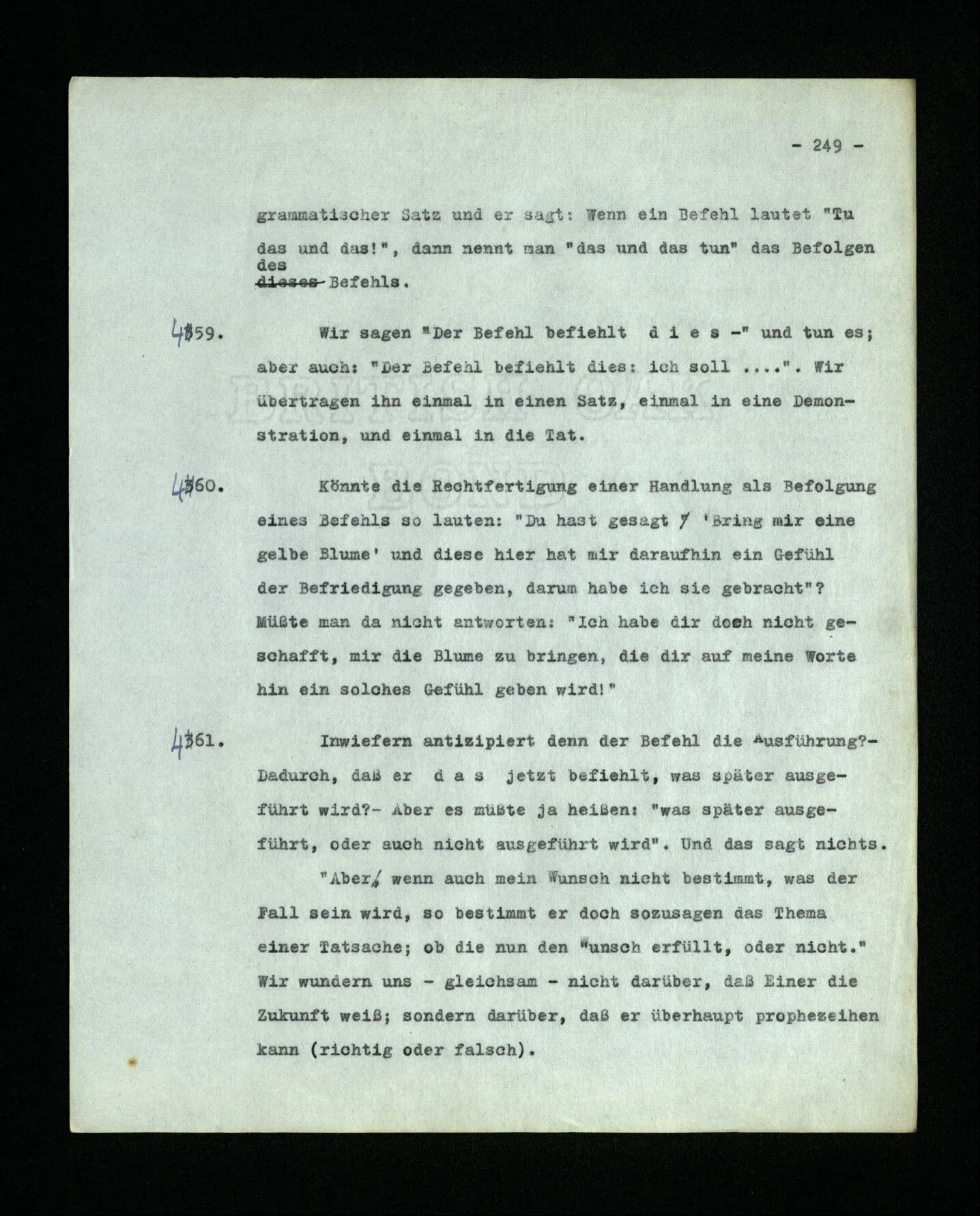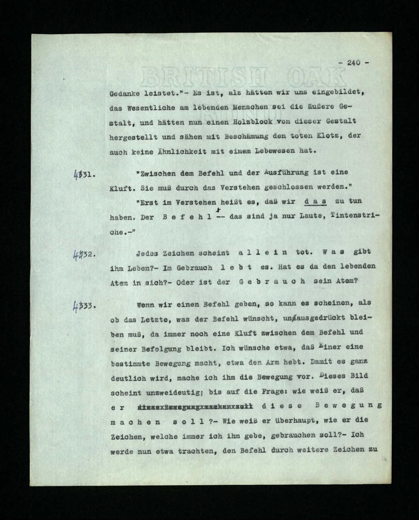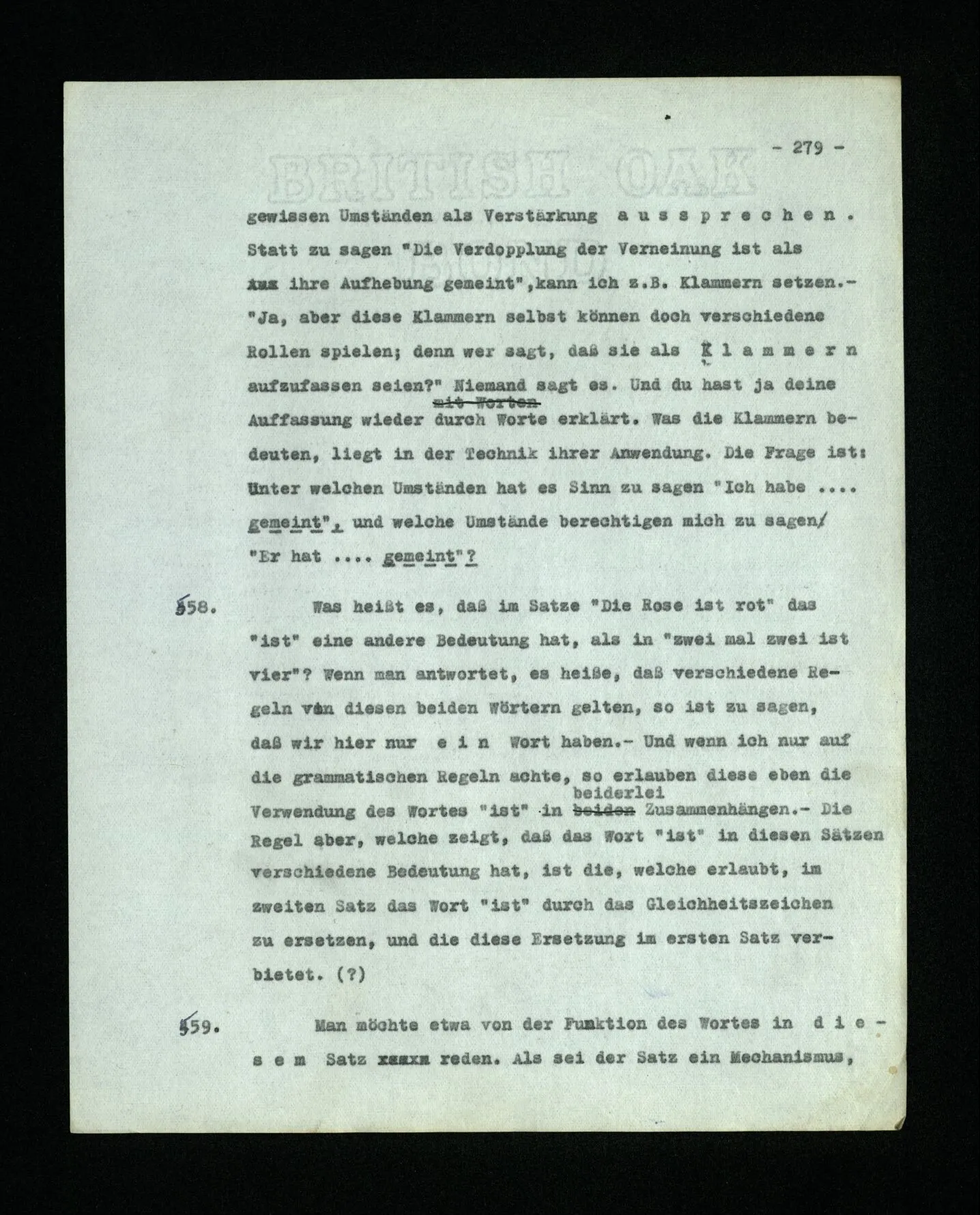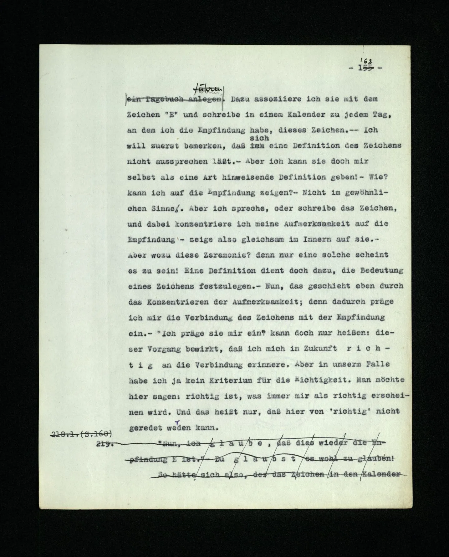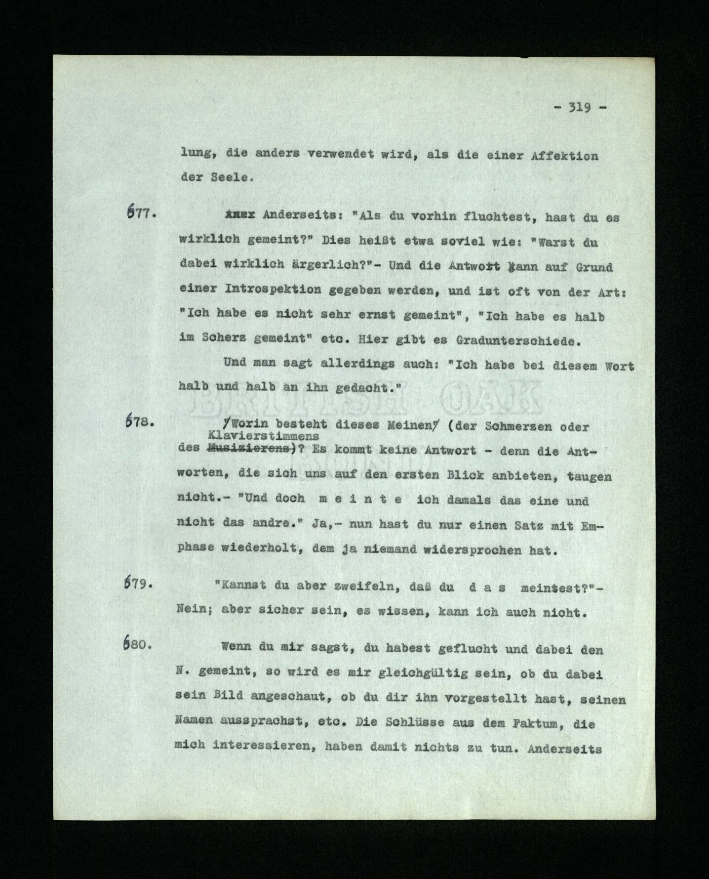 678. Worin besteht dieses Meinen (der Schmerzen oder des Klavierstimmens)? Es kommt keine Antwort – denn die Antworten, die sich uns auf den ersten Blick anbieten, taugen nicht. – “Und doch meinte ich damals das eine und nicht das andre.” Ja,– nun hast du nur einen Satz mit Emphase wiederholt, dem ja niemand widersprochen hat.