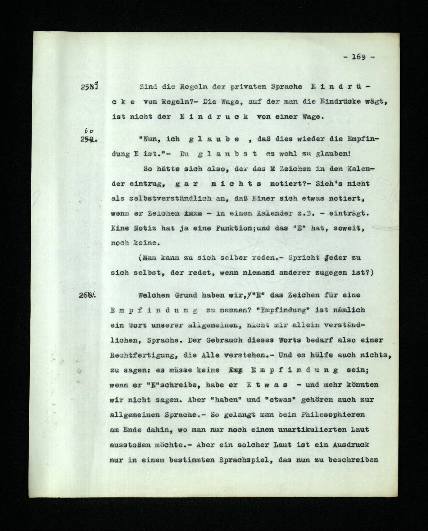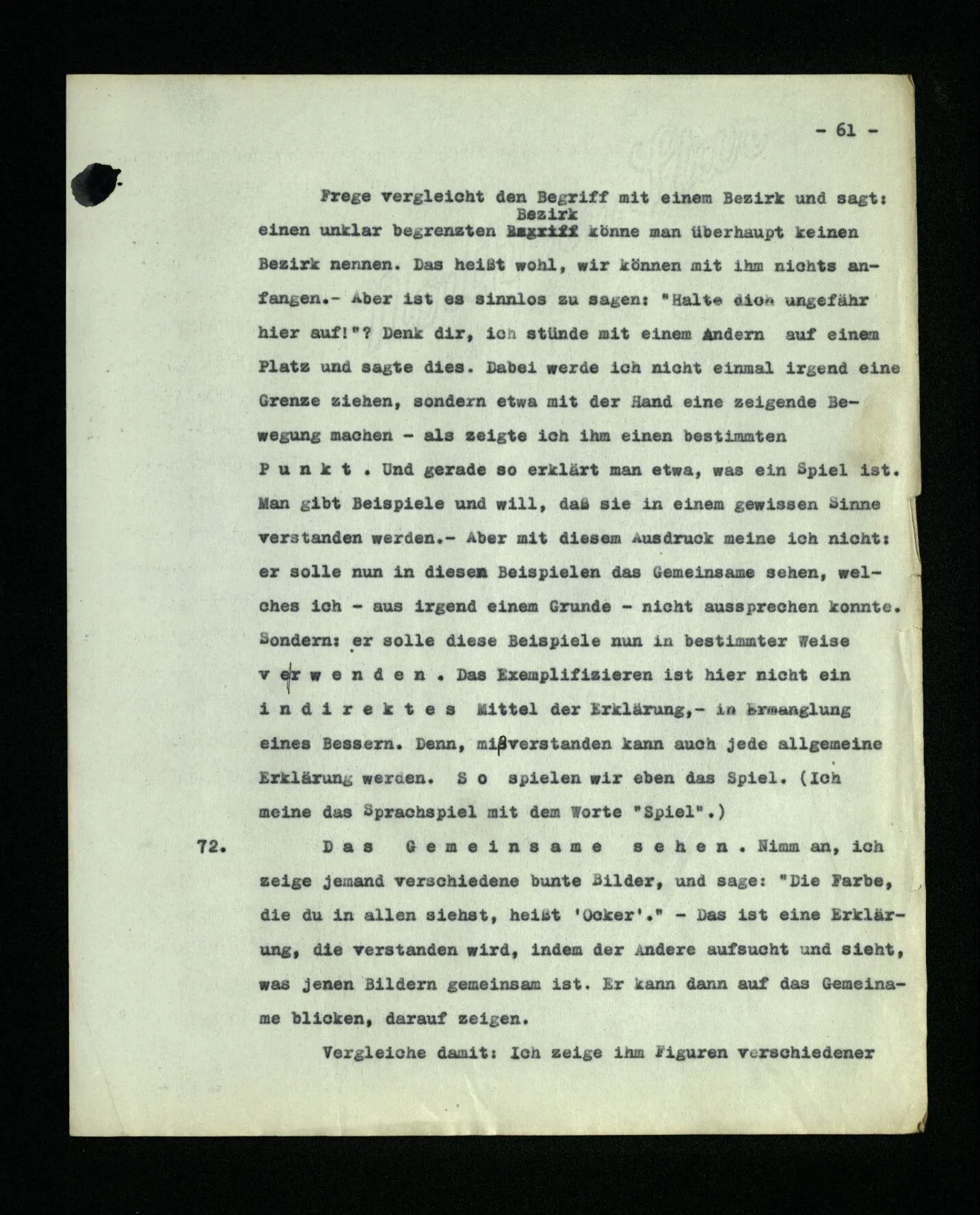 669. Man kann sich beim Sprechen auf einen Gegenstand beziehen, indem man auf ihn zeigt. Das Zeigen ist hier ein Teil des Sprachspiels. Und nun kommt es uns vor, als spreche man von einer Empfindung dadurch, daß man seine Aufmerksamkeit beim Sprechen auf sie richtet. Aber wo ist die Analogie? Sie liegt offenbar darin, daß man durch Schauen und Horchen auf etwas zeigen kann. Aber auch auf den Gegenstand zeigen, von dem man spricht, kann ja für das Sprachspiel, für den Gedanken, unter Umständen ganz unwesentlich sein.