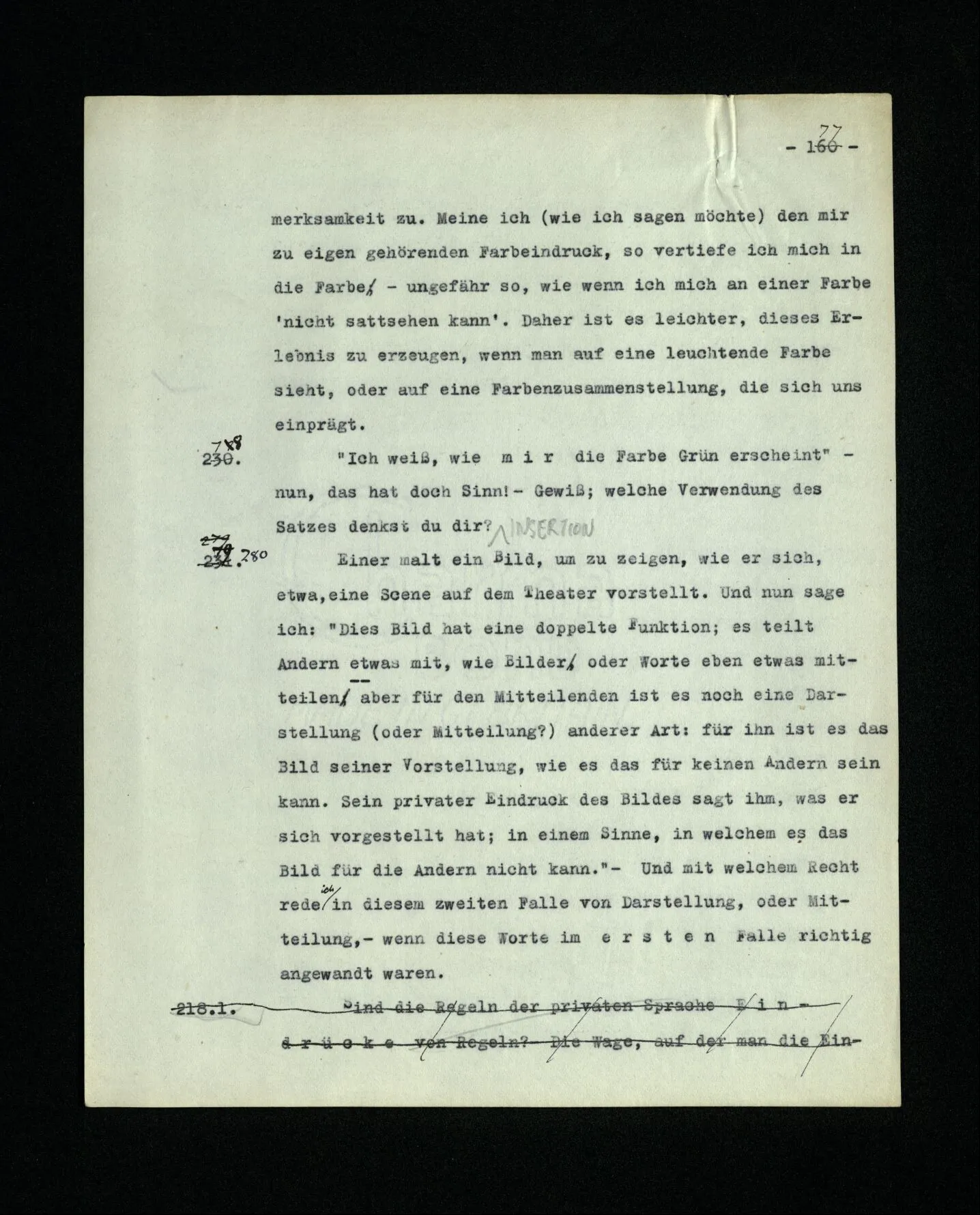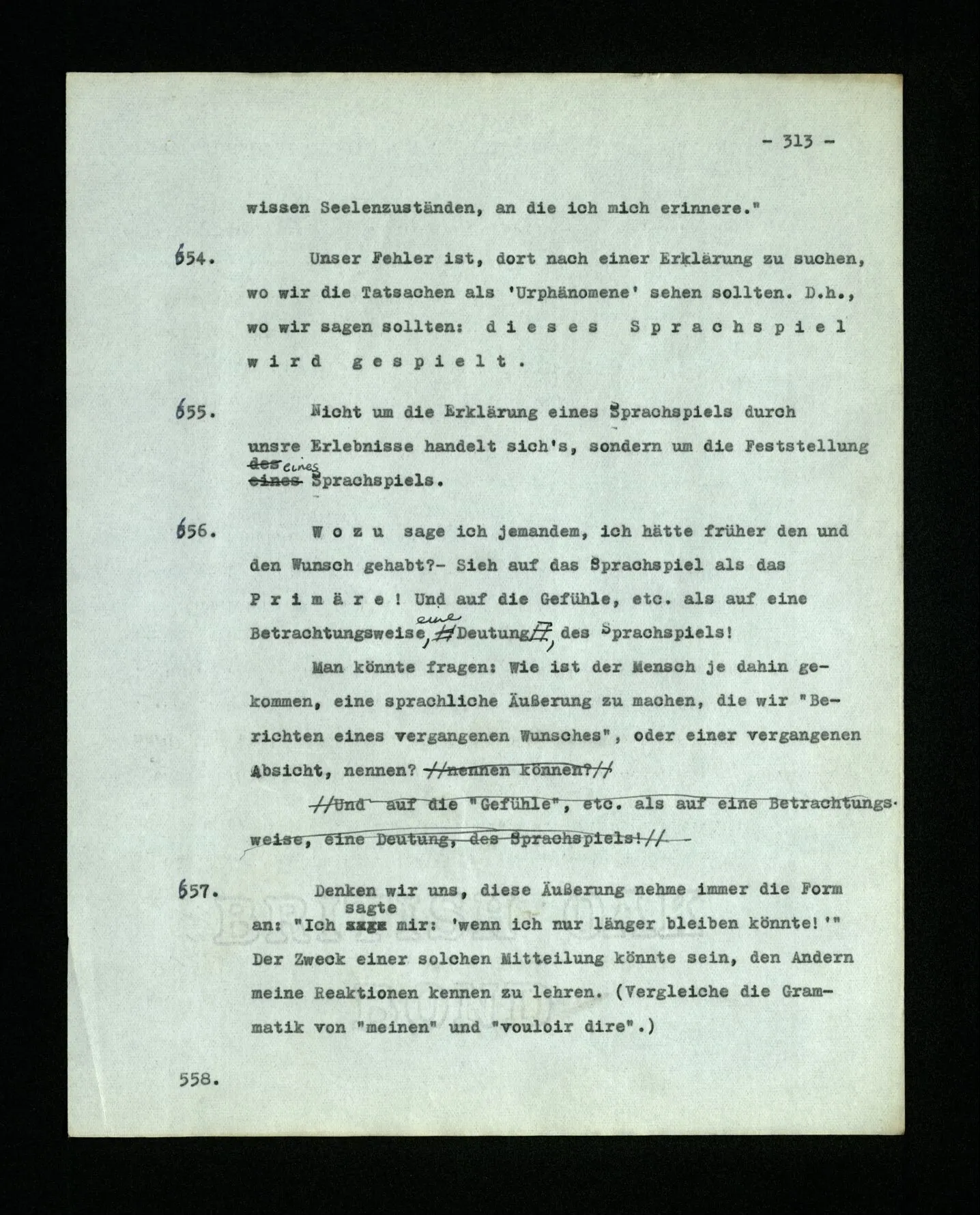 656. Wozu sage ich jemandem, ich hätte früher den und den Wunsch gehabt? – Sieh auf das Sprachspiel als das Primäre! Und auf die Gefühle, etc. als auf eine Betrachtungsweise, Deutung, des Sprachspiels! Man könnte fragen: Wie ist der Mensch je dahin gekommen, eine sprachliche Äußerung zu machen, die wir “Berichten eines vergangenen Wunsches”, oder einer vergangenen Absicht, nennen?