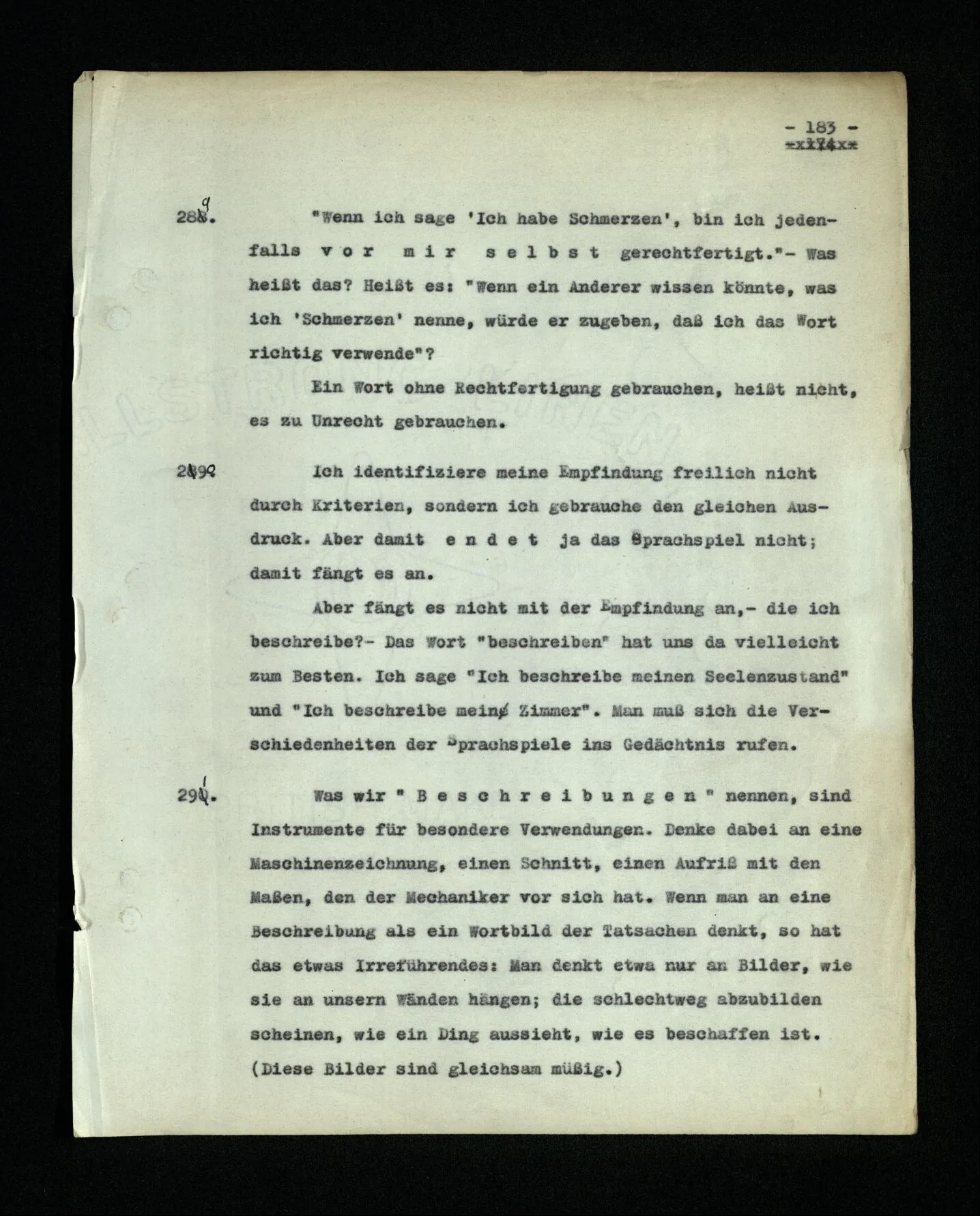 665. Denke, jemand zeigte mit dem Gesichtsausdruck des Schmerzes auf seine Wange und sagte dabei “abrakadabra!” – Wir fragen “Was meinst du?” Und er antwortet “Ich meinte damit Zahnschmerzen.” – Du denkst dir sofort: Wie kann man denn mit diesem Wort ‘Zahnschmerzen meinen’? Oder was hieß es denn: Schmerzen mit dem Wort meinen? Und doch hättest du, in anderem Zusammenhang, behauptet, daß die geistige Tätigkeit, das und das zu meinen, gerade das Wichtigste beim Gebrauch der Sprache sei. Aber wie,– kann ich denn nicht sagen “Mit ‘abrakadabra’ meine ich Zahnschmerzen”? Freilich; aber das ist eine Definition; nicht eine Beschreibung dessen, was in mir beim Aussprechen des Wortes vorgeht.