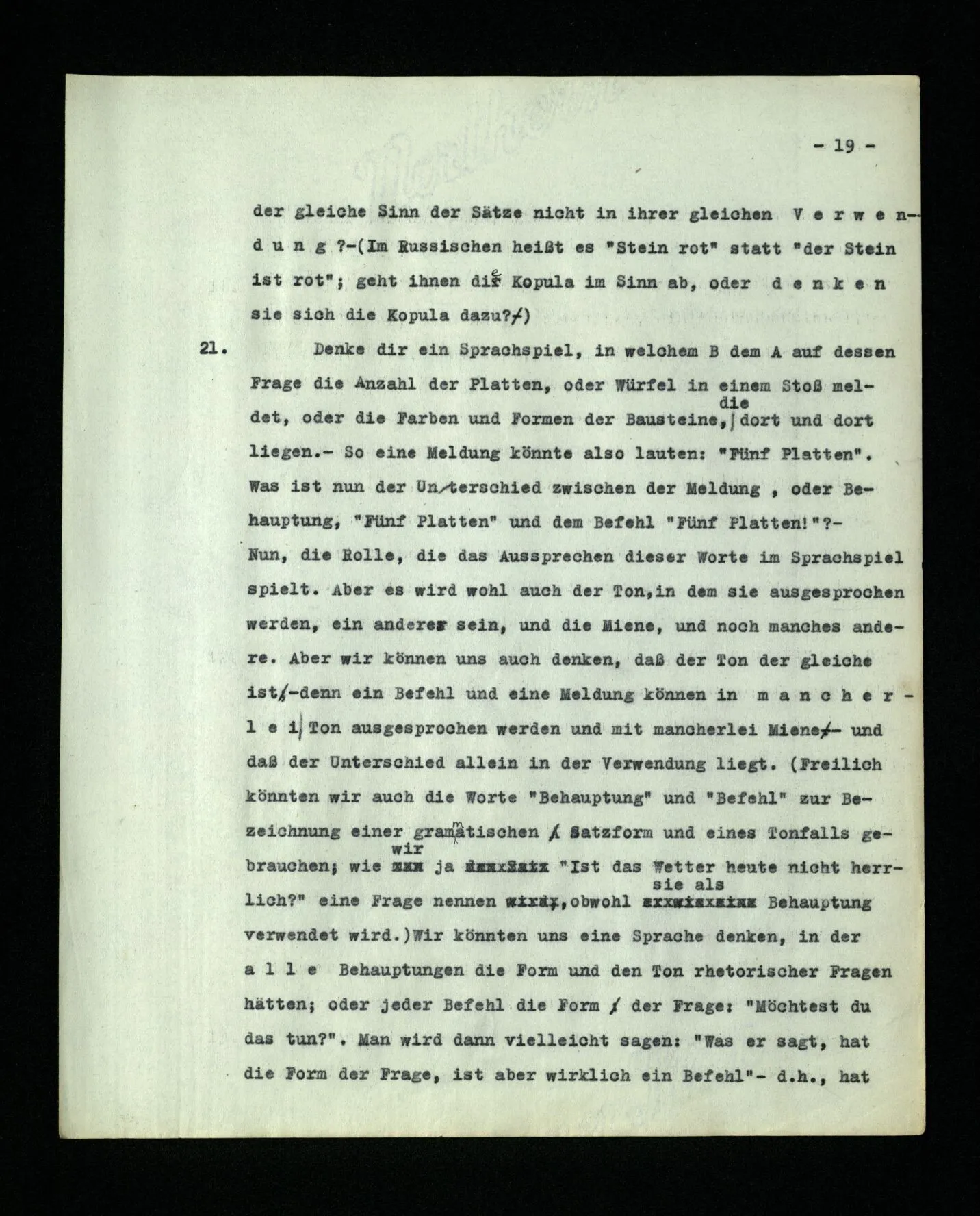 21. Denk dir ein Sprachspiel, in welchem B dem A auf dessen Frage die Anzahl der Platten oder Würfel in einem Stoß meldet, oder die Farben und Formen der Bausteine, die dort und dort liegen. – So eine Meldung könnte also lauten: “Fünf Platten”. Was ist nun der Unterschied zwischen der Meldung, oder Behauptung, “fünf Platten” und dem Befehl “fünf Platten!”? – Nun, die Rolle, die das Aussprechen dieser Worte im Sprachspiel spielt. Aber es wird wohl auch der Ton, in dem sie ausgesprochen werden, ein anderer sein, und die Miene, und noch manches andere. Aber wir können uns auch denken, daß der Ton der gleiche ist– denn ein Befehl und eine Meldung können in mancherlei Ton ausgesprochen werden und mit mancherlei Miene – und daß der Unterschied allein in der Verwendung liegt. (Freilich könnten wir auch die Worte “Behauptung” und “Befehl” zur Bezeichnung einer grammatischen Satzform und eines Tonfalls gebrauchen, wie wir ja “Ist das Wetter heute nicht herrlich?” eine Frage nennen, obwohl sie als Behauptung verwendet wird.) Wir könnten uns eine Sprache denken, in der alle Behauptungen die Form und den Ton rhetorischer Fragen hätten; oder jeder Befehl die Form der Frage: “Möchtest du das tun?”. Man wird dann vielleicht sagen: “Was er sagt, hat die Form der Frage, ist aber wirklich ein Befehl”‒ ‒d.h., hat die Funktion des Befehls in der Praxis der Sprache. (Ähnlich sagt man “Du wirst das tun”, nicht als Prophezeiung, sondern als Befehl. Was macht es zu dem einen, was zu dem andern?)