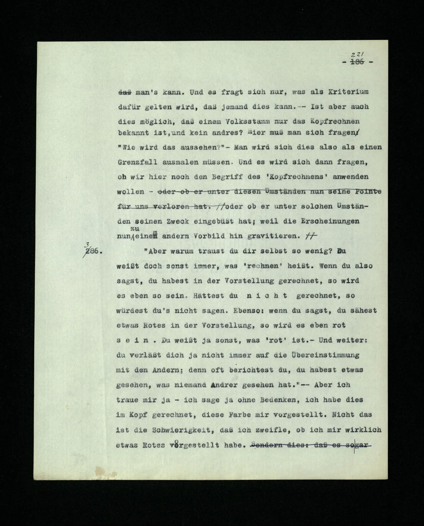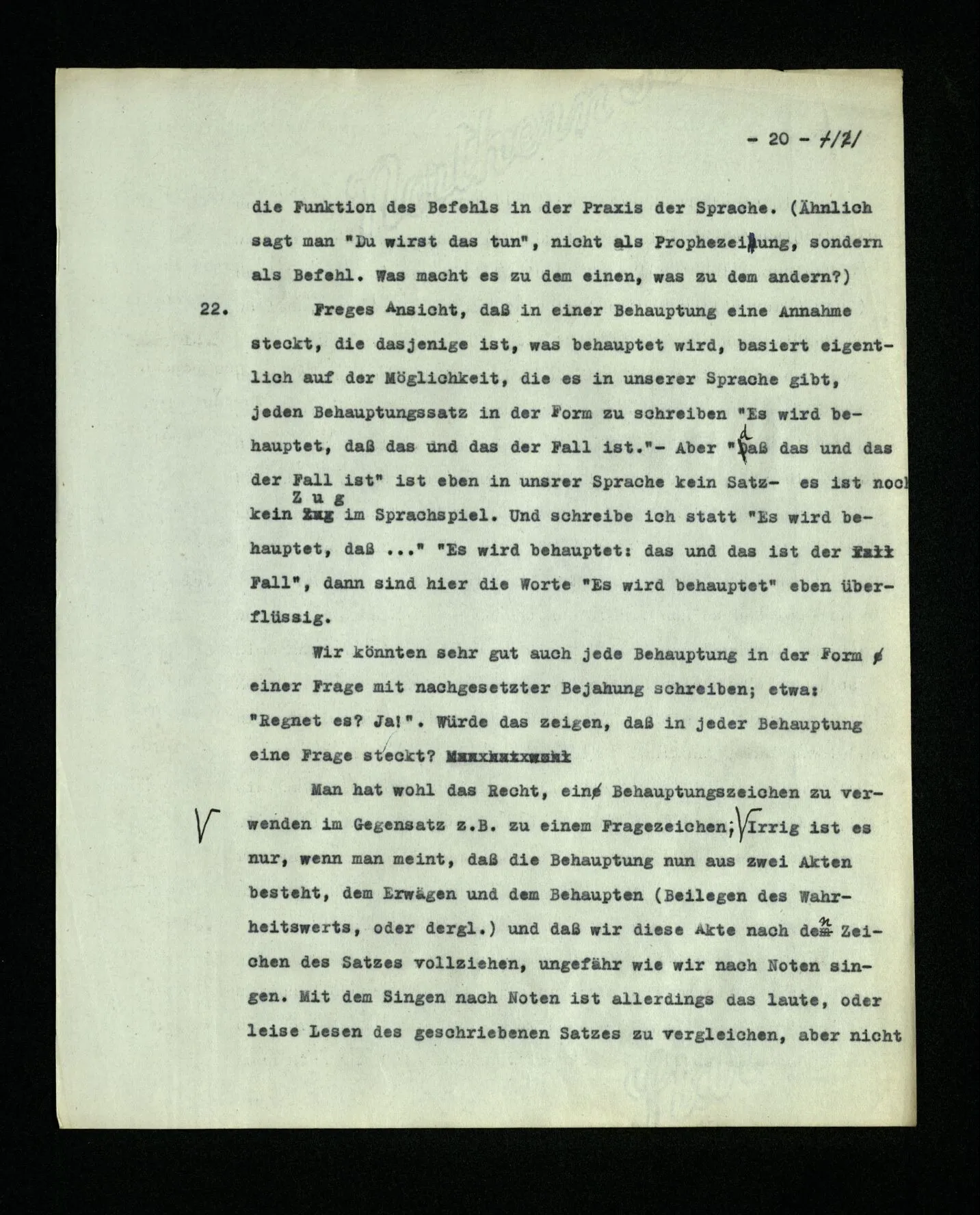 22. Freges Ansicht, daß in einer Behauptung eine Annahme steckt, die dasjenige ist, was behauptet wird, basiert eigentlich auf der Möglichkeit, die es in unserer Sprache gibt, jeden Behauptungssatz in der Form zu schreiben “Es wird behauptet, daß das und das der Fall ist.” – Aber “daß das und das der Fall ist” ist eben in unsrer Sprache kein Satz– es ist noch kein Zug im Sprachspiel. Und schreibe ich statt “Es wird behauptet, daß …” “Es wird behauptet: das und das ist der Fall”, dann sind hier die Worte “Es wird behauptet” eben überflüssig. Wir könnten sehr gut auch jede Behauptung in Form einer Frage mit nachgesetzter Bejahung schreiben; etwa: “Regnet es? Ja!”. Würde das zeigen, daß in jeder Behauptung eine Frage steckt? Man hat wohl das Recht ein Behauptungszeichen zu verwenden im Gegensatz z.B. zu einem Fragezeichen; oder wenn man eine Behauptung unterscheiden will von einer Fiktion, oder einer Annahme. Irrig ist es nur, wenn man meint, daß die Behauptung nun aus zwei Akten besteht, dem Erwägen und dem Behaupten (Beilegen des Wahrheitswerts, oder dergl.) und daß wir diese Akte nach den Zeichen des Satzes vollziehen, ungefähr wie wir nach Noten singen. Mit dem Singen nach Noten ist allerdings das laute, oder leise Lesen des geschriebenen Satzes zu vergleichen, aber nicht das ‘Meinen’ (Denken) des gelesenen Satzes.