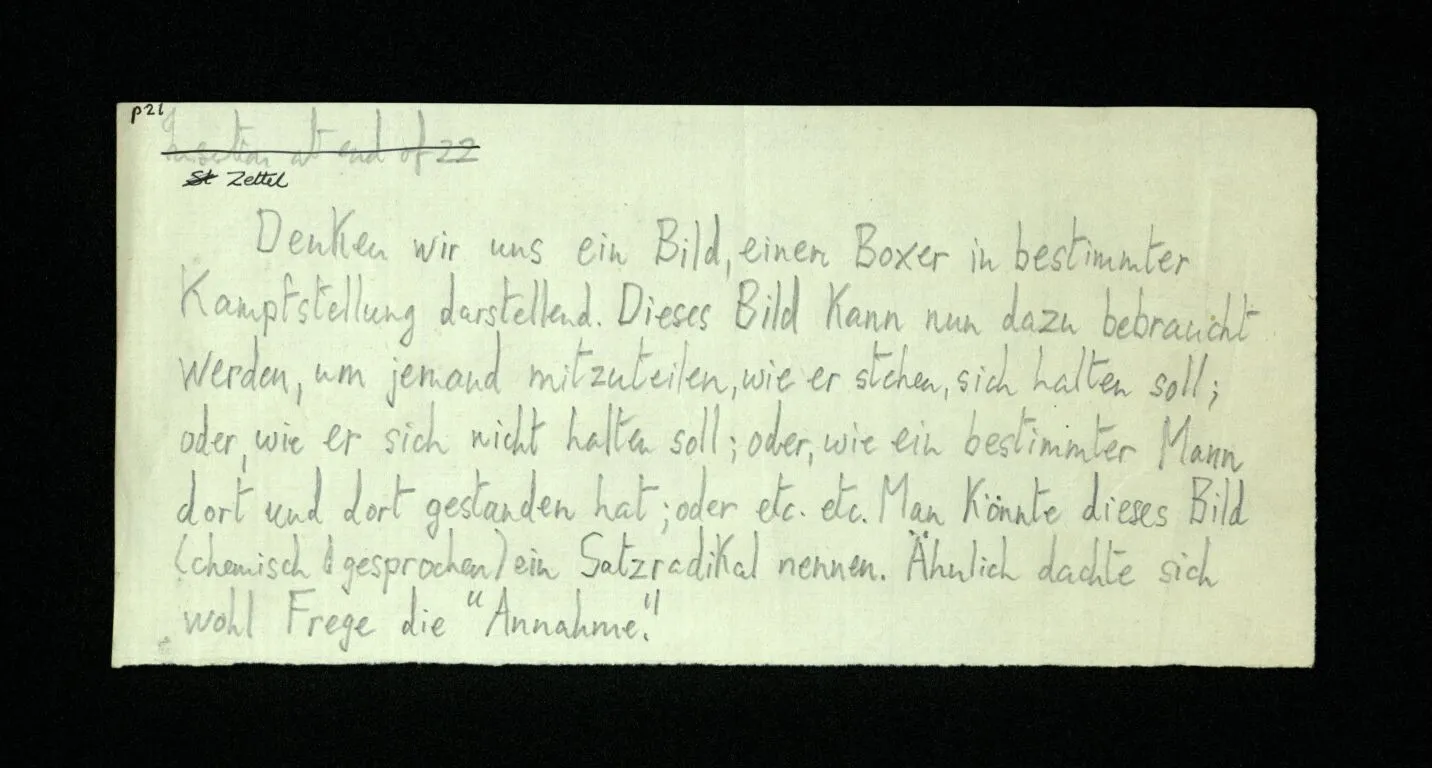 Denken wir uns ein Bild, einen Boxer in bestimmter Kampfstellung darstellend. Dieses Bild kann nun dazu gebraucht werden, um jemand mitzuteilen, wie er stehen, sich halten soll; oder, wie er sich nicht halten soll; oder, wie ein bestimmter Mann dort und dort gestanden hat, oder etc. etc. Man könnte dieses Bild (chemisch gesprochen) ein Satzradikal nennen. Ähnlich dachte sich wohl Frege die “Annahme”.