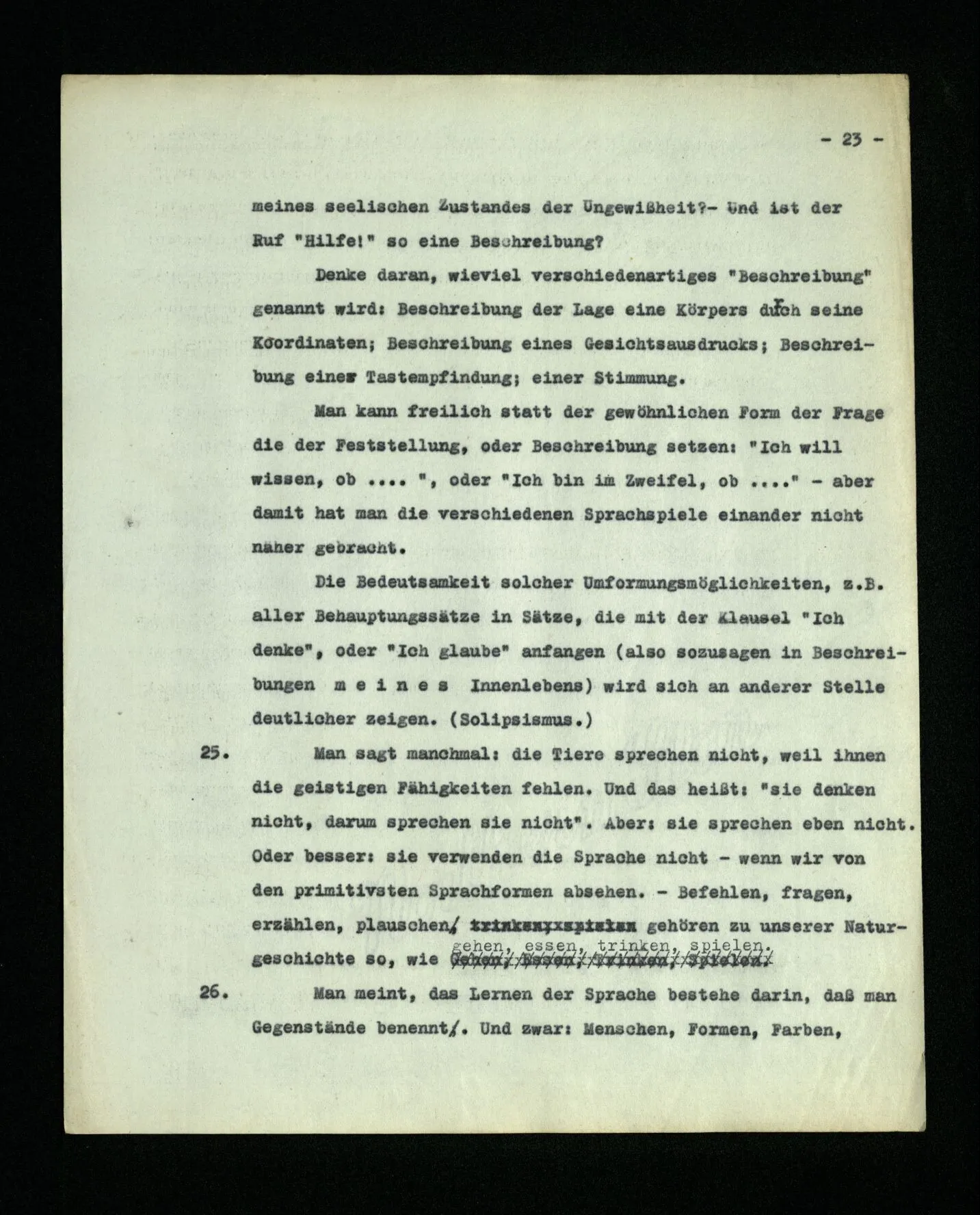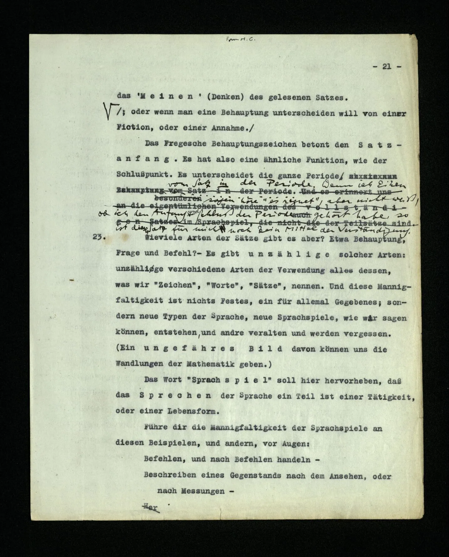 23. Wieviele Arten der Sätze gibt es aber? Etwa Behauptung, Frage und Befehl? – Es gibt unzählige solcher Arten: unzählige verschiedene Arten der Verwendung alles dessen, was wir “Zeichen”, “Worte”, “Sätze”, nennen. Und diese Mannigfaltigkeit ist nichts Festes, ein für allemal Gegebenes; sondern neue Typen der Sprache, neue Sprachspiele, wie wir sagen können, entstehen, und andre veralten und werden vergessen. (Ein ungefähres Bild davon können uns die Wandlungen der Mathematik geben.) Das Wort “Sprachspiel” soll hier hervorheben, daß das Sprechen der Sprache ein Teil ist einer Tätigkeit, oder einer Lebensform. Führe dir die Mannigfaltigkeit der Sprachspiele an diesen Beispielen, und andern, vor Augen:
