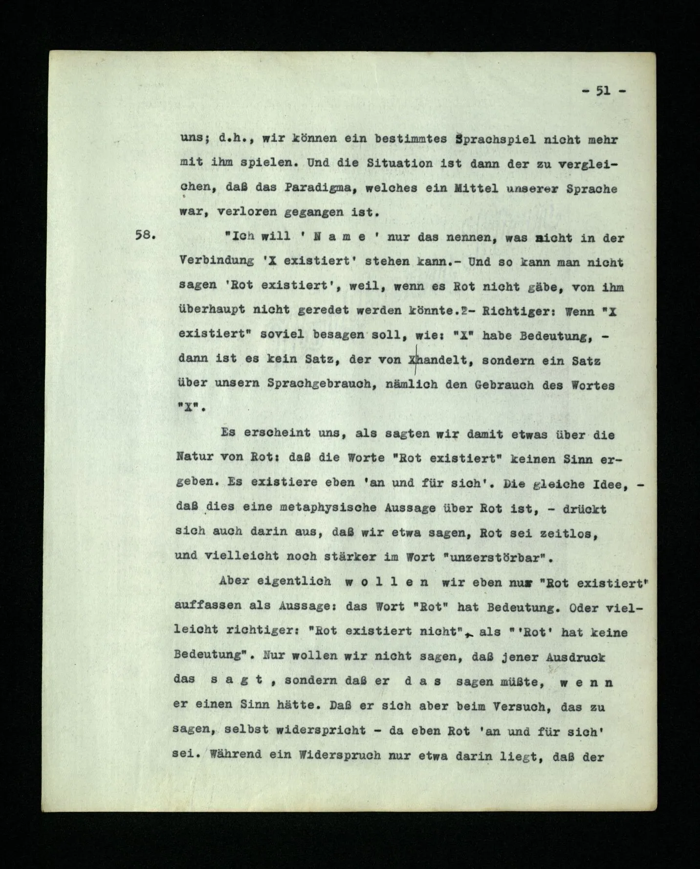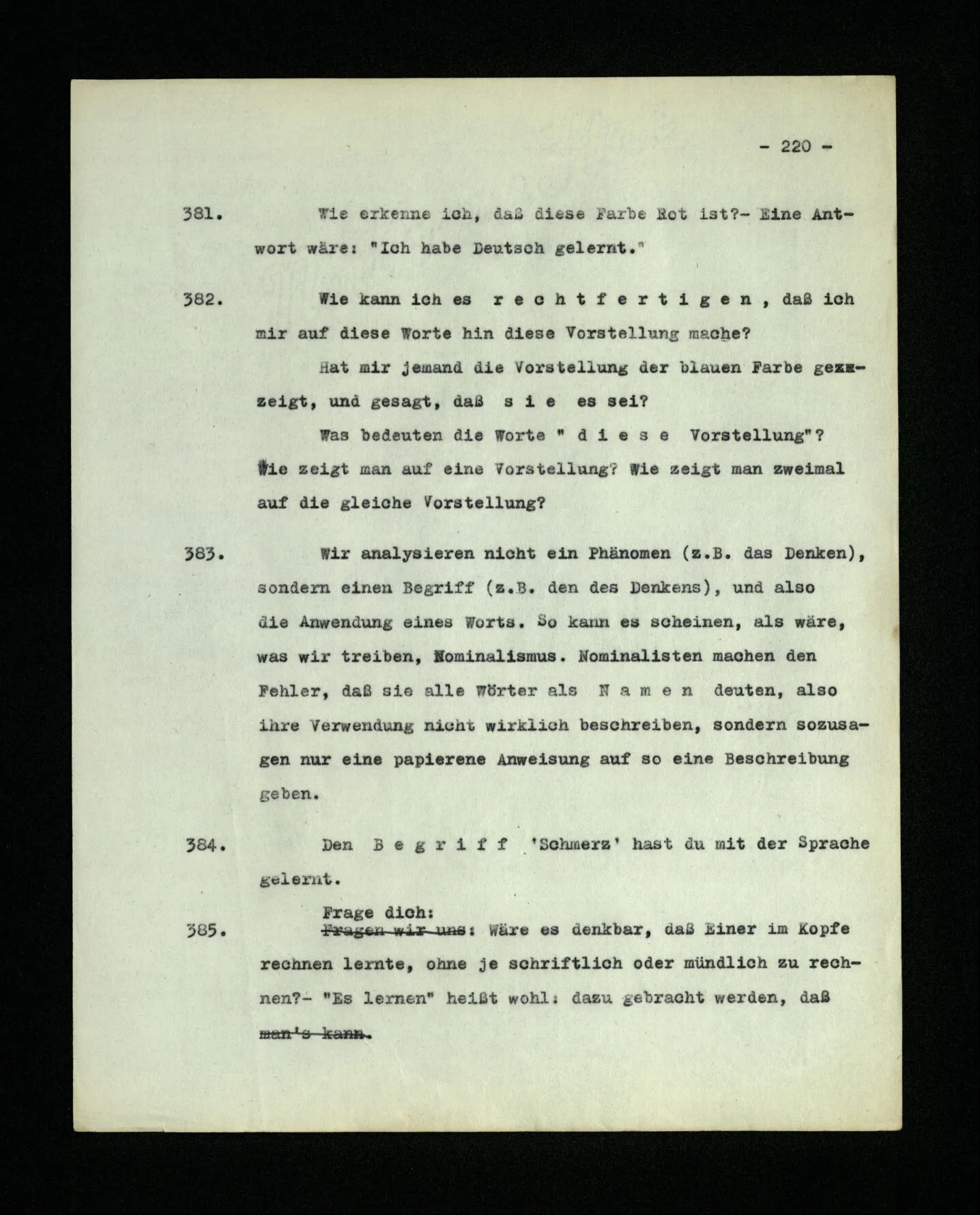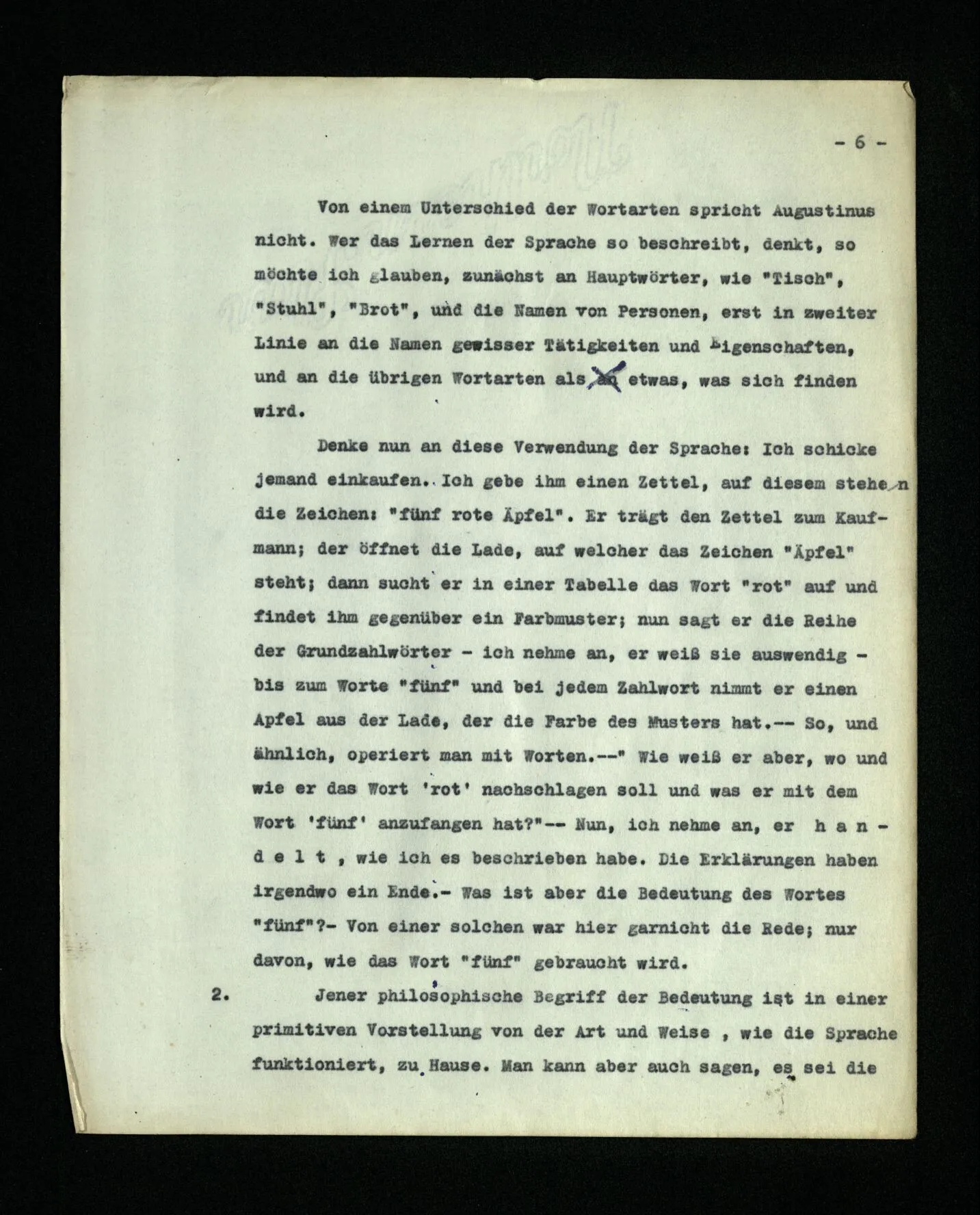 Von einem Unterschied der Wortarten spricht Augustinus nicht. Wer das Lernen der Sprache so beschreibt, denkt, so möchte ich glauben, zunächst an Hauptwörter, wie “Tisch”, “Stuhl”, “Brot” und die Namen von Personen, erst in zweiter Linie an die Namen gewisser Tätigkeiten und Eigenschaften, und an die übrigen Wortarten als etwas, was sich finden wird. Denke nun an diese Verwendung der Sprache: Ich schicke jemand einkaufen. Ich gebe ihm einen Zettel, auf diesem stehen die Zeichen: “fünf rote Äpfel”. Er trägt den Zettel zum Kaufmann; der öffnet die Lade, auf welcher das Zeichen “Äpfel” steht; dann sucht er in einer Tabelle das Wort “rot” auf und findet ihm gegenüber ein Farbmuster; nun sagt er die Reihe der Grundzahlwörter – ich nehme an, er weiß sie auswendig – bis zum Worte “fünf” und bei jedem Zahlwort nimmt er einen Apfel aus der Lade, der die Farbe des Musters hat. ‒ ‒ So, und ähnlich, operiert man mit Worten. ‒ ‒ “Wie weiß er aber, wo und wie er das Wort ‘rot’ nachschlagen soll und was er mit dem Wort ‘fünf’ anzufangen hat?” ‒ ‒ Nun, ich nehme an, er handelt, wie ich es beschrieben habe. Die Erklärungen haben irgendwo ein Ende. – Was ist aber die Bedeutung des Wortes “fünf”? – Von einer solchen war hier garnicht die Rede; nur davon, wie das Wort “fünf” gebraucht wird.