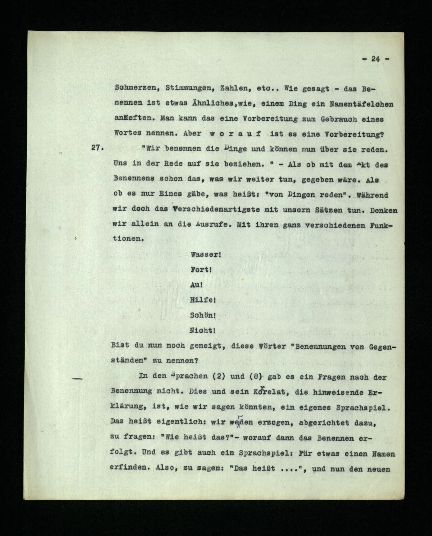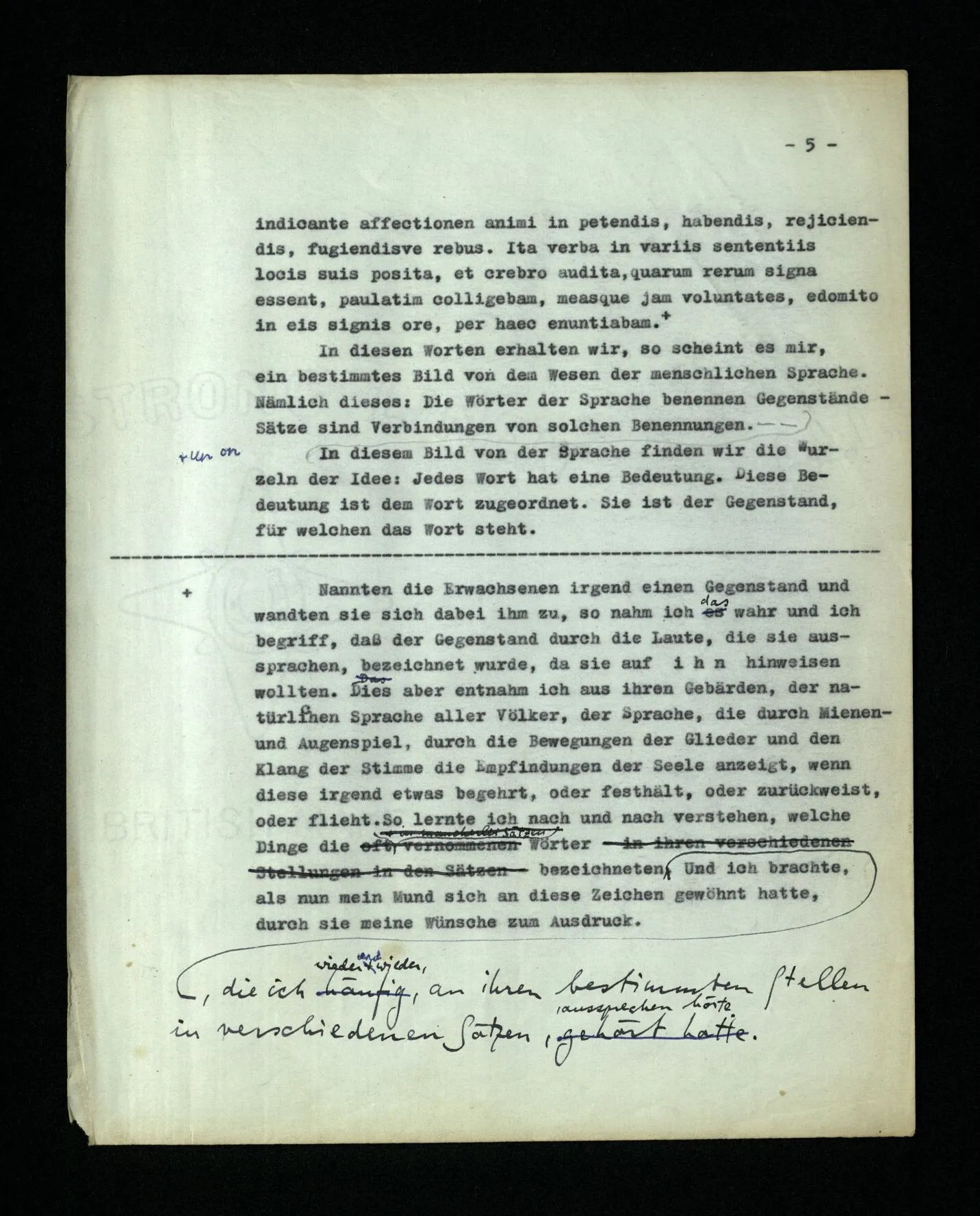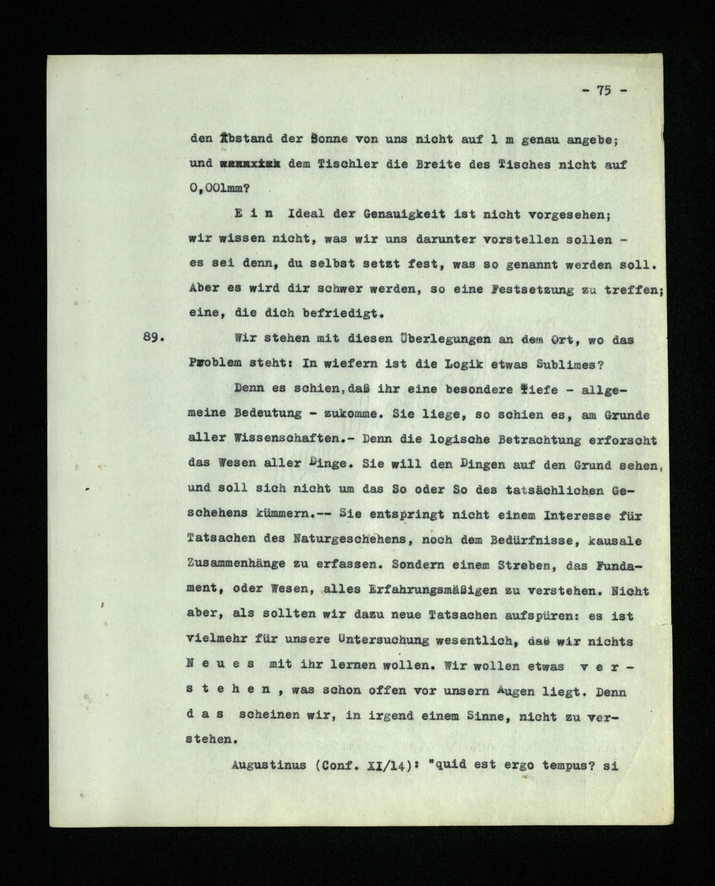 1. Augustinus, in den Confessionen I/8: cum ipsi (majores homines) appellabant rem aliquam, et cum secundum eam vocem corpus ad aliquid movebant, videbam, et tenebam hoc ab eis vocari rem illam, quod sonabant, cum eam vellent ostendere. Hoc autem eos velle ex motu corporis aperiebatur: tamquam verbis naturalibus omnium gentium, quae fiunt vultu et nutu oculorum, ceterorumque membrorum actu, et sonitu vocis indicante affectionem animi in petendis, habendis, rejiciendis, fugiendisve rebus. Ita verba in variis sententiis locis suis posita, et crebro audita, quarum rerum signa essent, paulatim colligebam, measque jam voluntates, edomito in eis signis ore, per haec enuntiabam. + In diesen Worten erhalten wir, so scheint es mir, ein bestimmtes Bild von dem Wesen der menschlichen Sprache. Nämlich dieses: Die Wörter der Sprache benennen Gegenstände – Sätze sind Verbindungen von solchen Benennungen.‒ ‒ In diesem Bild von der Sprache finden wir die Wurzeln der Idee: Jedes Wort hat eine Bedeutung. Diese Bedeutung ist dem Wort zugeordnet. Sie ist der Gegenstand, für welchen das Wort steht.