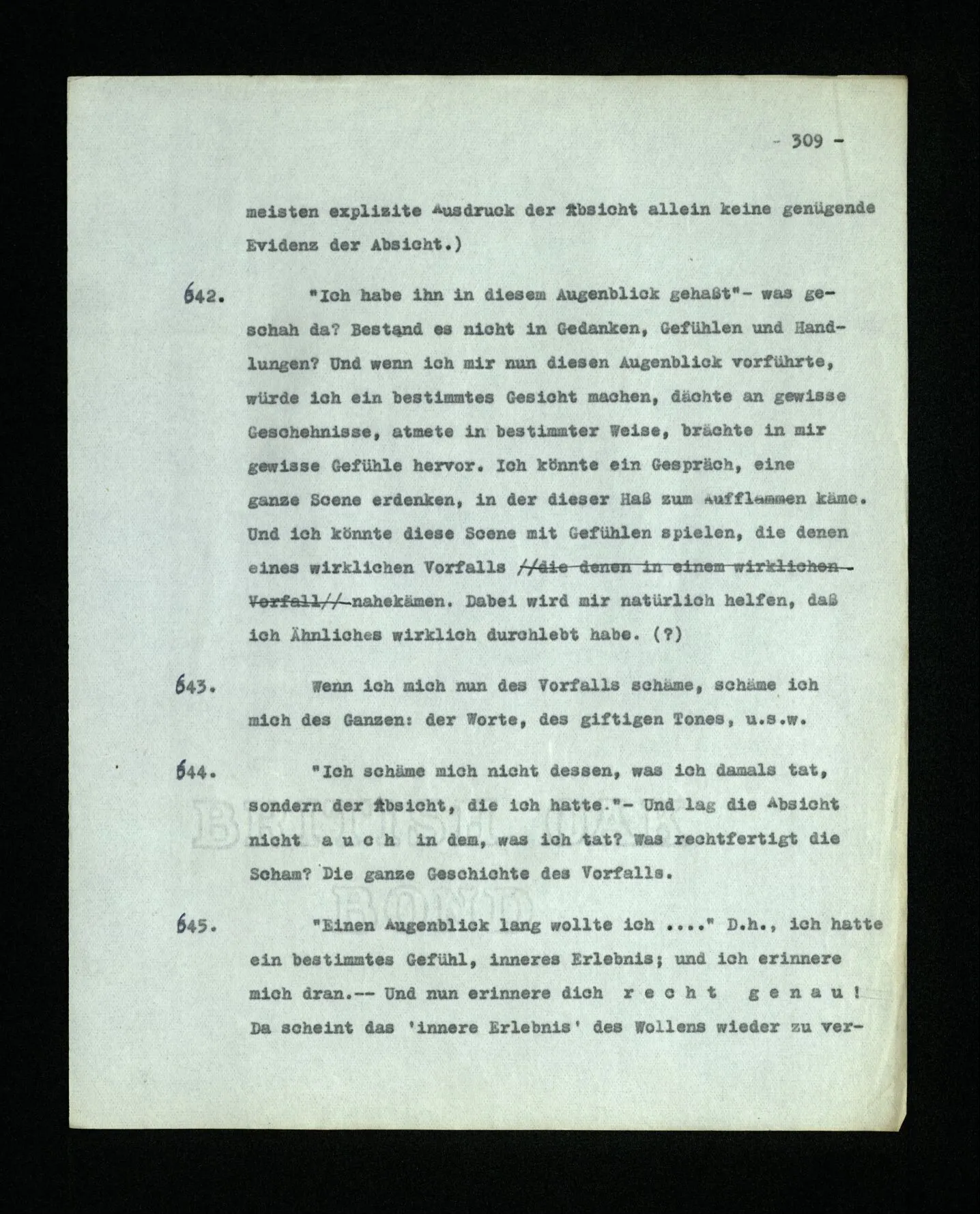 677. Anderseits: “Als du vorhin fluchtest, hast du es wirklich gemeint?” Dies heißt etwa soviel wie: “Warst du dabei wirklich ärgerlich?” Und die Antwort kann auf Grund einer Introspektion gegeben werden, und ist oft von der Art: “Ich habe es nicht sehr ernst gemeint”, “Ich habe es halb im Schmerz gemeint” etc. Hier gibt es Gradunterschiede. Und man sagt allerdings auch: “Ich habe bei diesem Wort halb und halb an ihn gedacht.”
