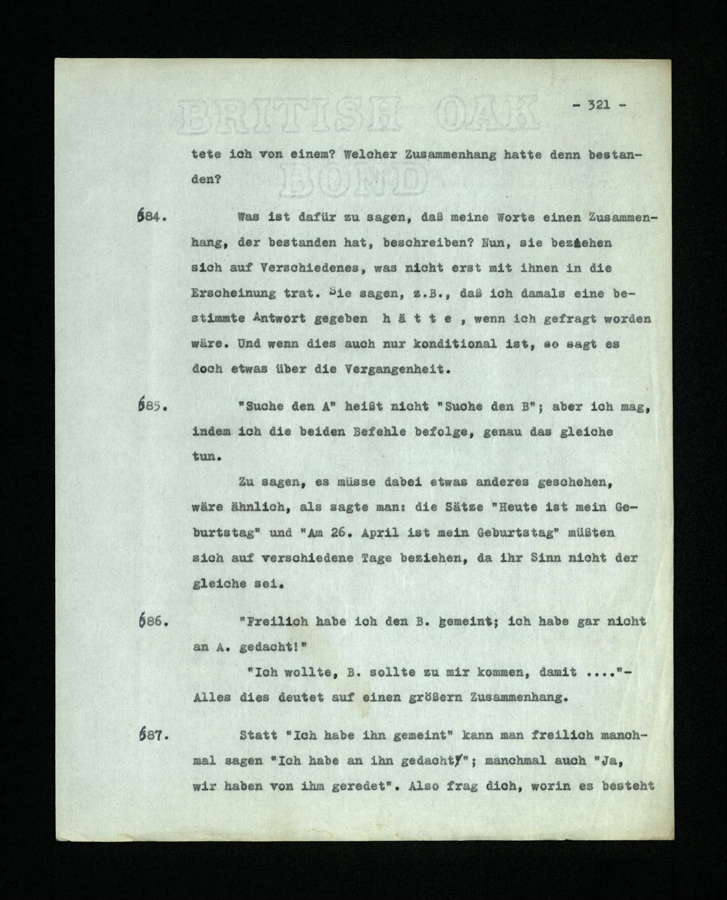 686. “Freilich habe ich den B. gemeint; ich habe gar nicht an A. gedacht!” “Ich wollte, B. sollte zu mir kommen, damit …” – Alles dies deutet auf einen größern Zusammenhang.