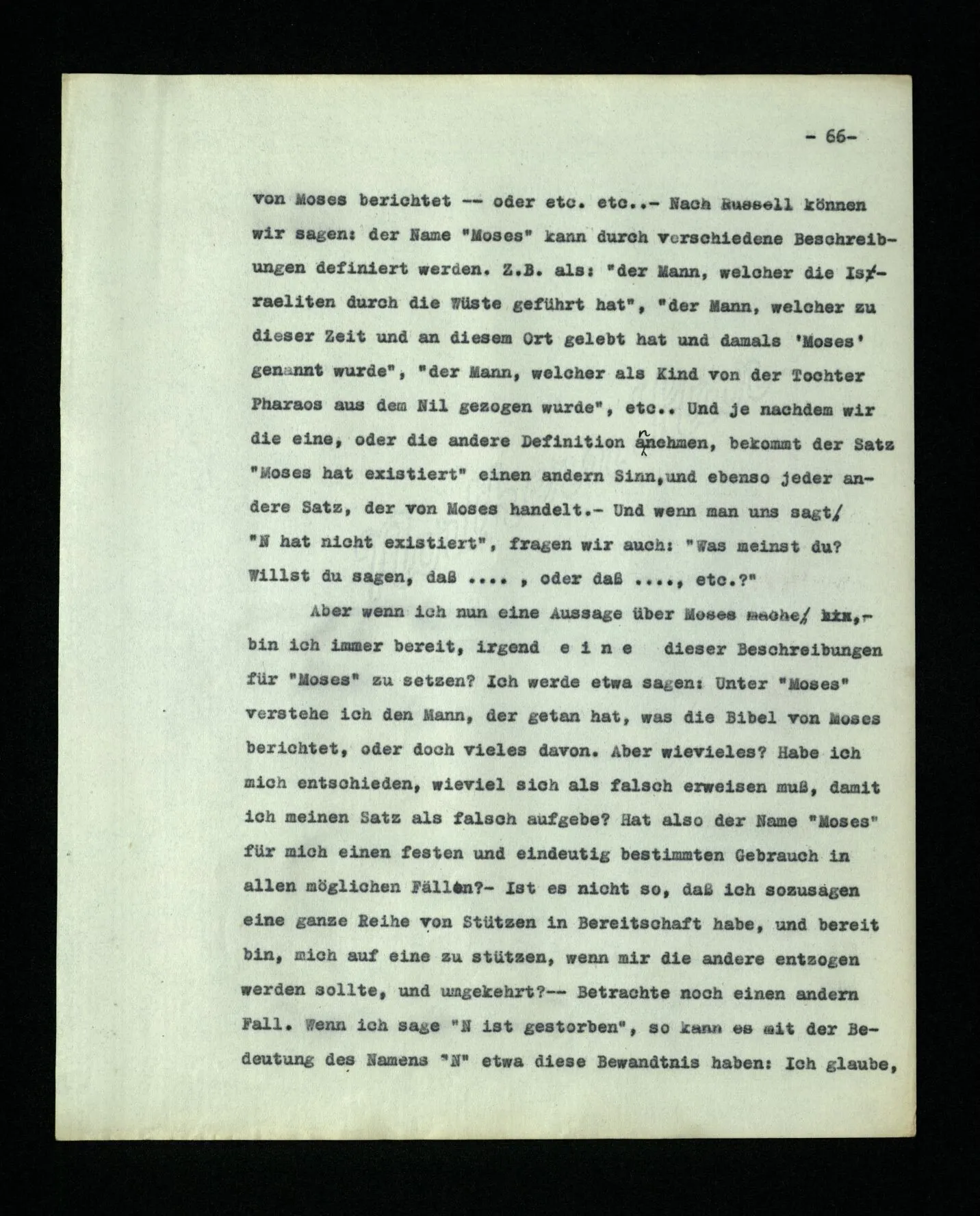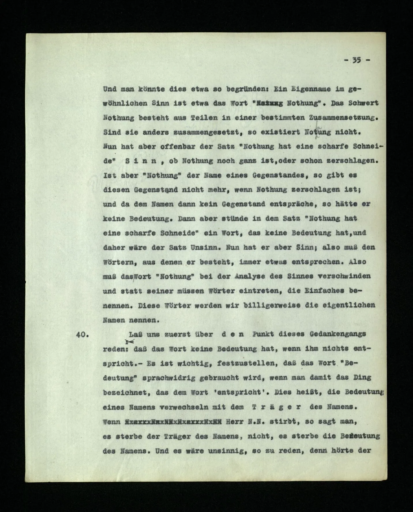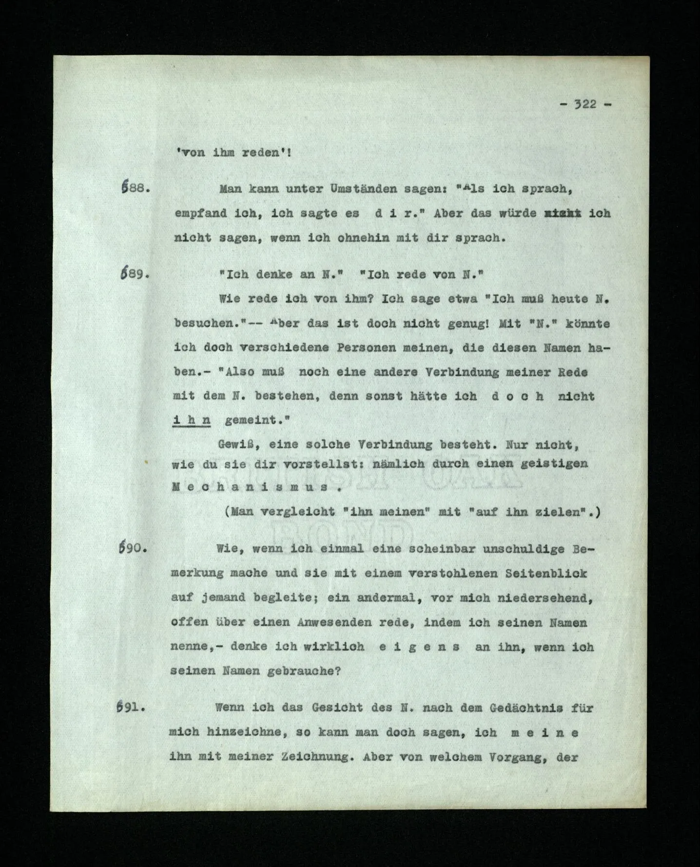 689. “Ich denke an N.” “Ich rede von N.” Wie rede ich von ihm? Ich sage etwa “Ich muß heute N. besuchen.”‒ ‒ Aber das ist doch nicht genug! Mit “N.” könnte ich doch verschiedene Personen meinen, die diesen Namen haben. – “Also muß noch eine andere Verbindung meiner Rede mit dem N. bestehen, denn sonst hätte ich doch nicht ihn gemeint.” Gewiß, eine solche Verbindung besteht. Nur nicht, wie du sie dir vorstellst: nämlich durch einen geistigen Mechanismus. (Man vergleicht “ihn meinen” mit “auf ihn zielen”.)