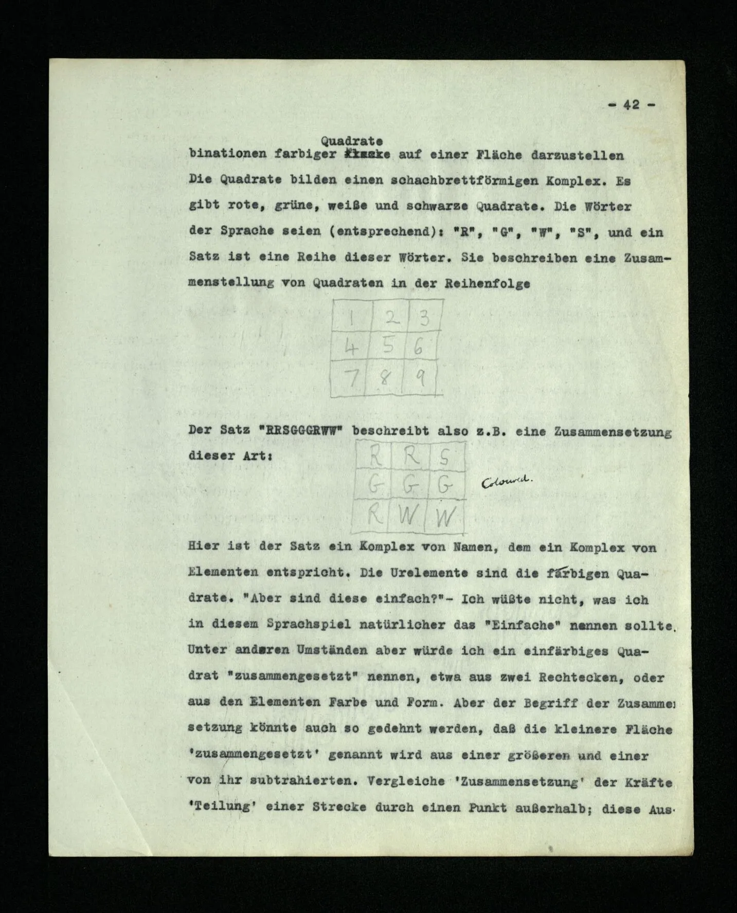 8. Sehen wir jetzt eine Erweiterung der Sprache (2) an. Außer den Wörtern “Würfel”, “Säule”, etc. enthalte sie eine Wörterreihe, die verwendet wird, wie der Kaufmann in (1) die Zahlwörter verwendet (es kann die Reihe der Buchstaben des Alphabets sein); ferner, zwei Wörter, sie mögen “dorthin” und “dieses” lauten (weil dies schon ungefähr ihren Zweck andeutet), sie werden in Verbindung mit einer zeigenden Handbewegung gebraucht; und endlich eine Anzahl von Farbmustern. A gibt einen Befehl von der Art: “d-Platte - dorthin”. Dabei läßt er den Gehilfen ein Farbmuster sehen, und beim Worte “dorthin” zeigt er an eine Stelle des Bauplatzes. B nimmt von dem Vorrat der Platten je eine von der Farbe des Musters für jeden Buchstaben des Alphabets bis zum “d” und bringt sie an den Ort, den A bezeichnet. – Bei anderen Gelegenheiten gibt A den Befehl: “dieses- dorthin”. Bei “dieses” zeigt er auf einen Baustein. U.s.w..