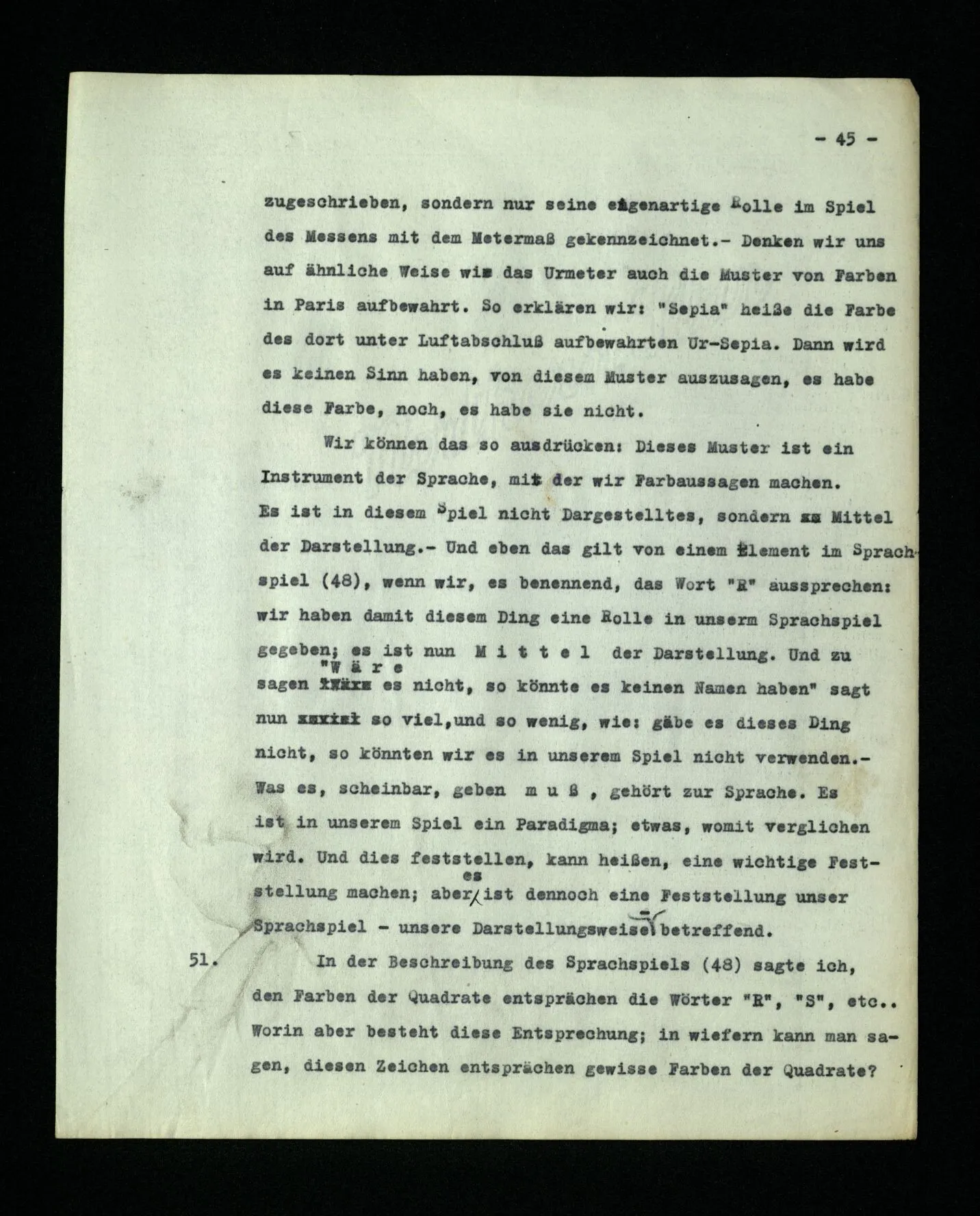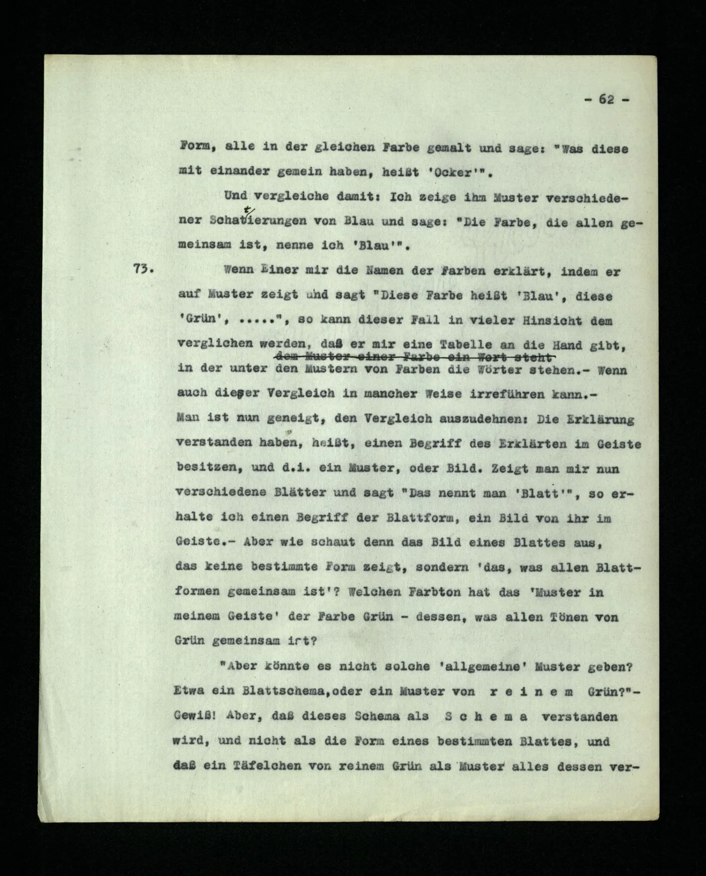 16. Wie ist es mit den Farbmustern, die A dem B zeigt, – gehören sie zur Sprache? Nun, wie man will. Zur Wortsprache gehören sie nicht; aber wenn ich jemandem sage: “Sprich das Wort ‘das’ aus”, so wirst du doch dieses zweite “‘das’” auch noch zum Satz rechnen. Und doch spielt es eine ganz ähnliche Rolle, wie ein Farbmuster im Sprachspiel (8); es ist nämlich ein Muster dessen, was der Andre sagen soll. Es ist das Natürlichste und richtet am wenigsten Verwirrung an, wenn wir die Muster zu den Werkzeugen der Sprache rechnen. [Bemerkung über das reflexive Fürwort “dieser Satz”.]