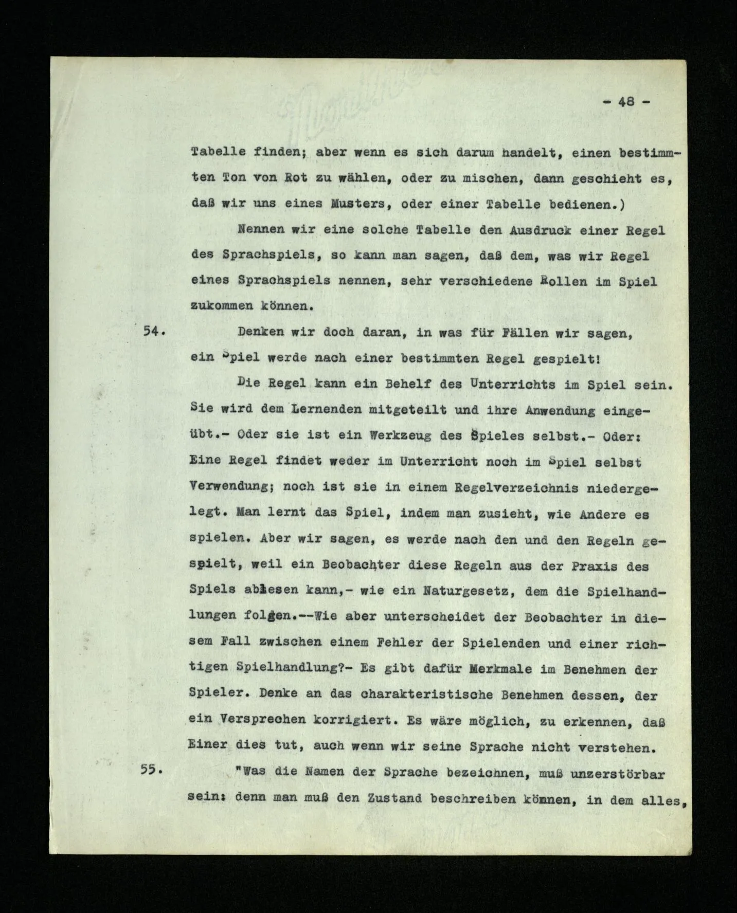 654. Unser Fehler ist, dort nach einer Erklärung zu suchen, wo wir die Tatsachen als ‘Urphänomene’ sehen sollten. D.h., wo wir sagen sollten: dieses Sprachspiel wird gespielt.